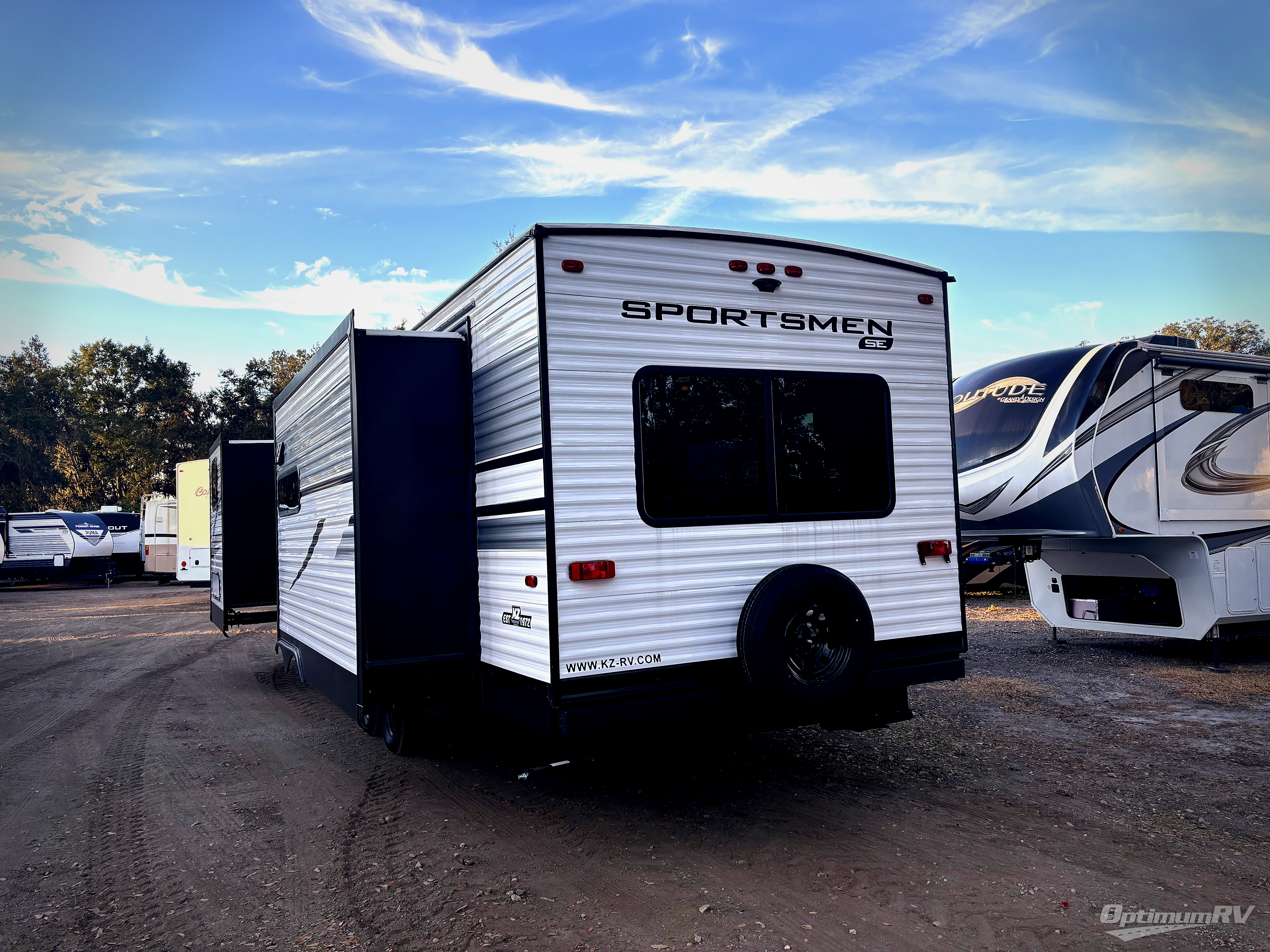 Each Sportsmen SE travel trailer and toy hauler by KZ is constructed with KZ exclusive tough shield exterior metal, a one-piece seamless walk-on Tufflex roofing material, and diamond plate rock guard to protect your unit from road debris. You will appreciate the extra large baggage doors for stowing away your gear when not in use, and tinted windows to help keep the harmful sun rays out plus keeping it cooler inside. Some of the exterior conveniences found in the mandatory Advantage Package are the solid folding steps with a large folding grab handle for easy entry and exit, a full glass friction hinged entry door, plus an exterior shower for your pets or to rinse off before you head inside. You'll also appreciate the nitrogen-filled tires, solar and backup camera prep, plus a Leash Latch with a bonus beverage opener. You'll feel right at home inside with linoleum flooring throughout, a 13,500 BTU air conditioner, large overhead cabinets, a shower surround, and much more!