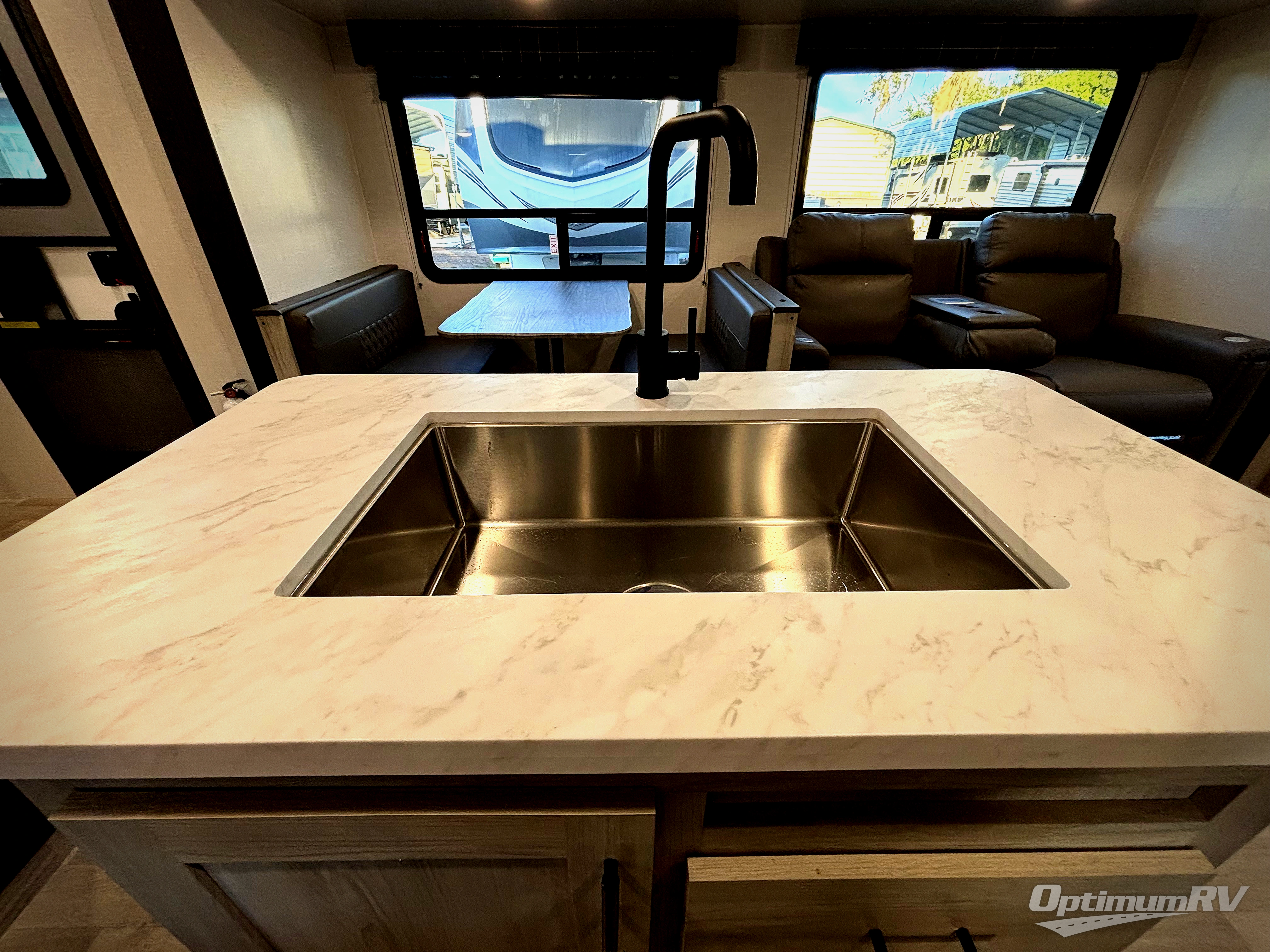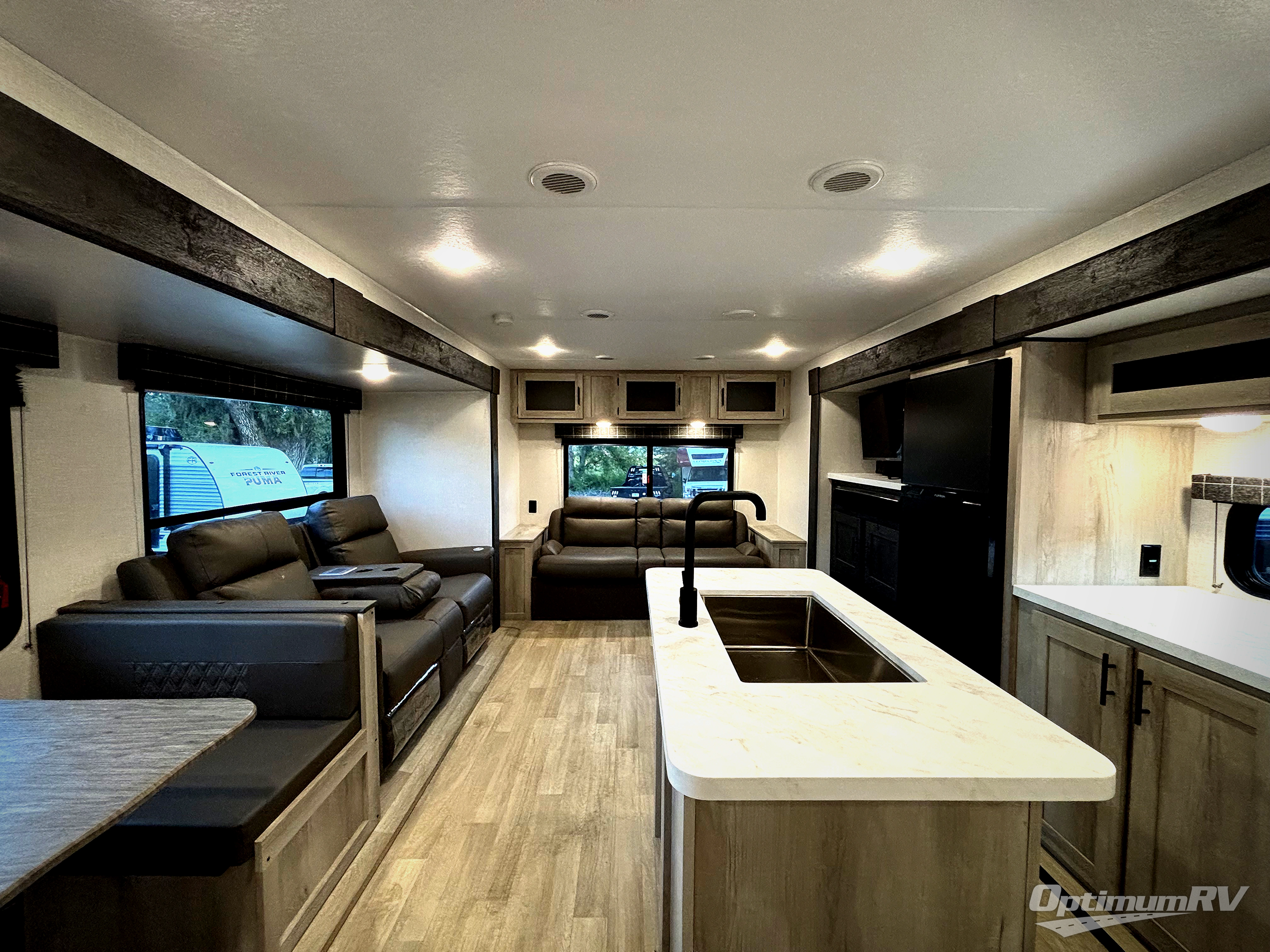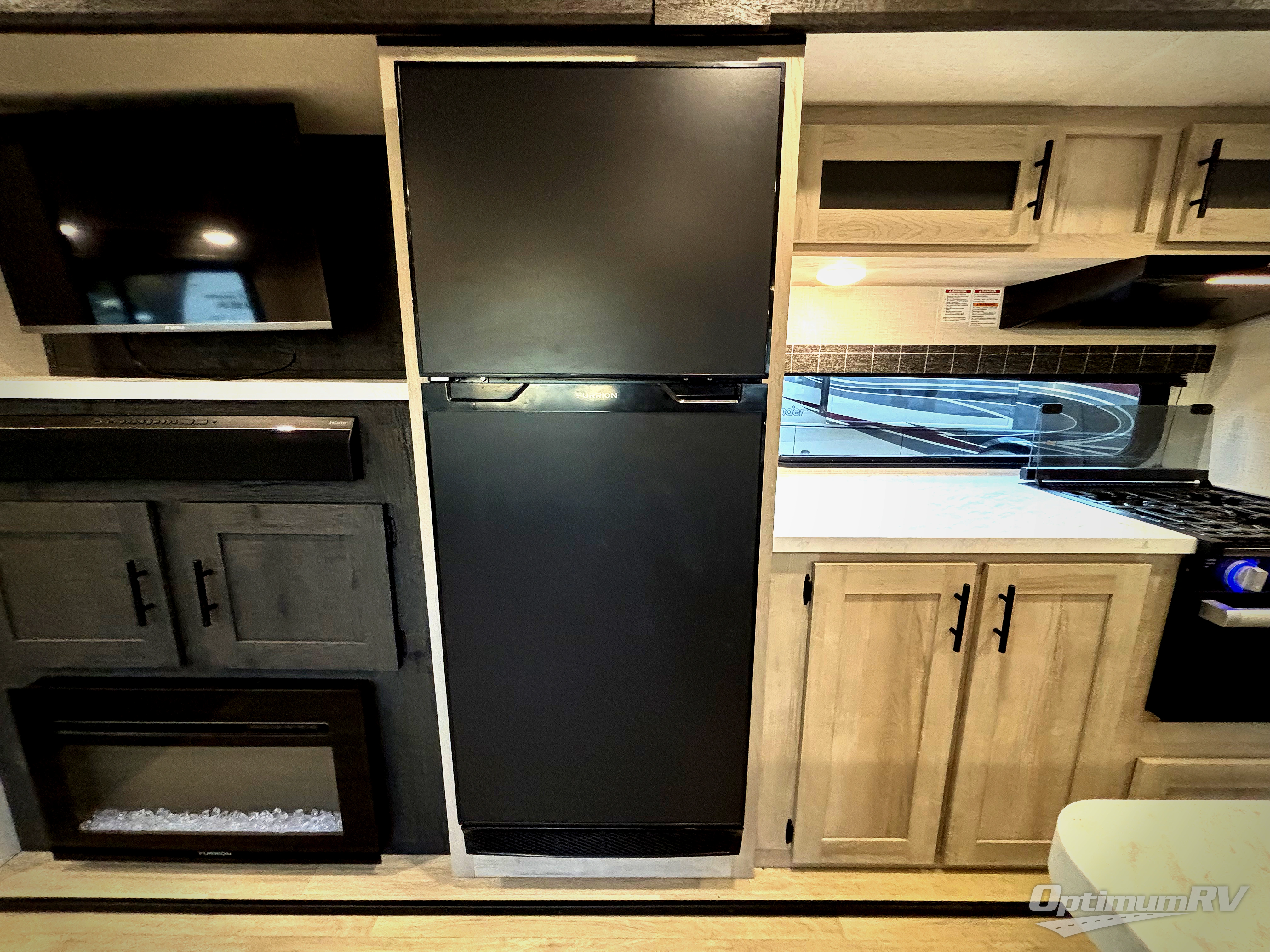 Wow! Check out the space you will have in this travel trailer with dual opposing slides in the rear living area, plus a slide out queen bed in the bedroom! The kitchen island will provide more counter space, along with the hutch/pantry that includes a microwave above. Your crew can relax on the theater seating, booth dinette, or 70" sofa after dinner is cleaned up, plus you have a 30" fireplace for a more at-home feel. This model also includes a 12' power awning so relax under during day!