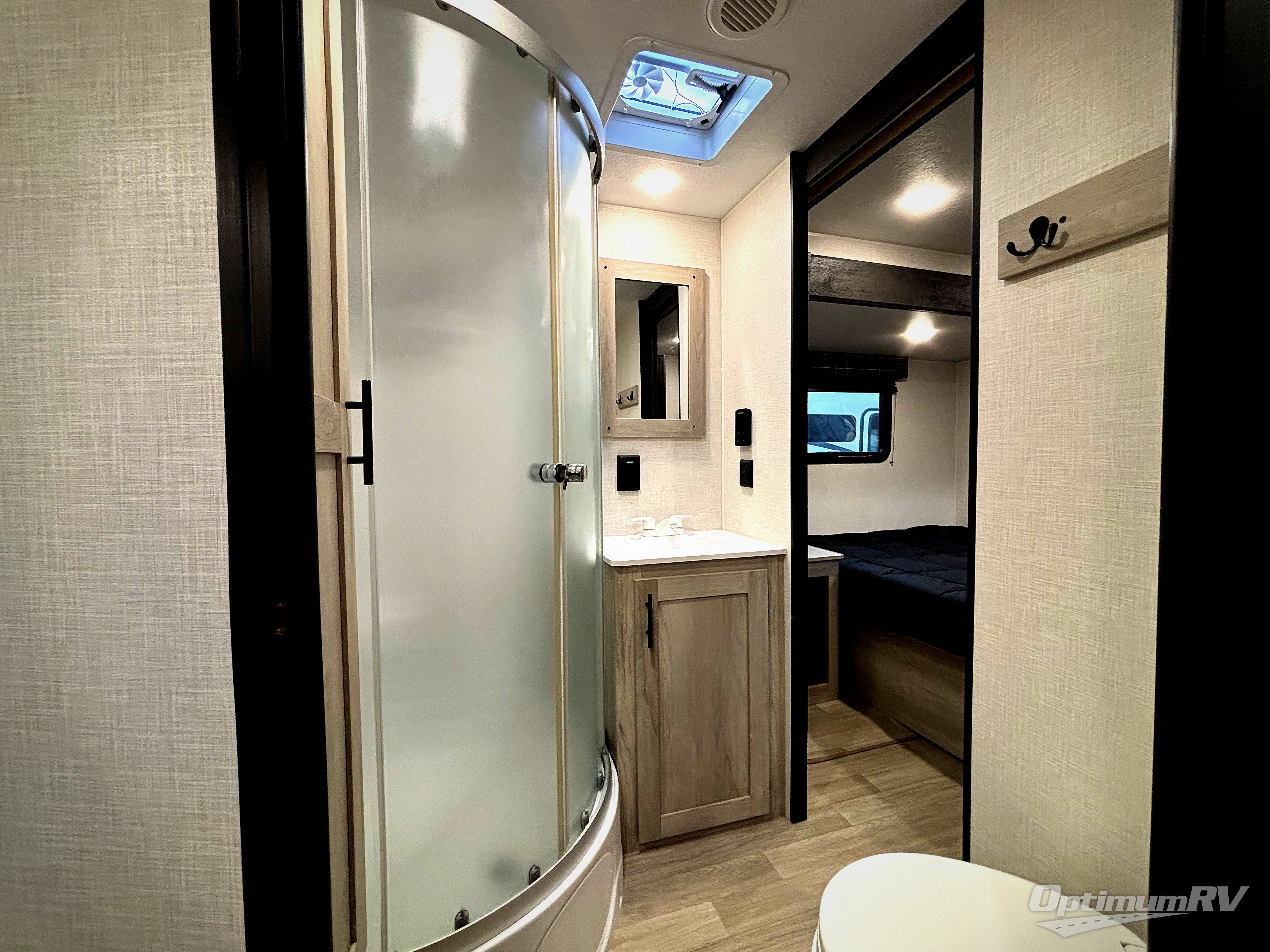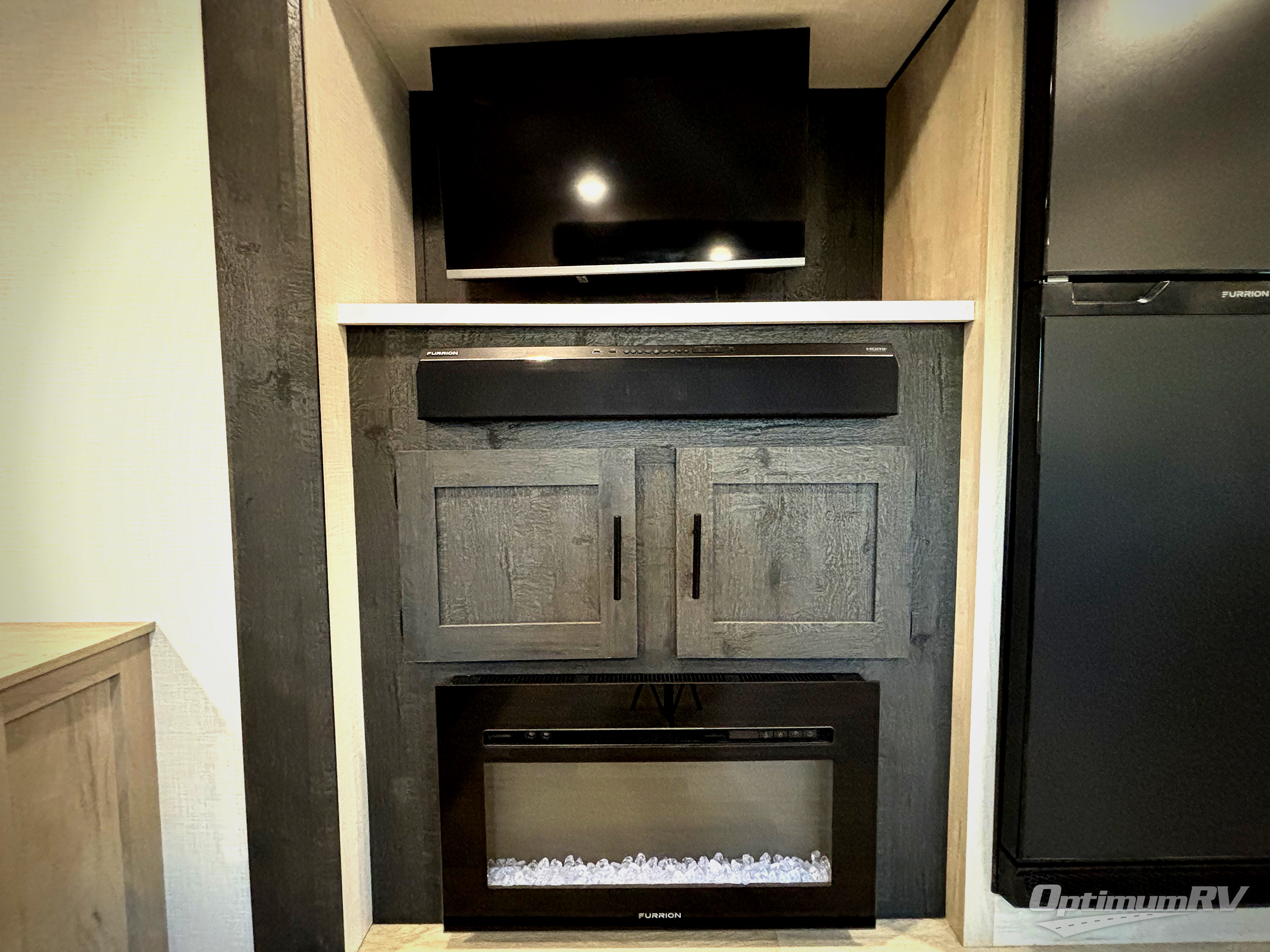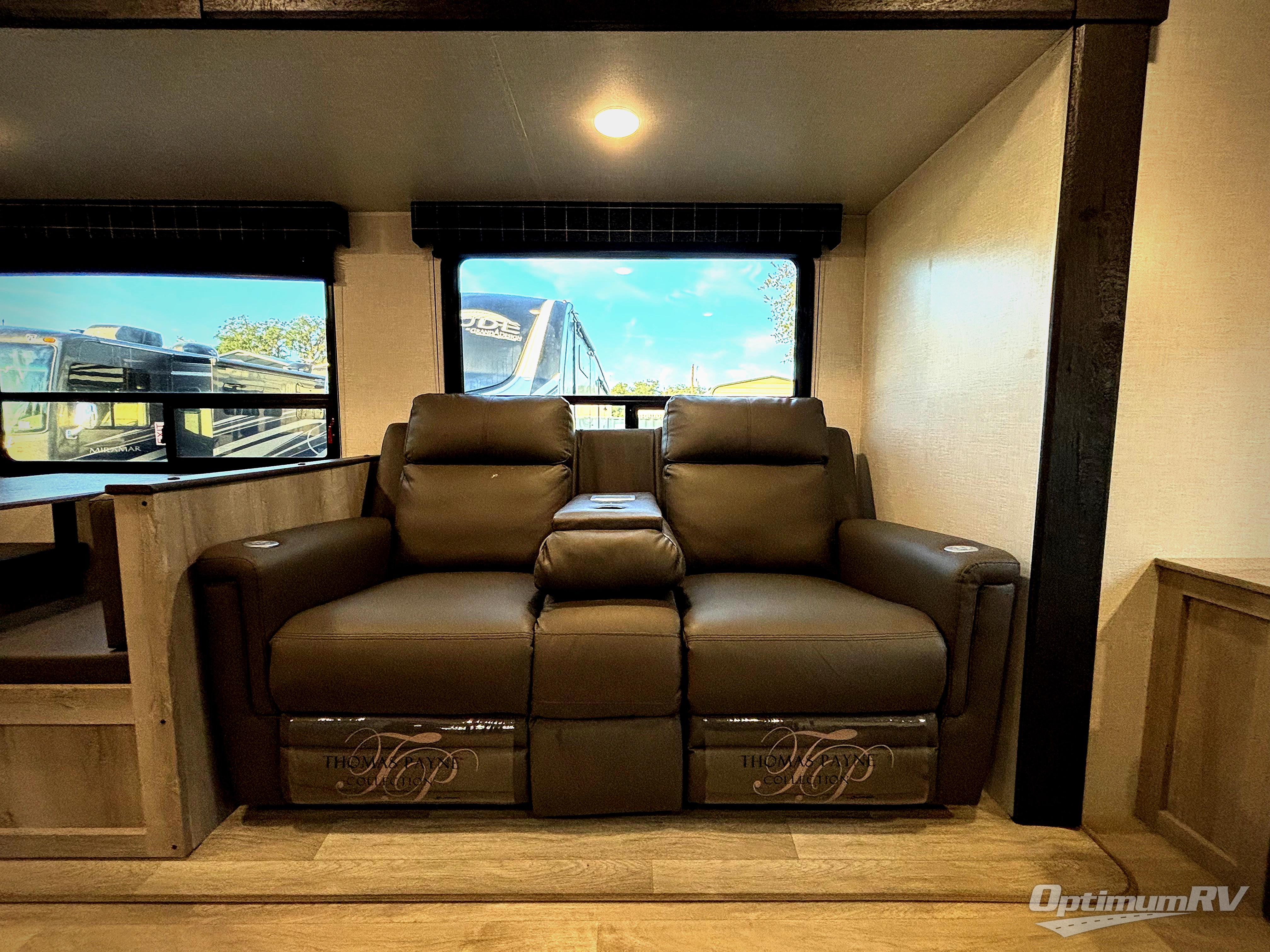 Wow! Check out the space you will have in this travel trailer with dual opposing slides in the rear living area, plus a slide out queen bed in the bedroom! The kitchen island will provide more counter space, along with the hutch/pantry that includes a microwave above. Your crew can relax on the theater seating, booth dinette, or 70" sofa after dinner is cleaned up, plus you have a 30" fireplace for a more at-home feel. This model also includes a 12' power awning so relax under during day!
