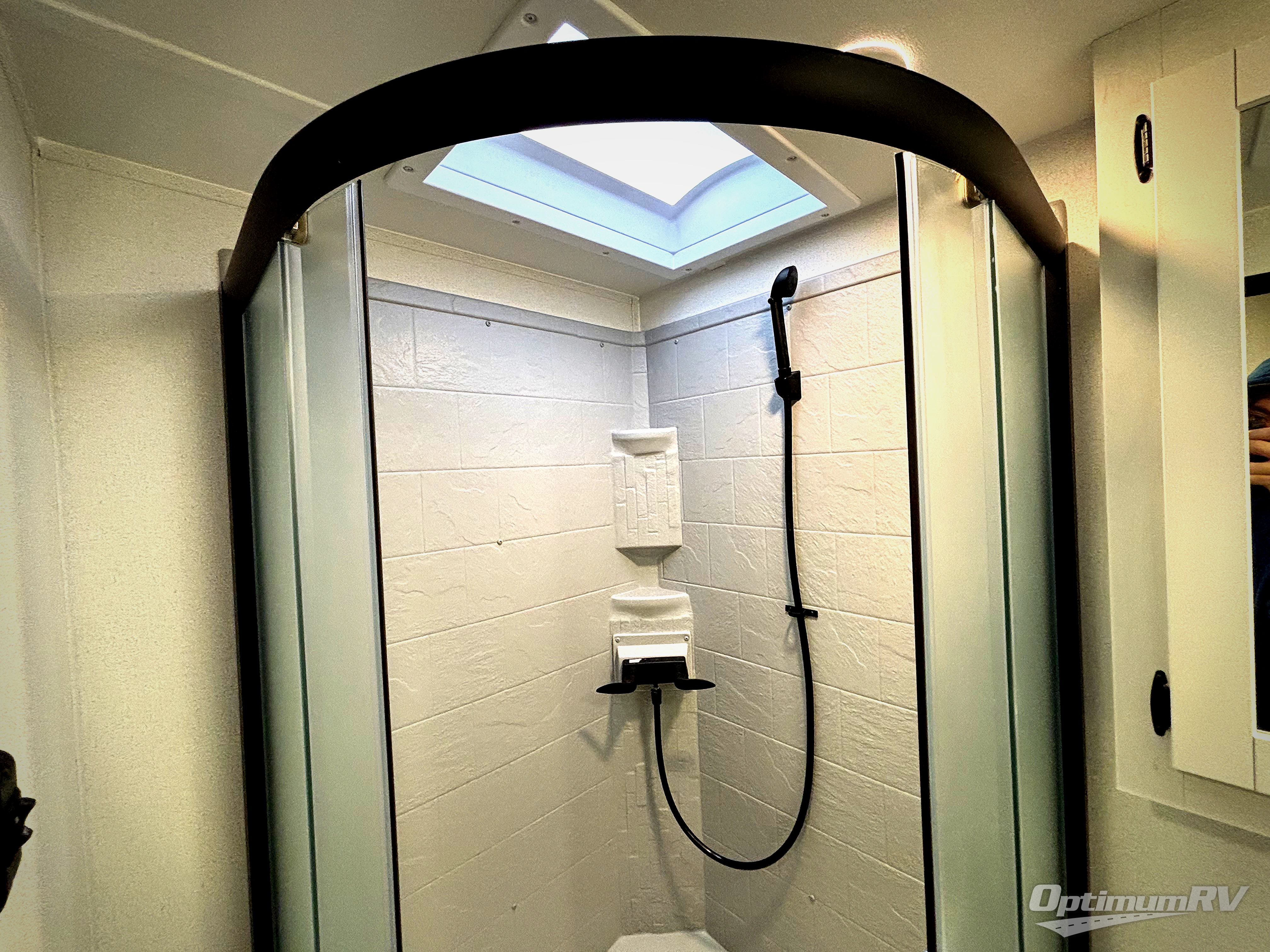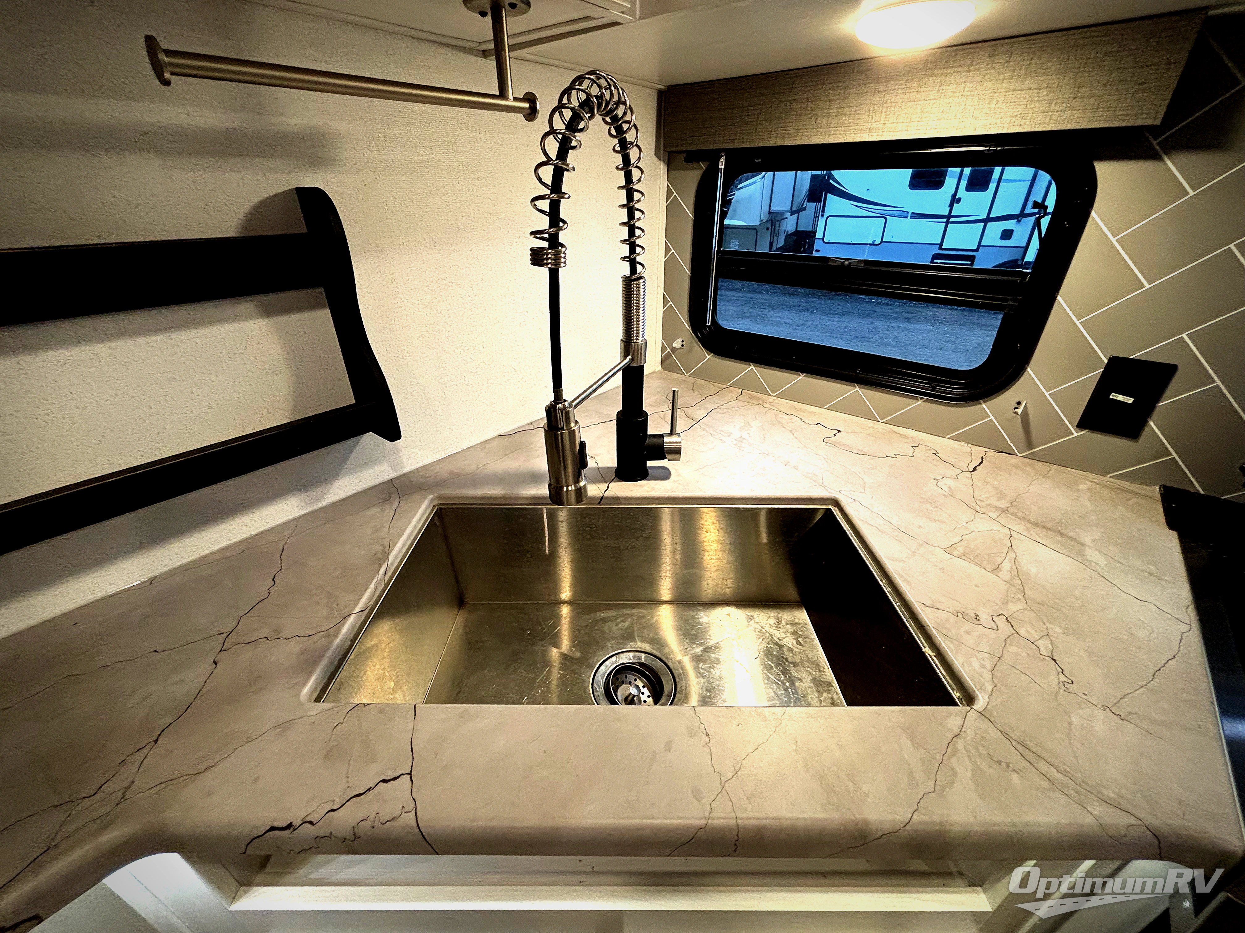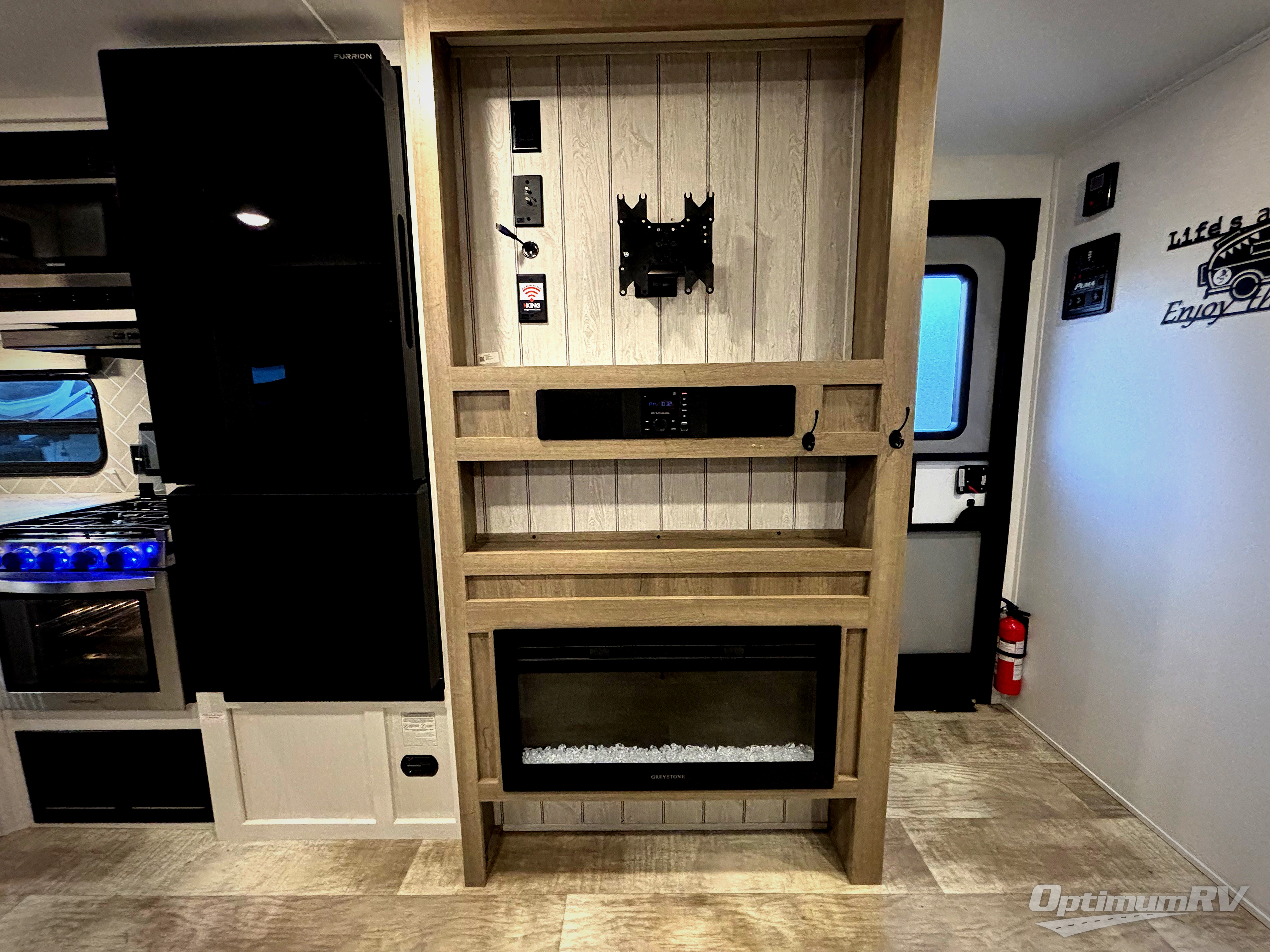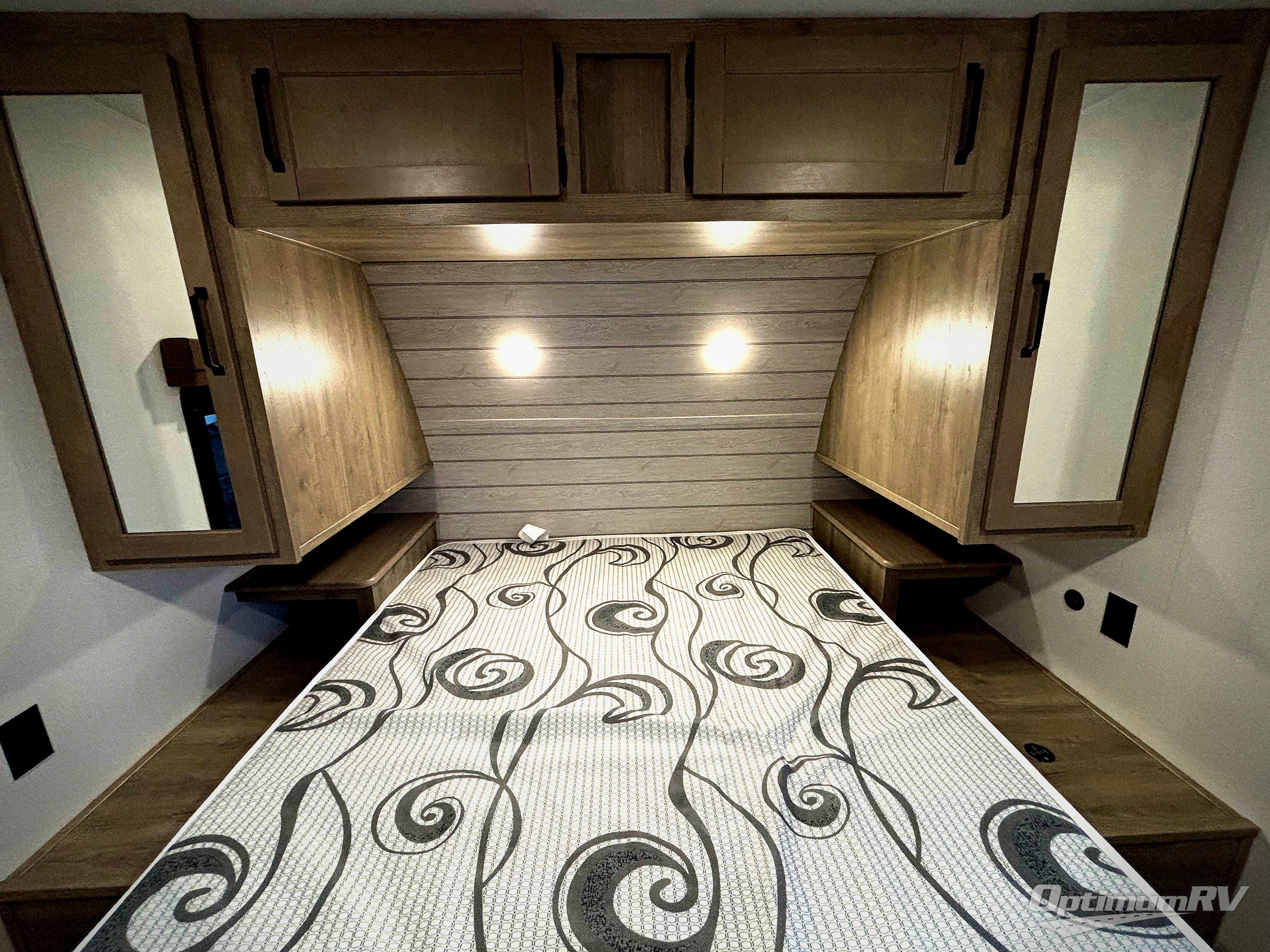 The kids will love having their own rear private bunkhouse in this travel trailer! Inside the bunkhouse is a 38" x 76" bunk above an entertainment center, a closet, and a 32" x 69" bunk above a jiffy sofa slide. The full bathroom with a 34" x 34" radius shower is just outside the bunkhouse for them to easily access it at night. They can even invite a friend or two to tag along and sleep on the sofa and U-shaped dinette once converted. Behind the entertainment center is a closet/pantry to keep your favorite snacks and the kitchen has a 12V refrigerator to keep your beverages cold. When you're ready to wind down your nights, head to the front private bedroom and relax on the queen bed with shirt closets and nightstands on either side of it, plus it has one of the dual entry doors to the unit! This model also includes two outside kitchen options if you enjoy cooking in the fresh outdoors!