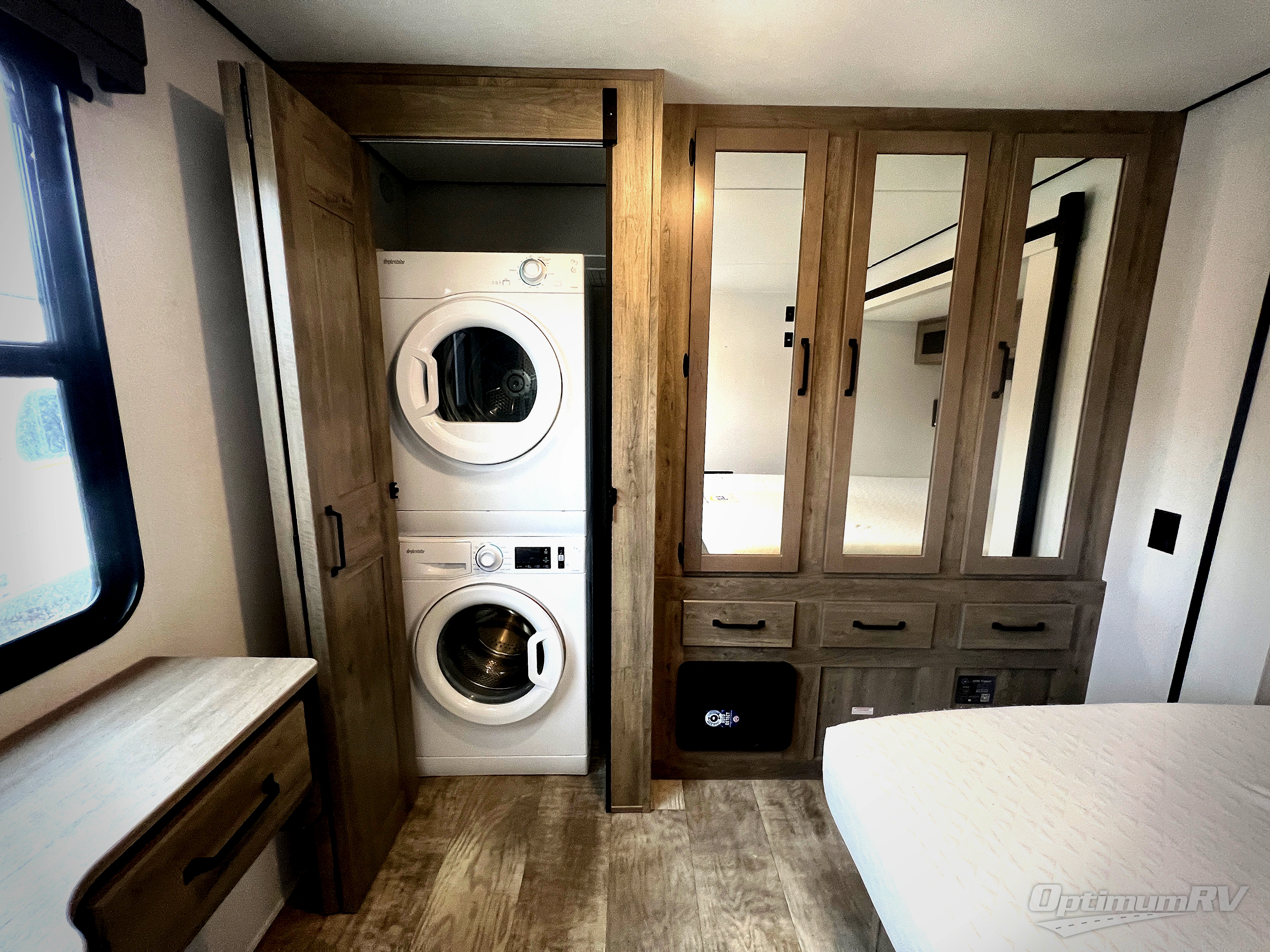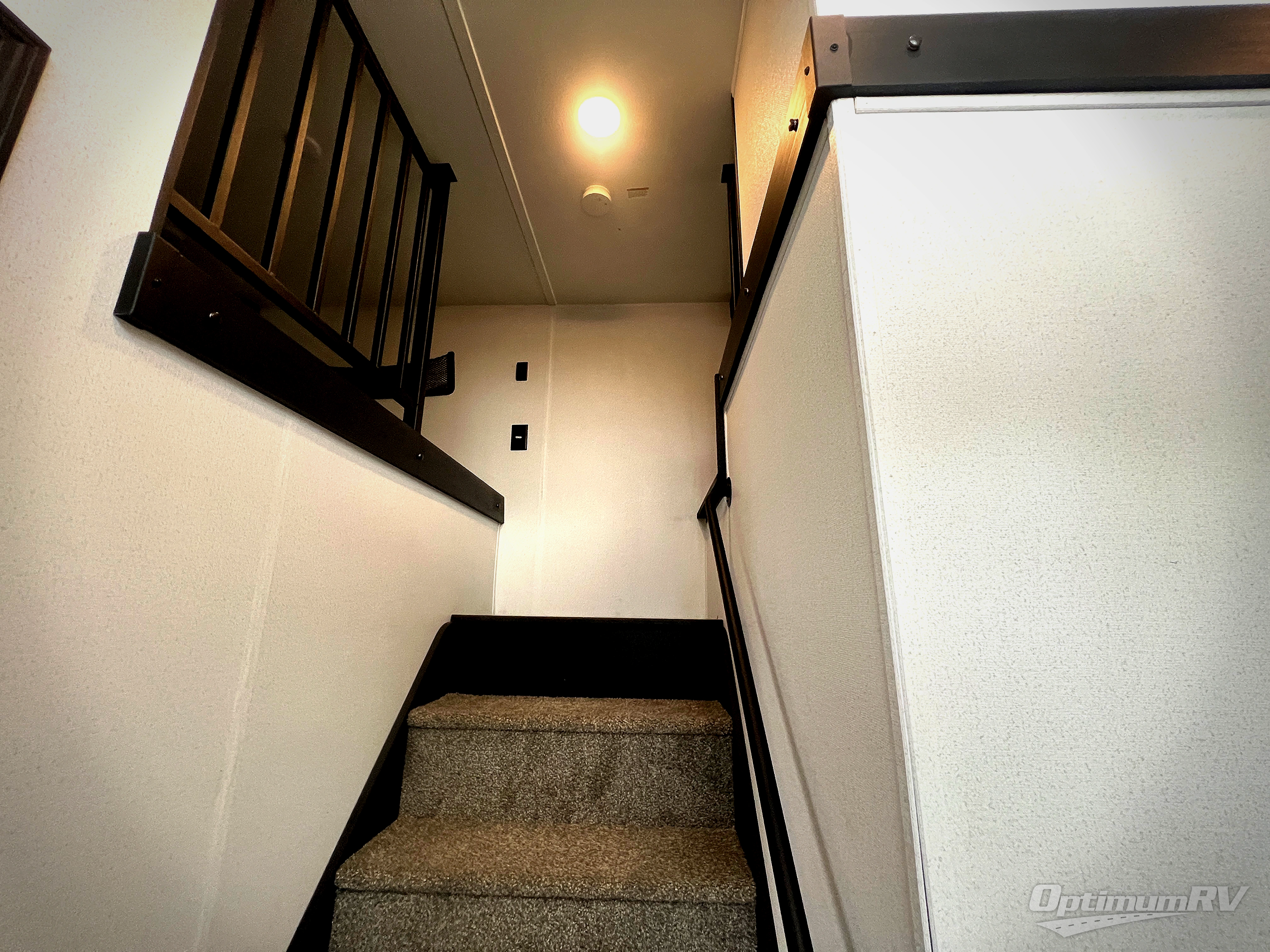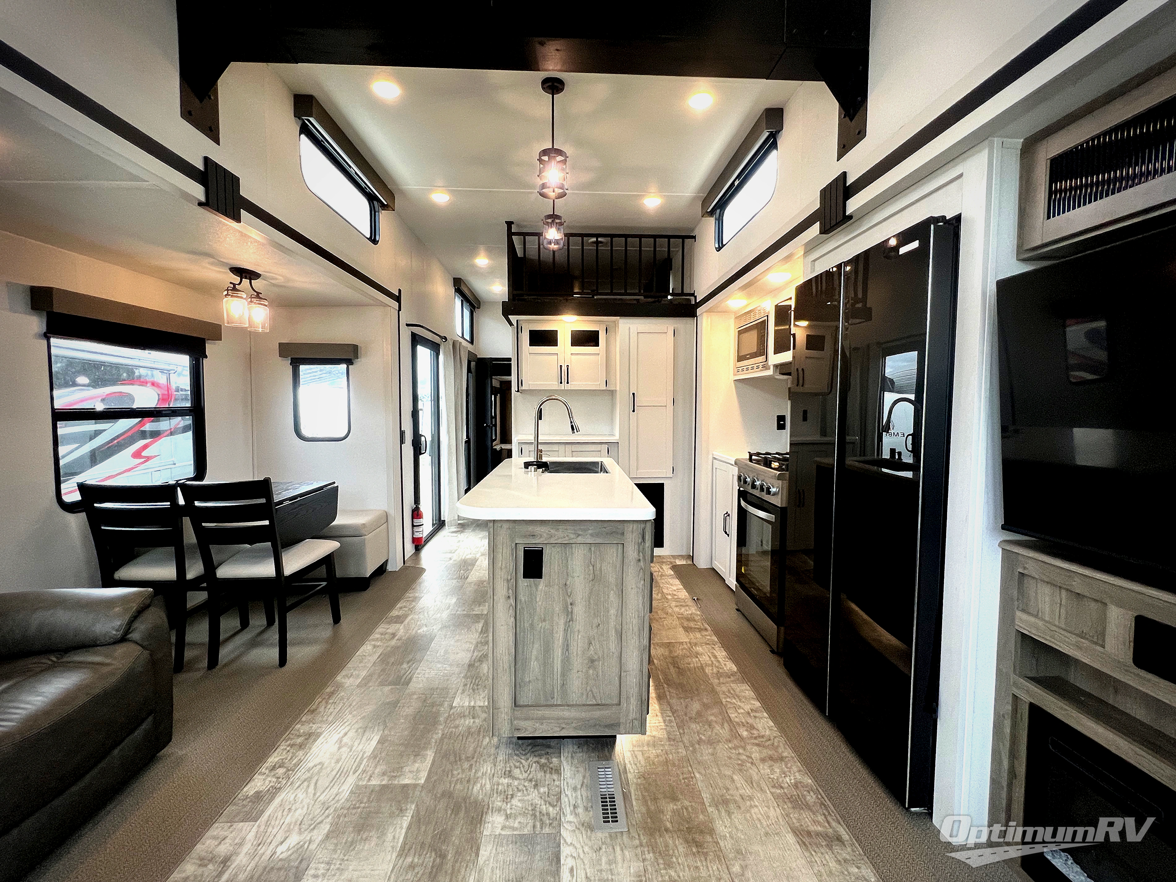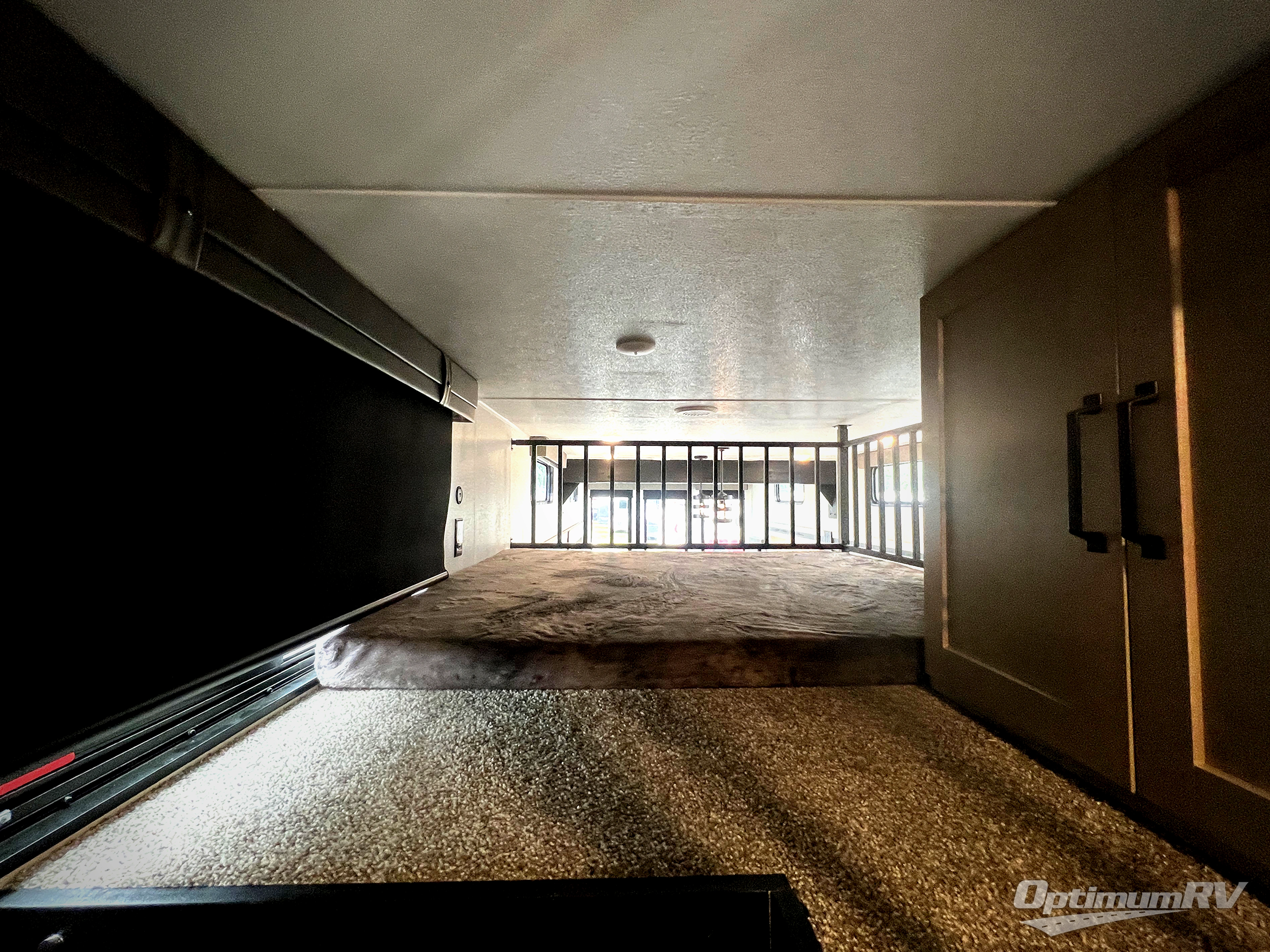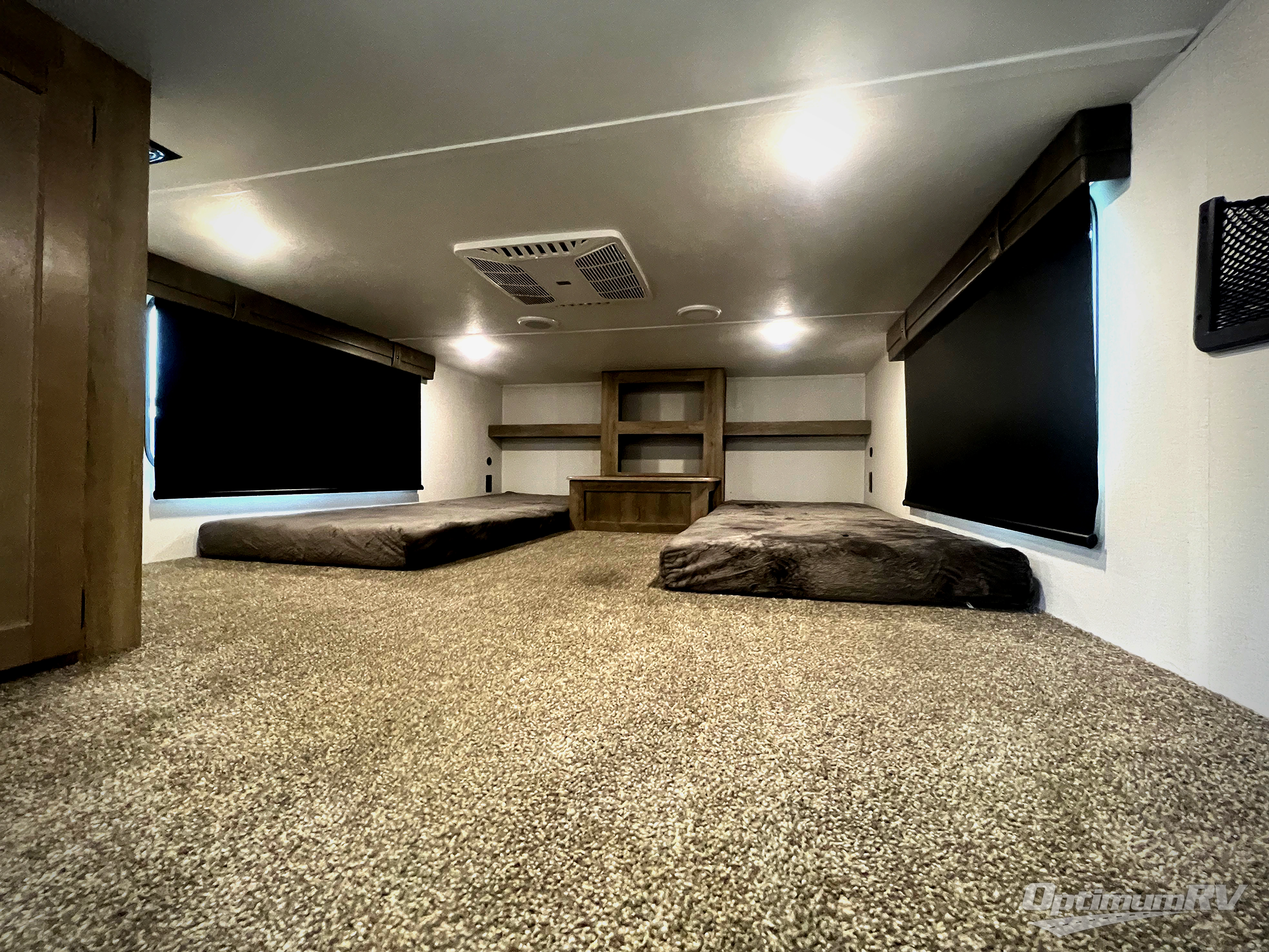Wherever your destination may be, you can be sure to enjoy it to the fullest with this trailer in tow! With two entry doors, you can enter in through the rear private bedroom or the main living area. The bedroom includes a king bed slide out, a wardrobe/closet to keep your clothes organized, plus a closet with the option to add washer and dryer prep. Just outside this room are steps that lead to the large loft area with a 58" x 58" bunk mat and a cabinet on one side, plus two 32" x 69" bunk mats on the other. There is also a cabinet and a wardrobe/closet for plenty of storage space. Once you've headed back downstairs, you can relax on the dual recliners, front sofa, or free-standing table with a bench and two seats. And the chef of your group will love the kitchen with its residential style refrigerator and pantry, kitchen island, and four burner cooktop!