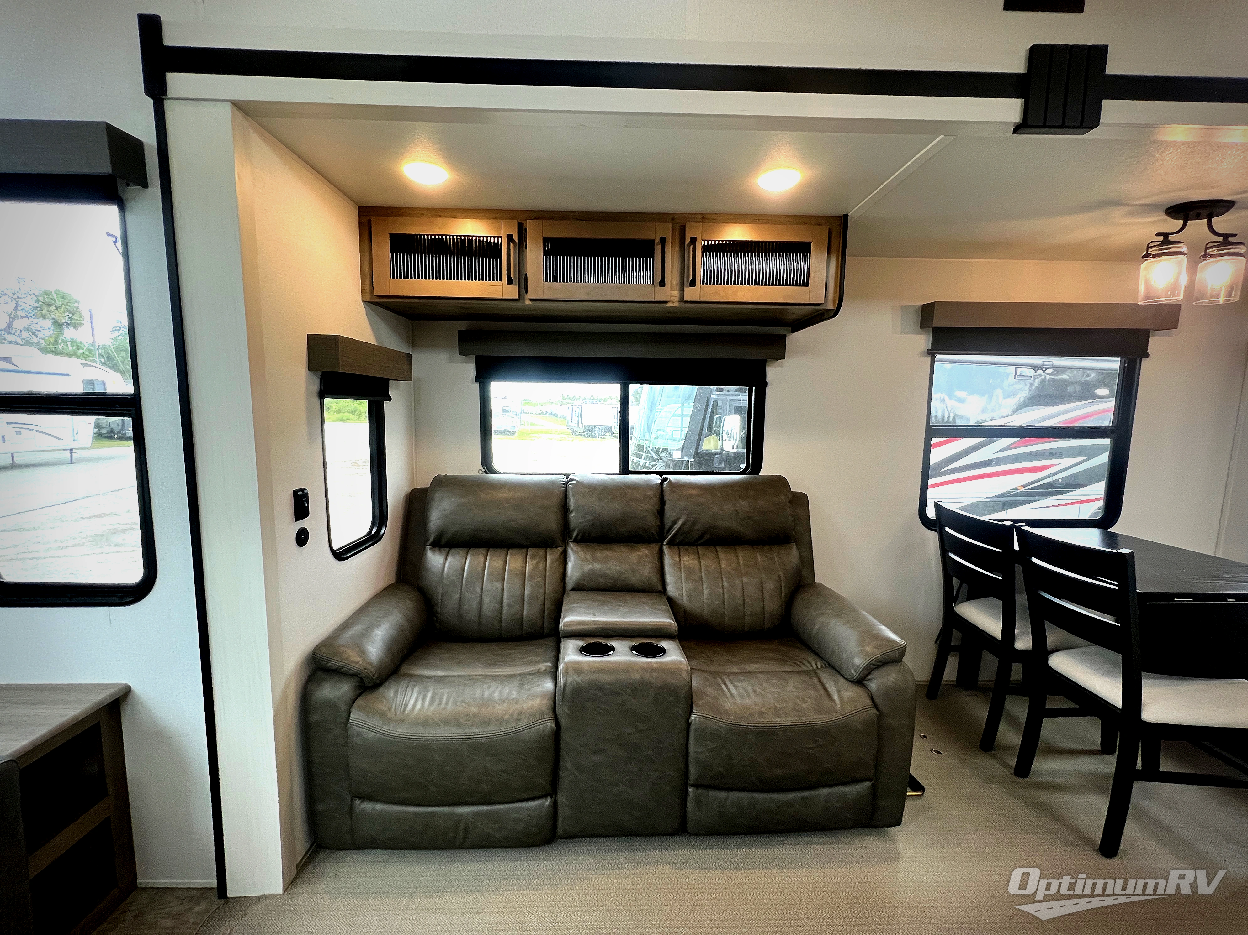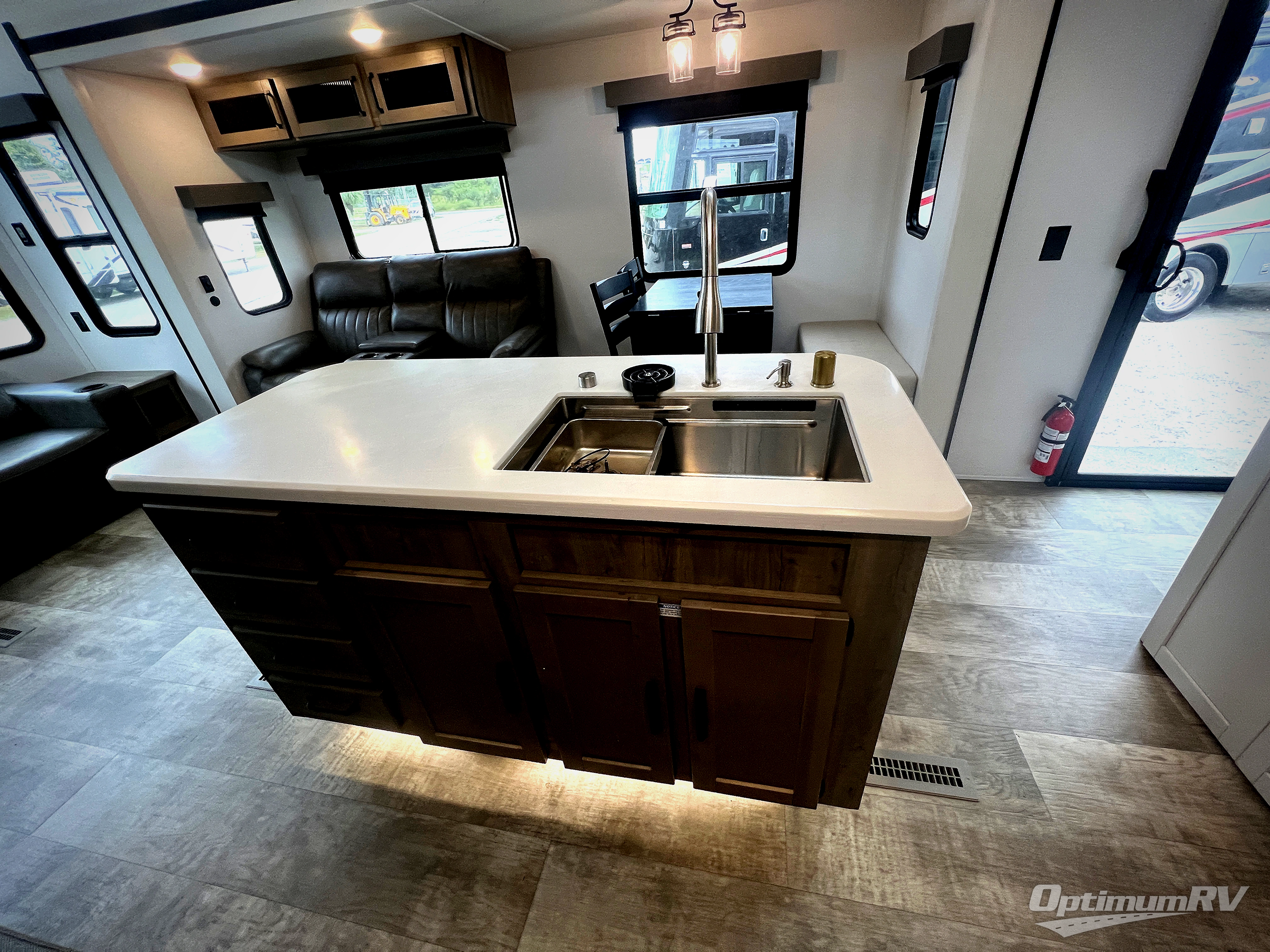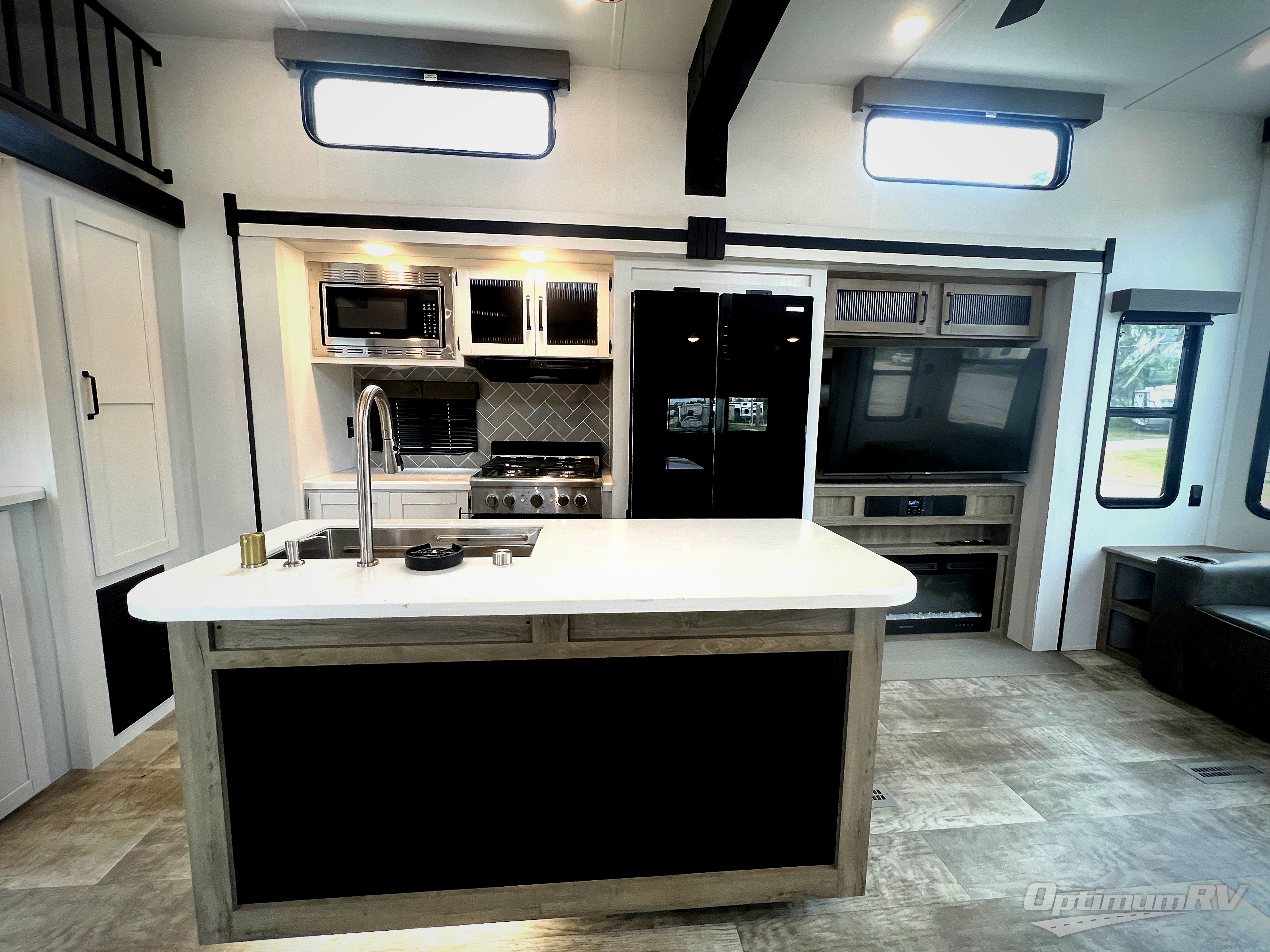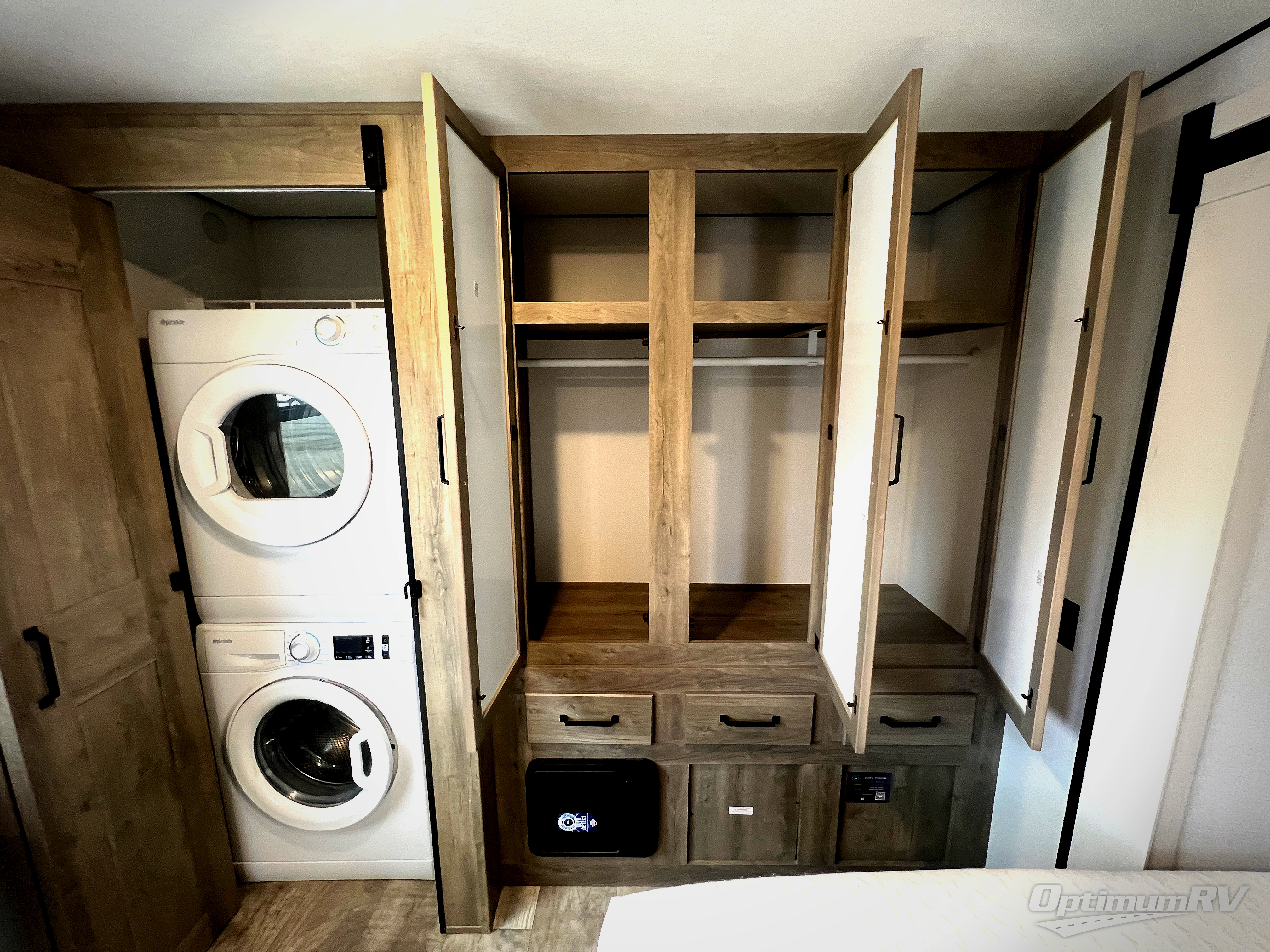 Wherever your destination may be, you can be sure to enjoy it to the fullest with this trailer in tow! With two entry doors, you can enter in through the rear private bedroom or the main living area. The bedroom includes a king bed slide out, a wardrobe/closet to keep your clothes organized, plus a closet with the option to add washer and dryer prep. Just outside this room are steps that lead to the large loft area with a 58" x 58" bunk mat and a cabinet on one side, plus two 32" x 69" bunk mats on the other. There is also a cabinet and a wardrobe/closet for plenty of storage space. Once you've headed back downstairs, you can relax on the dual recliners, front sofa, or free-standing table with a bench and two seats. And the chef of your group will love the kitchen with its residential style refrigerator and pantry, kitchen island, and four burner cooktop!