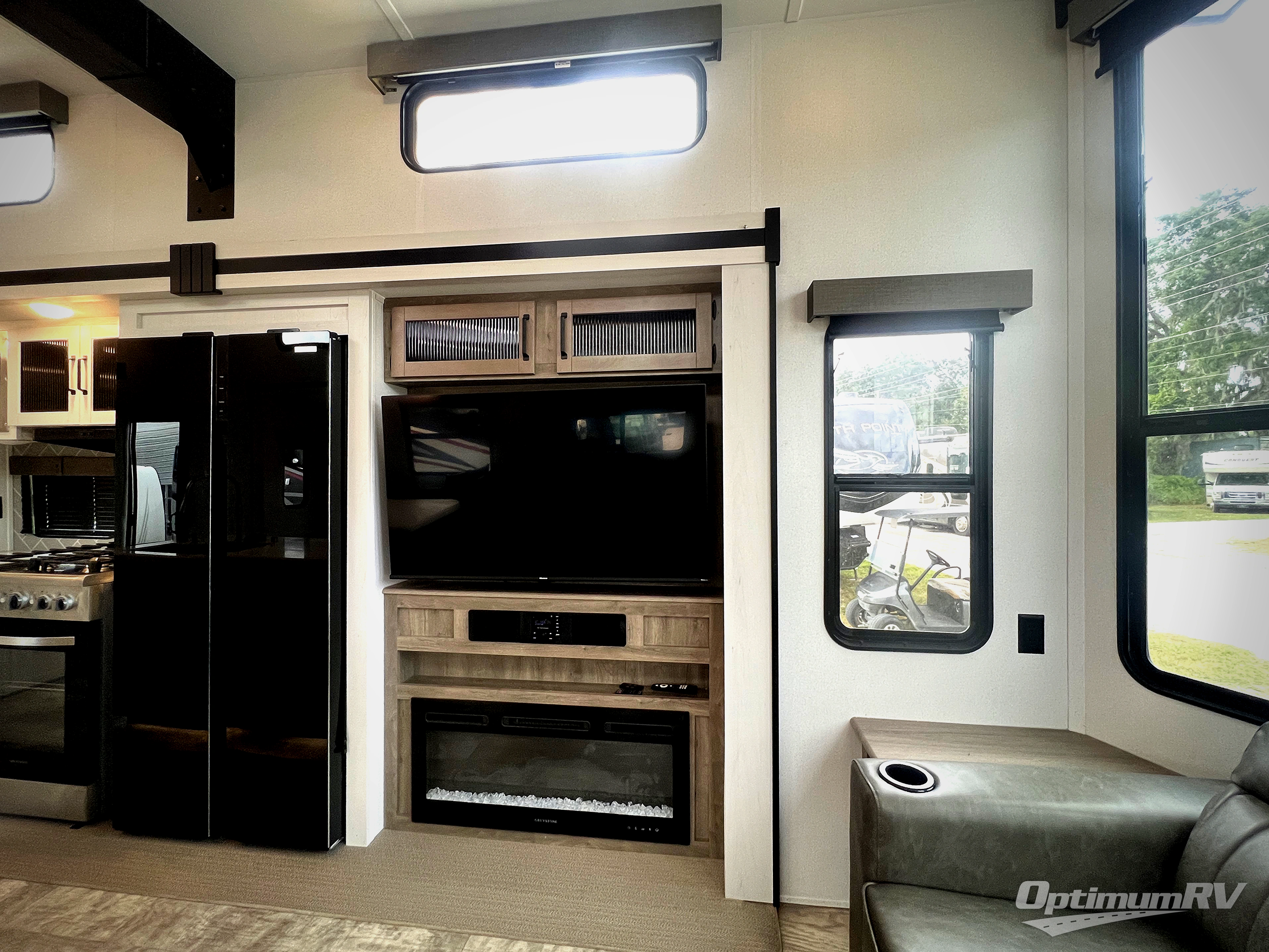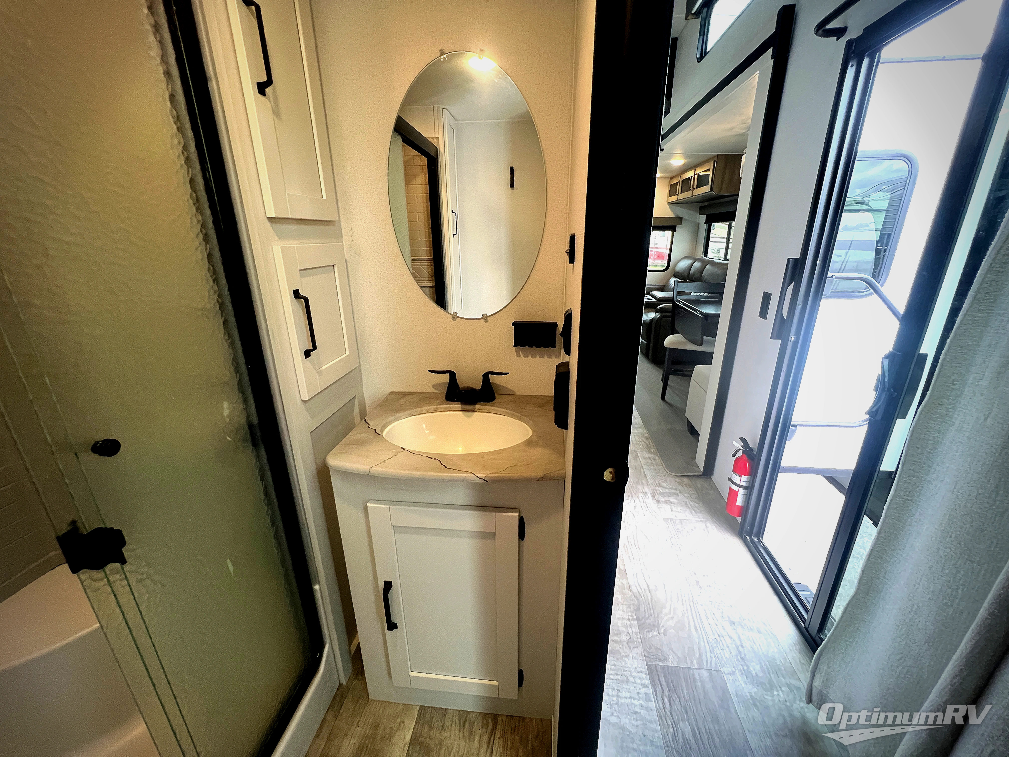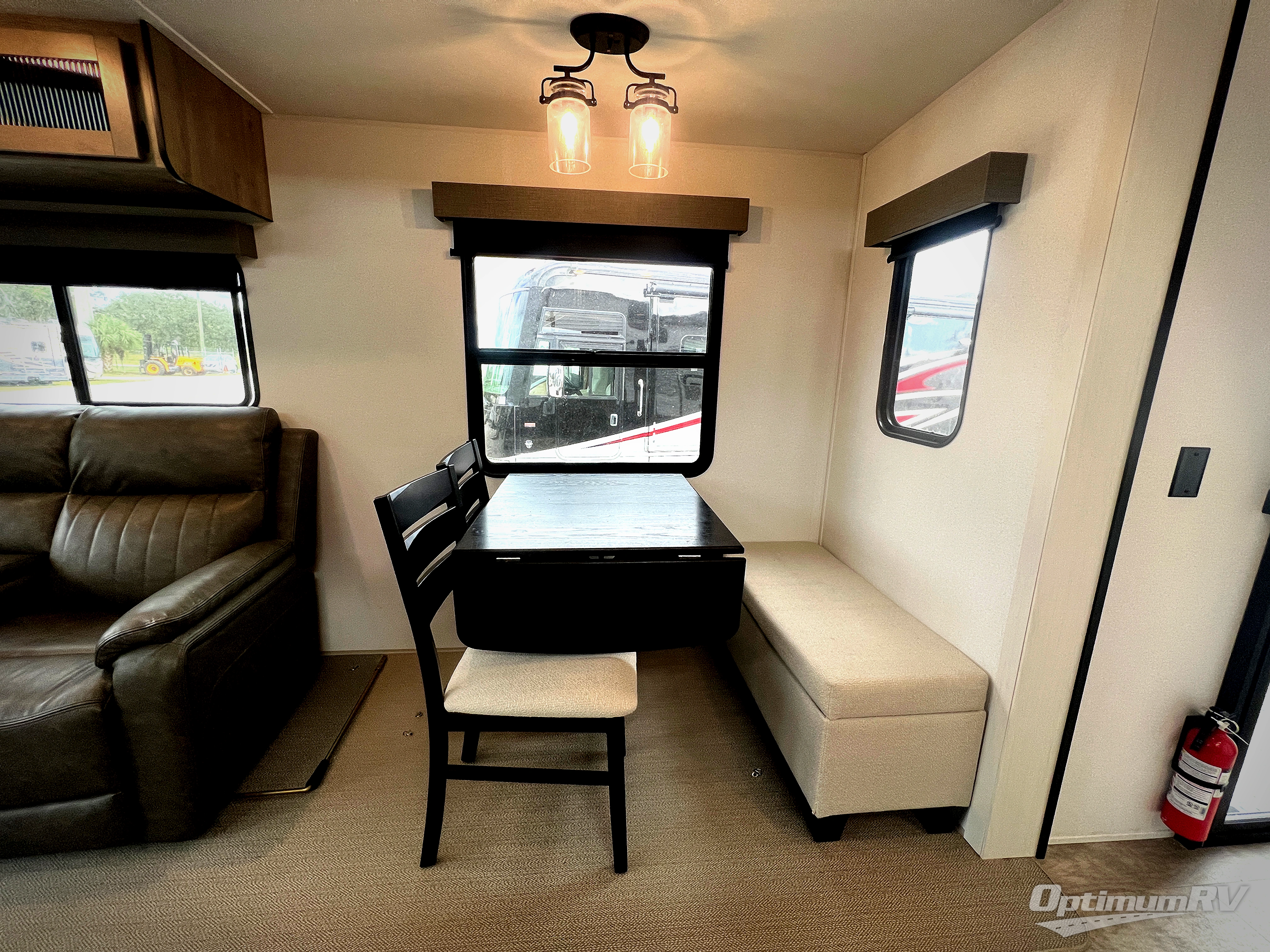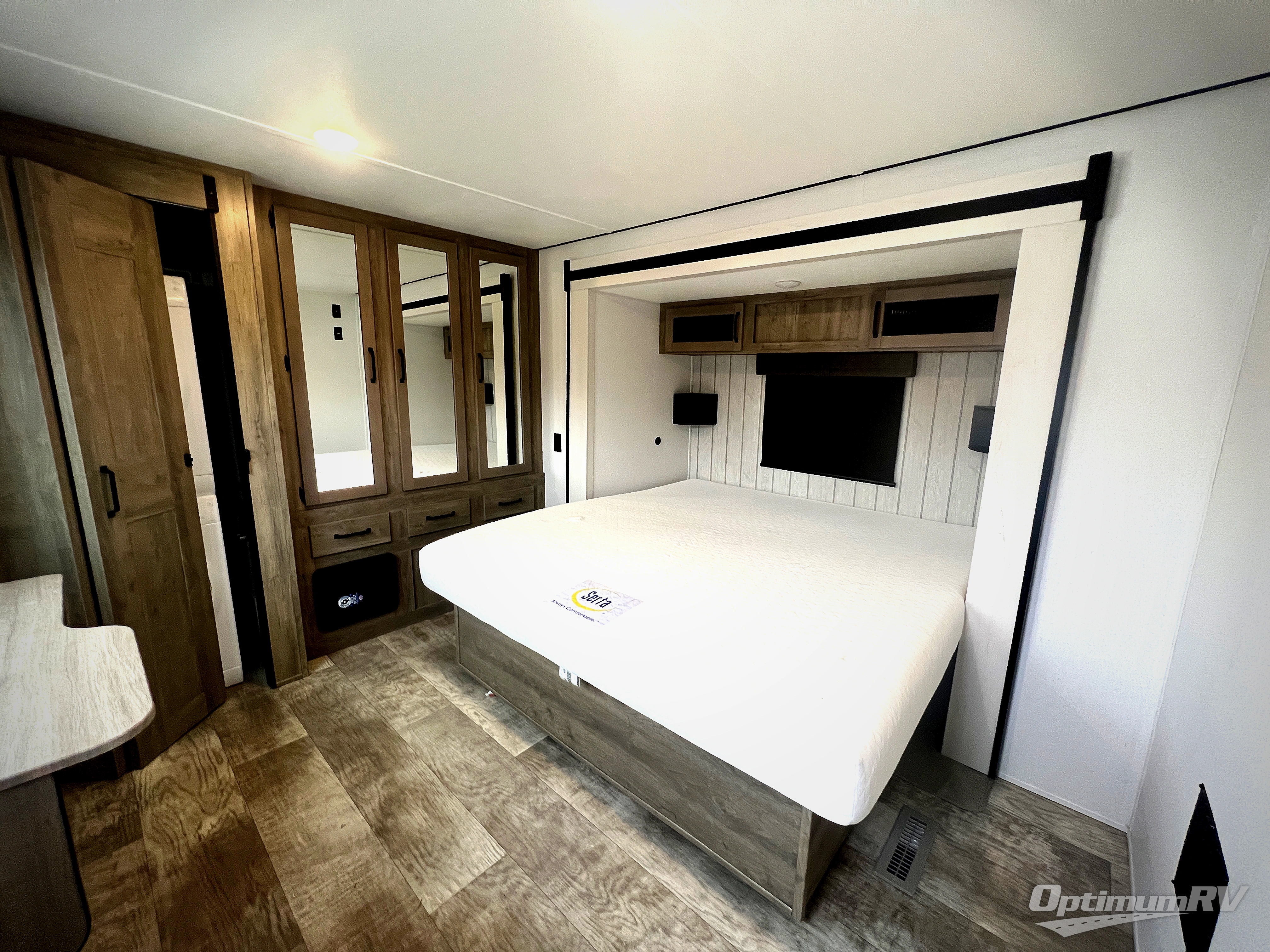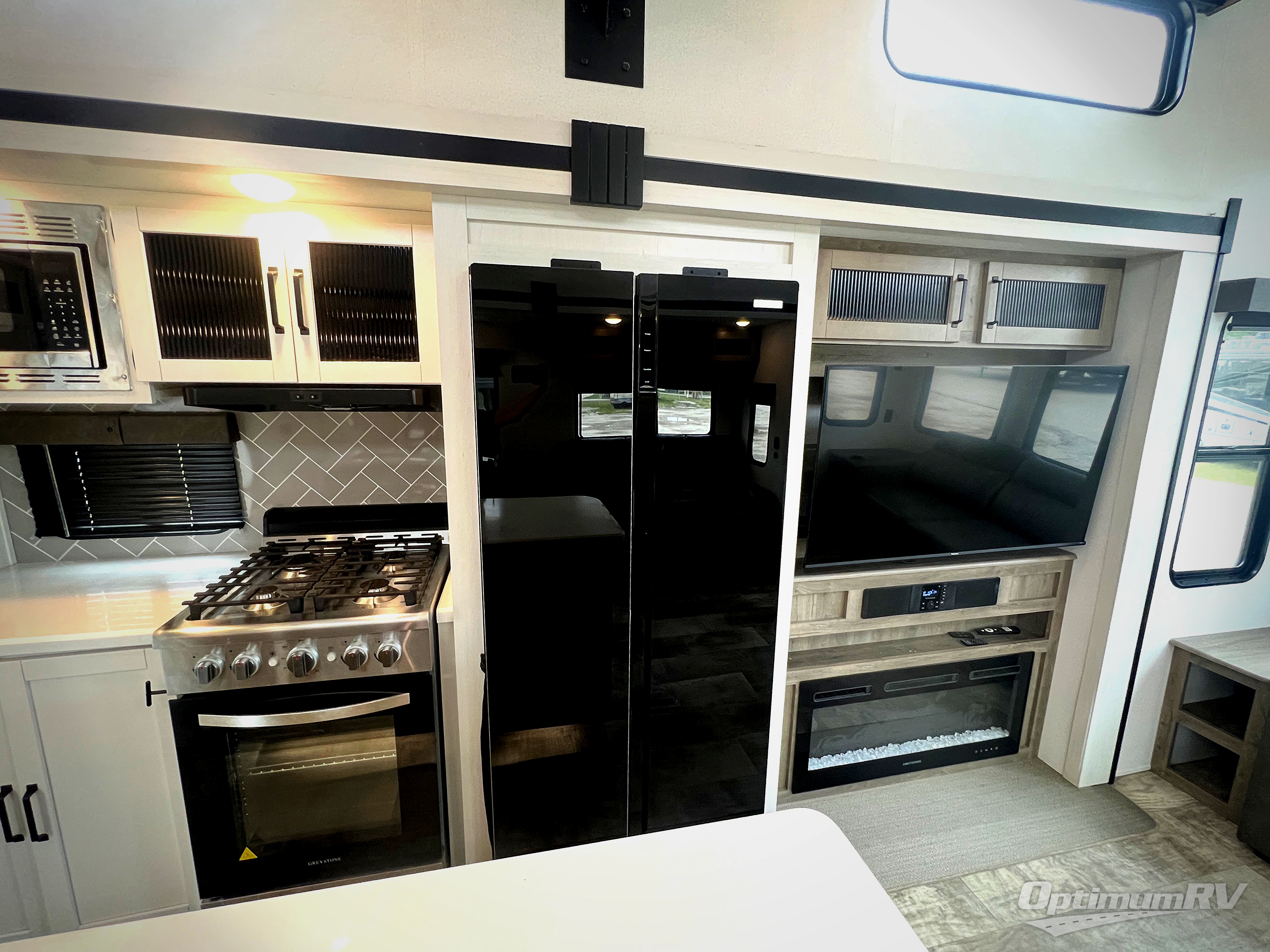 Wherever your destination may be, you can be sure to enjoy it to the fullest with this trailer in tow! With two entry doors, you can enter in through the rear private bedroom or the main living area. The bedroom includes a king bed slide out, a wardrobe/closet to keep your clothes organized, plus a closet with the option to add washer and dryer prep. Just outside this room are steps that lead to the large loft area with a 58" x 58" bunk mat and a cabinet on one side, plus two 32" x 69" bunk mats on the other. There is also a cabinet and a wardrobe/closet for plenty of storage space. Once you've headed back downstairs, you can relax on the dual recliners, front sofa, or free-standing table with a bench and two seats. And the chef of your group will love the kitchen with its residential style refrigerator and pantry, kitchen island, and four burner cooktop!