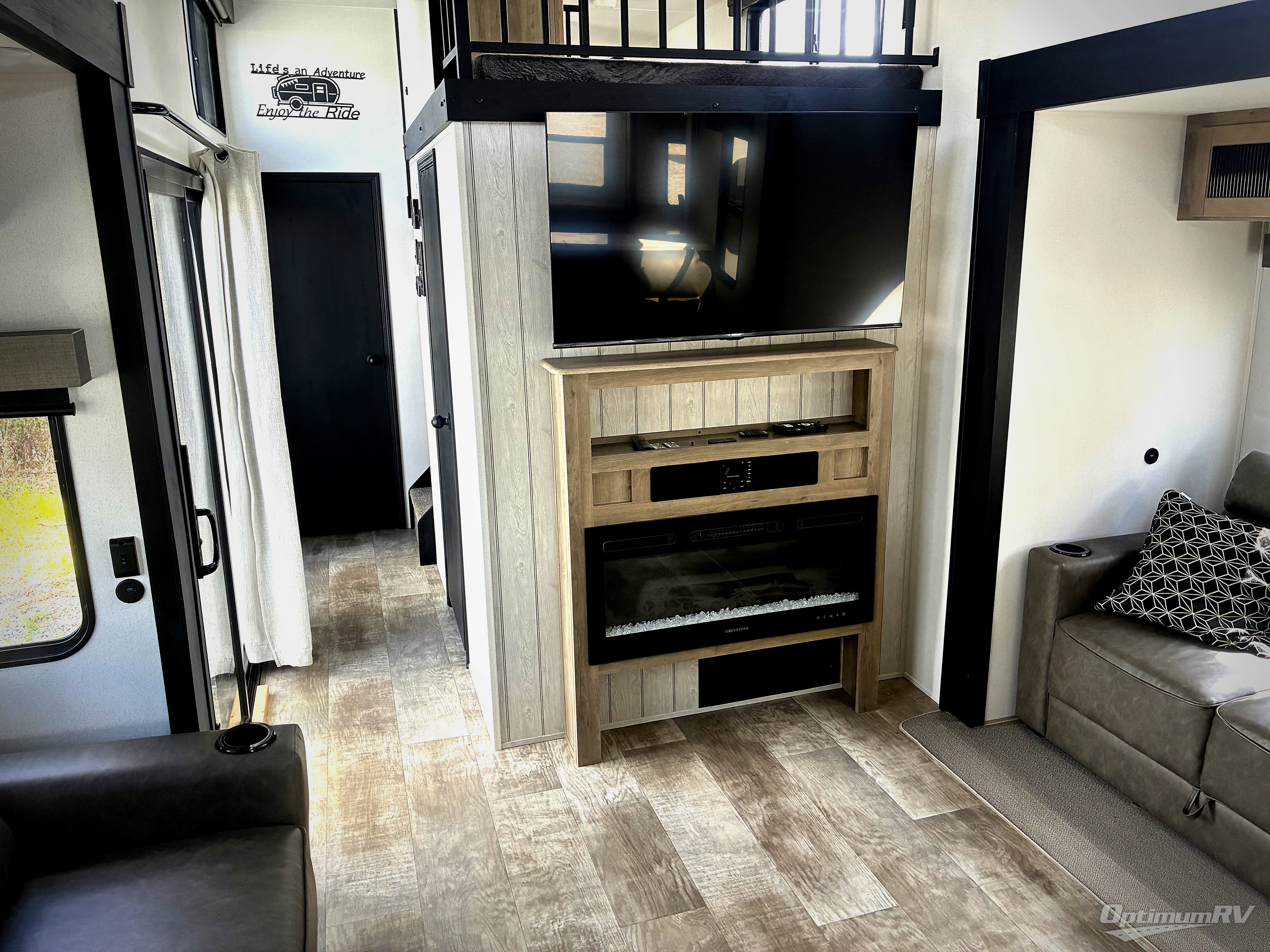 This is the perfect destination trailer for a larger group since it can sleep up to nine campers each night. The little ones will love the double loft areas with three bunk mats and storage space for their things, while you take the rear private bedroom. There is a king bed slide out here, along with a wardrobe/closet for your clothes, plus a second closet with the option to add washer and dryer prep. Everyone can meet in the middle living room to relax on the dual sofas or recliners across from the fireplace and entertainment center. Head to the front of the unit where you'll find the kitchen that includes ample counter space to prep meals, a residential style refrigerator and pantry for food storage, and a free-standing table to dine at. There is also a breakfast nook that overlooks the living area so you can visit with the cook and watch a movie at the same time!