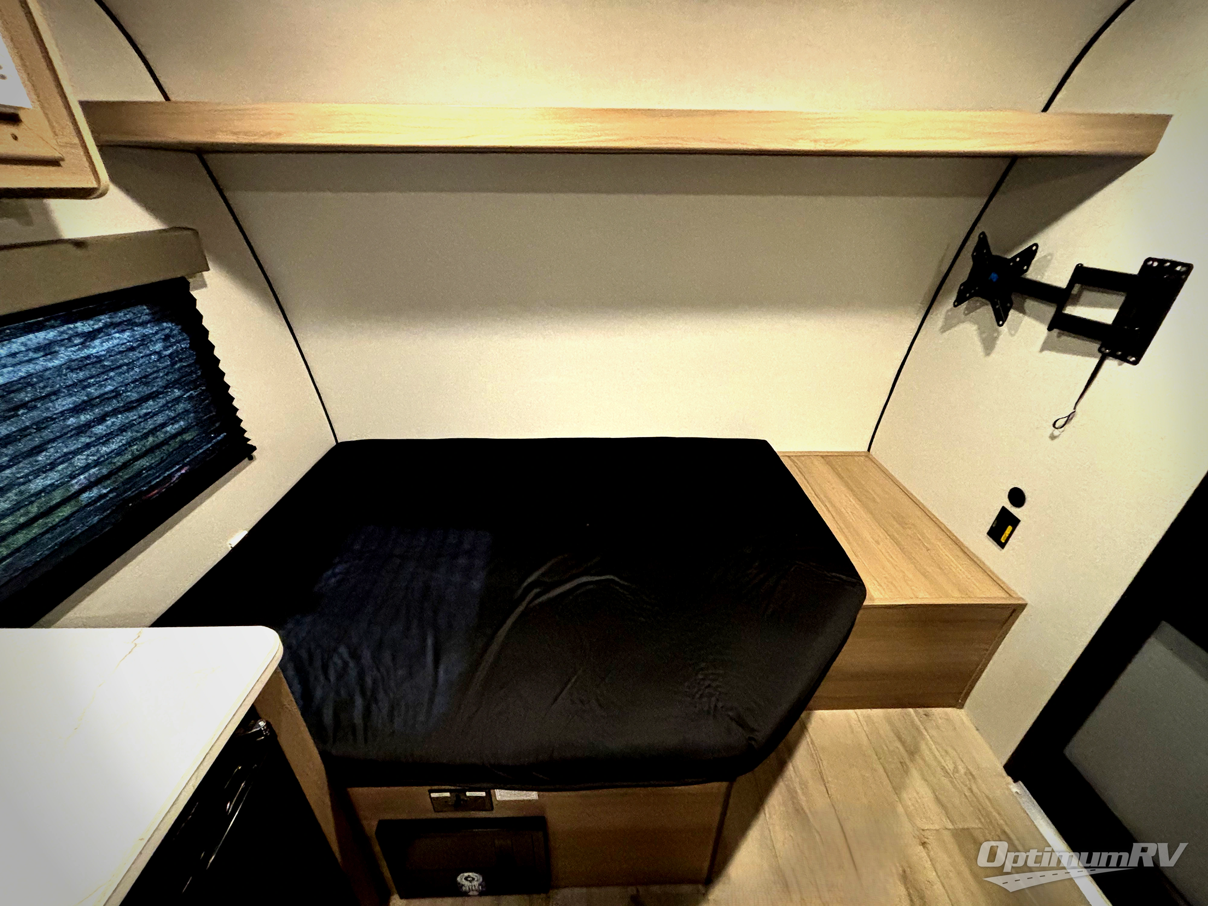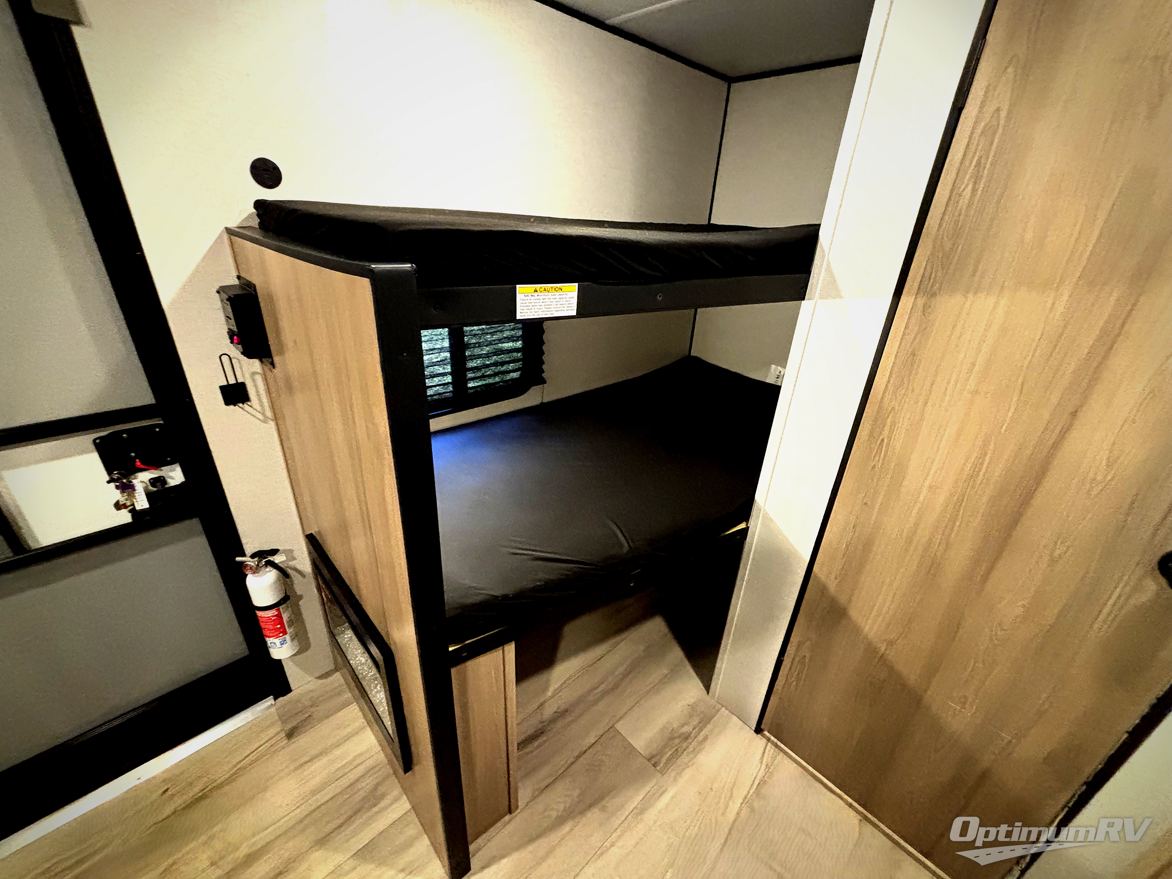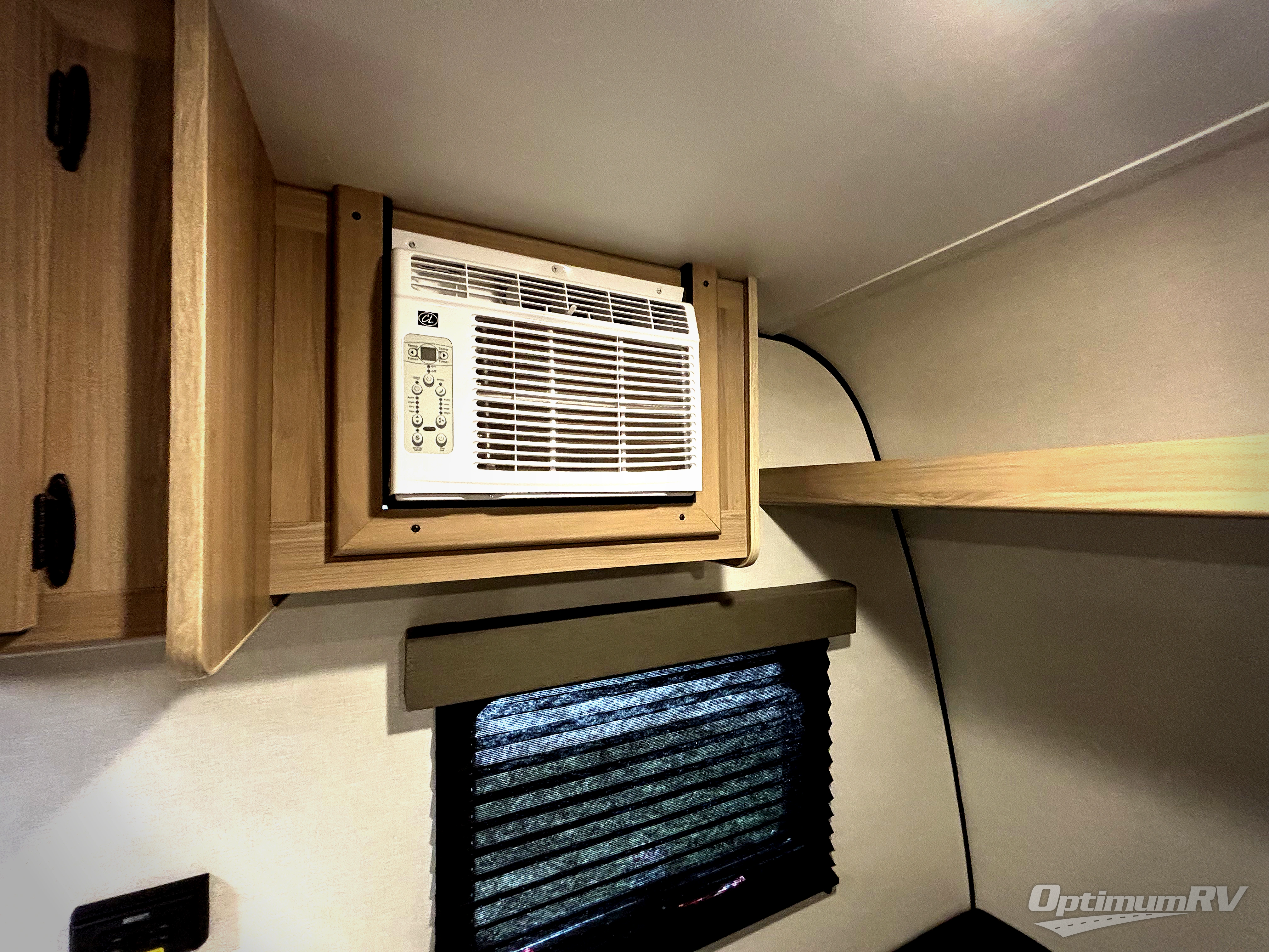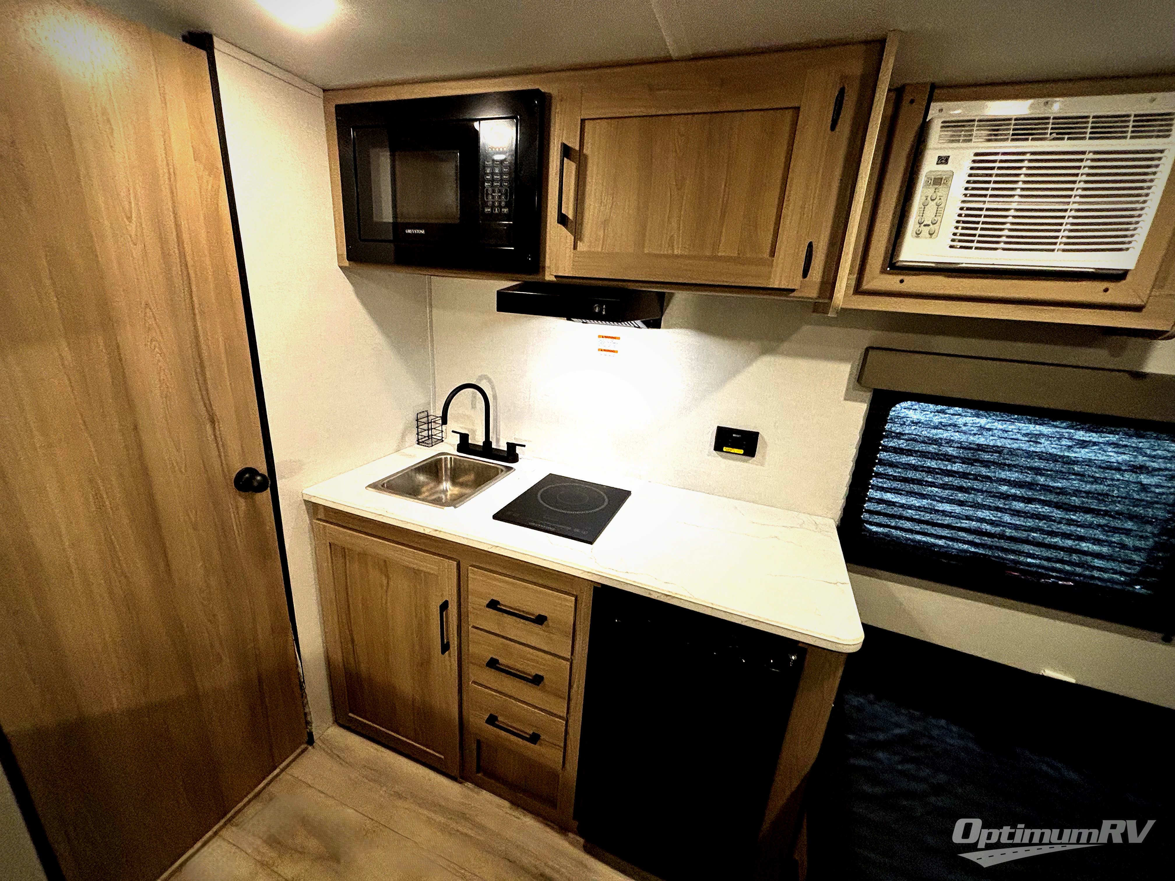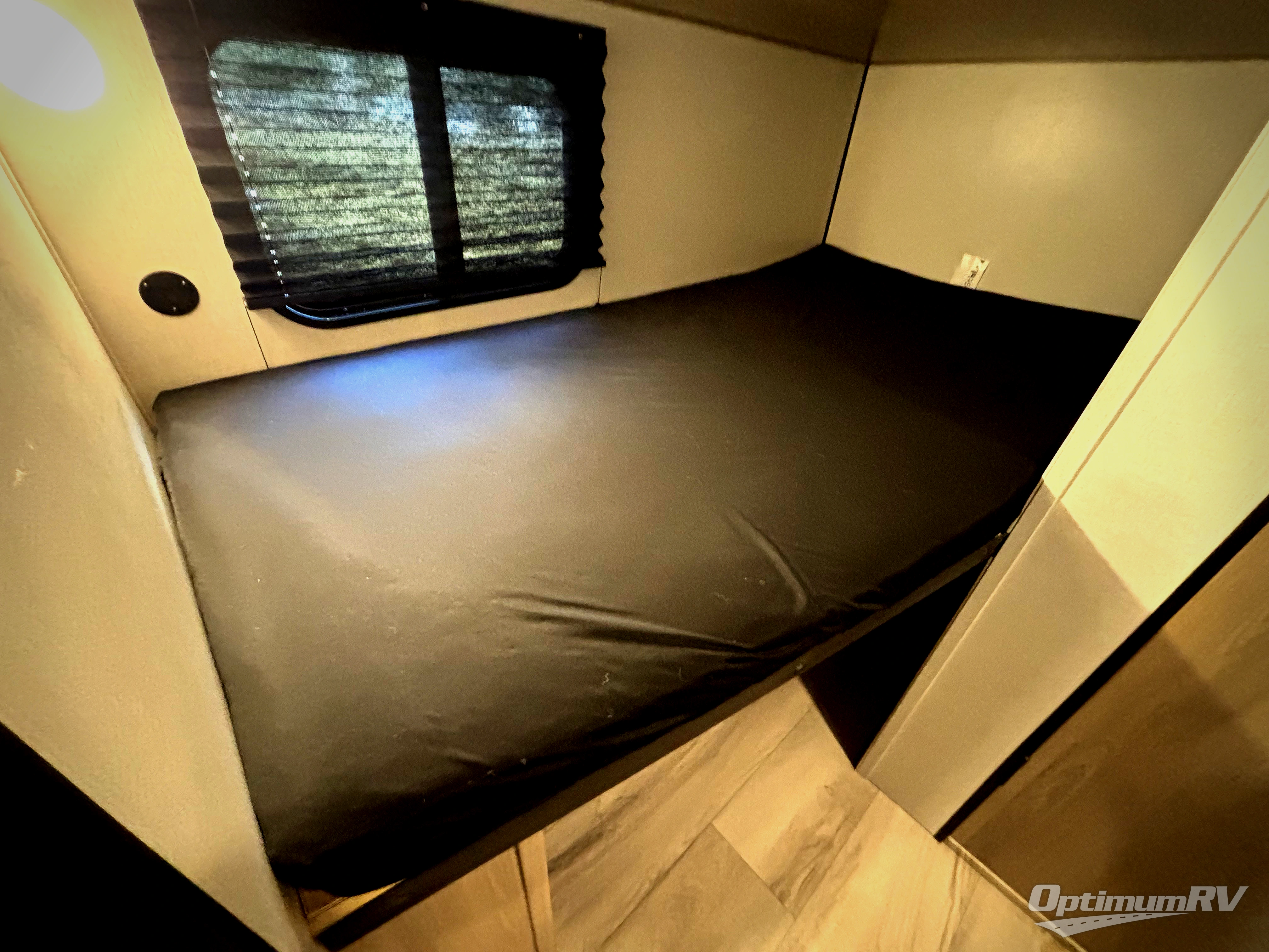 This compact travel trailer lets you camp in comfort at the location of your choice! Since there is a front queen bed, you won't have to sleep on an air mattress, and the shelf above the bed will be perfect for your belongings. Bunk beds provide additional sleeping space for your guests or little ones, and the private bath includes a shower and toilet so you won't have to use the camp's facilities at night. This model includes an induction cooktop and microwave oven to cook meals, plus a 3.2 cu. ft. 110V refrigerator for food storage. And the 8' power awning outdoors provides a place for you to sit in your camp chairs after dinner!