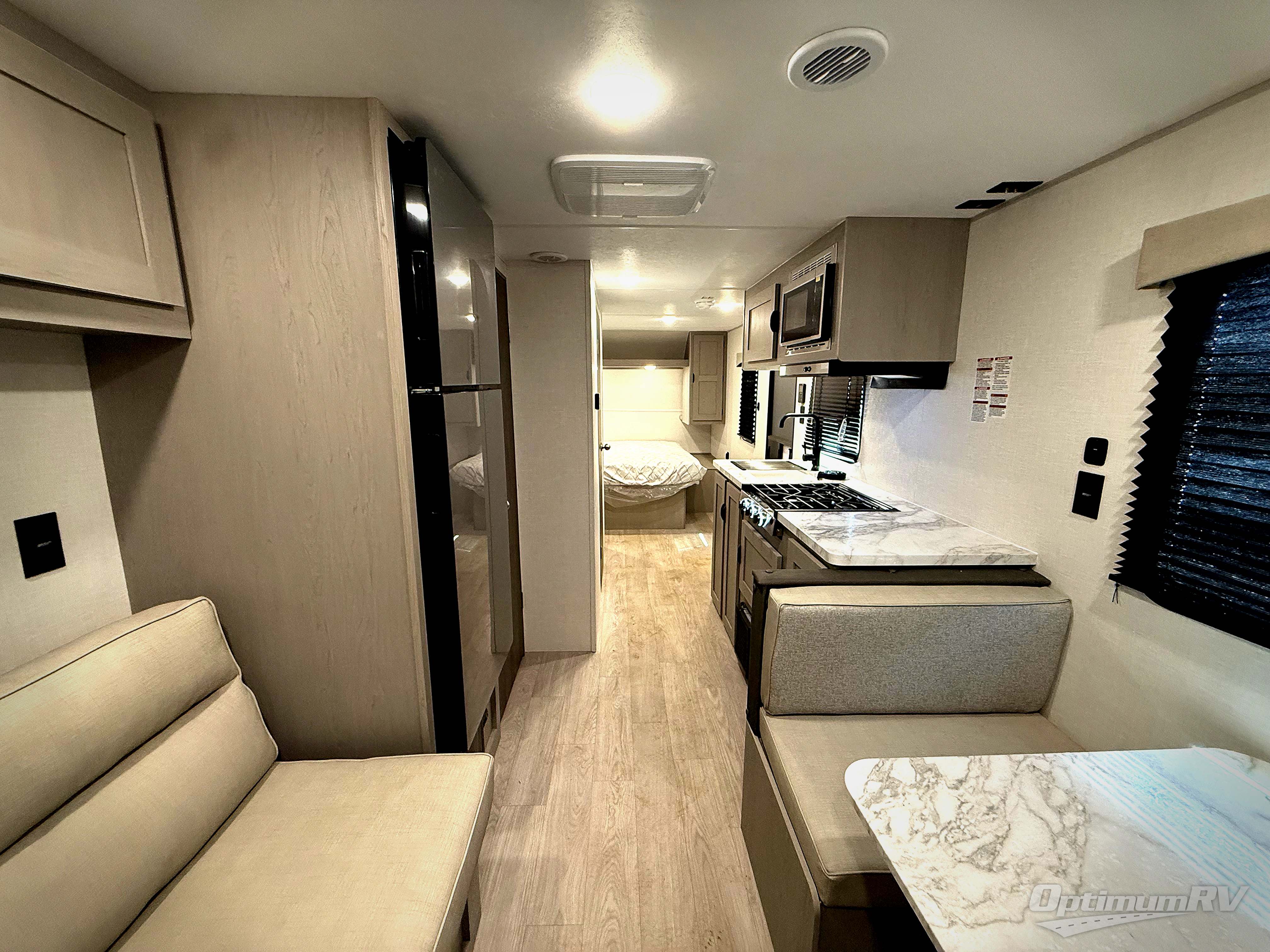 Time spent in this travel trailer will be time well spent! There is a front bedroom with a 60" x 74" queen bed, dual wardrobes, and an overhead shelf on either side of the bed to keep your belongings close by. A three burner cooktop and microwave will let you make meals each day, and a 10 cu. ft. 12V refrigerator will help keep food stocked. This unit also includes a booth dinette in the back where you can dine together, along with a jack knife sofa on the other side for a place to relax! Both of these places can serve as extra sleeping space if needed.