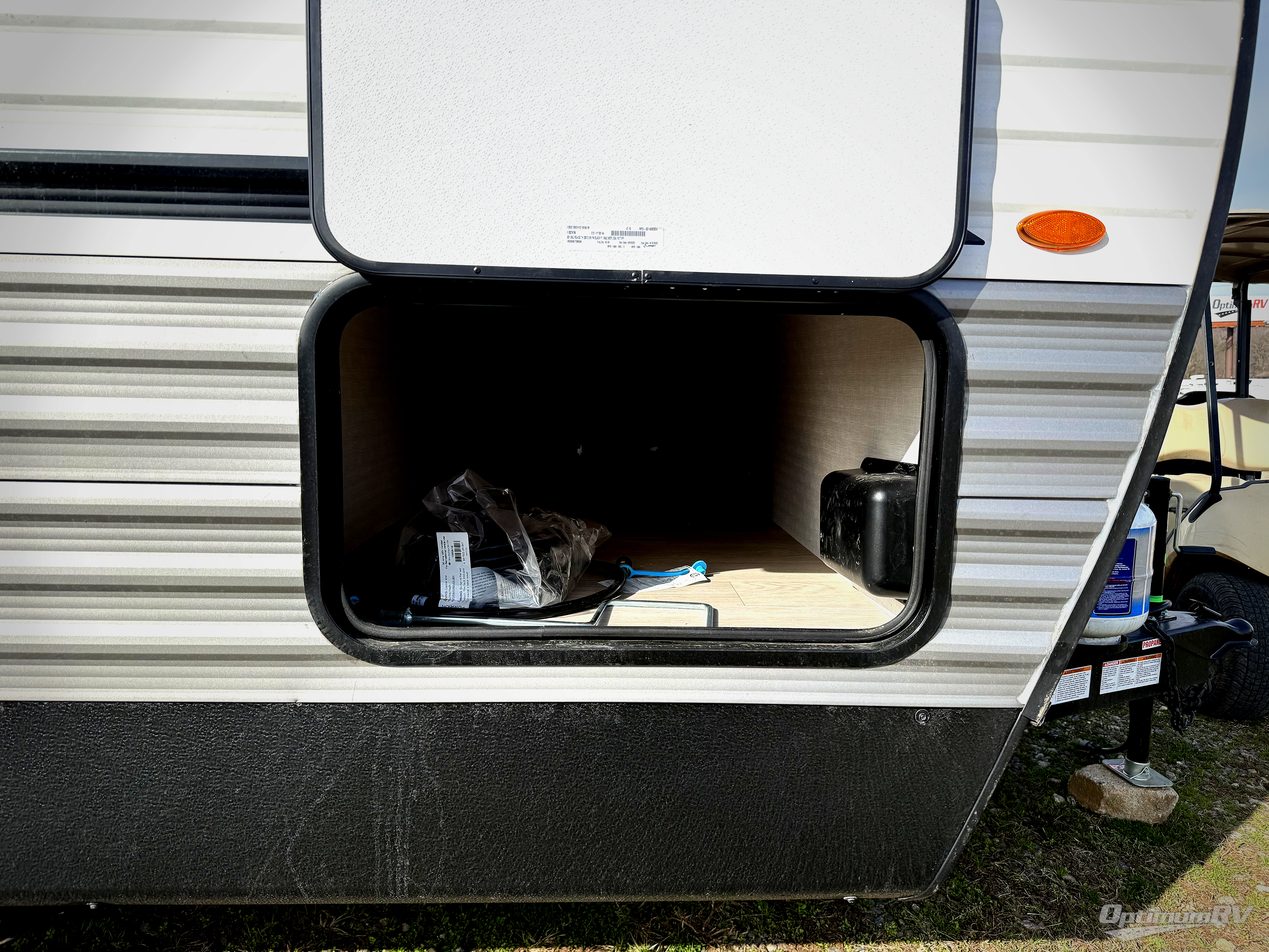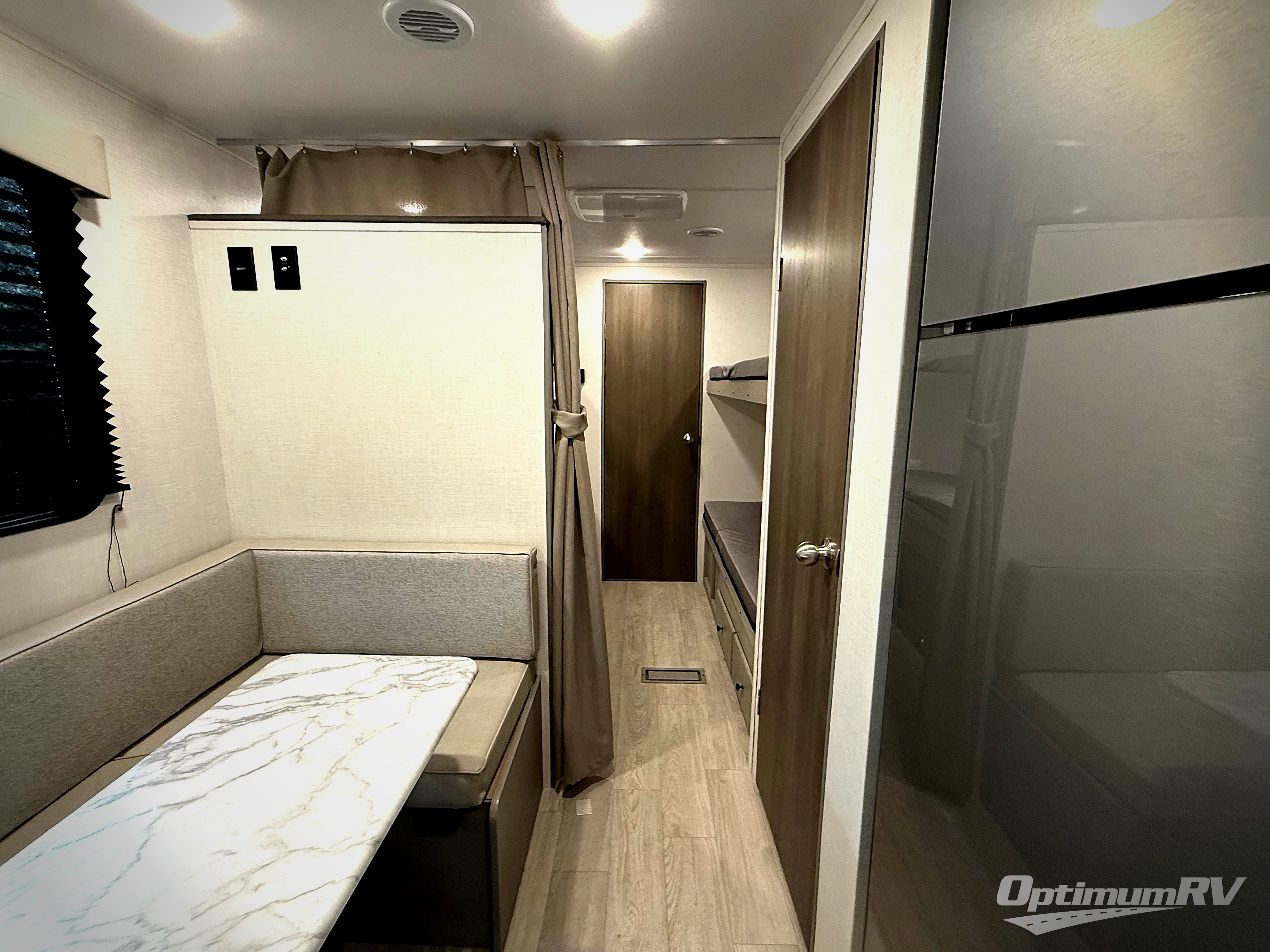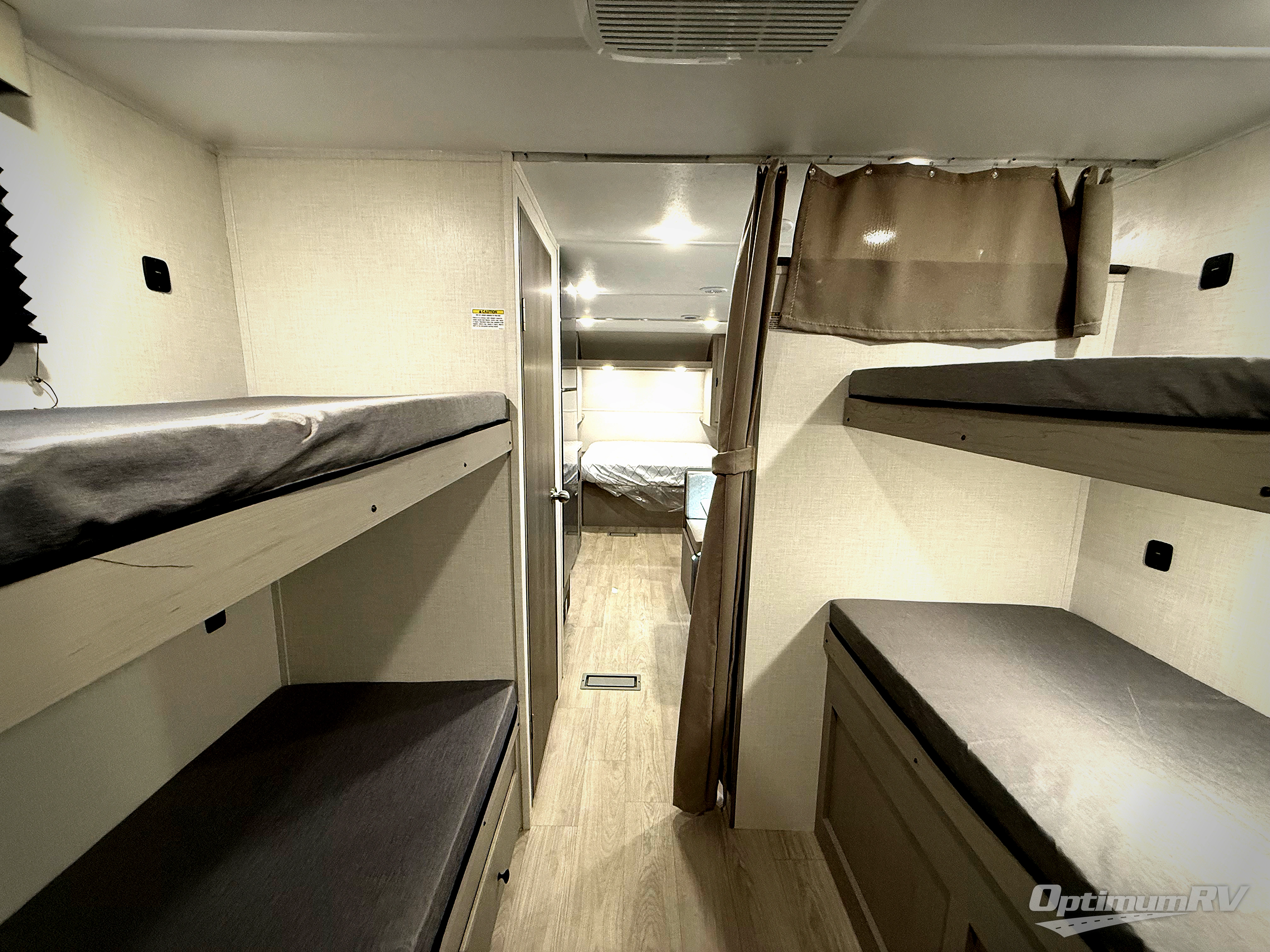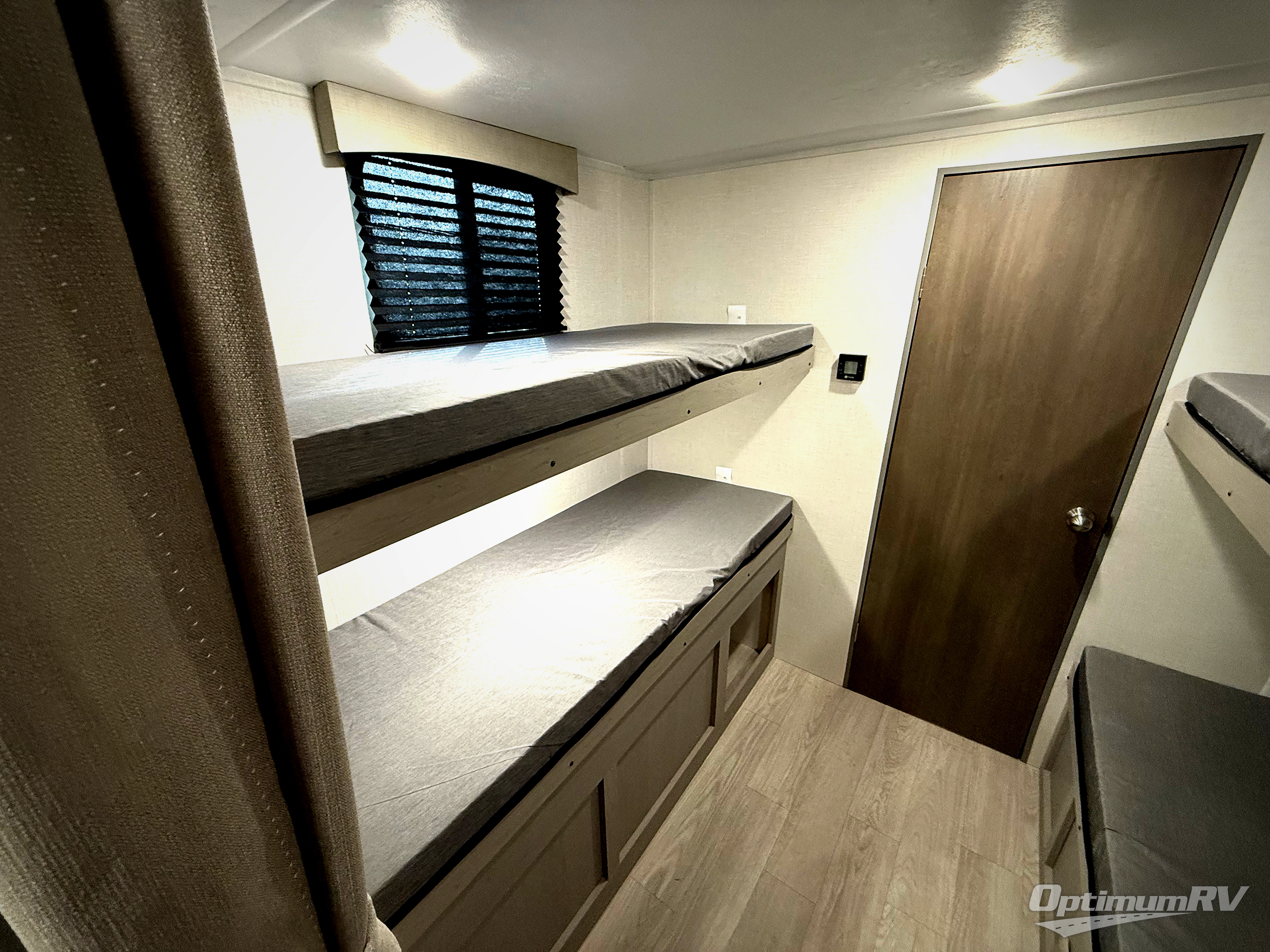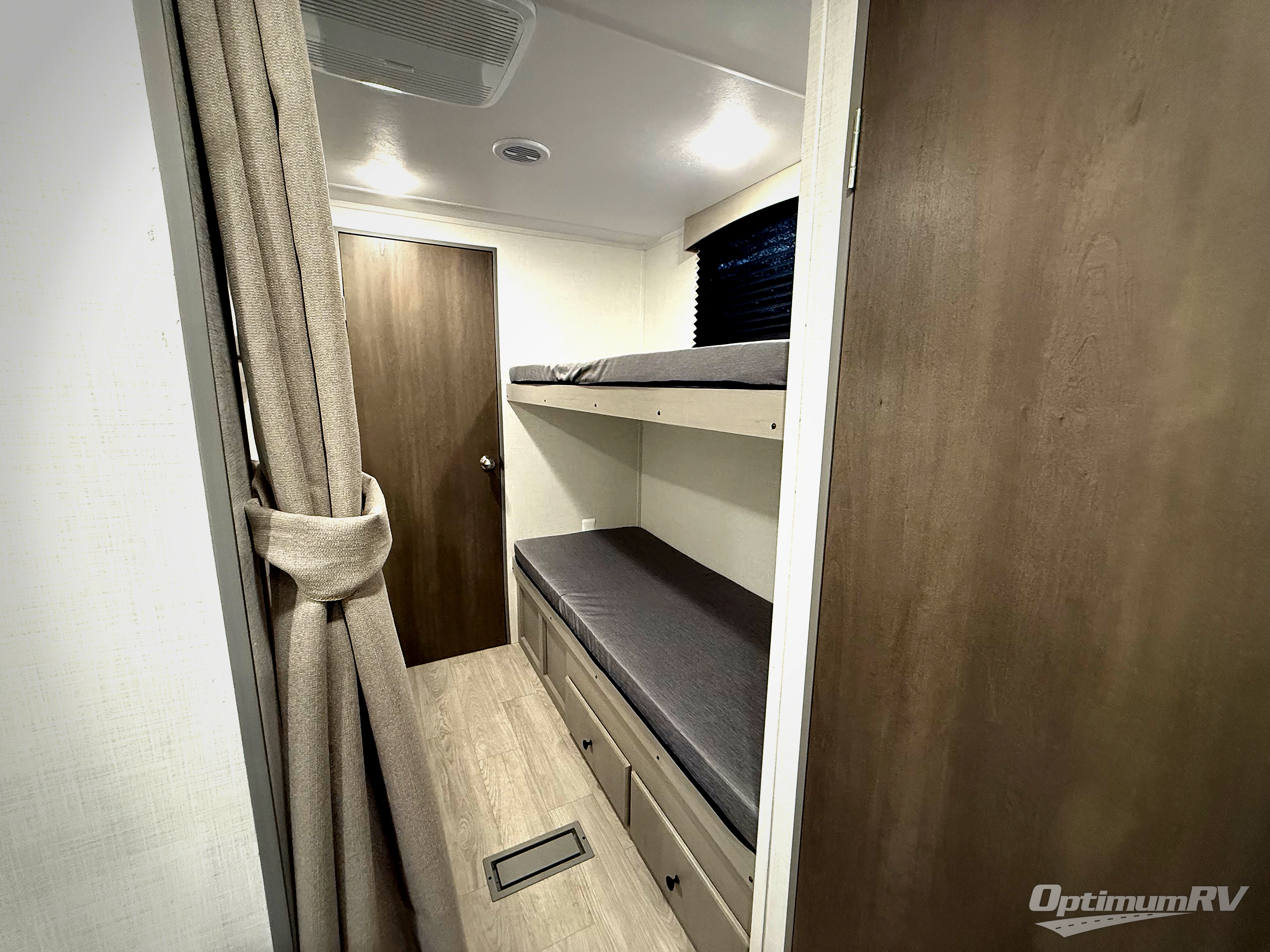 Your guests will love camping with you in this travel trailer! The bunkhouse suite includes four bunks with storage underneath plus a full rear bath to easily clean up each day. The front RV queen bed will provide a great night's rest, and you can store your clothing and essentials in the wardrobe at each side, and you even have an overhead shelf for more space. You can make your best meals in the full kitchen with a three burner cooktop and microwave oven, and there is an 10 cu. ft. 12V refrigerator to keep your cold items fresh. The U-shaped dinette provides a place to dine, play games, and even let additional guests sleep over. This unit also features a closet with washer and dryer prep if you choose to add those appliances.