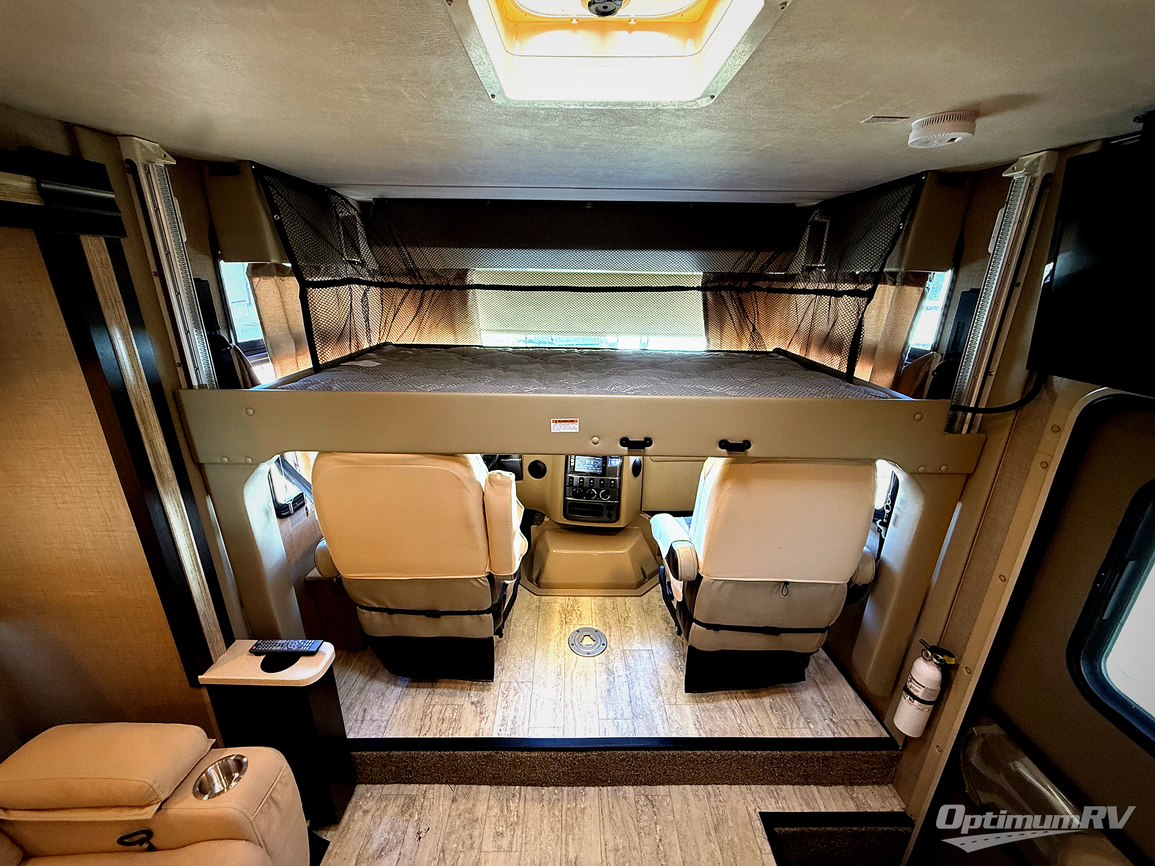 On the opposite side there is a slide out sofa bed, plus a removable pedestal table for dining. There are also three sets of seat belts to keep your rear seat travelers safe while moving down the road. The slide provides even more space to move around when fully extended. Between the driver and passenger seat you will find a coffee table which adds additional space for eating. There is also a 38" x 73" drop down overhead bunk above the cab area for added sleeping space for an extra overnight camper.