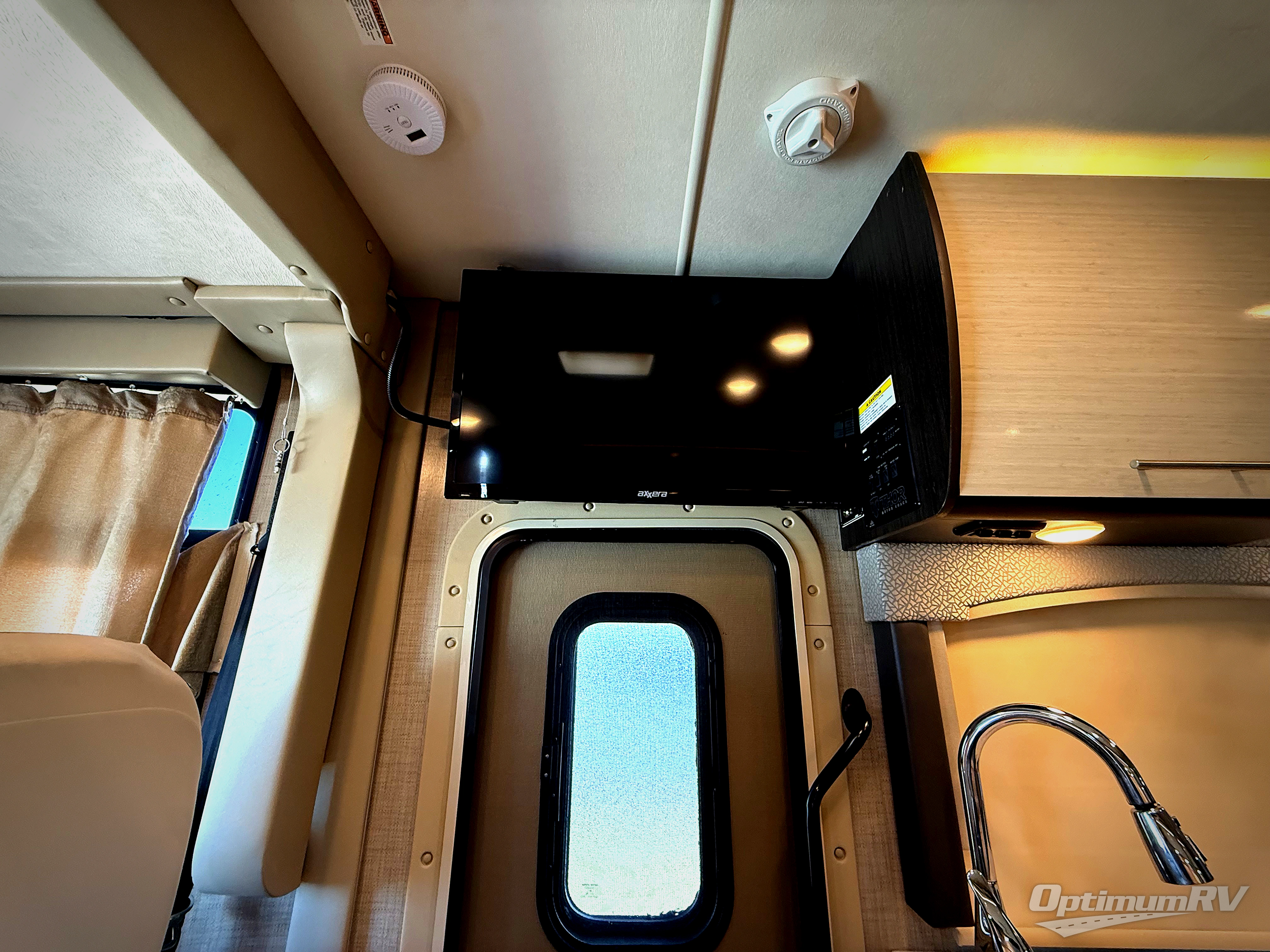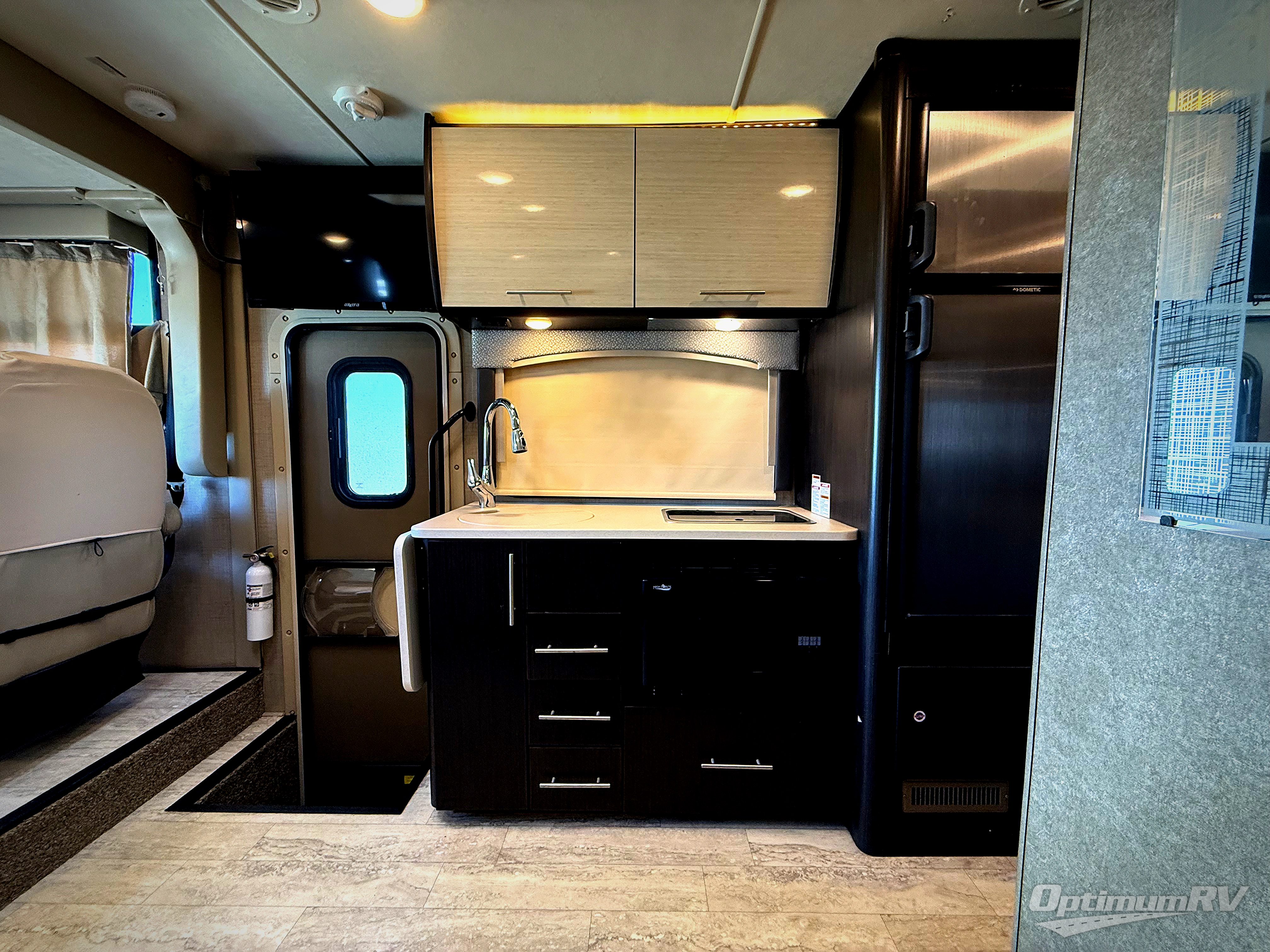 As you enter the curb side door there is a 32" LED TV directly above your head. To your immediate left there is a round kitchen sink, flip-up countertop, and two burner range with microwave oven below. You will also find a refrigerator for all of your perishables, plus overhead cabinets for dishes and things.