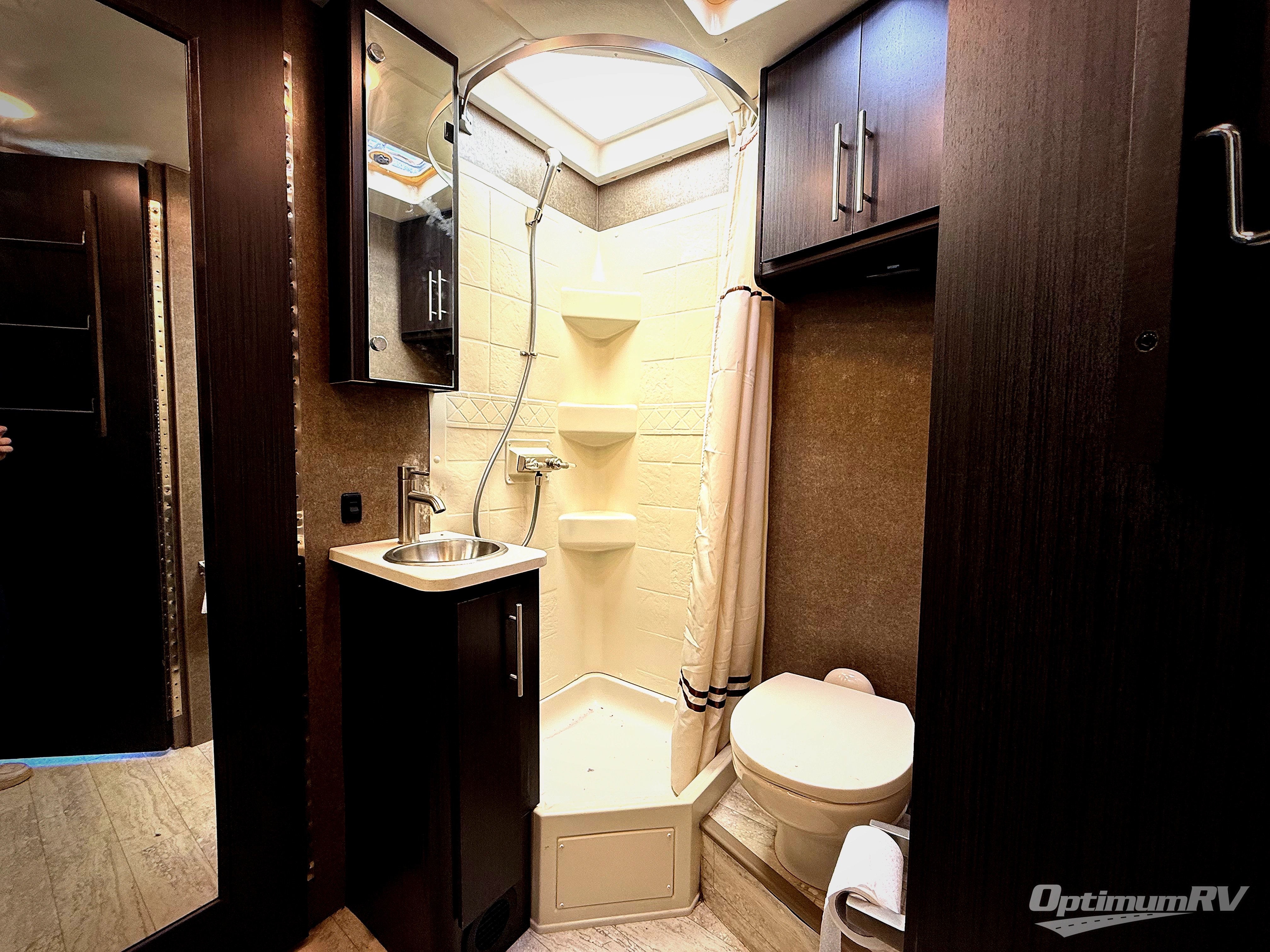 Moving toward the rear of the coach you have a complete bath with an angled 27" x 27" shower, a toilet, and a sink. The bath door can be opened further than normal with its bi-fold doors and positioned when open to block off a larger space for more privacy when dressing.