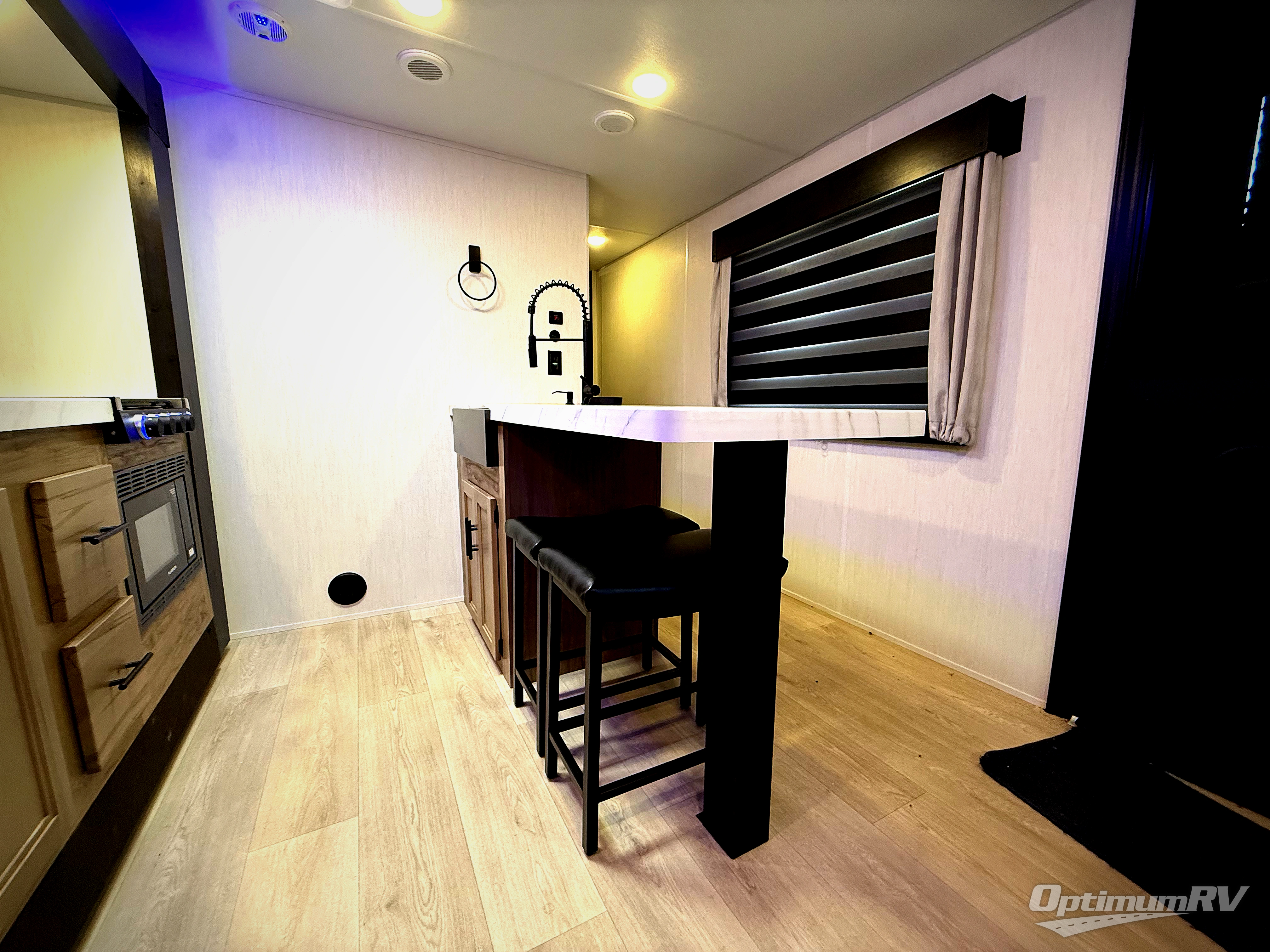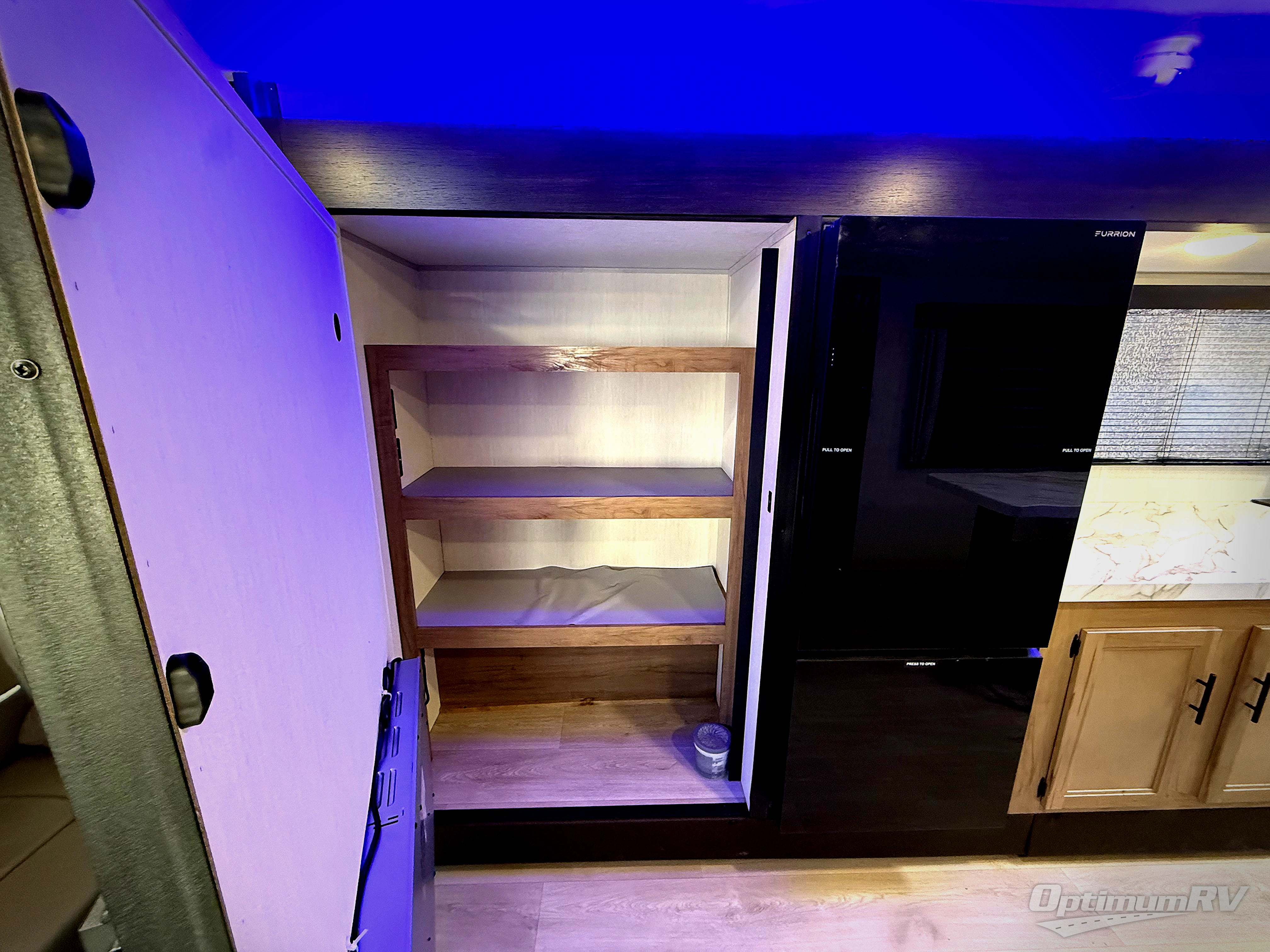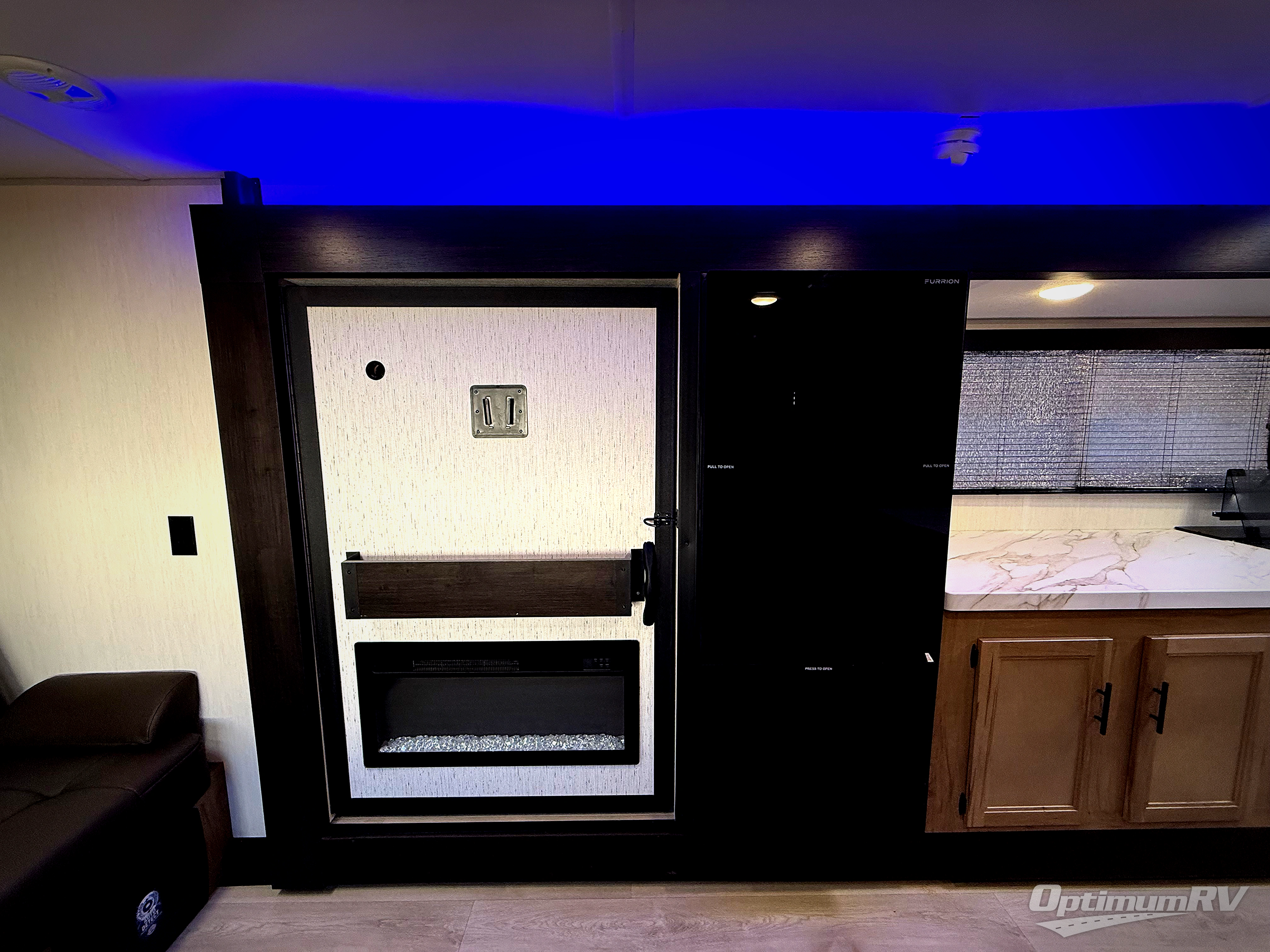 This travel trailer will feel just like home with its RV king bed in the front bedroom plus the full bath with a tub/shower, and there is a spacious living area thanks to the large slide out. Here, you'll find the air fryer and counter space, 12V refrigerator, and the fireplace with a hidden pantry behind it. Your crew can relax on the L-shaped sofa, or visit with the chef while they prep meals at the island peninsula. There are even two bar stools here for added convenience. Head outdoors to enjoy the power awning with LED lights in the evening!