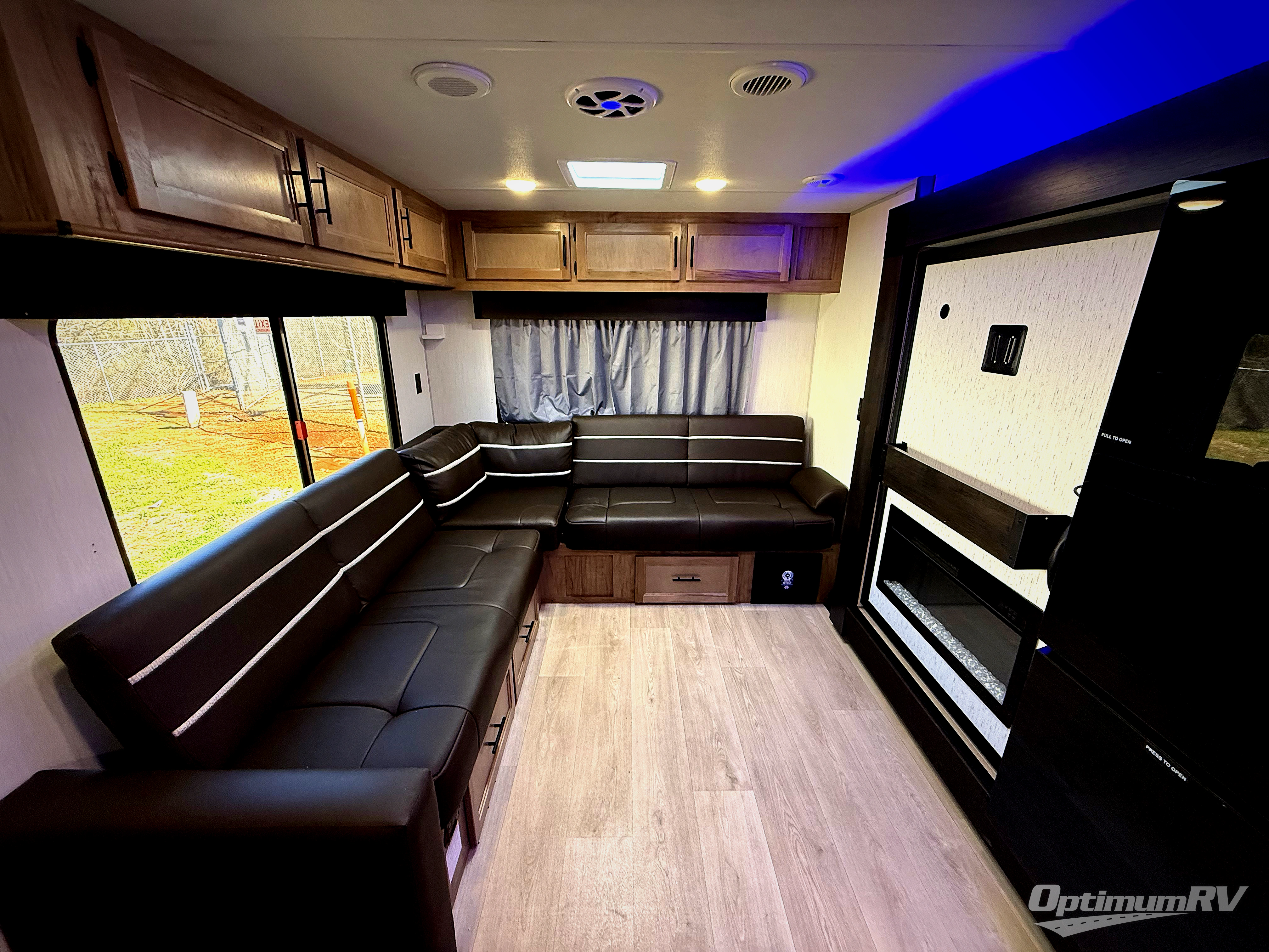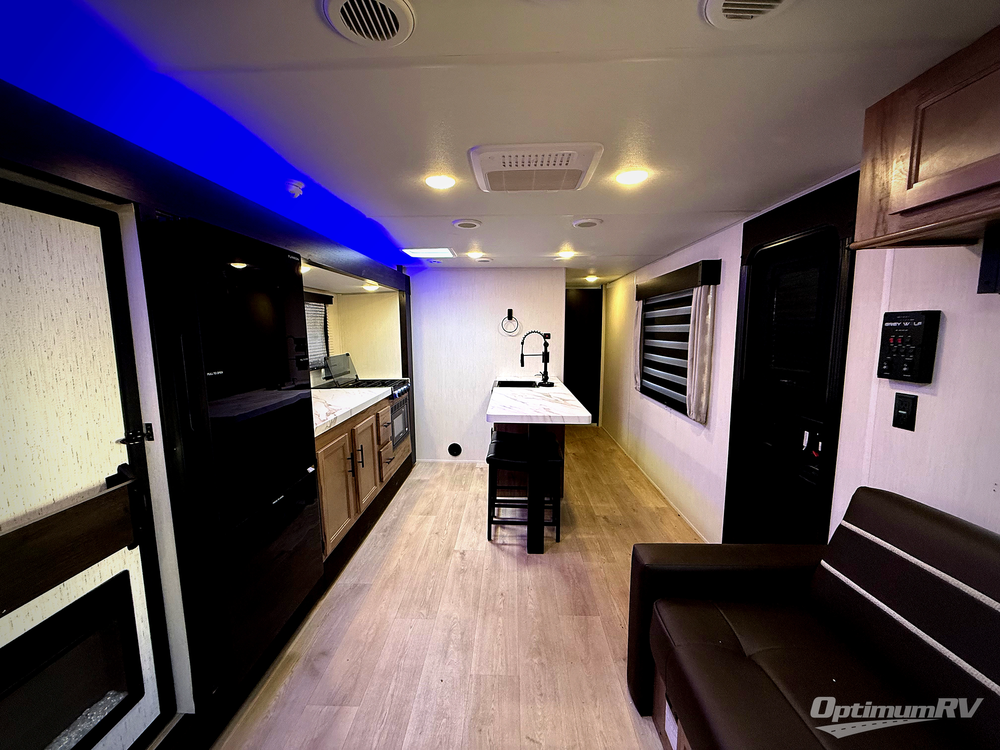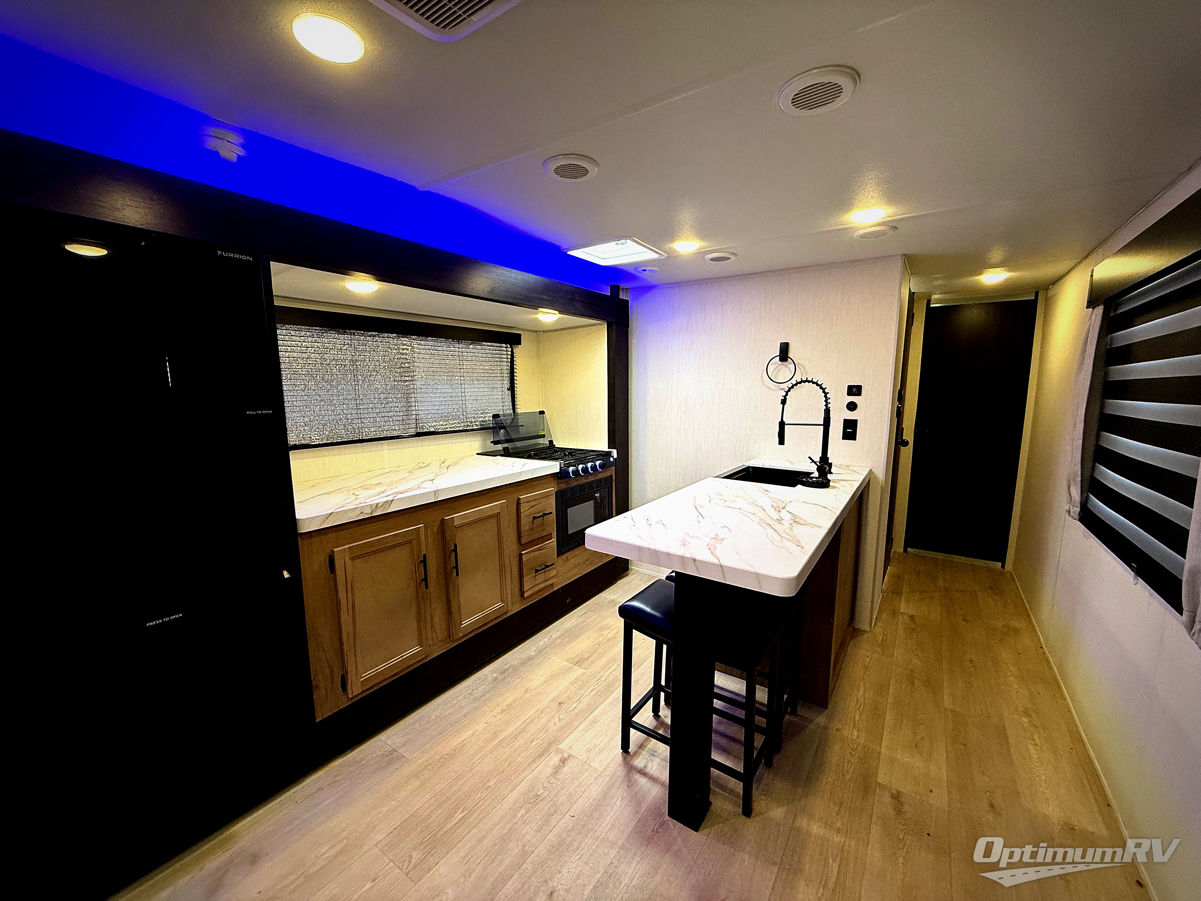 This travel trailer will feel just like home with its RV king bed in the front bedroom plus the full bath with a tub/shower, and there is a spacious living area thanks to the large slide out. Here, you'll find the air fryer and counter space, 12V refrigerator, and the fireplace with a hidden pantry behind it. Your crew can relax on the L-shaped sofa, or visit with the chef while they prep meals at the island peninsula. There are even two bar stools here for added convenience. Head outdoors to enjoy the power awning with LED lights in the evening!
