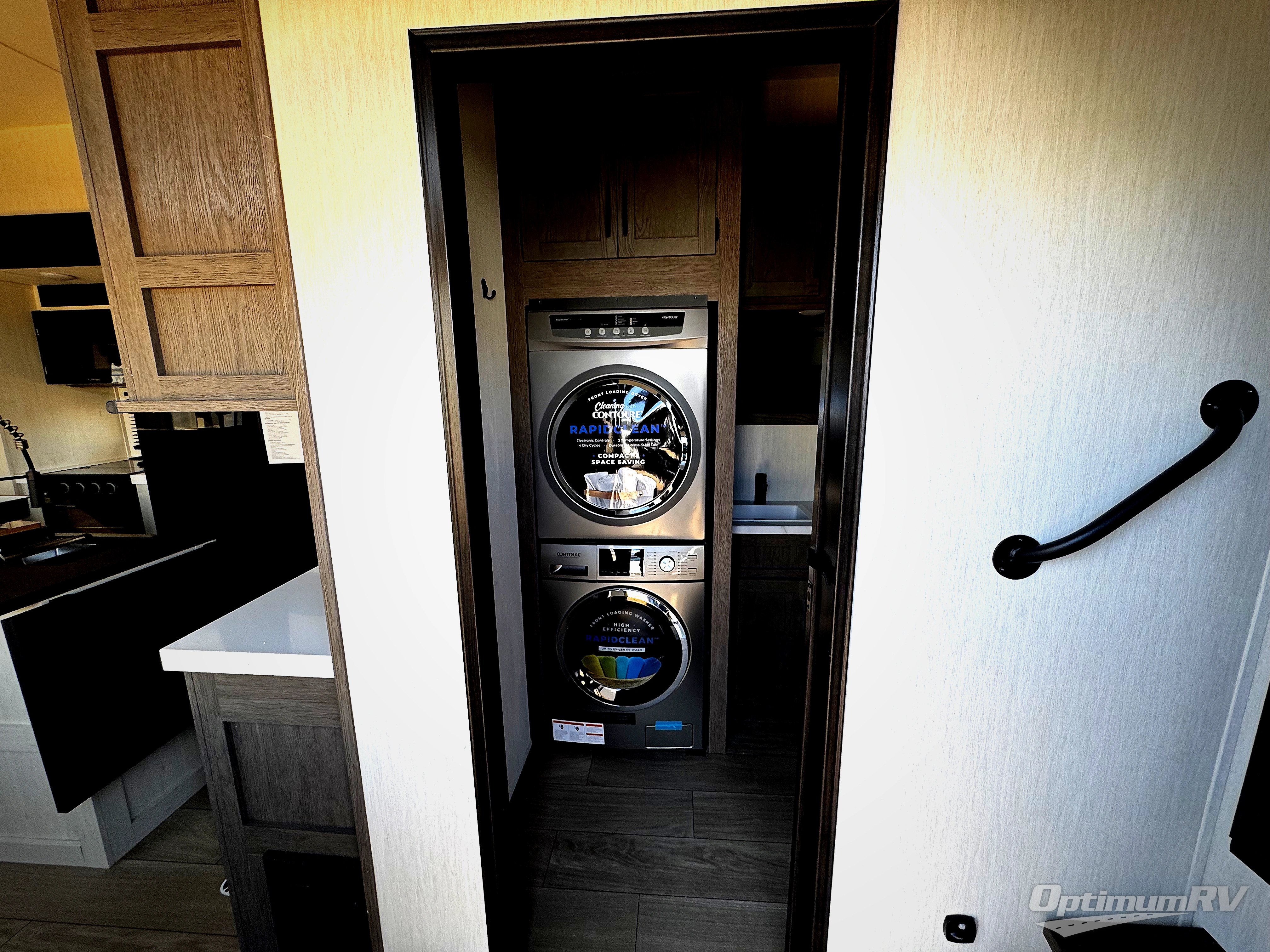 This thoughtfully arranged floorplan is built for extended stays and easy daily living. The rear lounge centers around an L-shaped sectional facing the entertainment wall and fireplace, with a nearby desk for work or hobbies. The kitchen’s island anchors a generous prep area, oversized pantry, and full cooking suite, so meals are simple whether you’re weekending or full-timing. Mid-coach, the guest half bath is convenient for all. Up front, the private bedroom’s king bed slide connects to a spa-style bath with large shower and dressing space, plus a substantial wardrobe to keep clutter out of sight. Outside, enjoy the campsite under dual power awnings that stretch along the patio side.