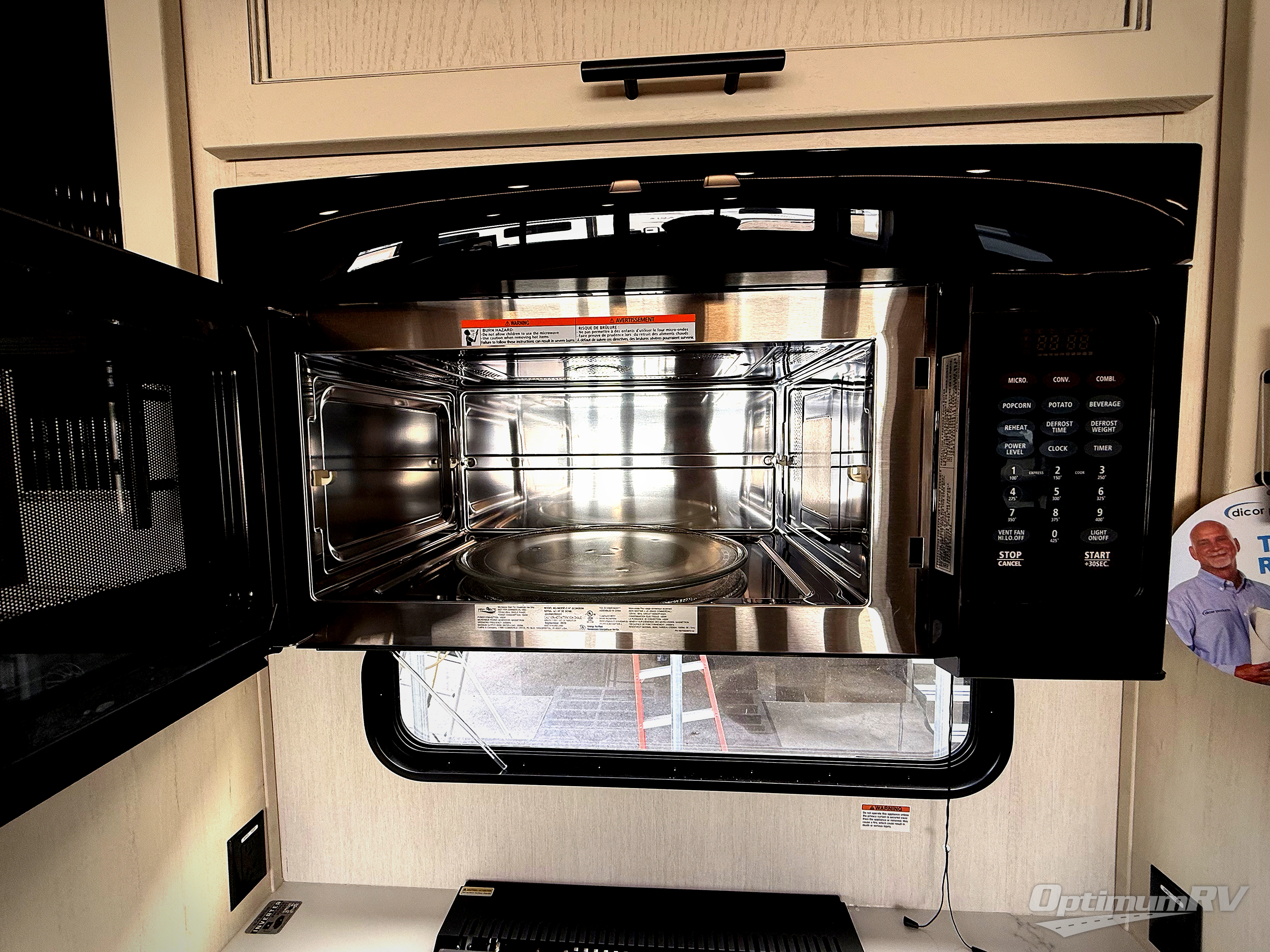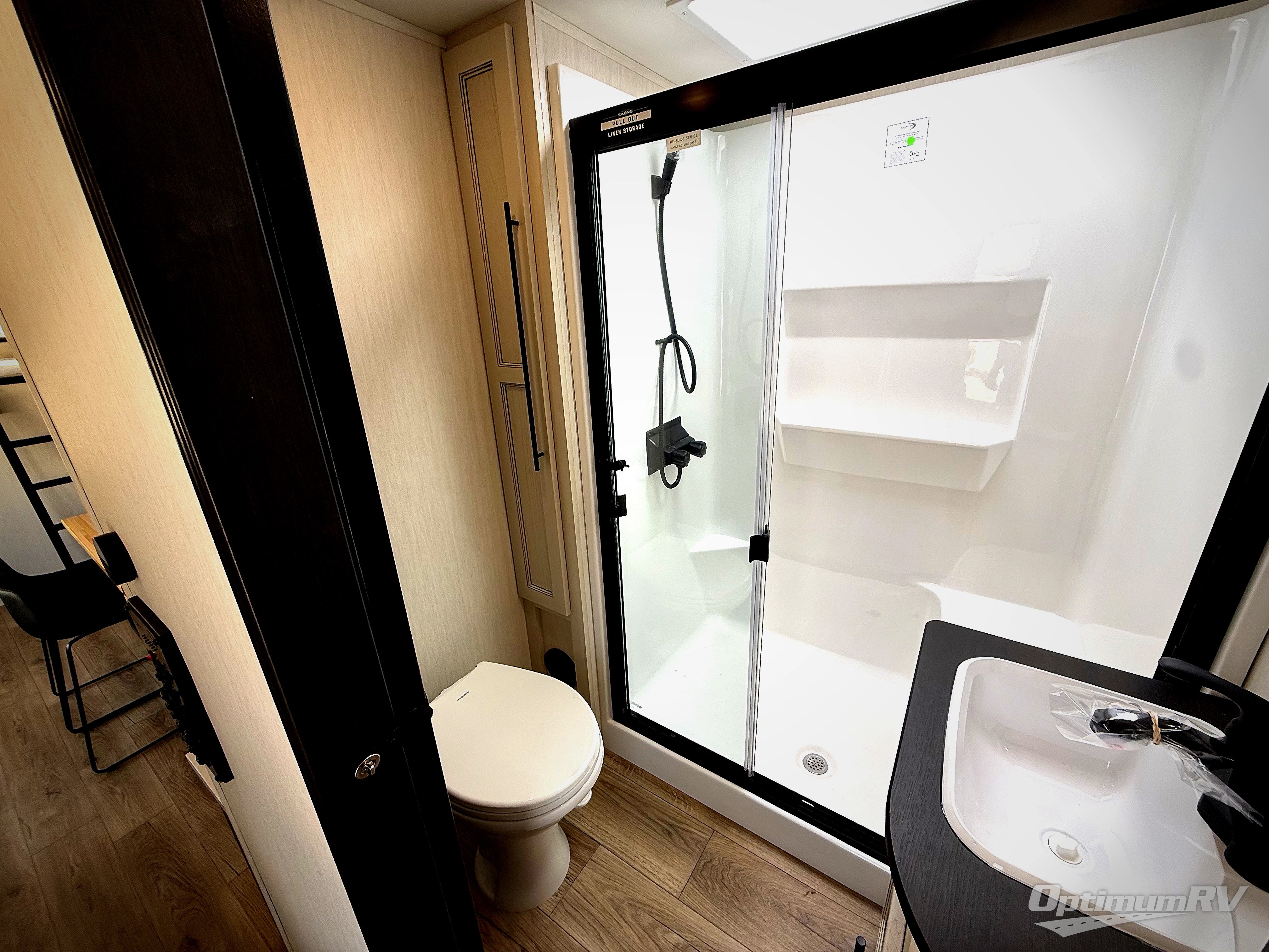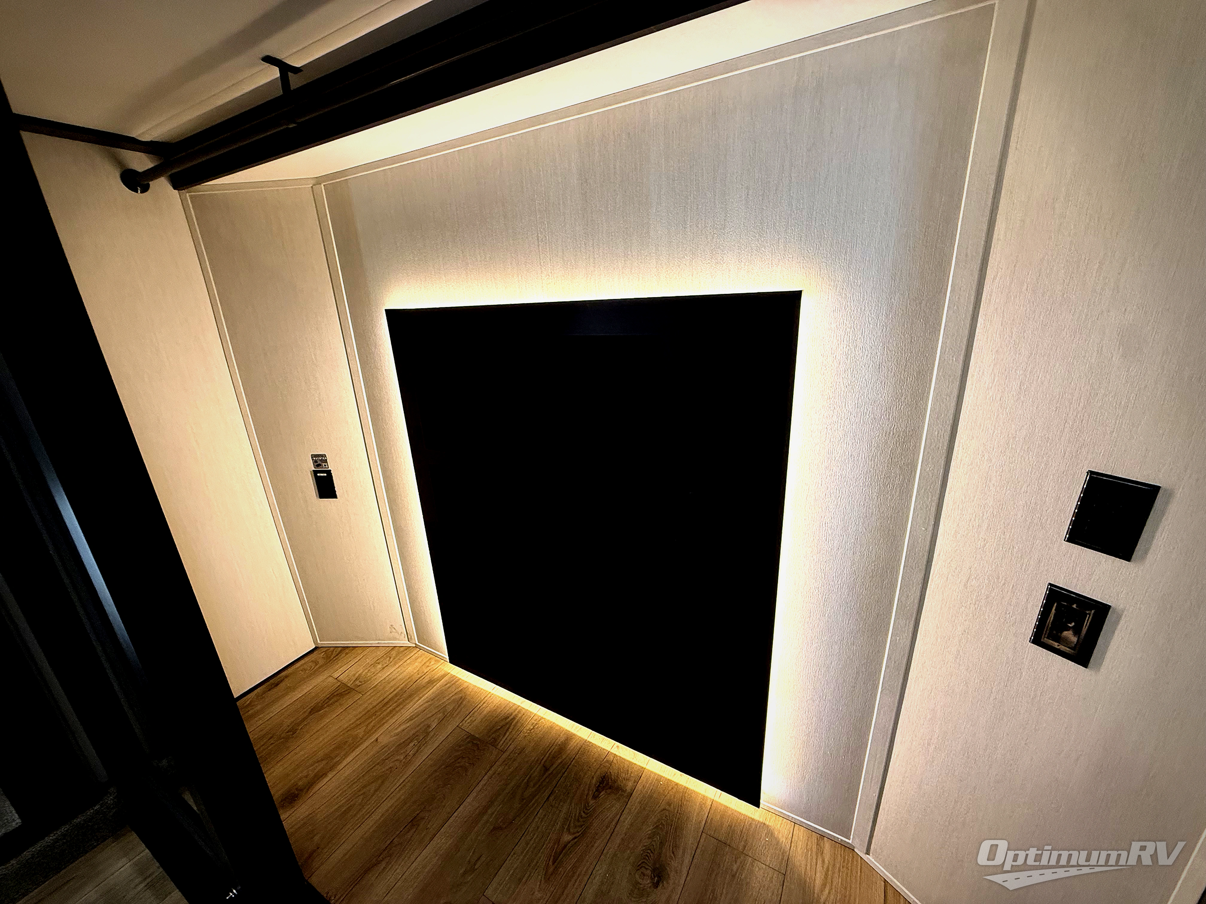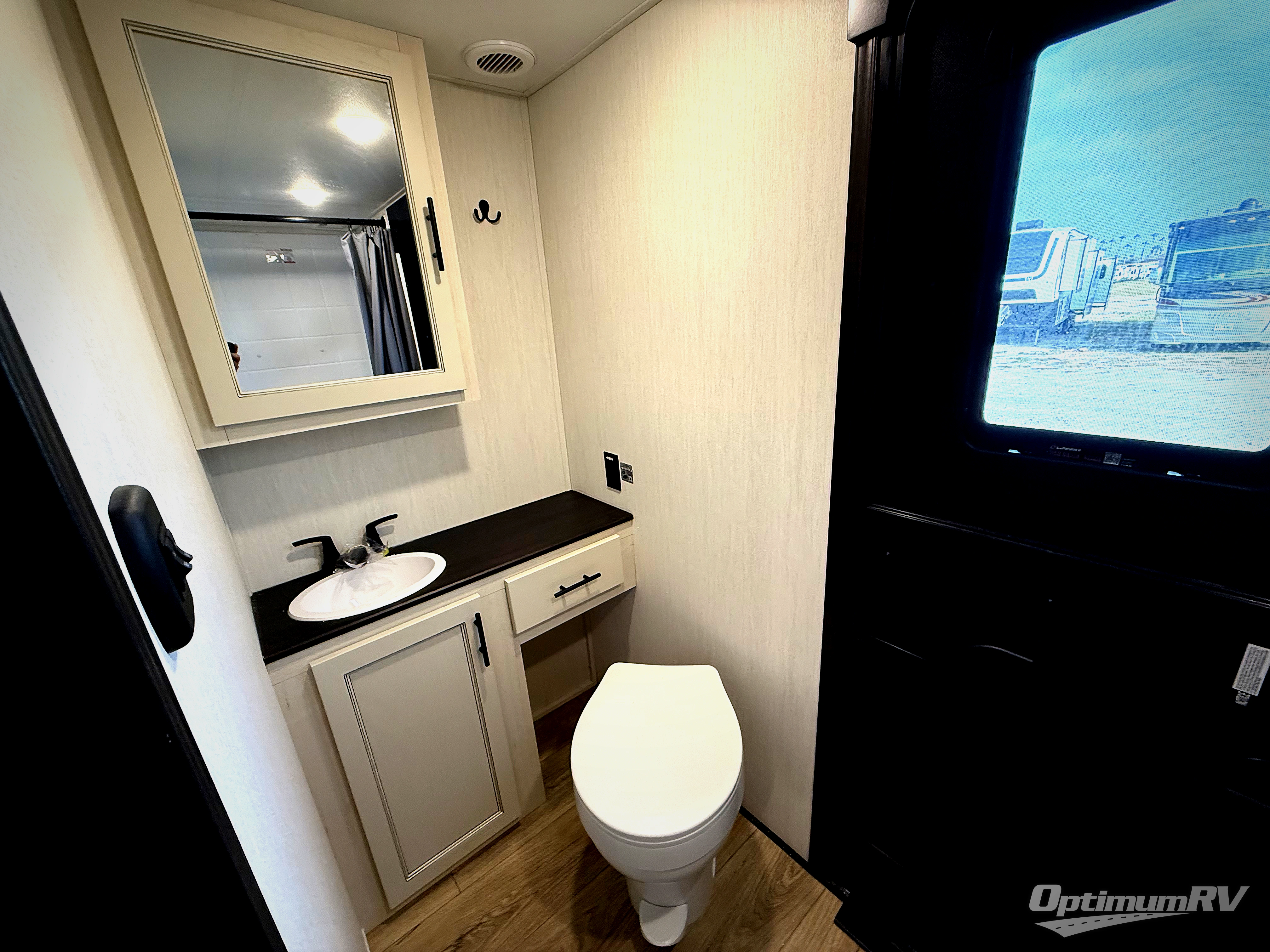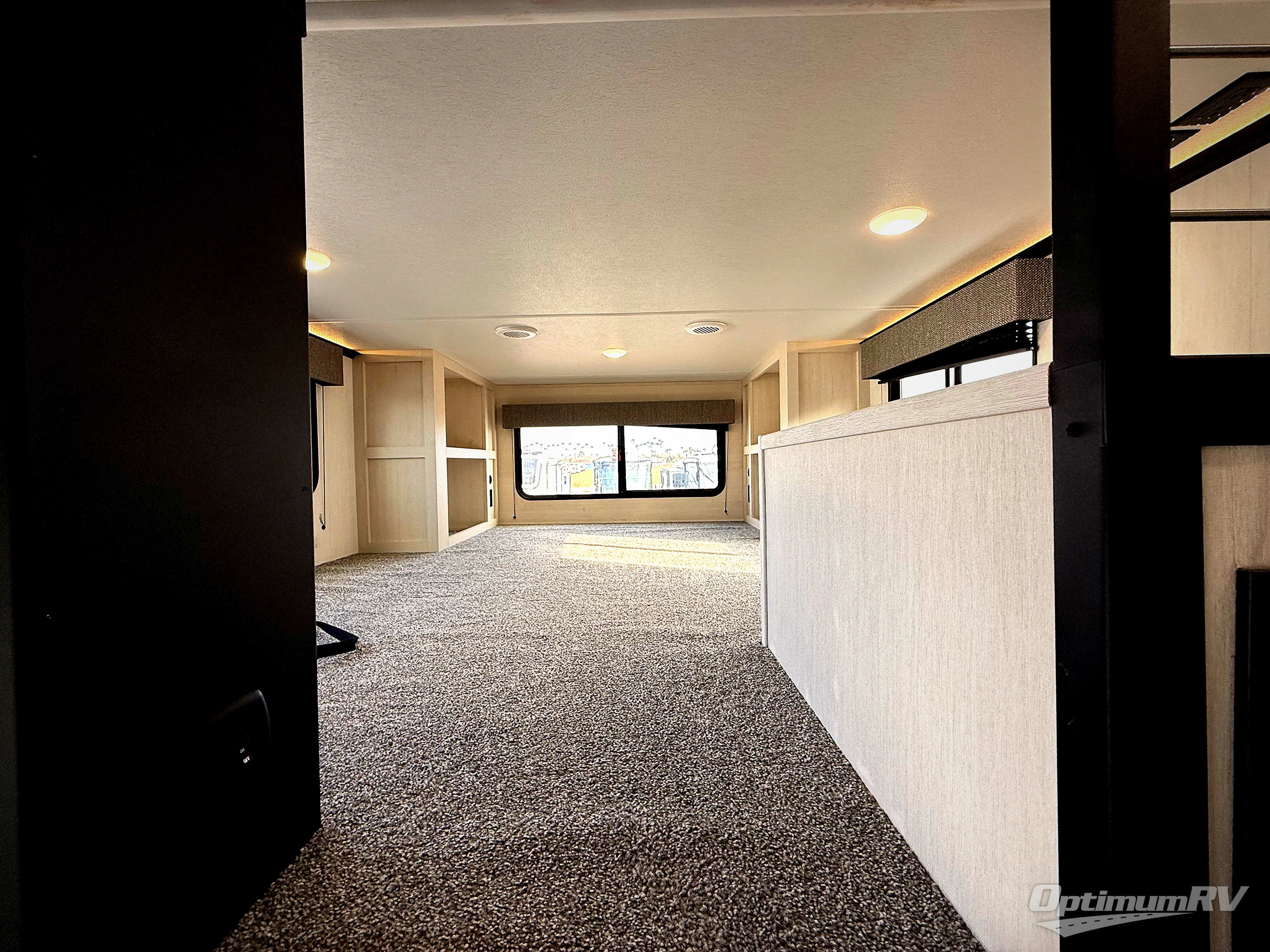 Are you looking for a fifth wheel where you can bring along your neighbor friends? You can do just that since there are two bedrooms in this unit, one of which includes a master bath with its own exterior entry door! The front bedroom is right next to the second full bath for convenience, and includes a camper king bed slide, a dresser, and front wardrobe. The rear master bedroom has a queen bed slide out across from a second slide for more floor space, and there is a loft above this room for more sleeping or storage space. Everyone can meet in the middle kitchen and living room since there are recliners, a ceiling fan, and kitchen island with four chairs. There is also storage below the island for kitchen necessities, and the hidden pantry behind the TV will be perfect for snacks, board games and more!