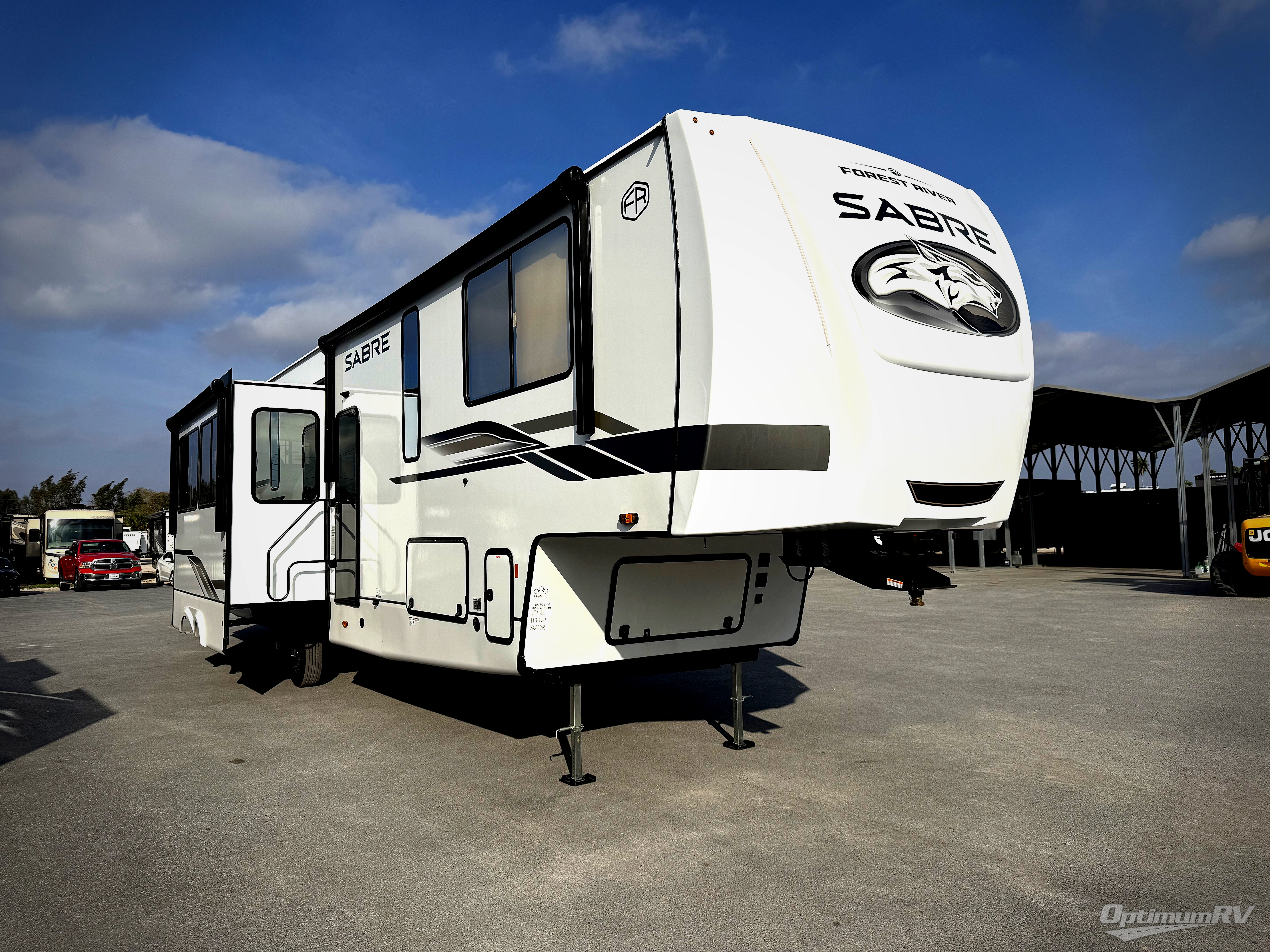 You will experience luxurious camping trips at an affordable price with any one of these Forest River Cherokee Sabre fifth wheels! These models are durable and ready to travel anytime of the year thanks to features like the high-gloss gel-coat front cap with LED lighting, the PVC roof membrane, and the forced air underbelly with enclosed gate valves. The electric auto-leveling system makes setting up easy and safe, and the adjustable power awning with LED lighting will create an inviting outdoor living space. Each model includes a universal docking station which includes a black tank flush and an outside shower, and adjustable stable steps for you to enter and exit the unit safely. Inside, you will love the design of the ambient accent lighting in the living area, the real wood lumbercore cabinetry, and the linoleum flooring!