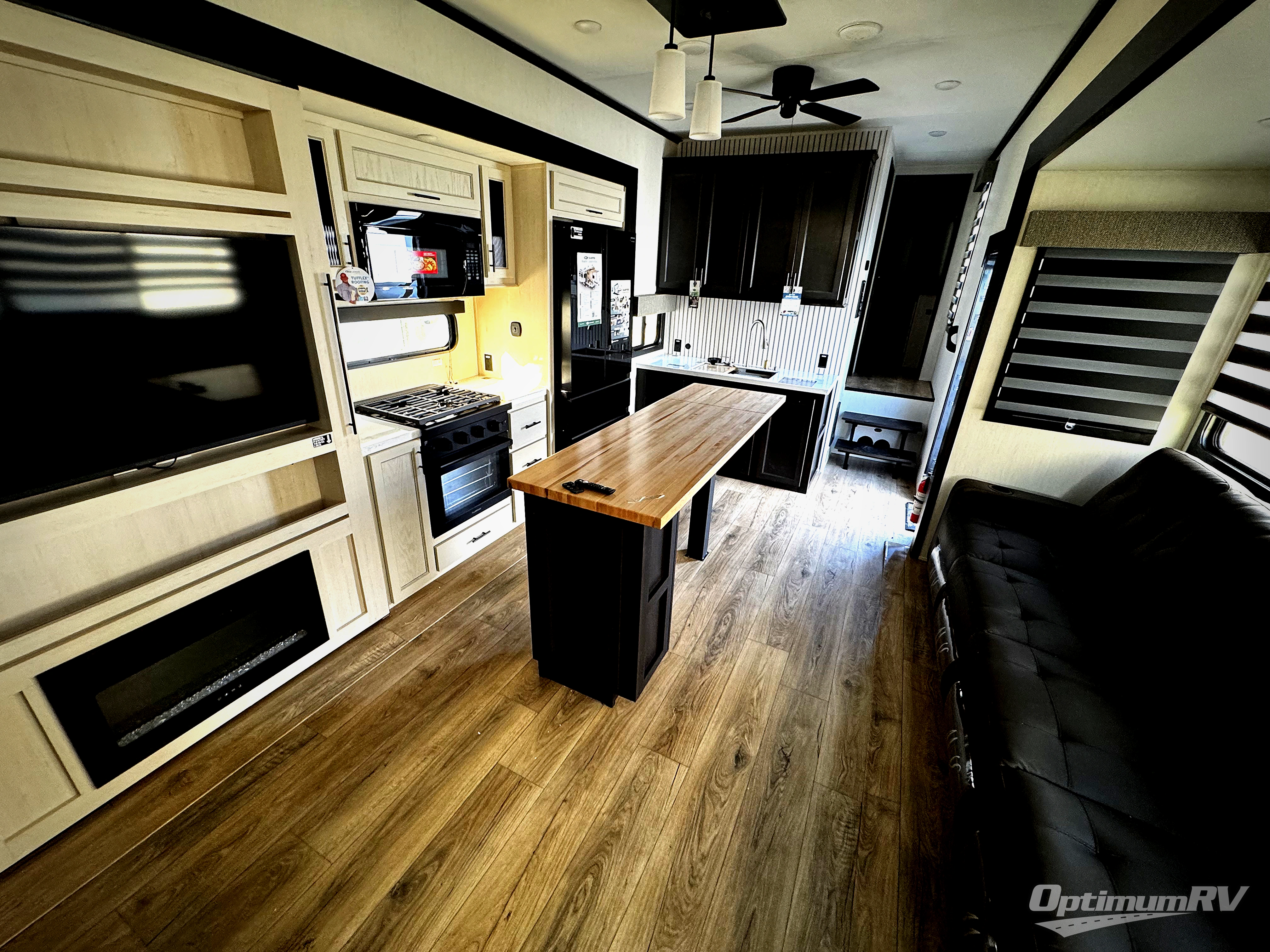 Are you looking for a fifth wheel where you can bring along your neighbor friends? You can do just that since there are two bedrooms in this unit, one of which includes a master bath with its own exterior entry door! The front bedroom is right next to the second full bath for convenience, and includes a camper king bed slide, a dresser, and front wardrobe. The rear master bedroom has a queen bed slide out across from a second slide for more floor space, and there is a loft above this room for more sleeping or storage space. Everyone can meet in the middle kitchen and living room since there are recliners, a ceiling fan, and kitchen island with four chairs. There is also storage below the island for kitchen necessities, and the hidden pantry behind the TV will be perfect for snacks, board games and more!