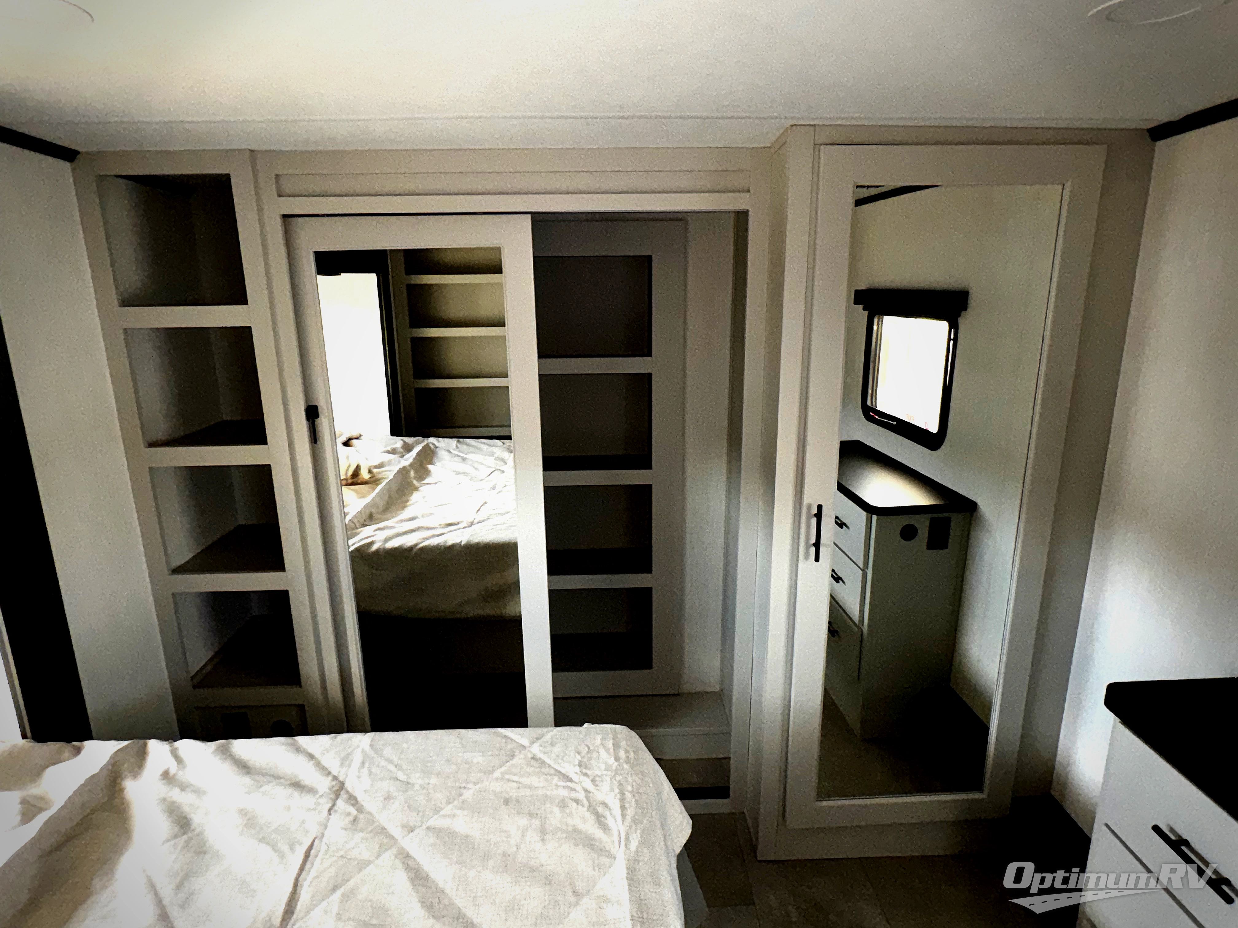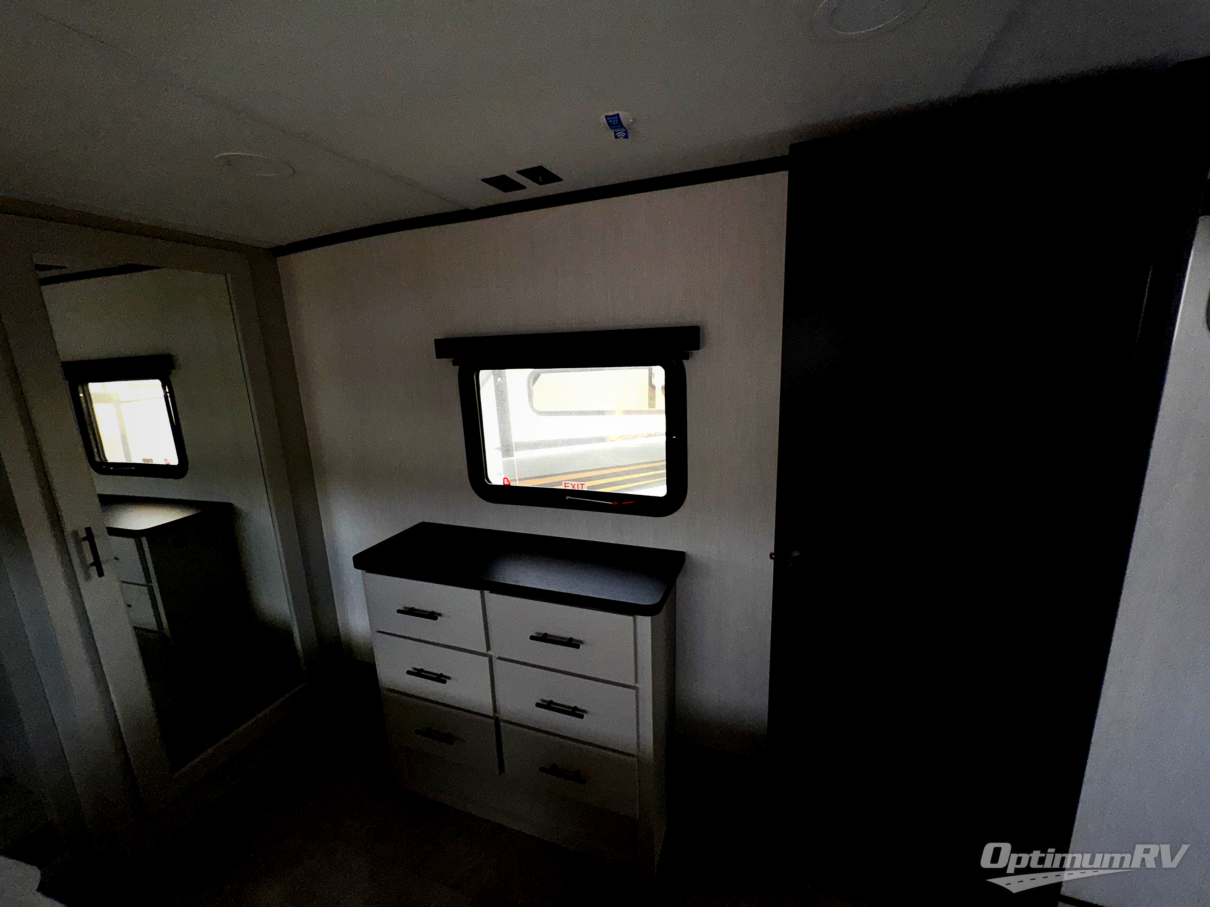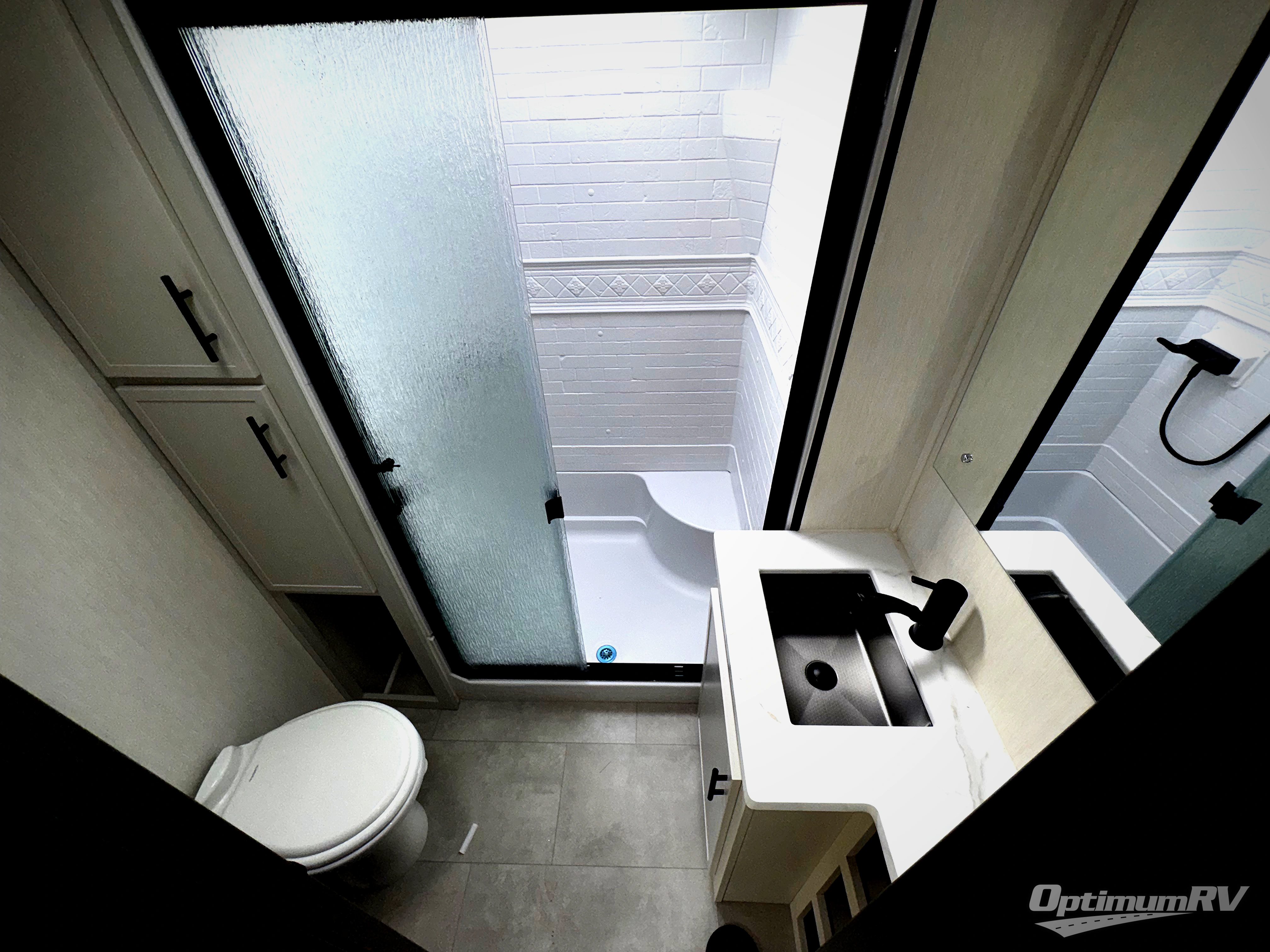 If you enjoy camping with family or friends, this fifth wheel is sure to meet all of your needs! The front bedroom includes a King bed slide out for more space and comfort, plus a front wardrobe/washer and dryer prep. And the full bath is right next door for easy nighttime use. The living room is made spacious thanks to the dual opposing slides, and you'll find a sectional sleeper sofa here, as well as a hybrid desk/dinette, perfect for a quick meal and to catch up with some emails. And don't overlook the rear kitchen with ample counter space, a four burner range, an accessory sink and a French door 12V refrigerator!
