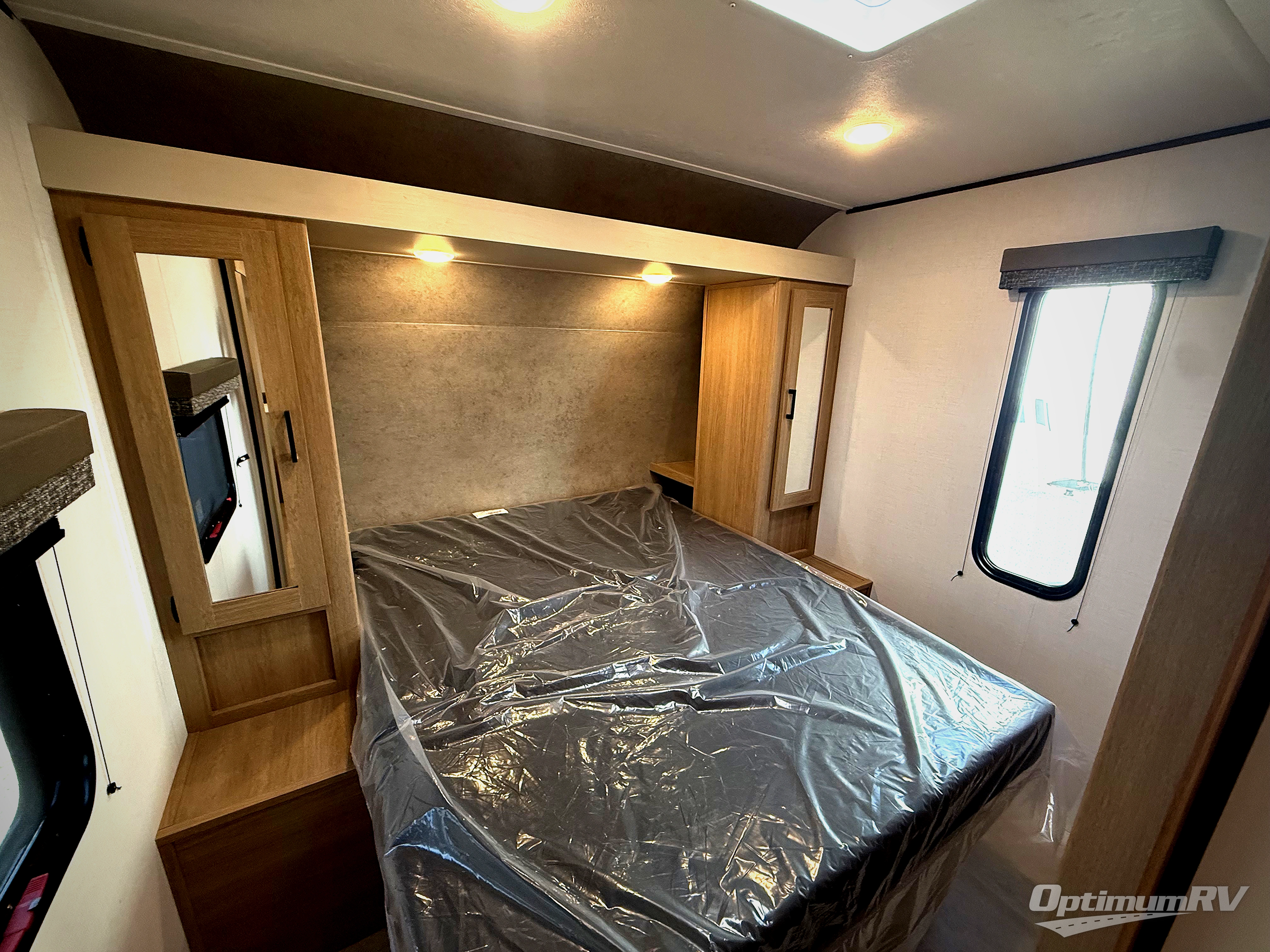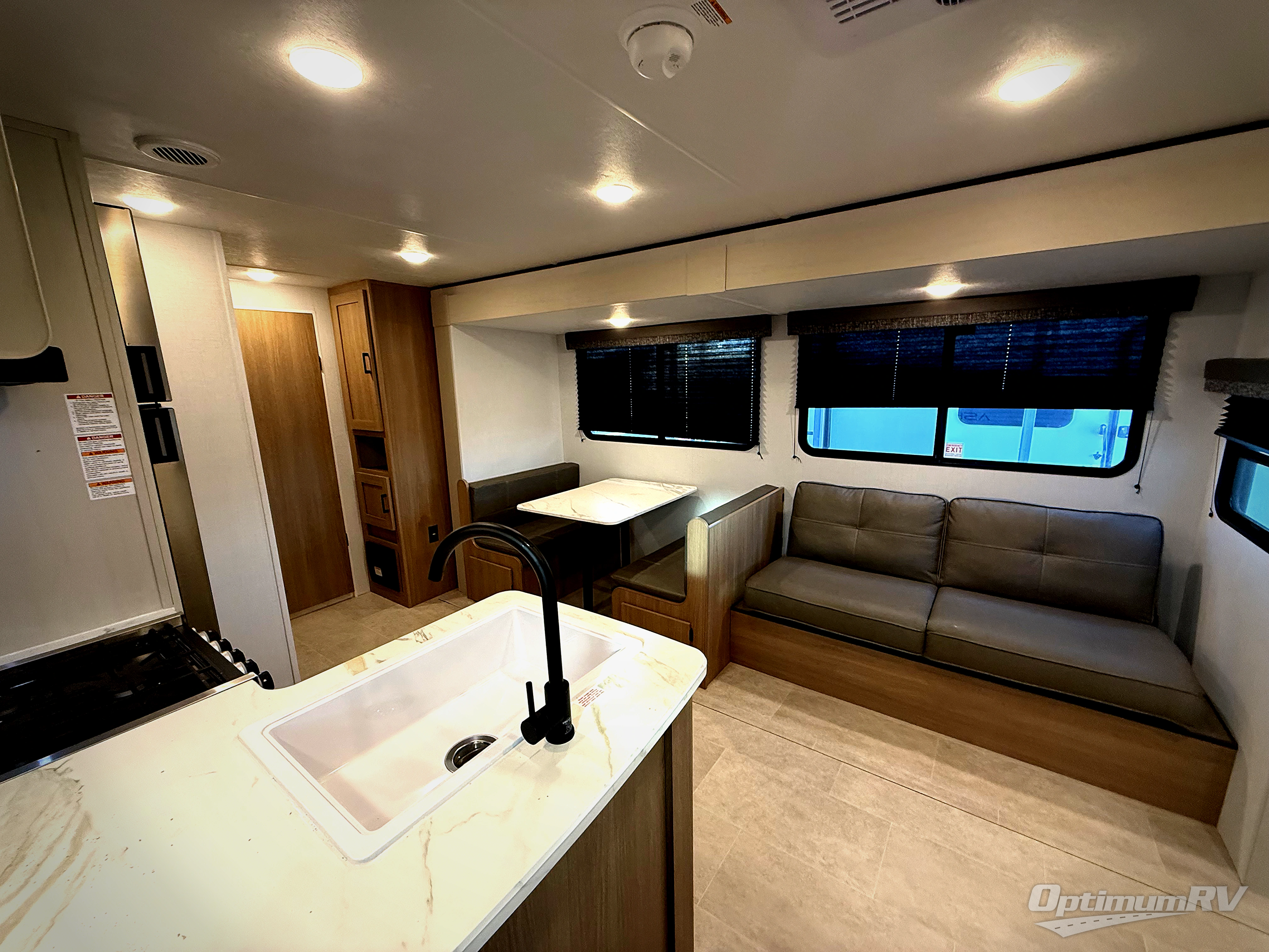 This travel trailer is one your whole crew will love! There is a rear private bunkhouse with double-size bunks for the little ones, a front private bedroom for you, and a booth dinette and jackknife sofa for even more sleeping space! The chef has their choice to cook indoors on the three burner range and microwave oven, or head outdoors to cook on the outdoor kitchen! The full bath will let everyone clean up each day, and the fireplace and large slide out will make your space feel more like home. And don't overlook the pass-through storage and 16' power awning with LED lights!
