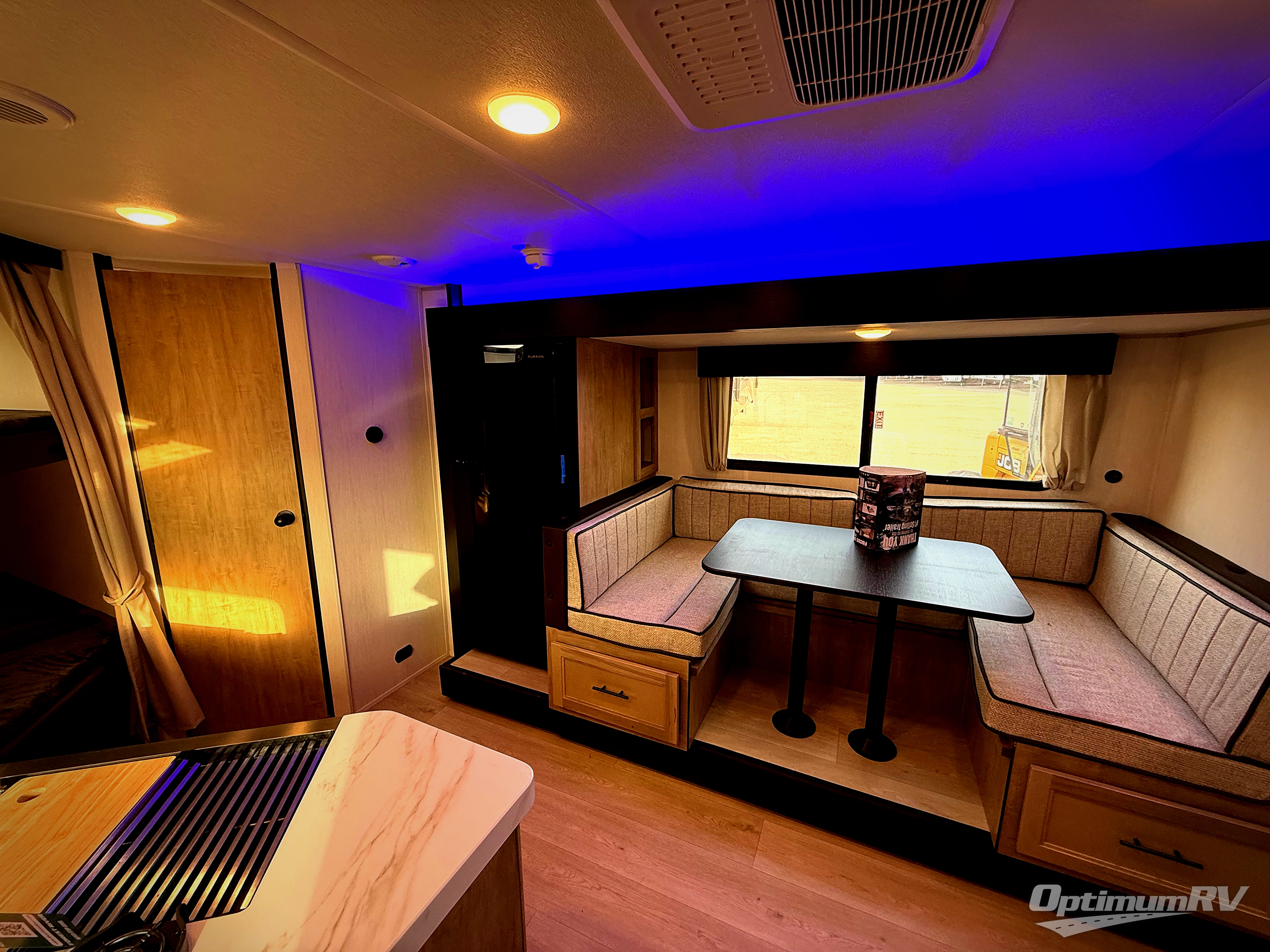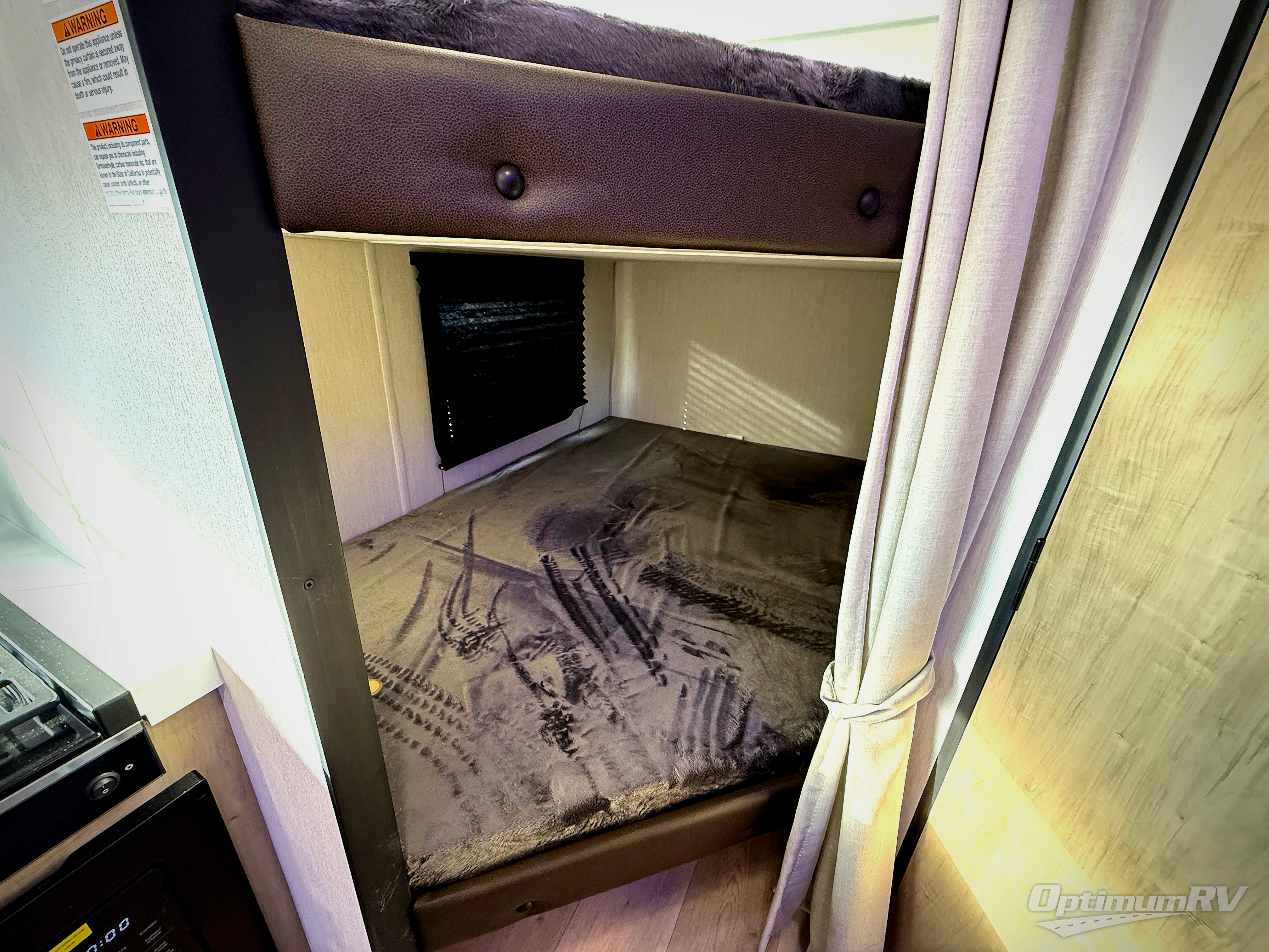 Enjoy time at the campground in this spacious travel trailer with a front private bedroom and double-size bunks for guests! The full interior kitchen and outside kitchen will let you make meals each day, and everyone can dine around the U-shaped dinette or under the 15' awning outside! This unit also includes ample storage space, including hidden shelves behind the fireplace and outside storage!