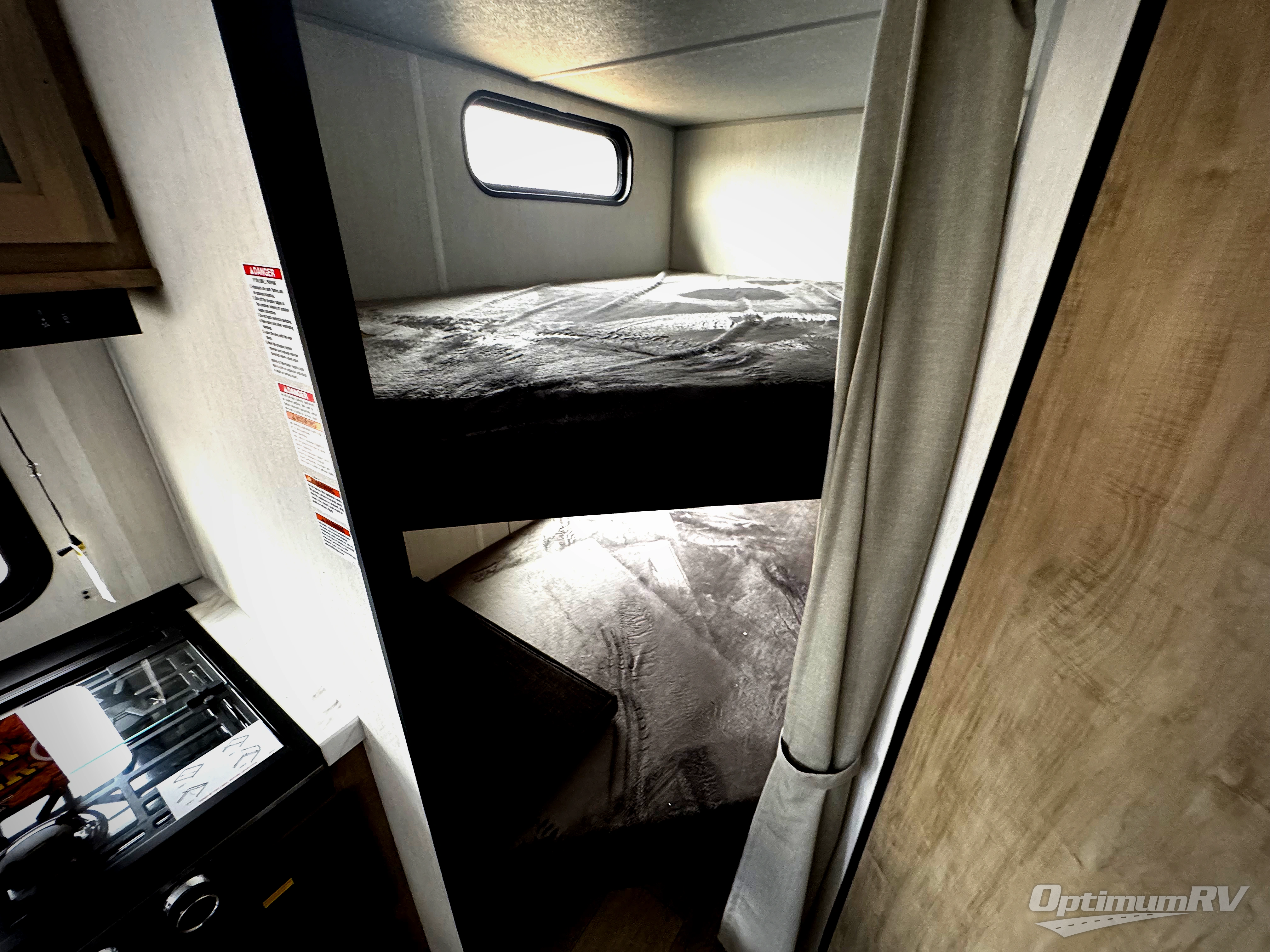 Enjoy time at the campground in this spacious travel trailer with a front private bedroom and double-size bunks for guests! The full interior kitchen and outside kitchen will let you make meals each day, and everyone can dine around the U-shaped dinette or under the 15' awning outside! This unit also includes ample storage space, including hidden shelves behind the fireplace and outside storage!