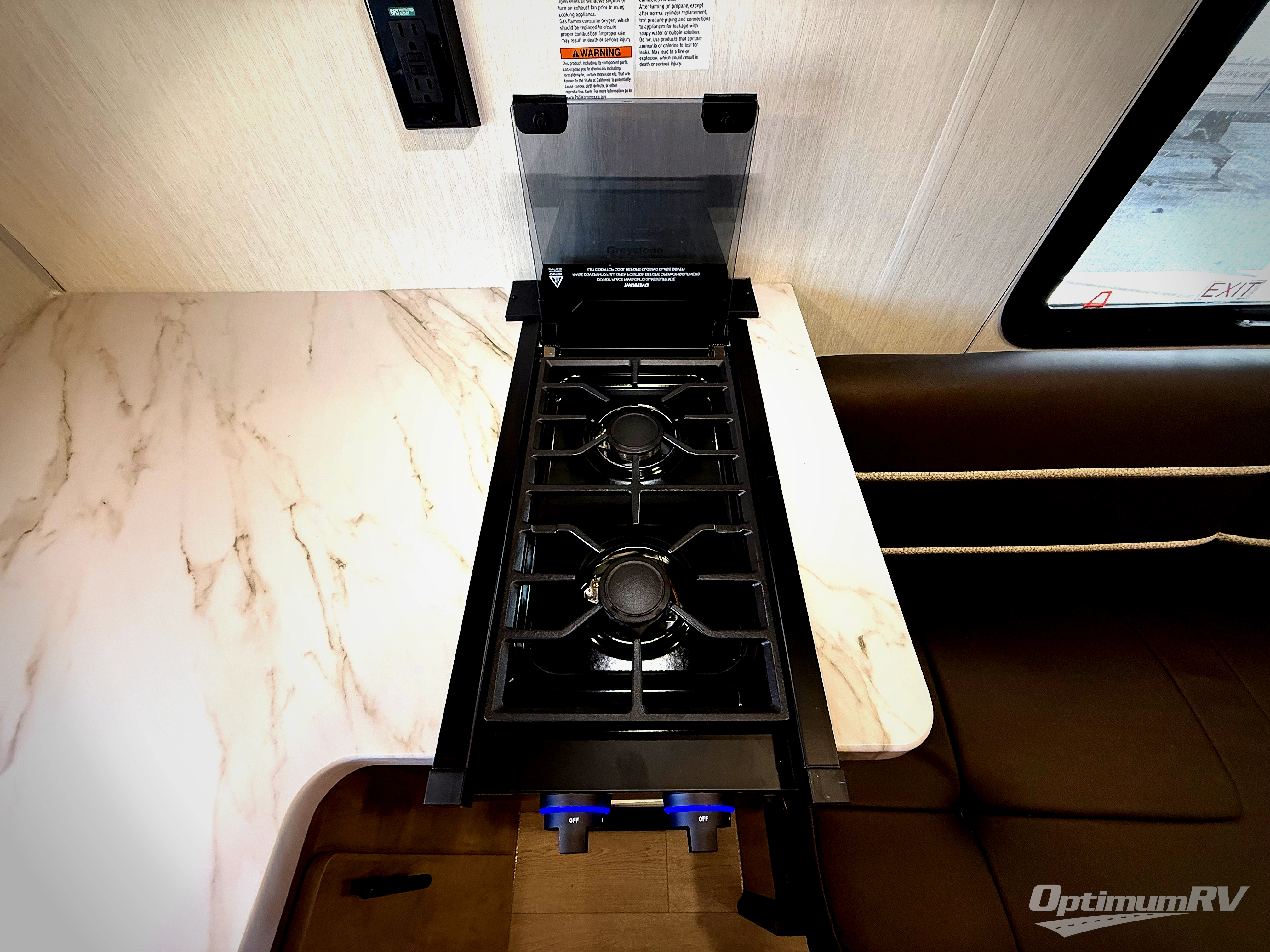 You will be enchanted by this travel trailer! The bathroom is equipped with everything you need for a comfortable stay. The kitchen is equipped with a refrigerator for keeping drinks and perishables fresh, a microwave for quick reheating, and a cooktop for preparing meals. The sofa provides a comfortable seating area for relaxation and an extra sleeping area. Overhead cabinets and a shelf provide additional storage for essentials, cookware, and dishes. The queen-sized bed allows a comfortable sleeping space, perfect for unwinding after a long day.