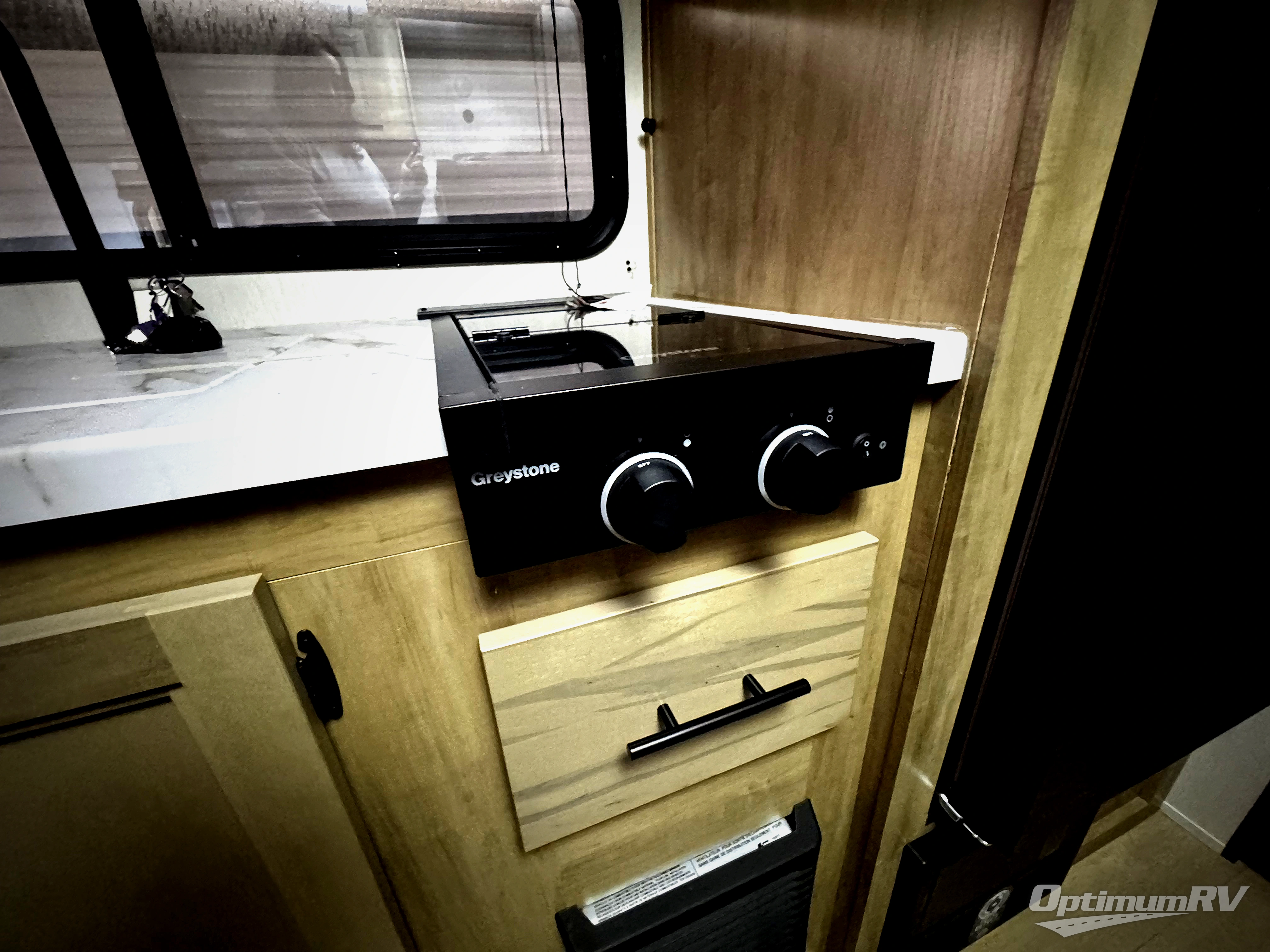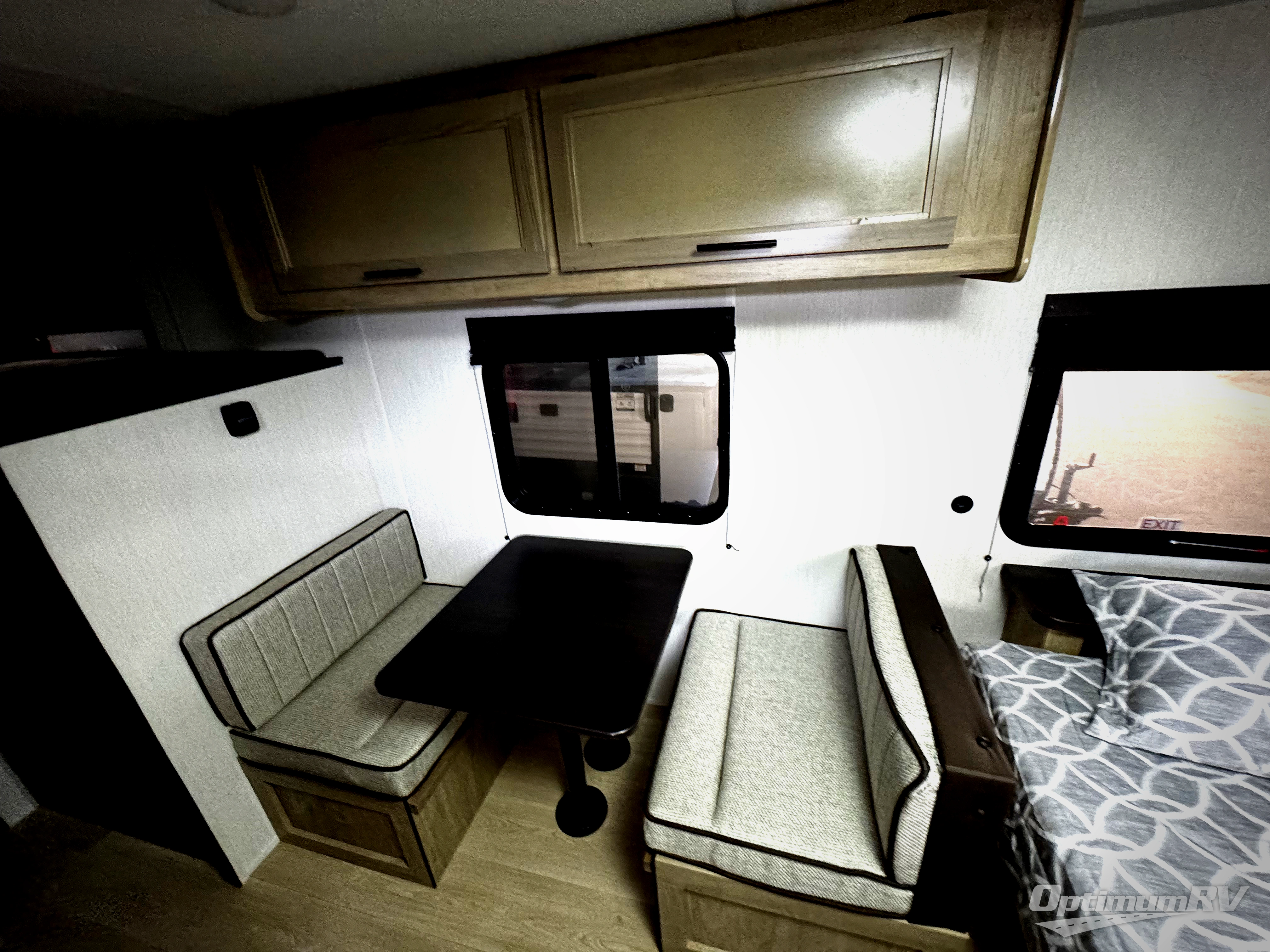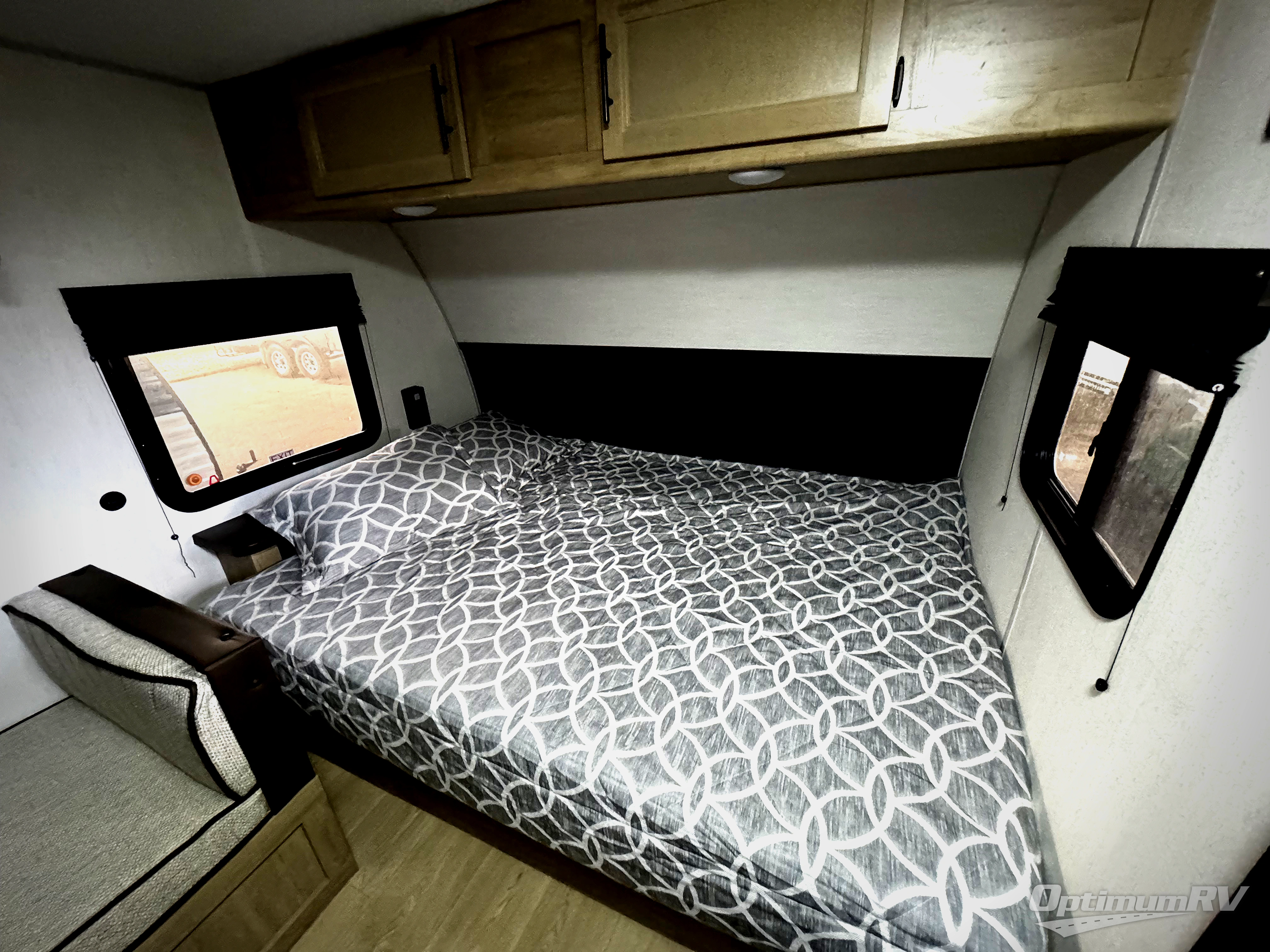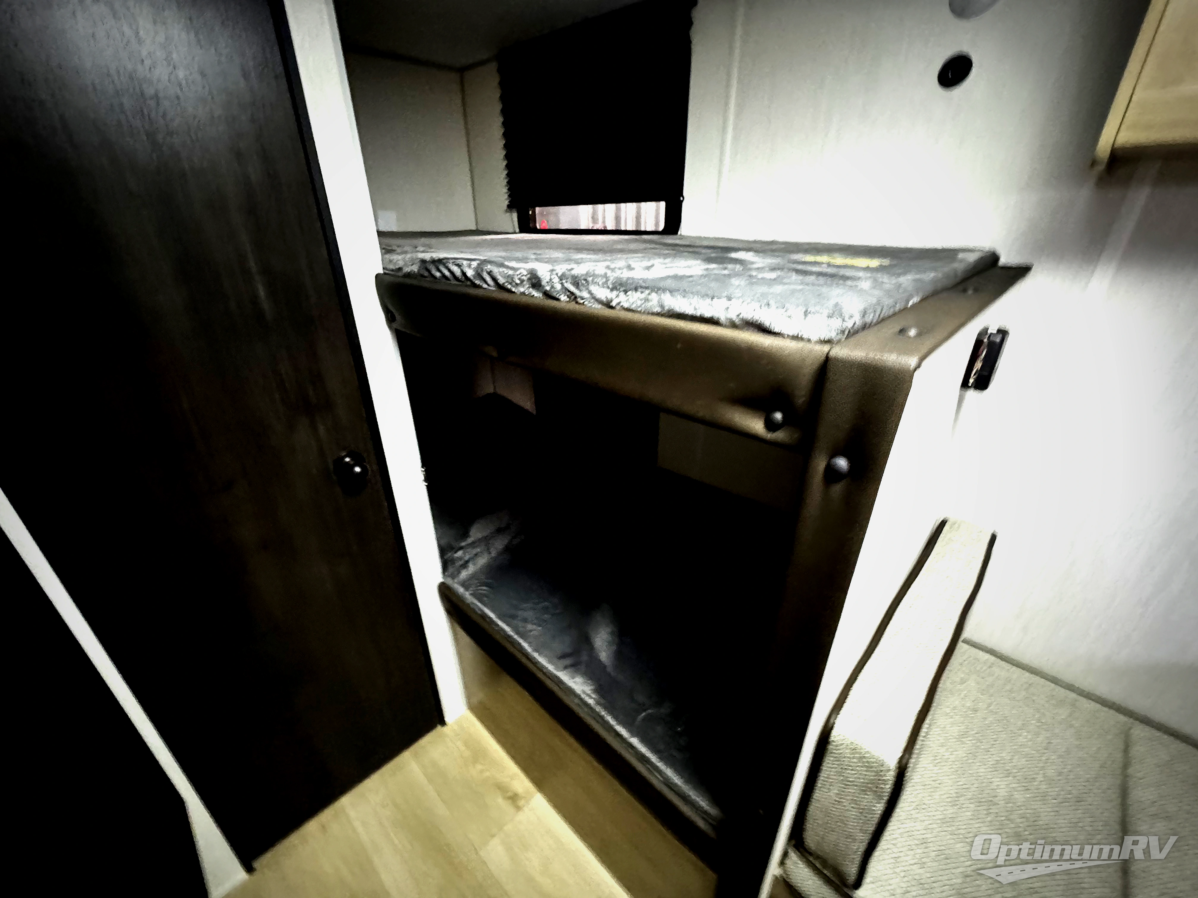 The whole family can sleep comfortably in this travel trailer! It has a set of bunk beds for the kids to sleep on, and you can sleep comfortably on the front queen bed with overhead cabinets and a shelf. There is even an exterior storage plus door that accesses the storage space under the bottom bunk. The chef will enjoy preparing their best home cooked meals either indoors with the high output cooktop or at the outside mini kitchen while staying protected by the 12' power awning!