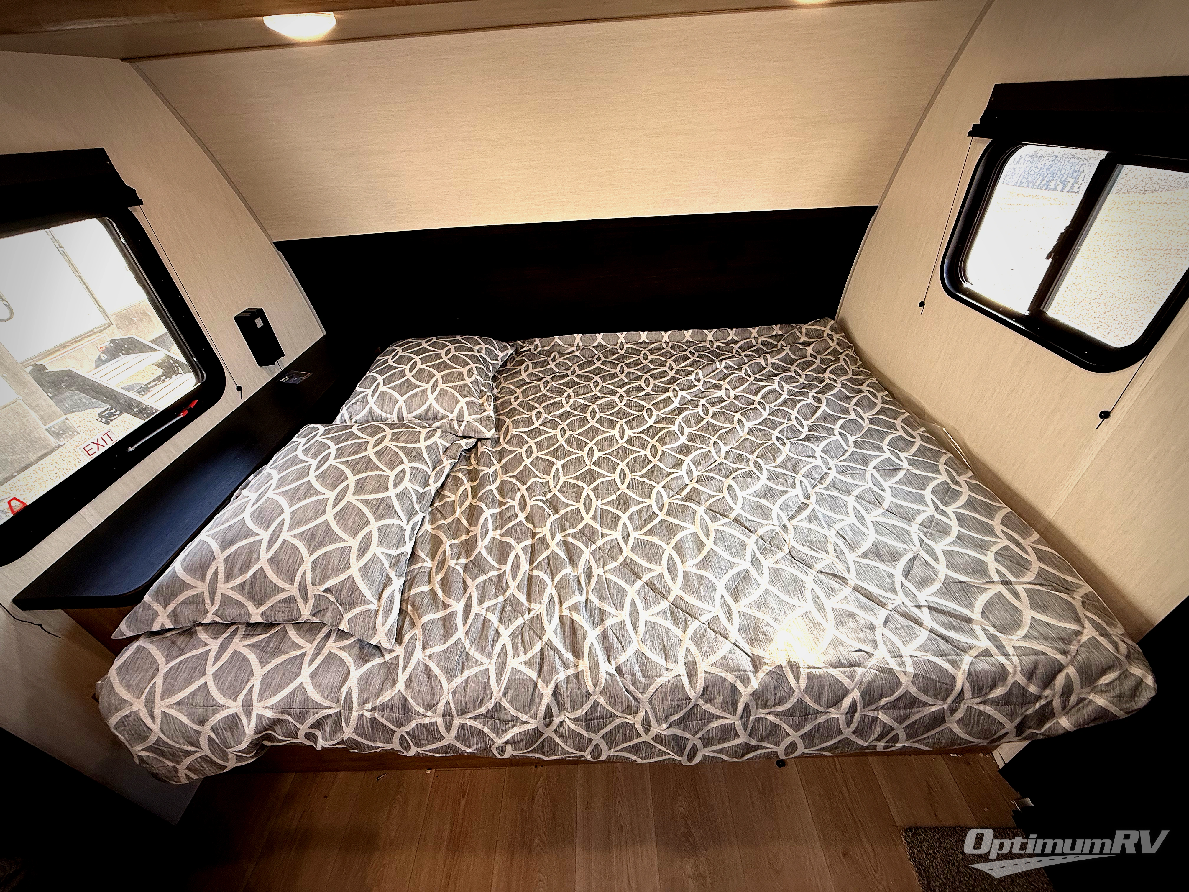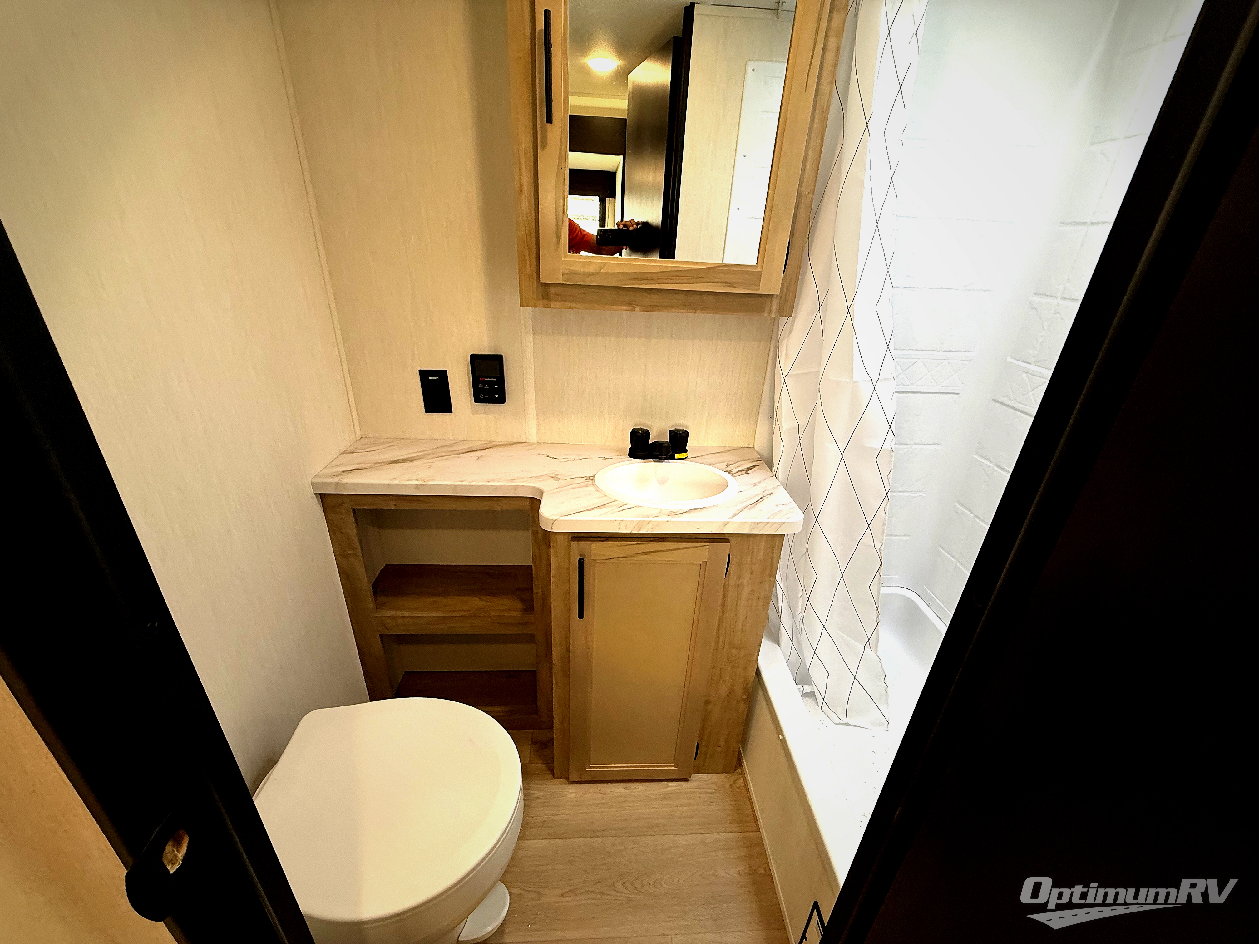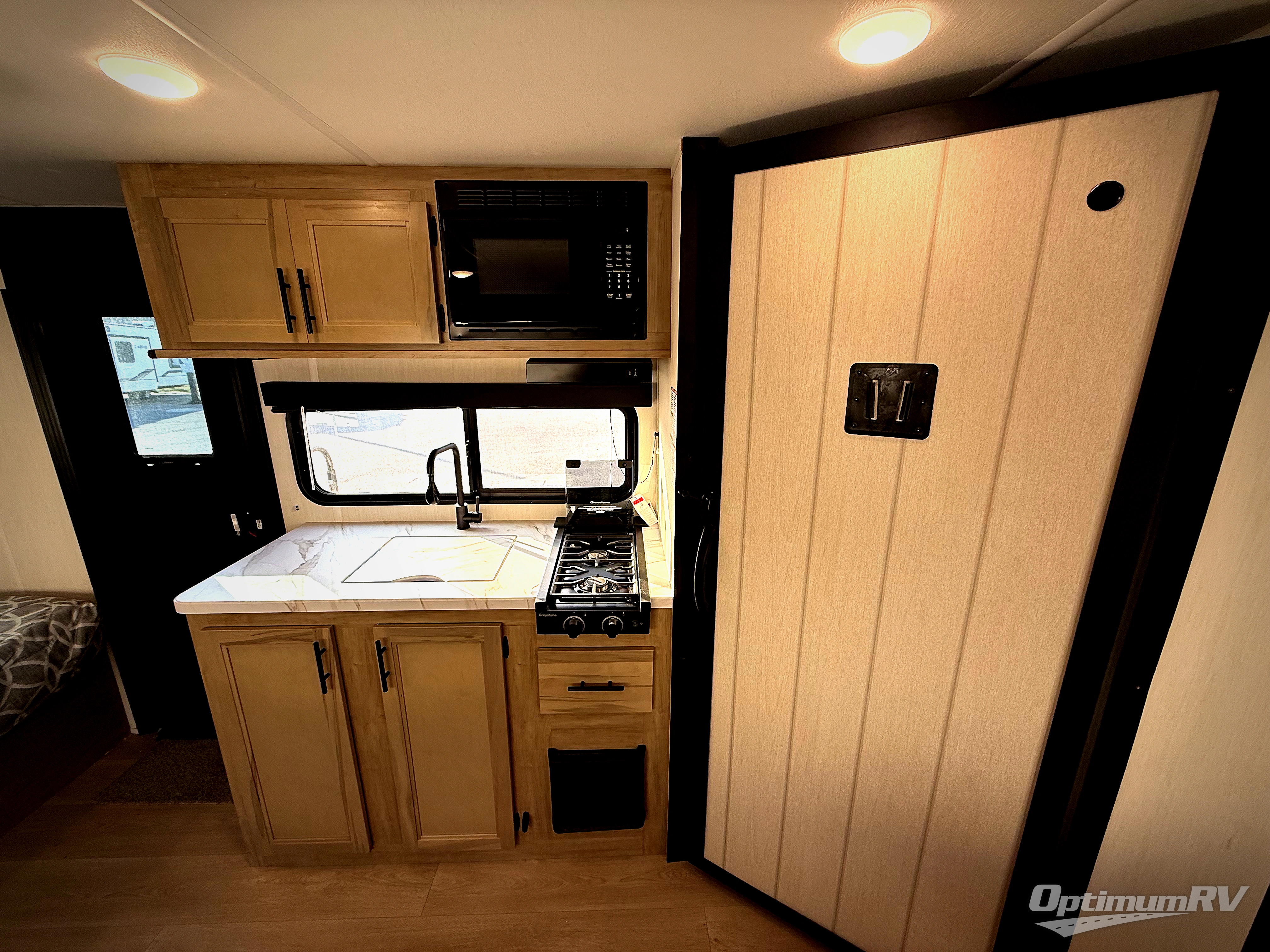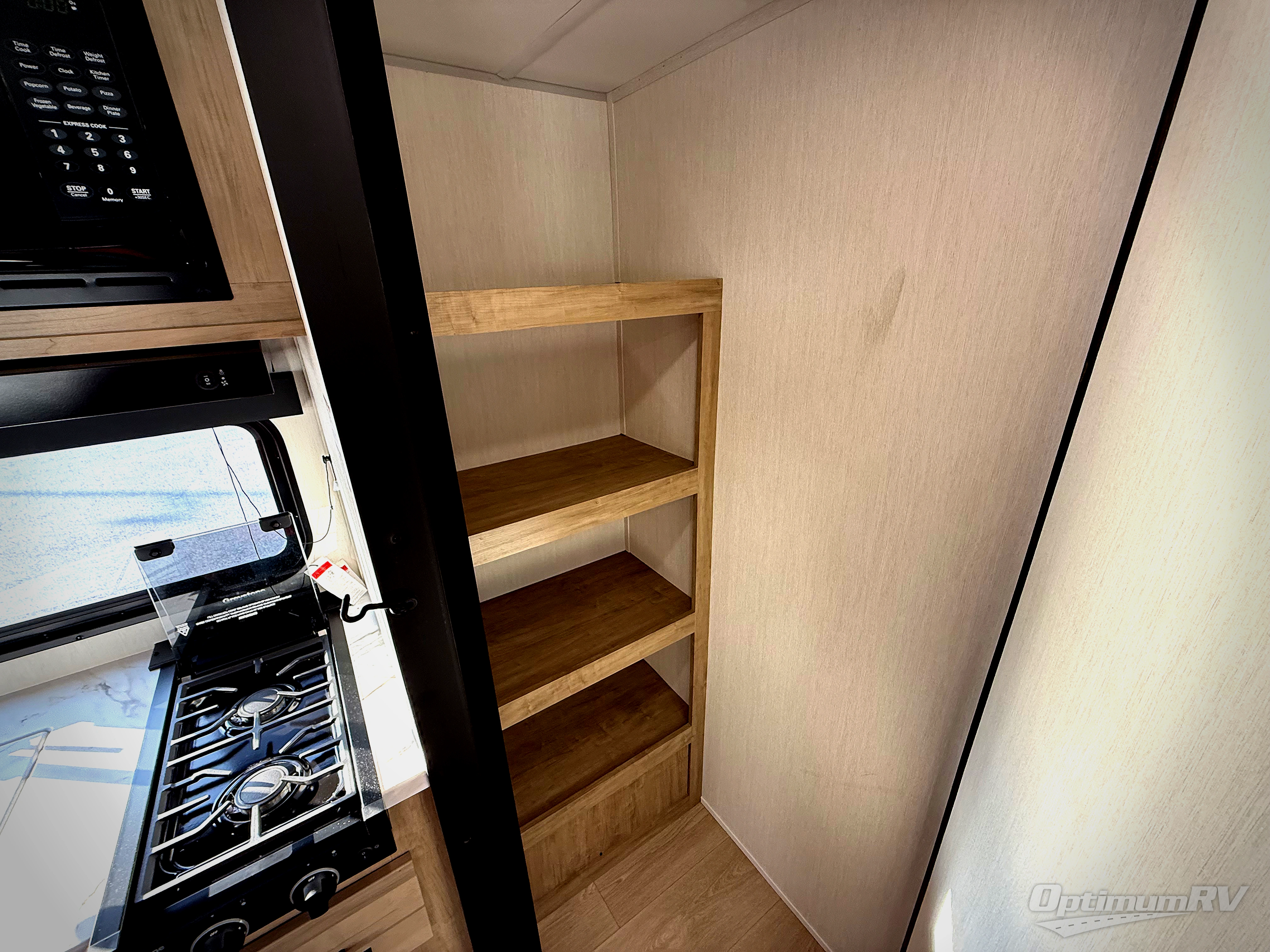Camping trips in this spacious travel trailer are sure to bring memories! Once you arrive at the campground, you can unload the outside storage, put out the 12' awning, and enjoy the outdoor mini kitchen. Once inside, you can dine at the booth dinette, relax on the sofa, and freshen up in the full bath with a tub/shower. The front queen bed will provide a great night's rest, while your guests sleep on the living area furniture. This travel trailer also includes ample interior storage, including a spacious kitchen pantry, an overhead cabinet above the bed, plus additional storage beside the refrigerator!
