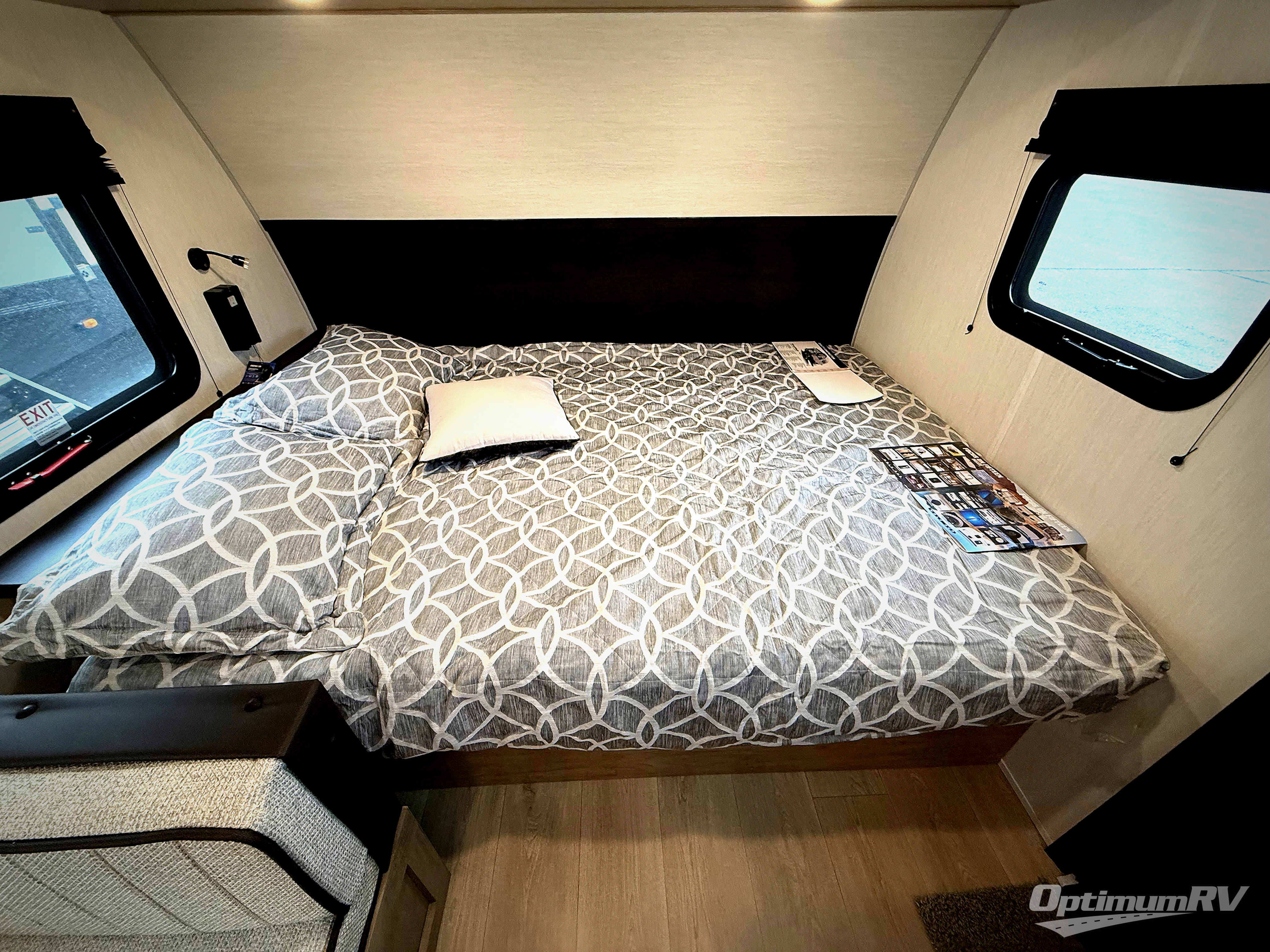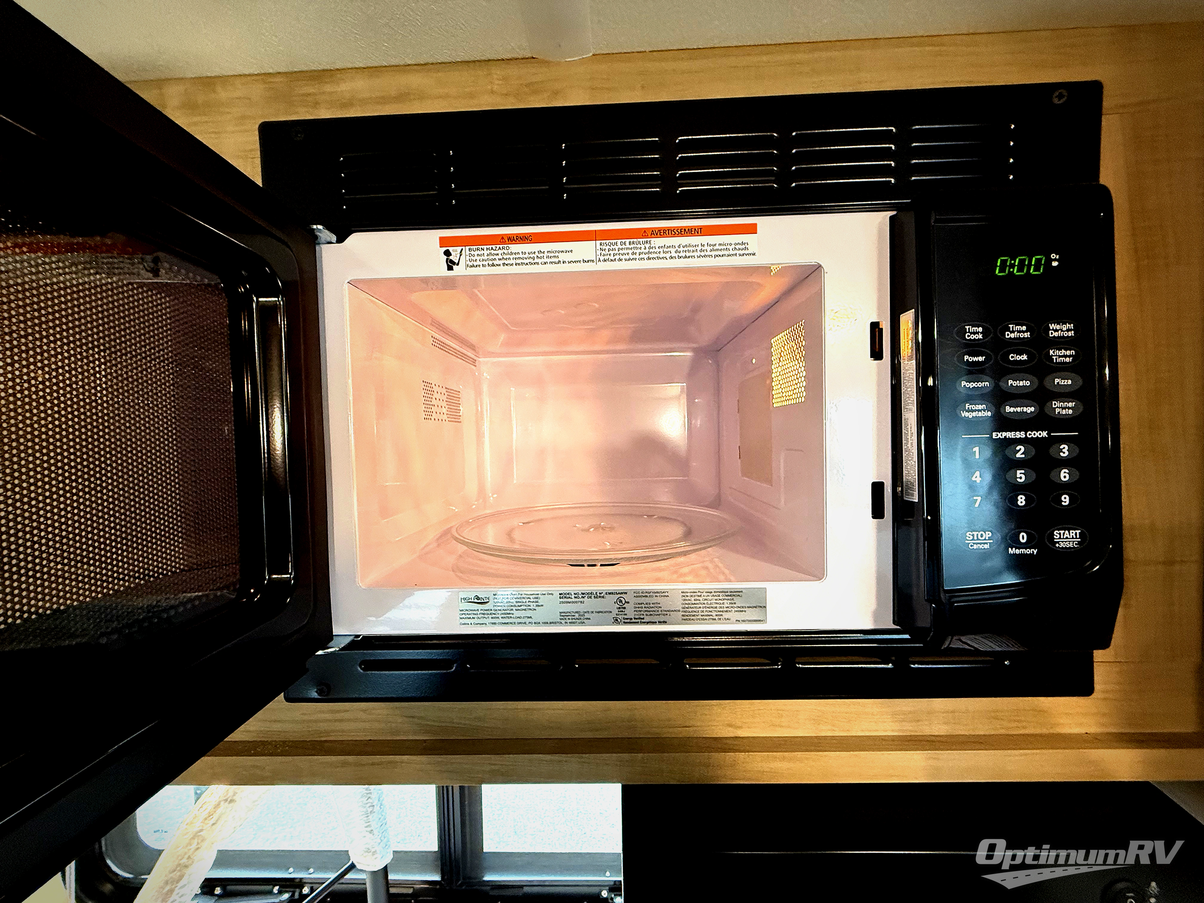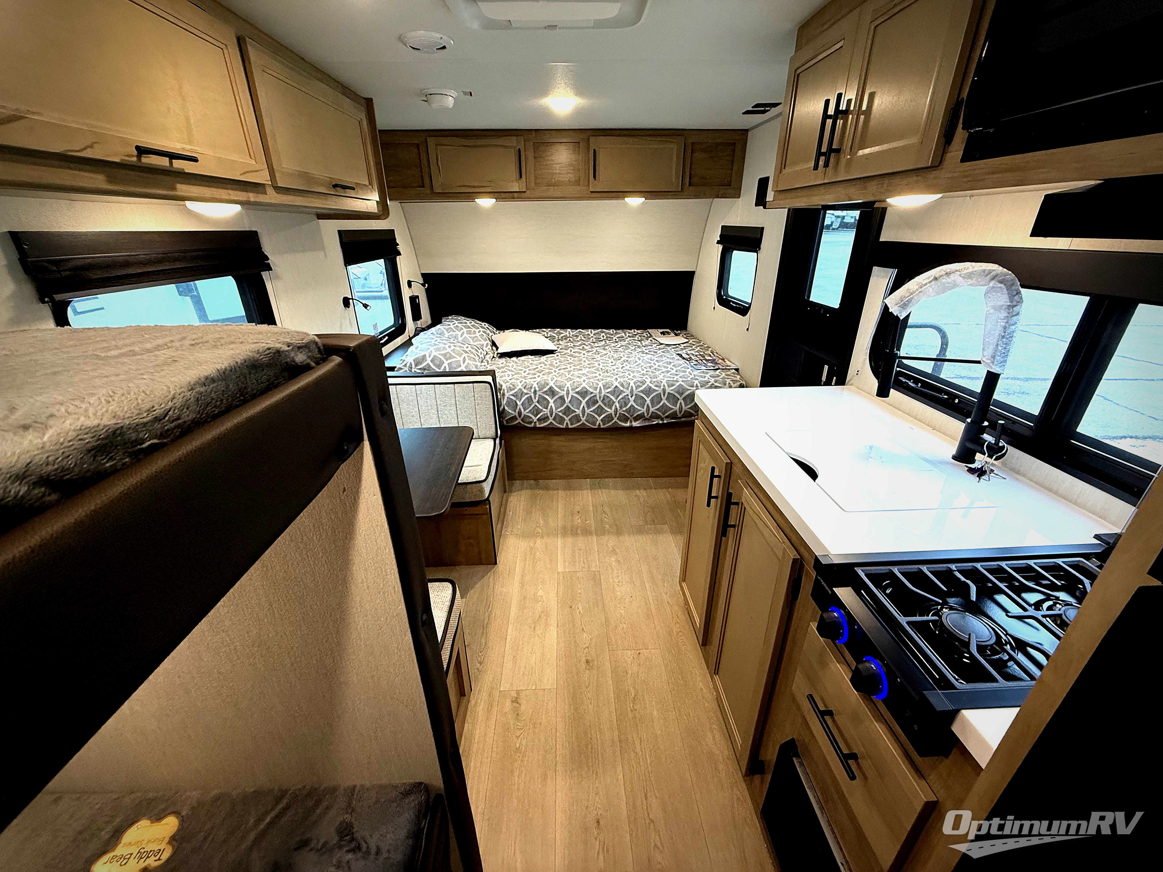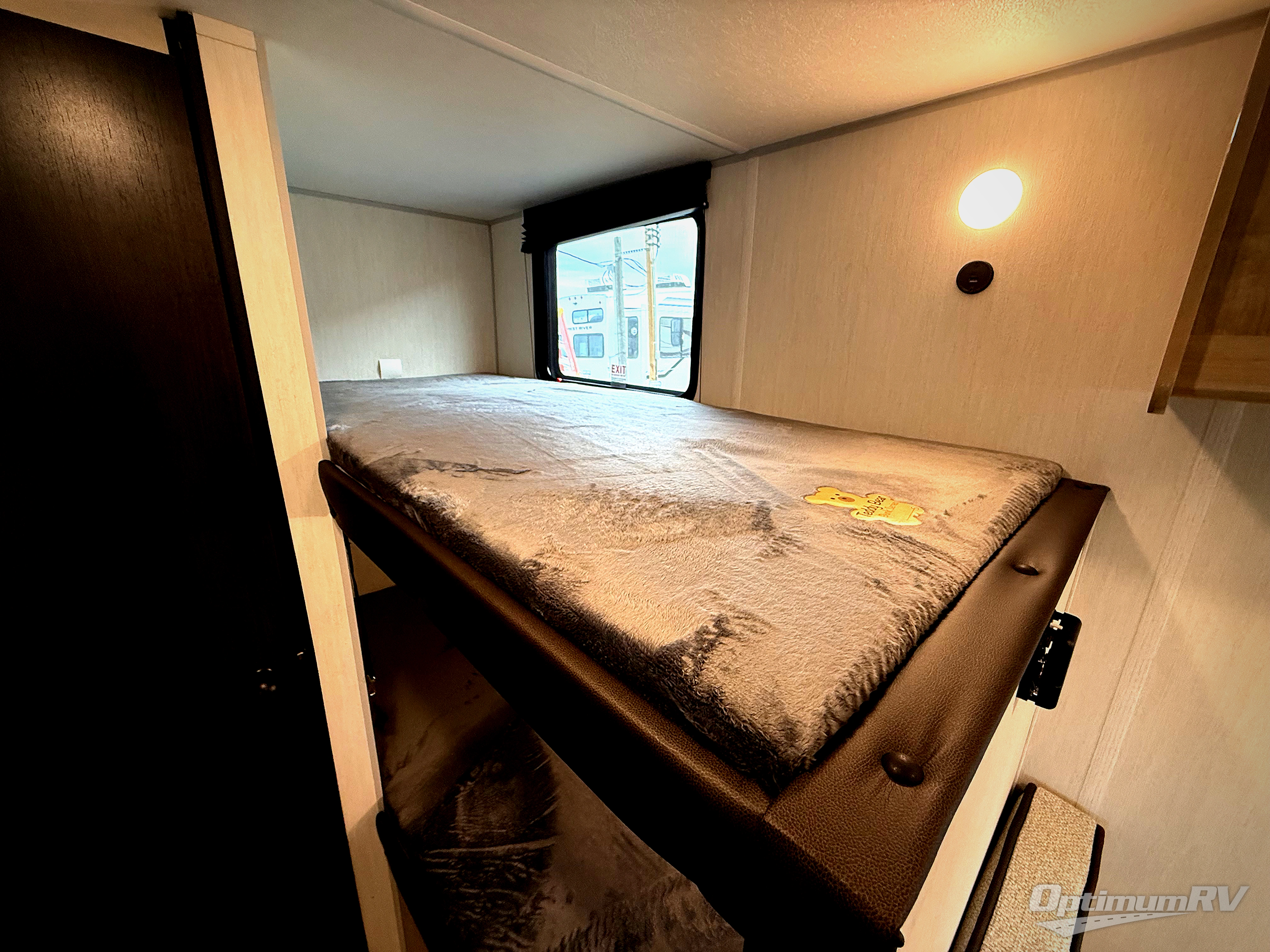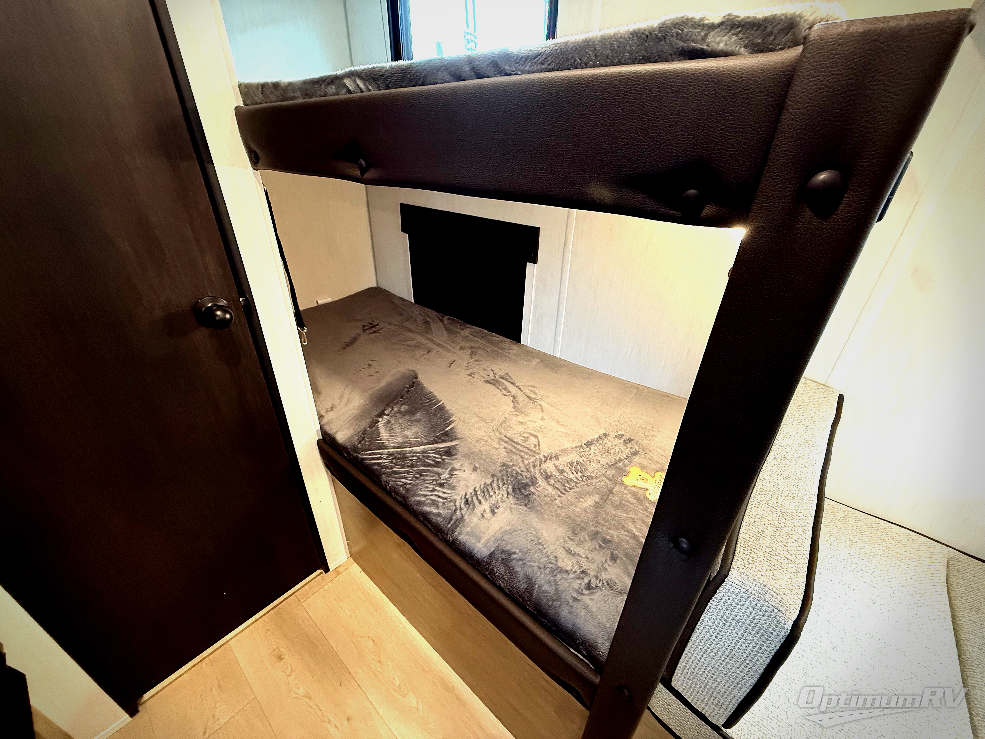The whole family can sleep comfortably in this travel trailer! It has a set of bunk beds for the kids or guests to sleep on, and you can sleep comfortably on the front queen bed with overhead cabinets and a shelf. There is even an exterior storage plus door that accesses the storage space under the bottom bunk. The chef will enjoy preparing their best home cooked meals either indoors with the cooktop or at the outside mini kitchen while staying protected by the 12' power awning!