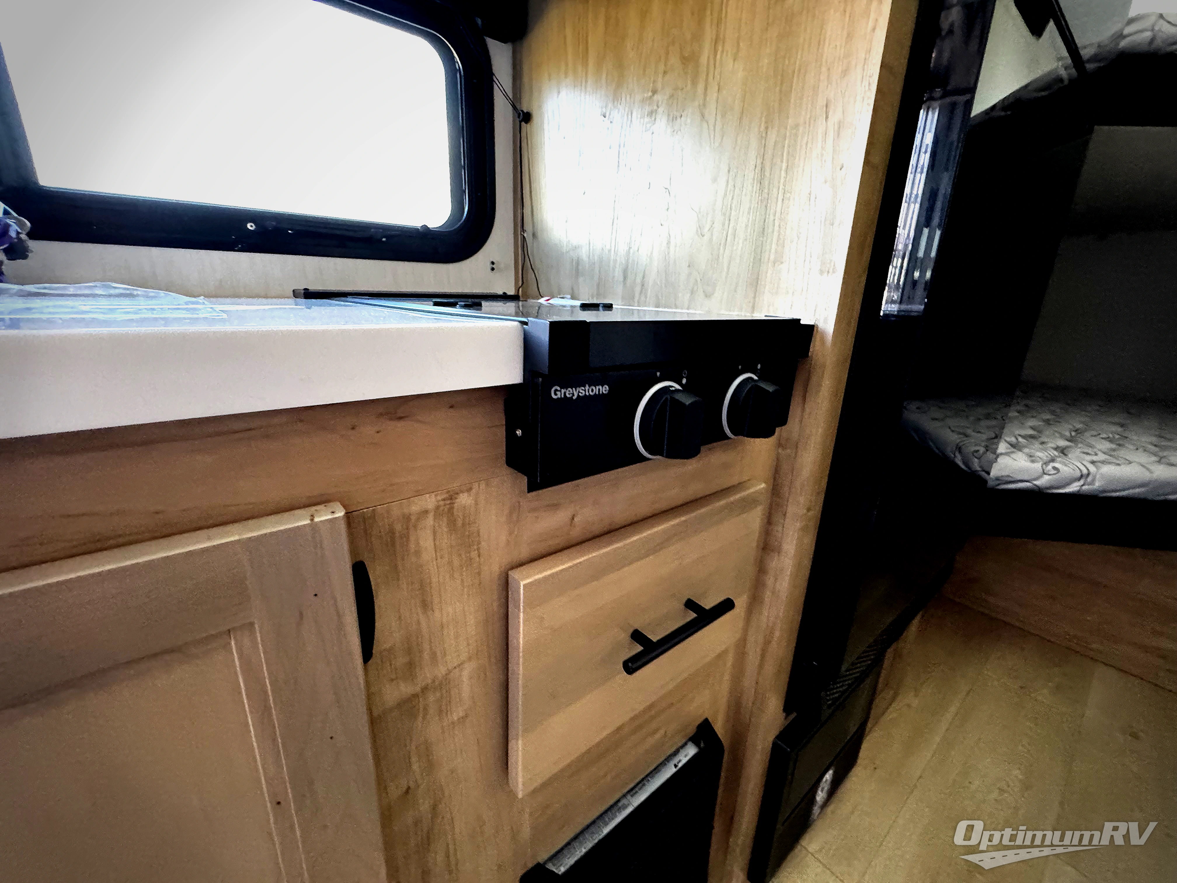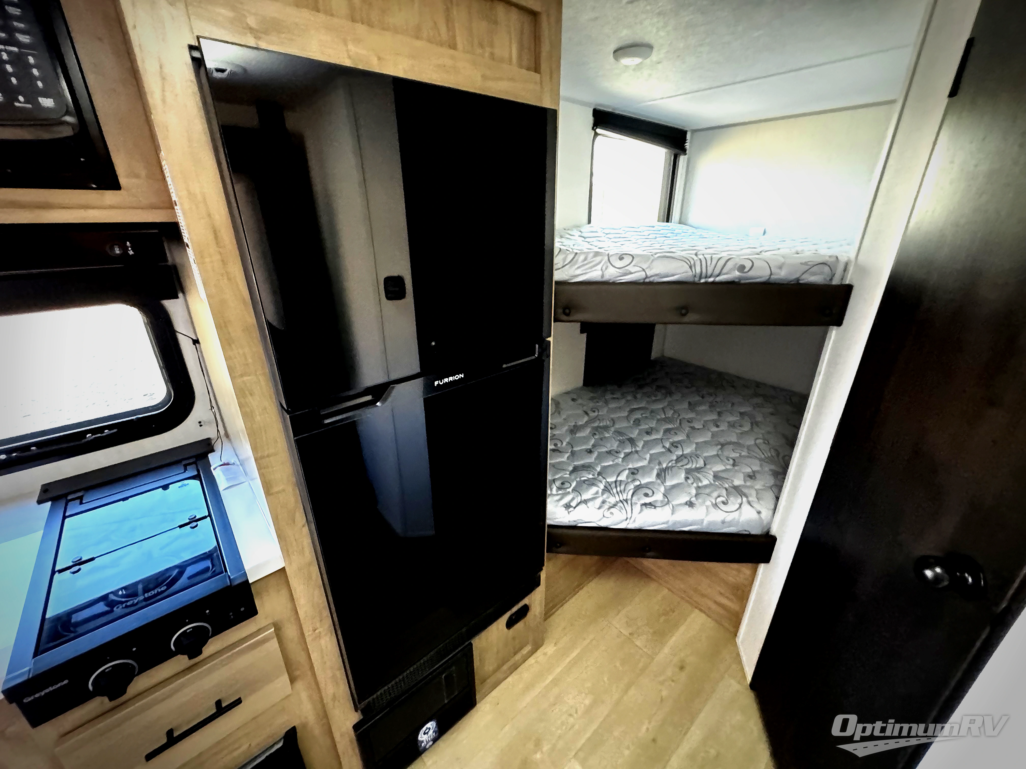 This family travel trailer is ready to head to the campground whenever you are! The kiddos can sleep on the set of double-size bed bunks, and you can sleep on the front queen bed, plus the U-shaped dinette slide can also transform into an extra sleeping space when you aren't using it to enjoy a meal. You can prepare your delicious meals on the range or at the outside mini kitchen and stay protected by the awning. The exterior not only has outside storage and an outside TV mount but also features an outside storage plus door for access to the storage space underneath the bottom bunk bed. The rear corner bath allows everyone to stay clean and refreshed while you camp.