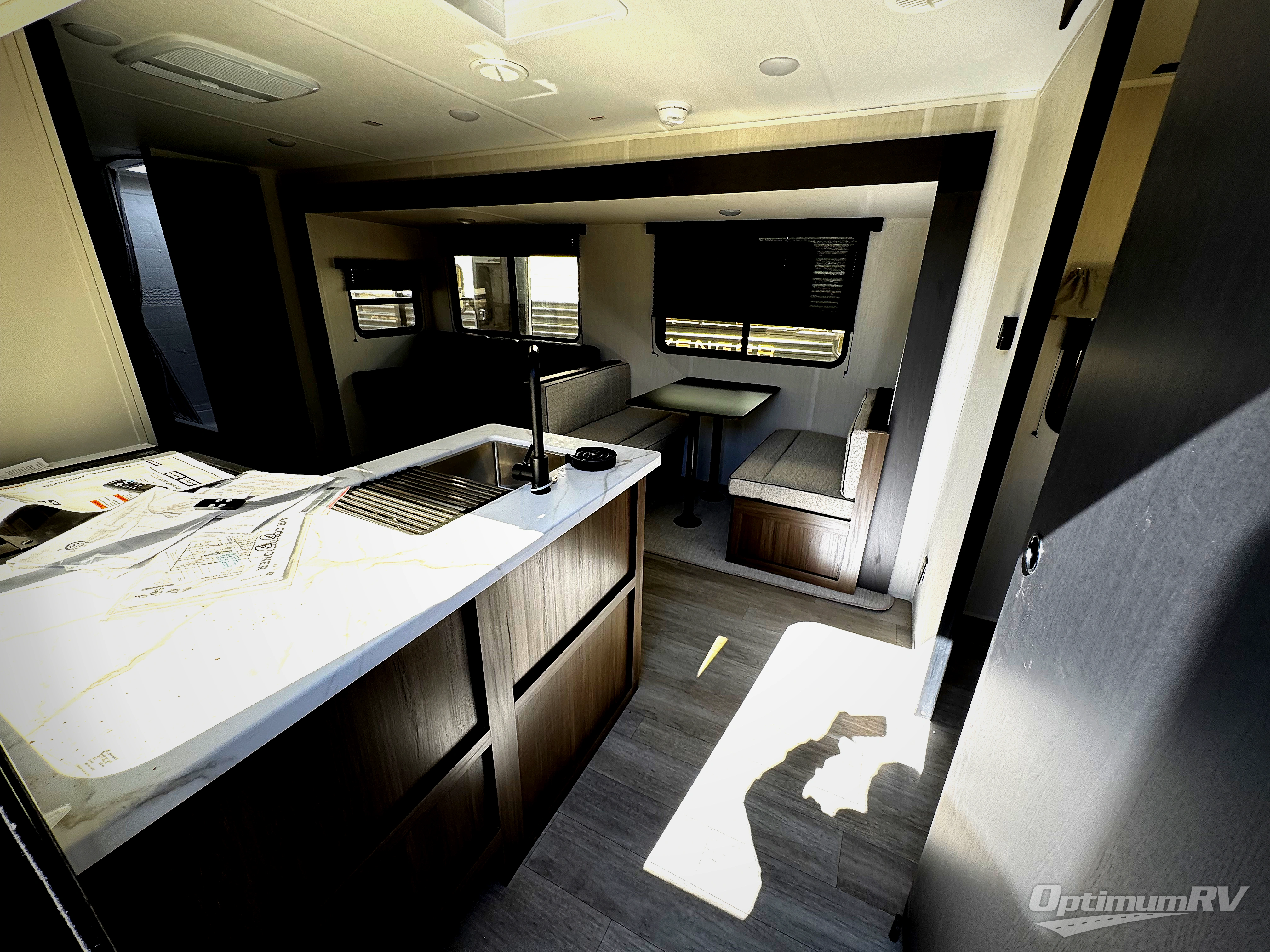 You'll appreciate the added space in this travel trailer thanks to the large slide out! The booth dinette and sofa are found here, and there is a moveable storage ottoman for extra blankets or board games. You'll have your own space up front in the private bedroom, complete with a camp king bed and storage for your things. The chef of your group will find a three burner cooktop and a built-in convection microwave with an air fryer to cook meals, plus there is a 12V refrigerator and hidden pantry for food storage. This unit also includes a power awning outdoors and an outside refrigerator to keep cold drinks close by.