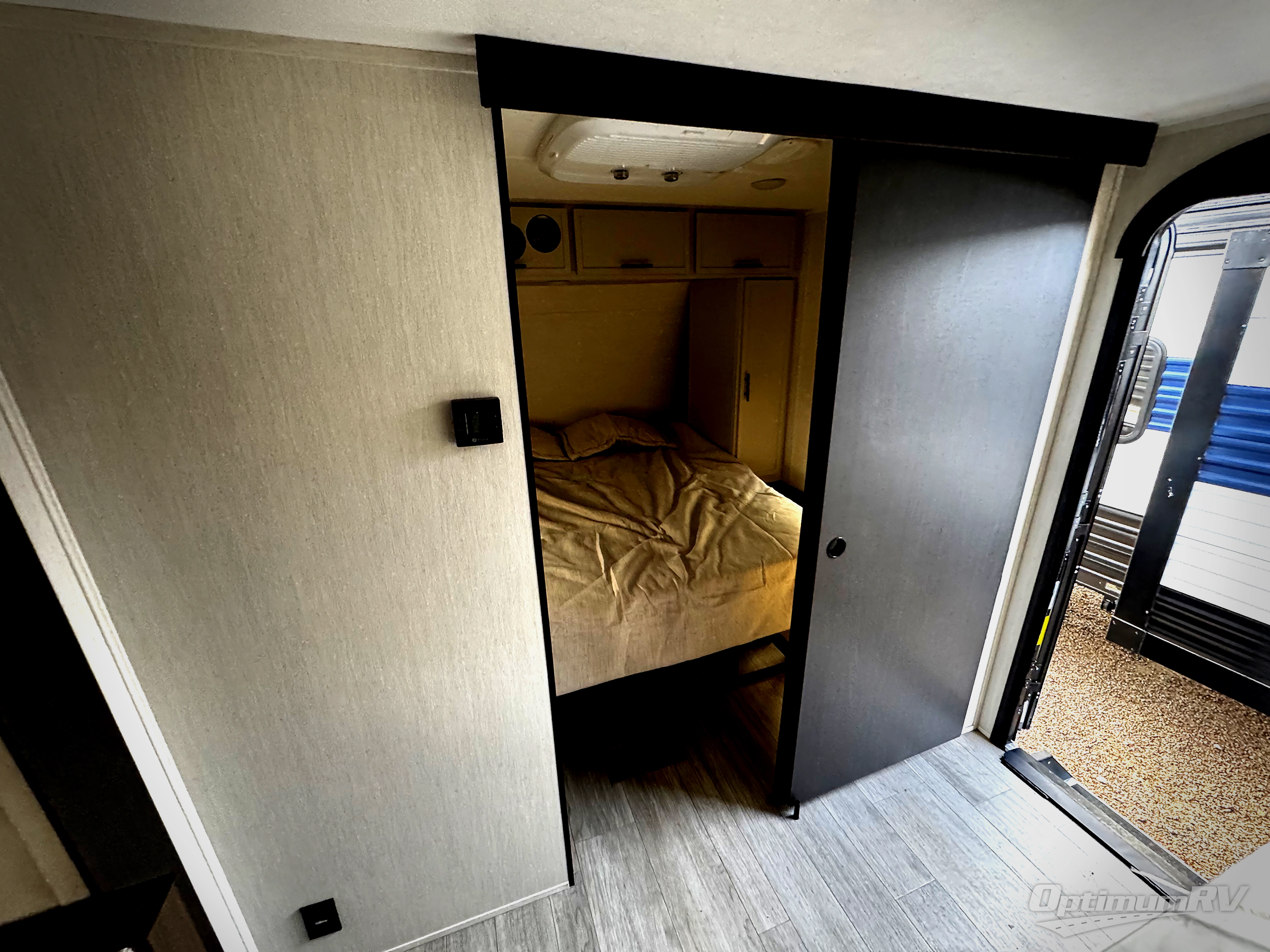 You'll appreciate the added space in this travel trailer thanks to the large slide out! The booth dinette and sofa are found here, and there is a moveable storage ottoman for extra blankets or board games. You'll have your own space up front in the private bedroom, complete with a camp king bed and storage for your things, while your guests take the double-size bunk beds towards the back. The chef of your group will find a three-burner cooktop and a built-in convection microwave with an air fryer to cook meals, plus there is a 12V refrigerator and large hidden pantry for food storage. This unit also includes a power awning outdoors and an outside refrigerator to keep cold drinks close by.