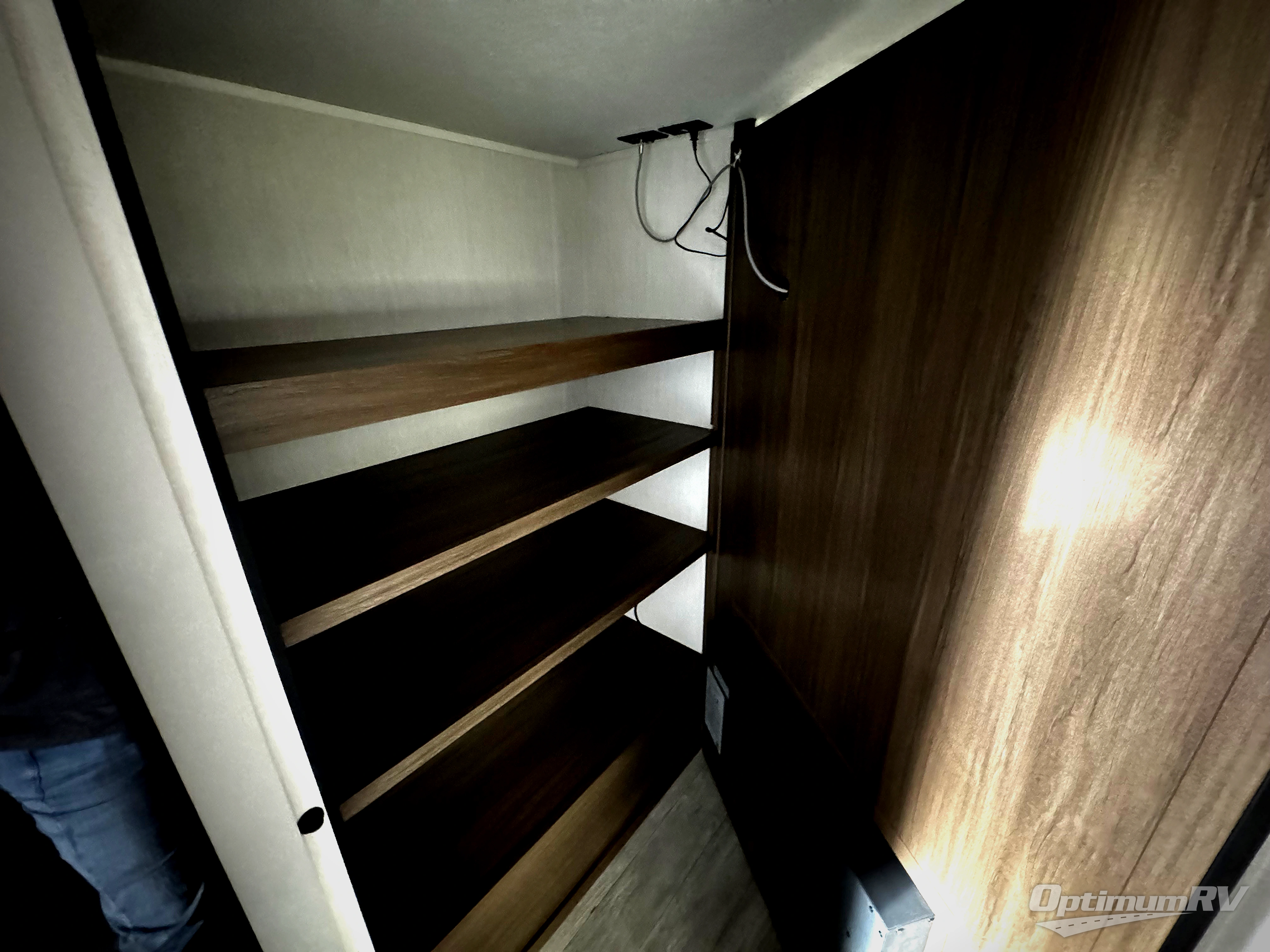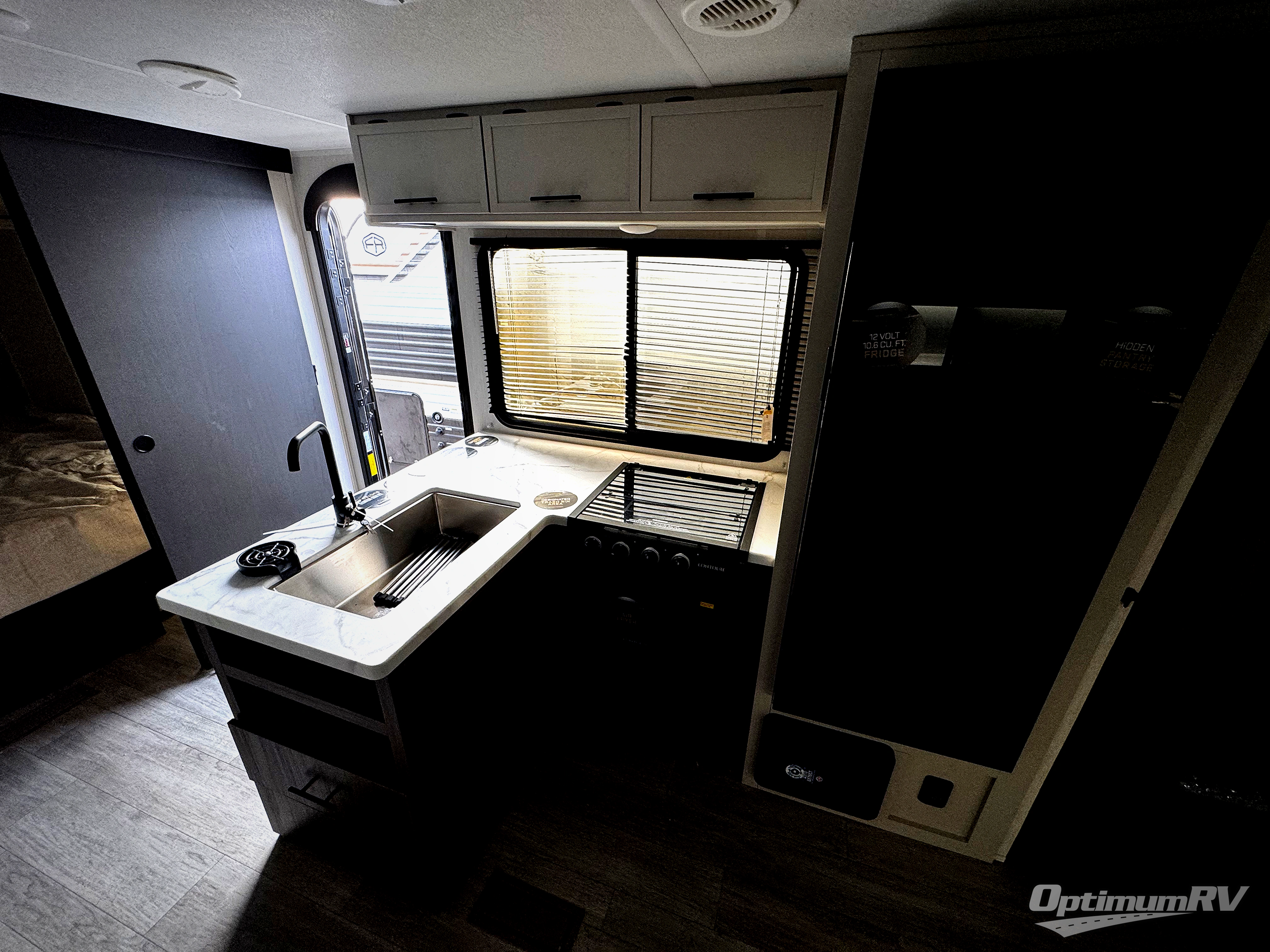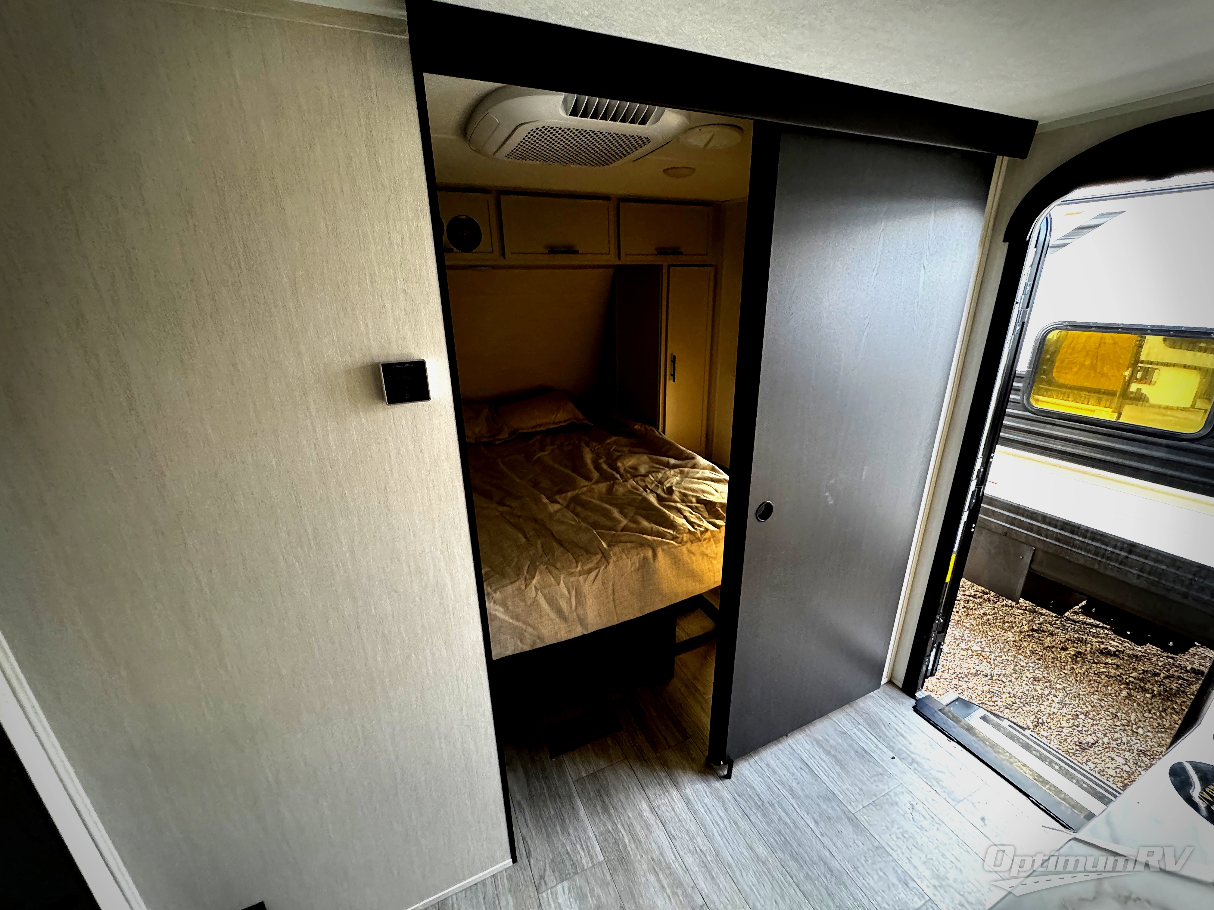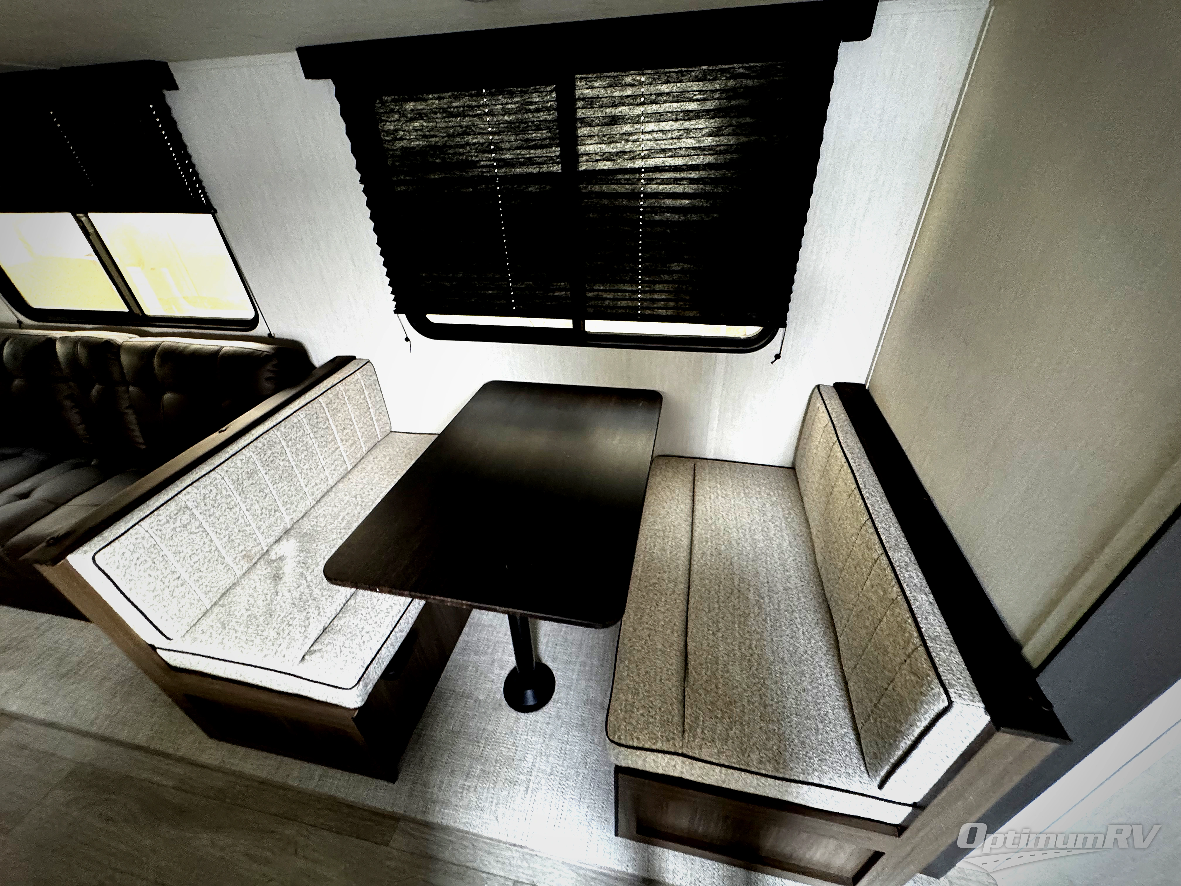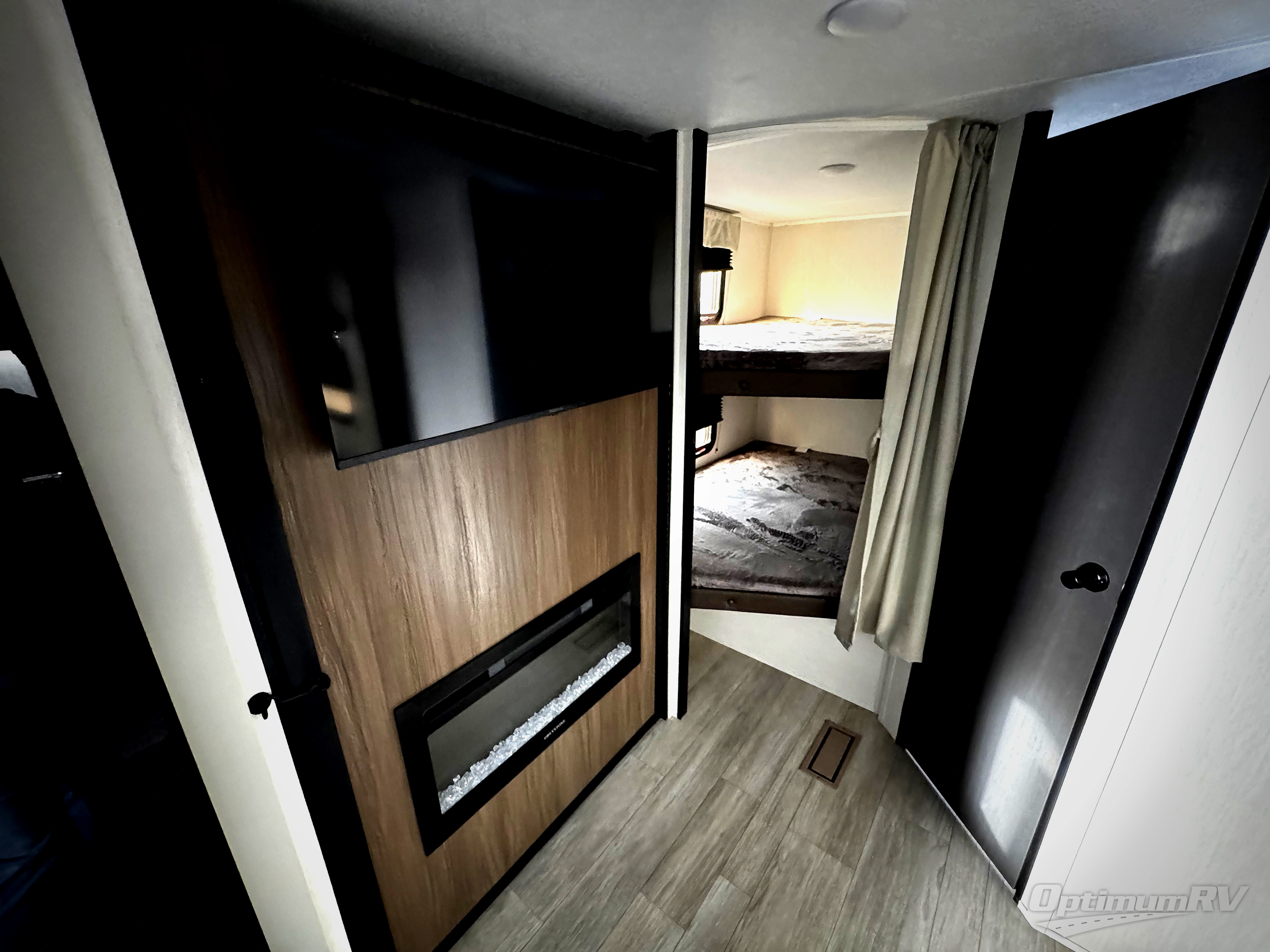 You'll appreciate the added space in this travel trailer thanks to the large slide out! The booth dinette and sofa are found here, and there is a moveable storage ottoman for extra blankets or board games. You'll have your own space up front in the private bedroom, complete with a camp king bed and storage for your things, while your guests take the double-size bunk beds towards the back. The chef of your group will find a three-burner cooktop and a built-in convection microwave with an air fryer to cook meals, plus there is a 12V refrigerator and large hidden pantry for food storage. This unit also includes a power awning outdoors and an outside refrigerator to keep cold drinks close by.