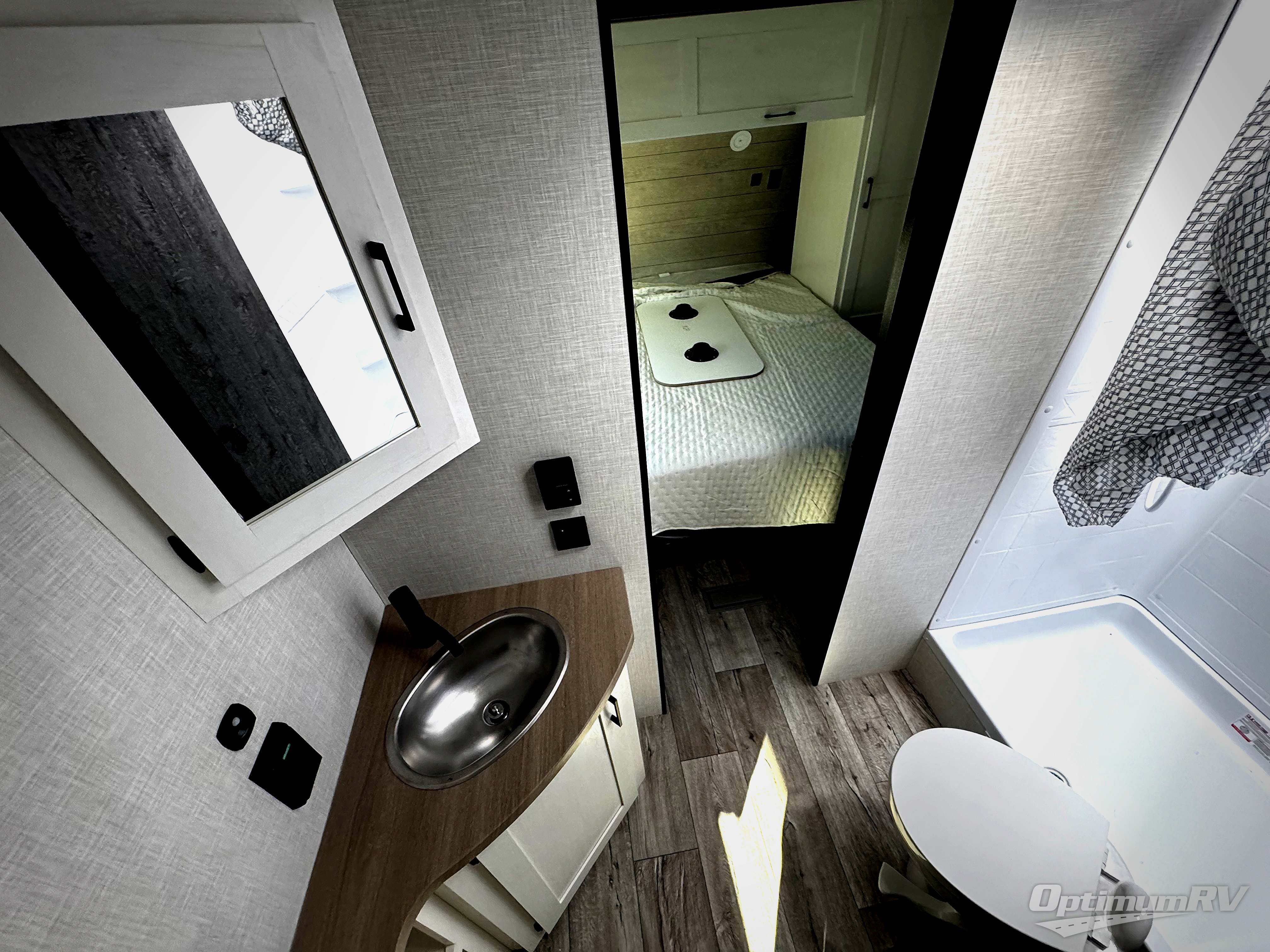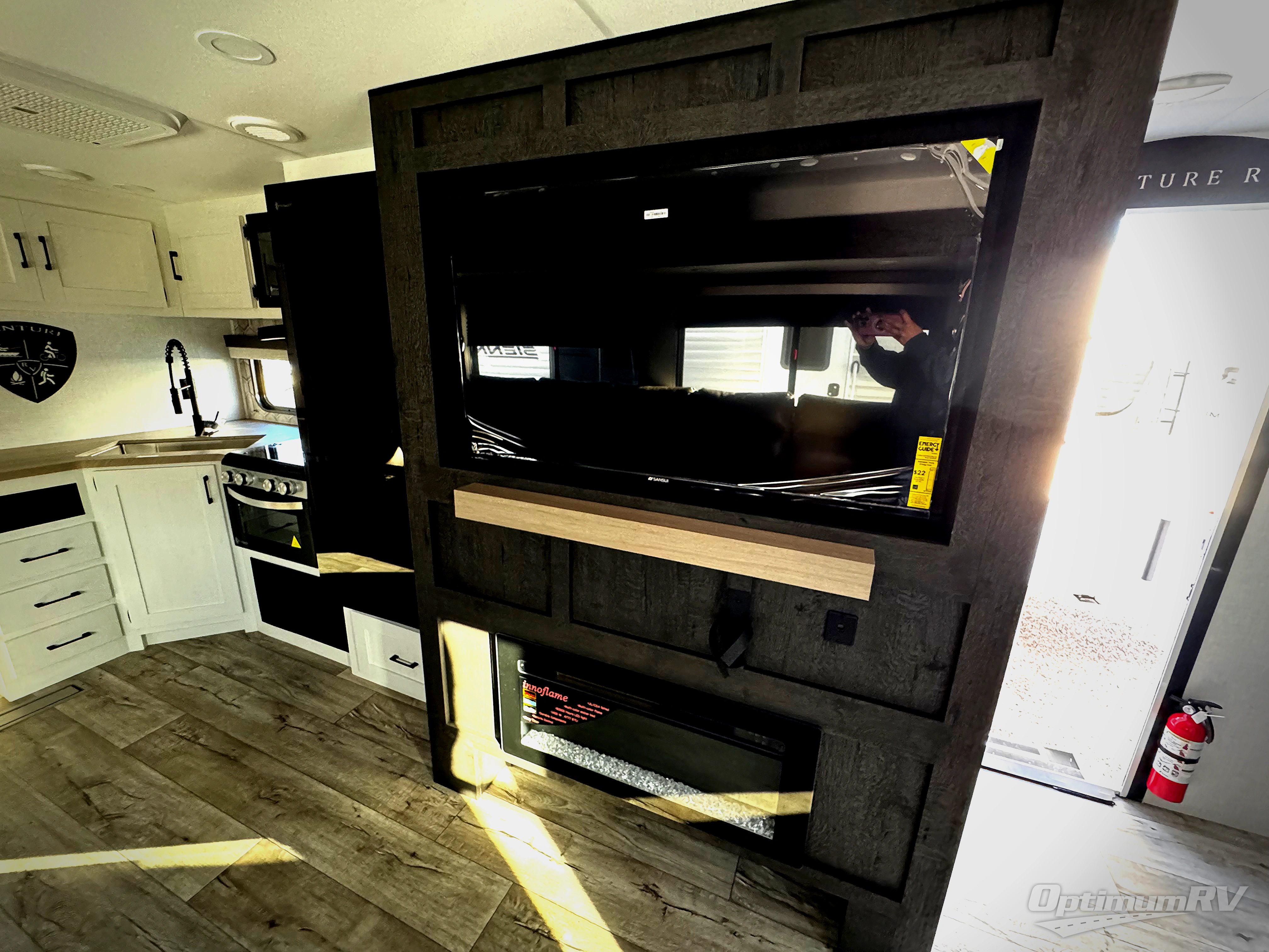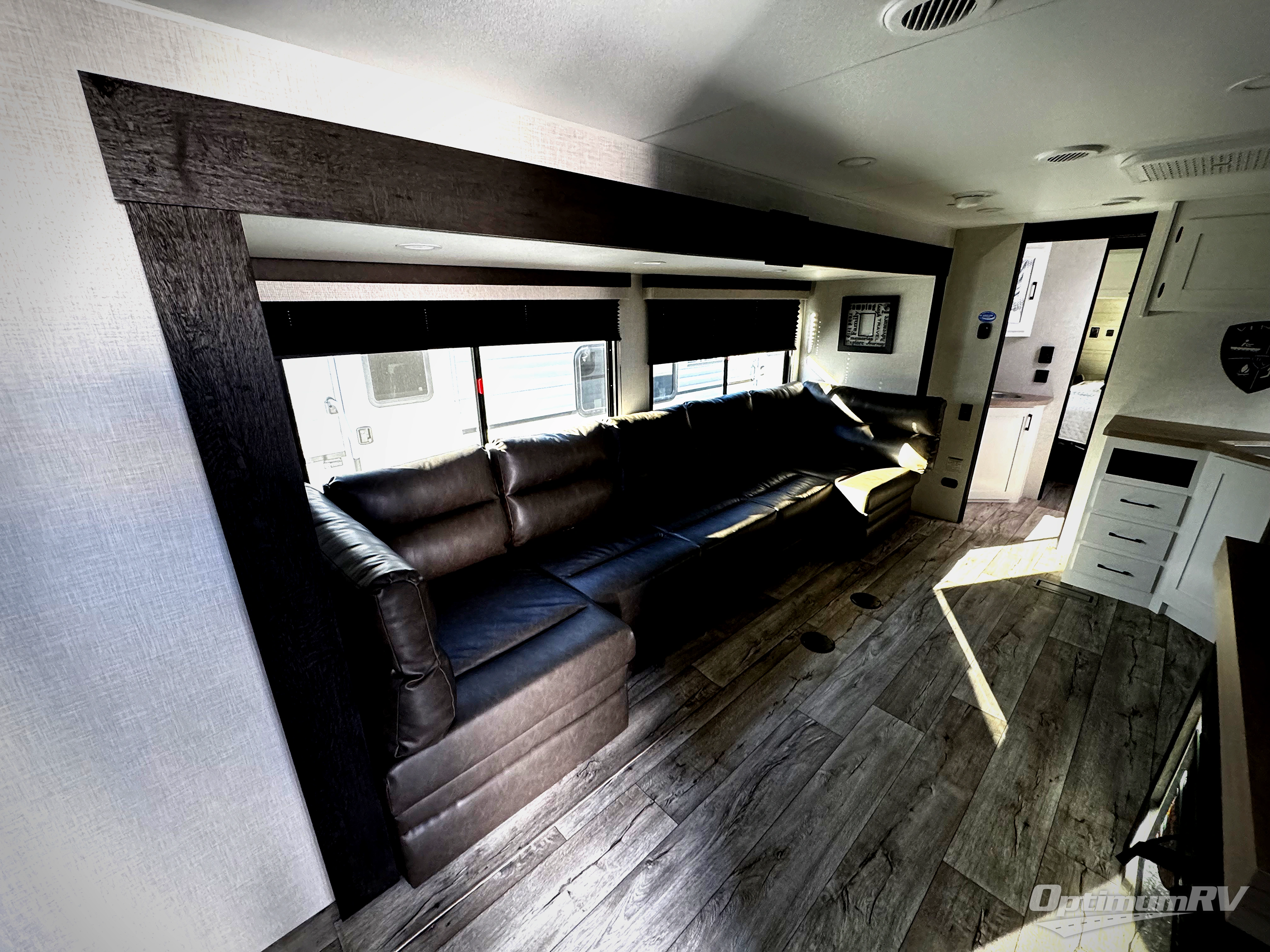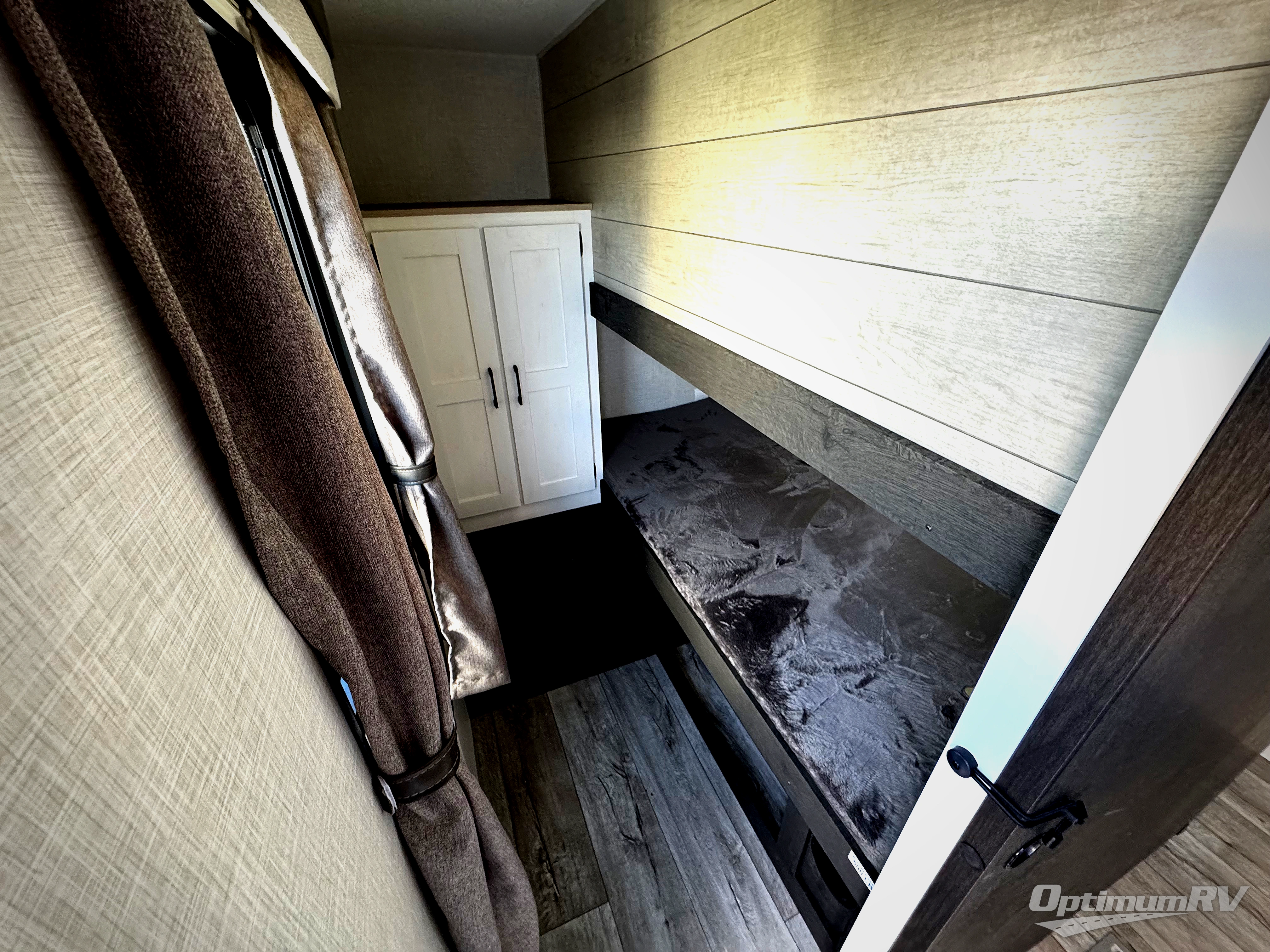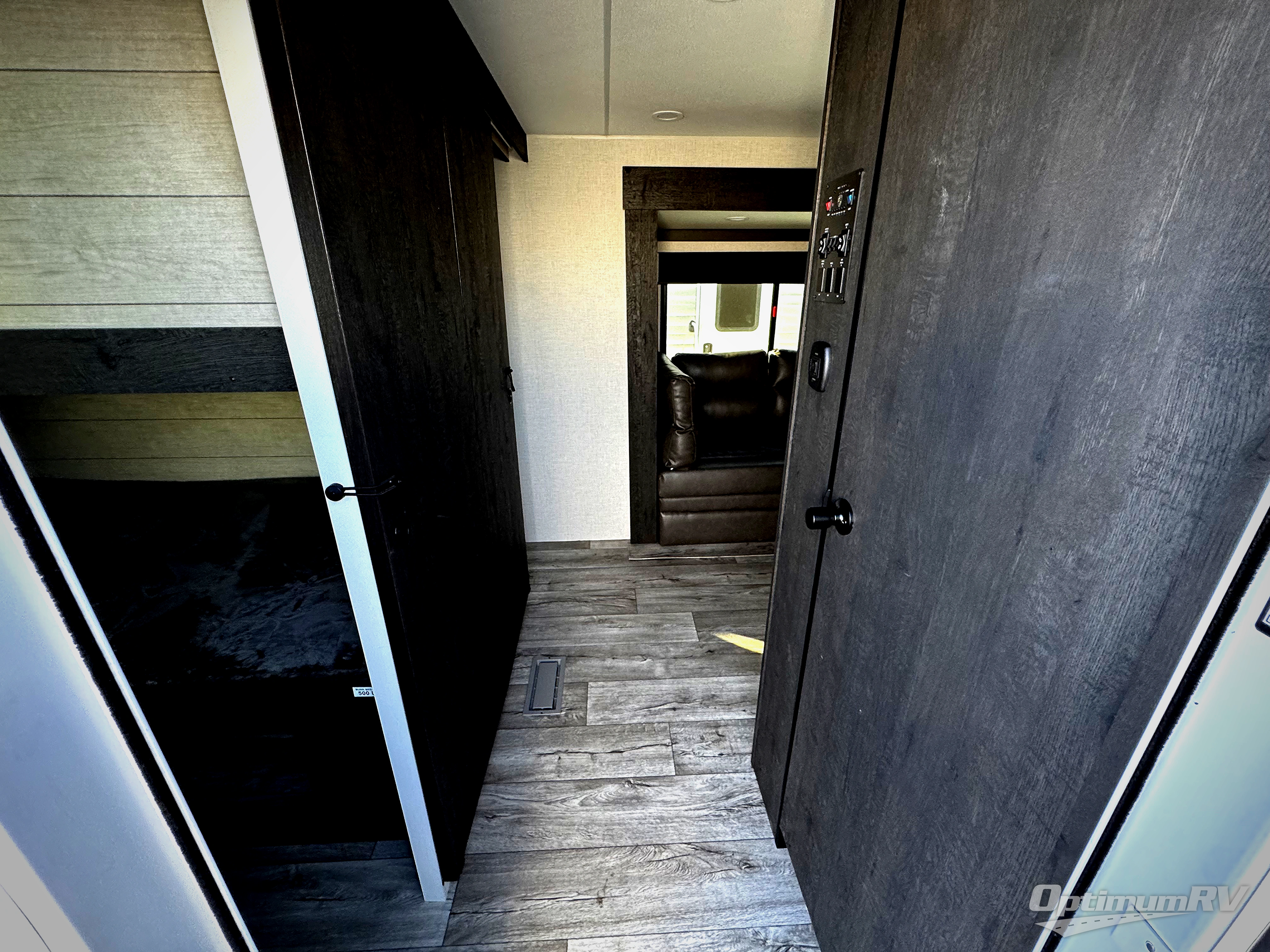 This travel trailer’s bunk beds are perfect for kids, providing ample sleeping space for the whole family. The wardrobes offer plenty of storage for your clothing and essentials.The sofa is a comfortable spot to relax, and the fireplace adds a cozy touch to the interior. The entertainment center is equipped with a 50” TV, perfect for family movie nights or enjoying your favorite shows on the go. The walk-in pantry provides ample storage for your food and snacks, while the 10 cu refrigerator keeps your food and drinks fresh. The sit n’ slide table is a fun and functional spot for meals and adds additional sleeping space. For convenience and comfort the walk-through bath provides easy access and convenience, while the overhead cabinets offer additional storage for your essentials. The front bedroom features a spacious queen bed and overhead cabinet. Head outside and unwind under the shade of the two exterior awnings and store everything you need in the pass-through storage offering ample space for your outdoor gear and equipment.