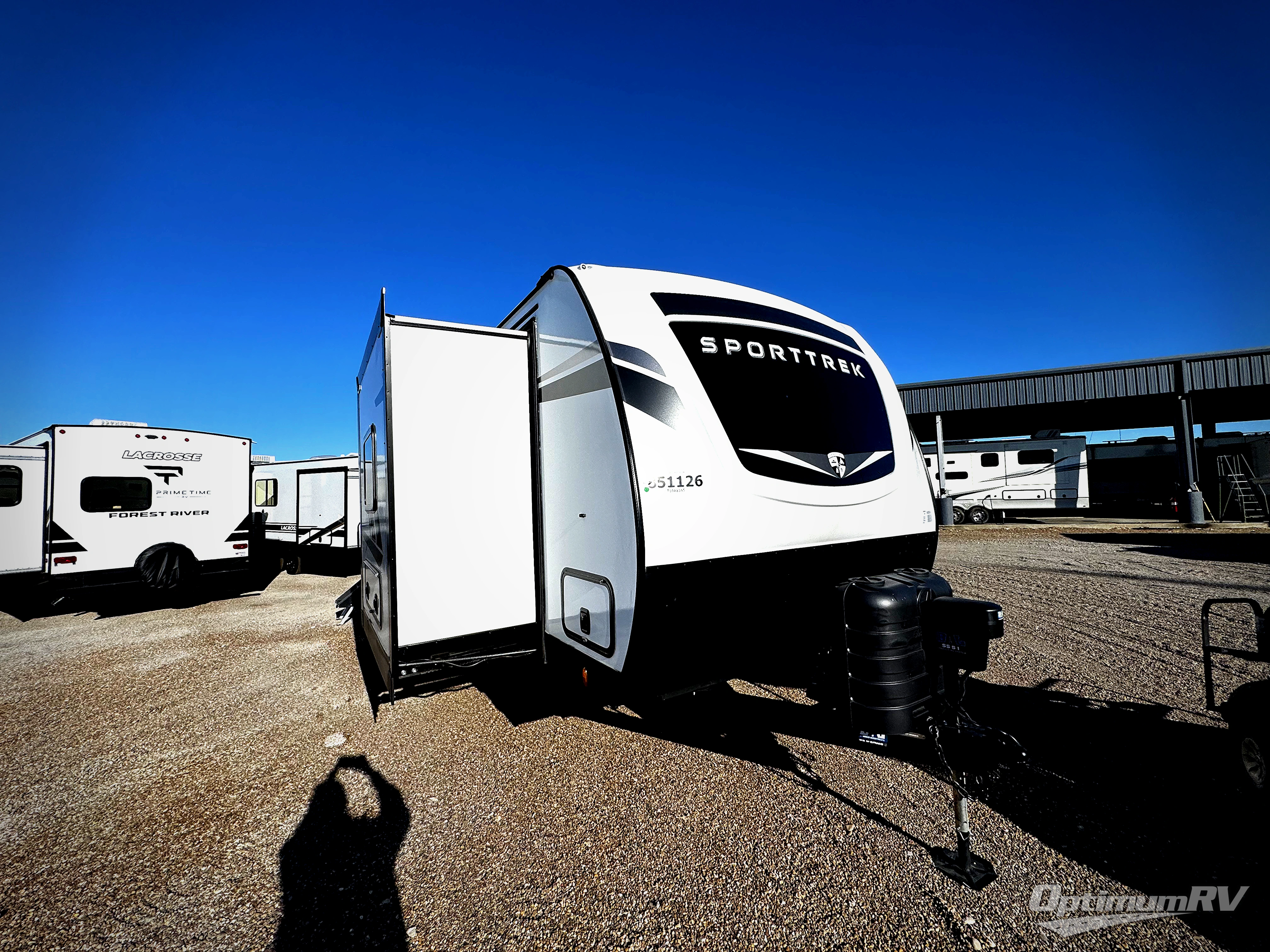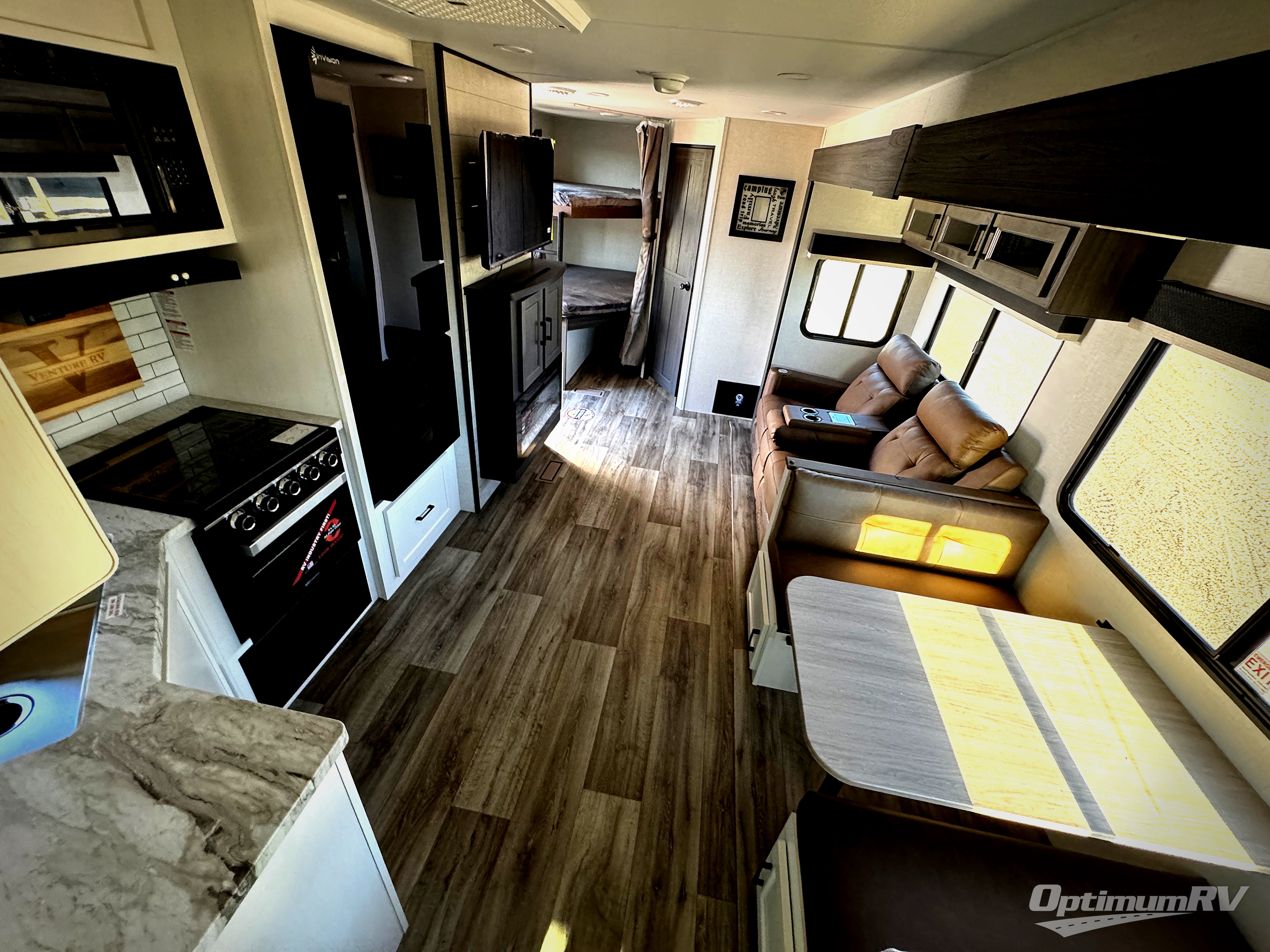 Every Venture RV SportTrek lightweight travel trailer is constructed to offer peace of mind and the comforts of home! Their purposeful residential kitchens are packed with handy features like a Furrion oven and three burner cooktop, a large stainless steel sink with a cover and dish drying rack, plus a 12V refrigerator. You will find plenty of storage throughout, including Safe-Tek hidden storage with a charging center and StorMore nightstands on either side of the bed behind the full-length closets. And the magnetic slam-latch baggage doors and spacious pass-through storage area will hold your outdoor gear in place. They even come with a hot and cold exterior shower and SporTrek's Weather Shield which includes a forced air heated and enclosed underbelly, high output A/C ducting, and more features that will let you extend your camping season. You will also love the new residential upgraded furniture, Serta memory foam mattress, barn style passage doors, and many more comforts!