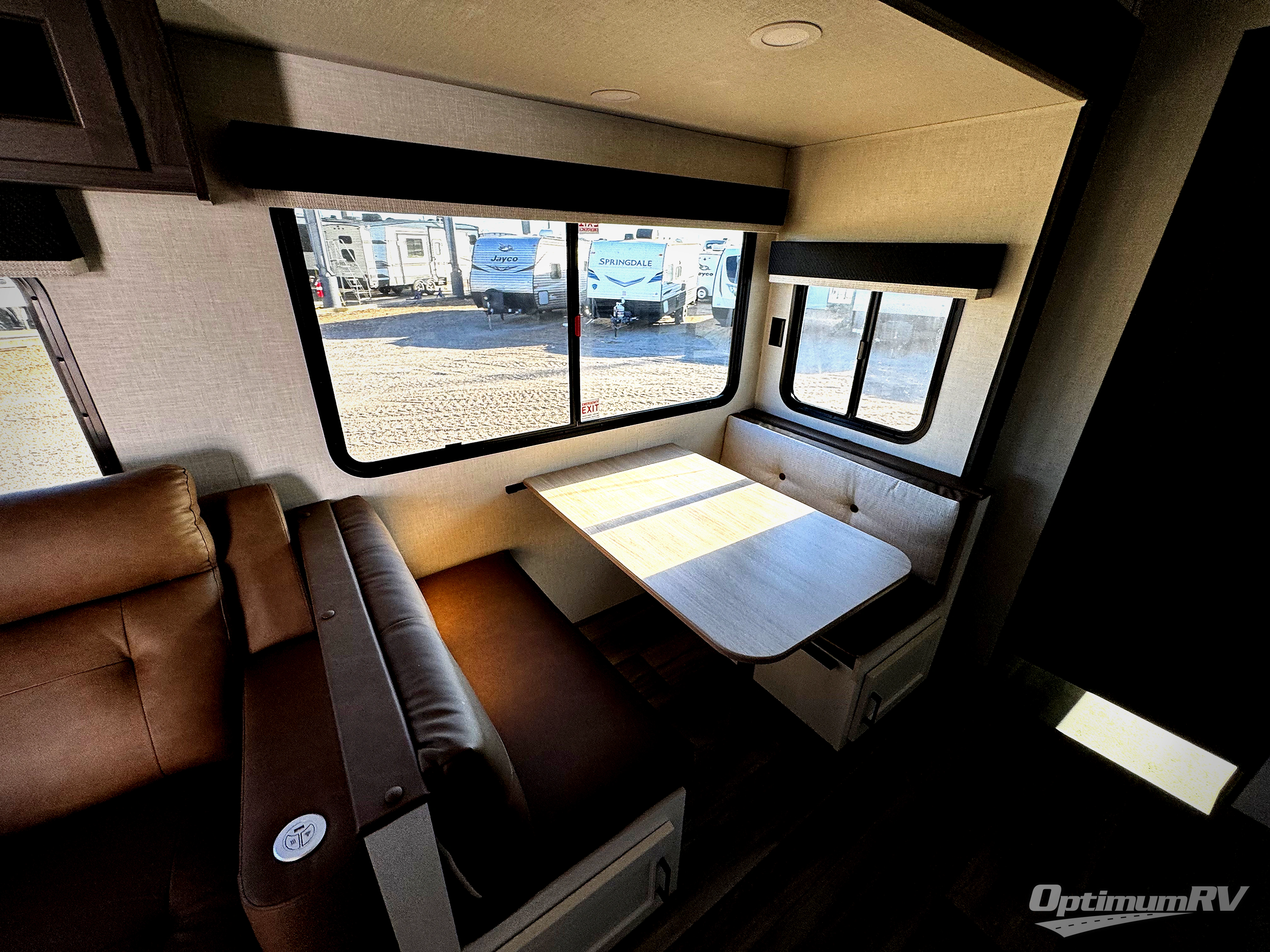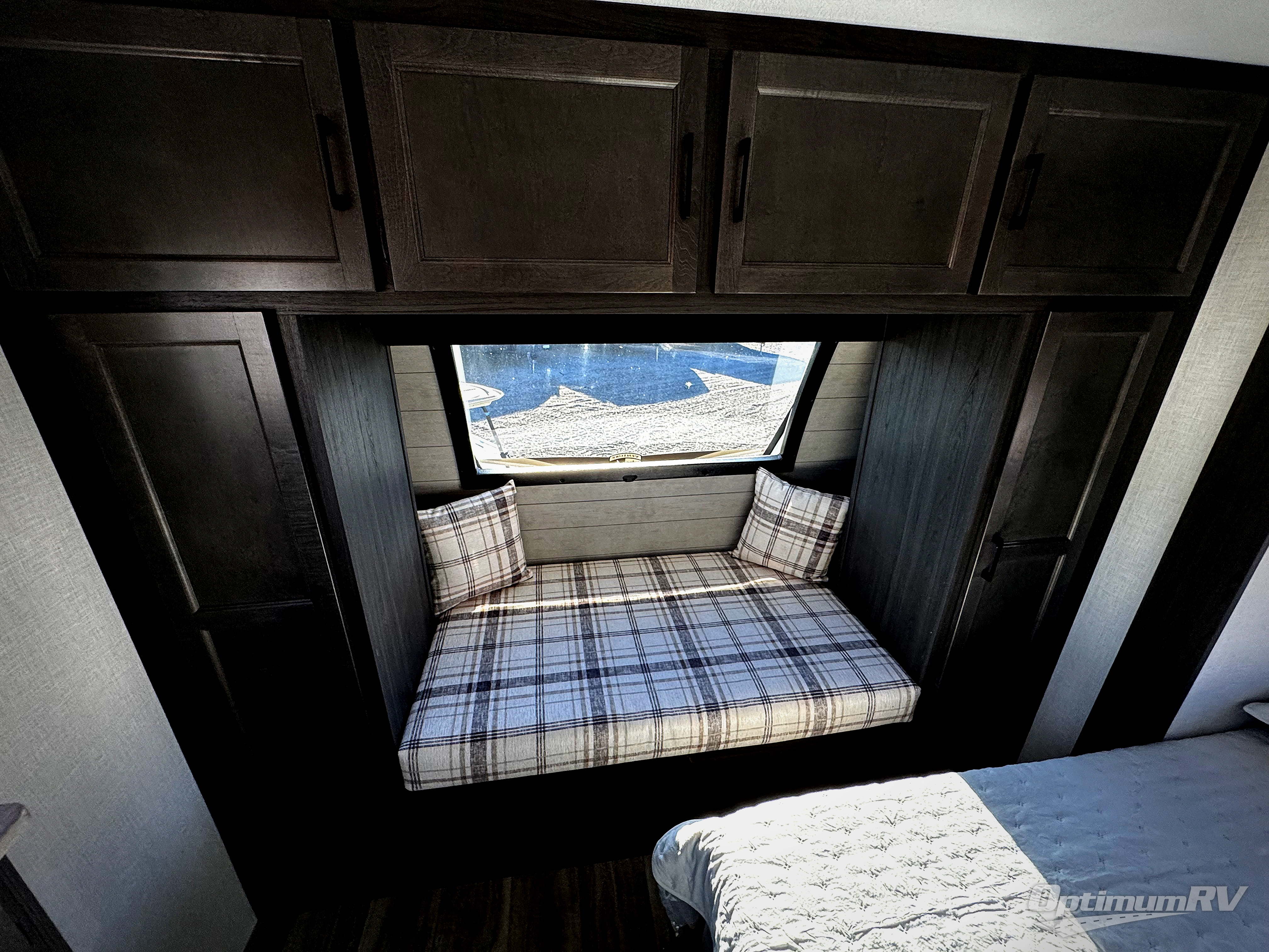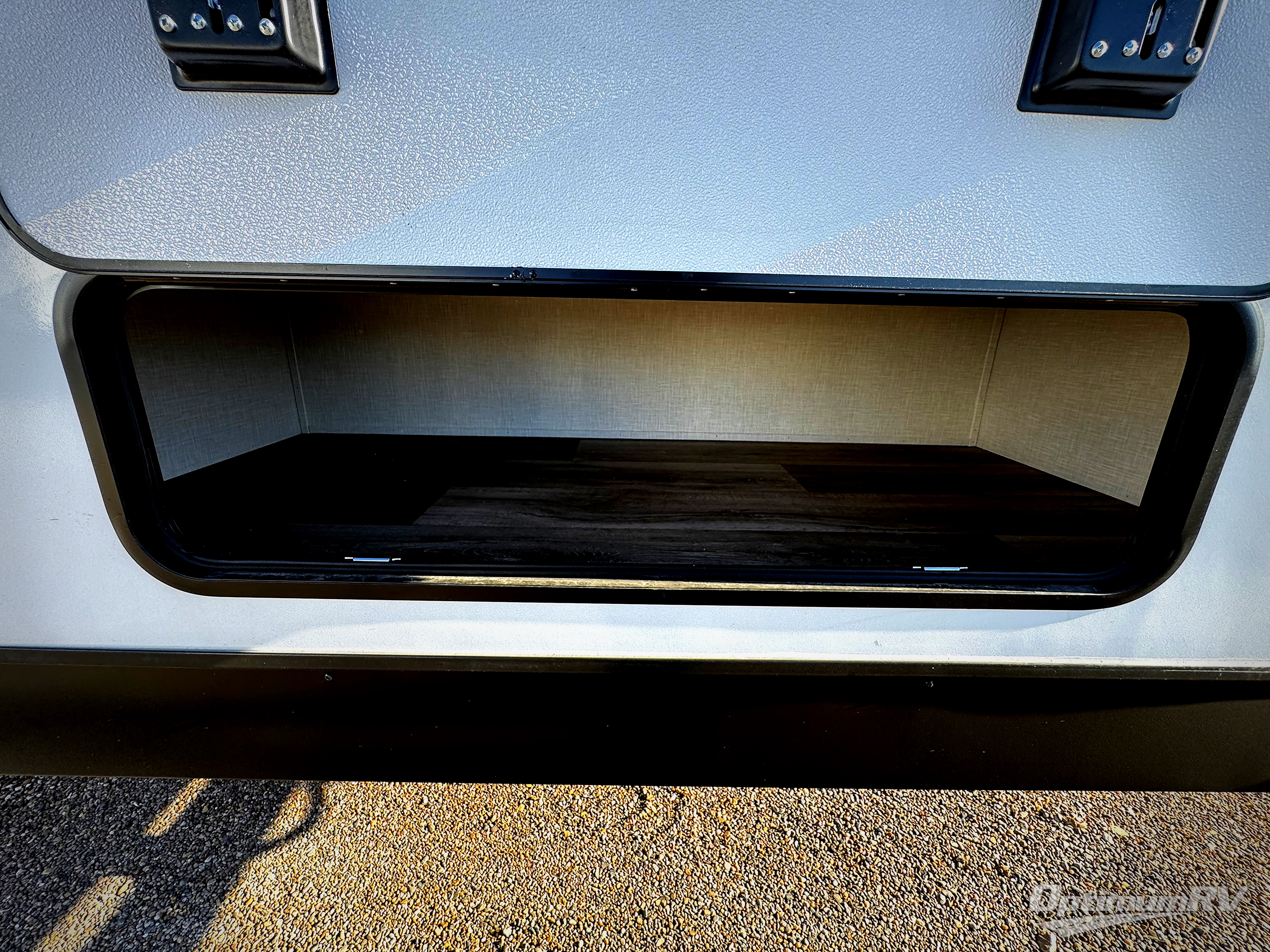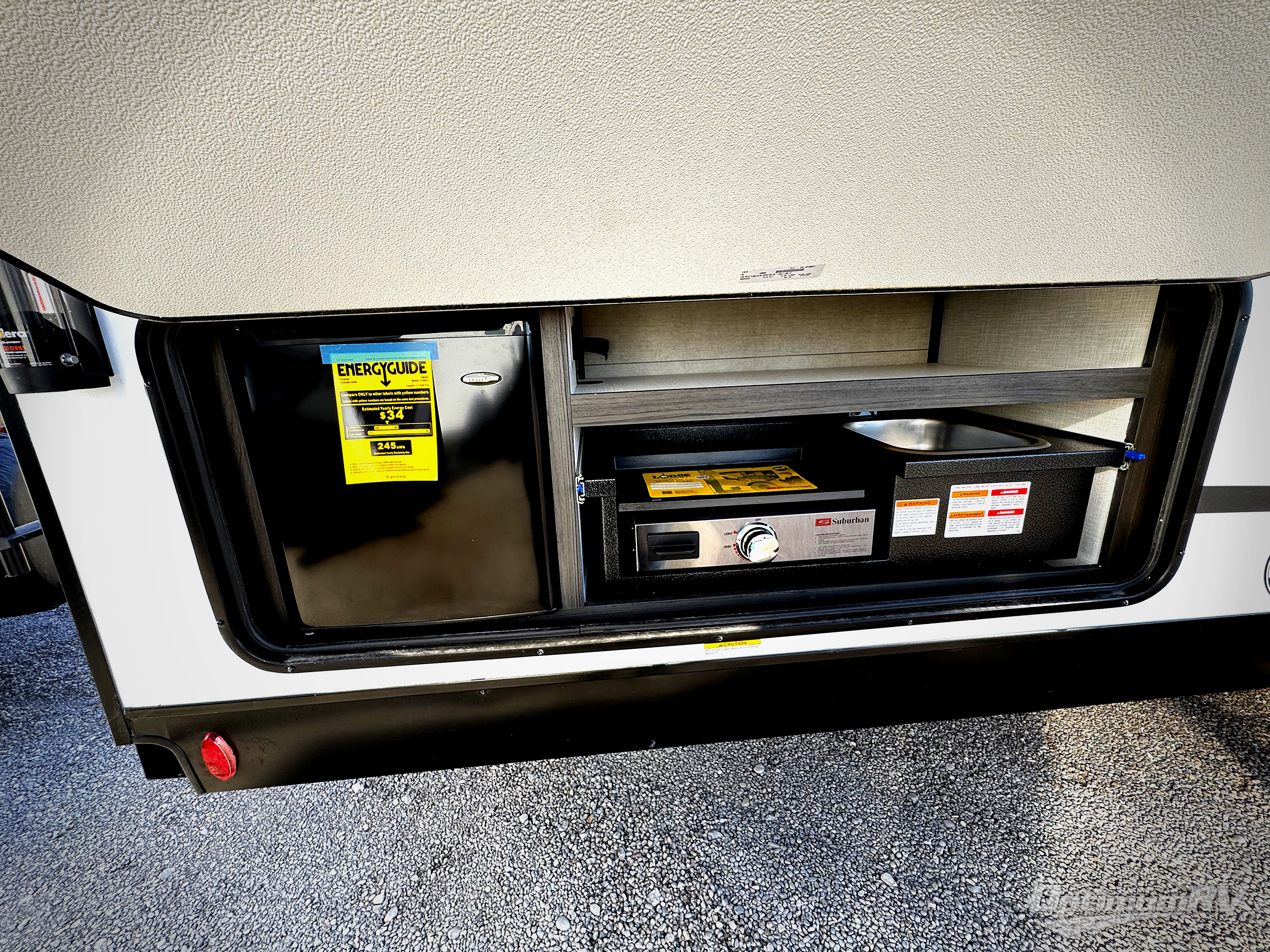 A front private bedroom with a king bed slide out is sure to make you feel at home, while your guests take the double-size bunks in the back. There is a full bath right next to the bunks for easy nighttime use, and any other guests can sleep on the 70" sofa within the large slide out. There is plenty of storage space, including a walk-in pantry with coat hooks, a bedroom dresser and closets to keep clothes organized, and an exterior pass-thru storage for camp gear! A full kitchen inside will let you cook in comfort when the weather isn't cooperating, and an exterior campfire cafe includes an outdoor refrigerator, sink, and griddle for a sunrise breakfast!