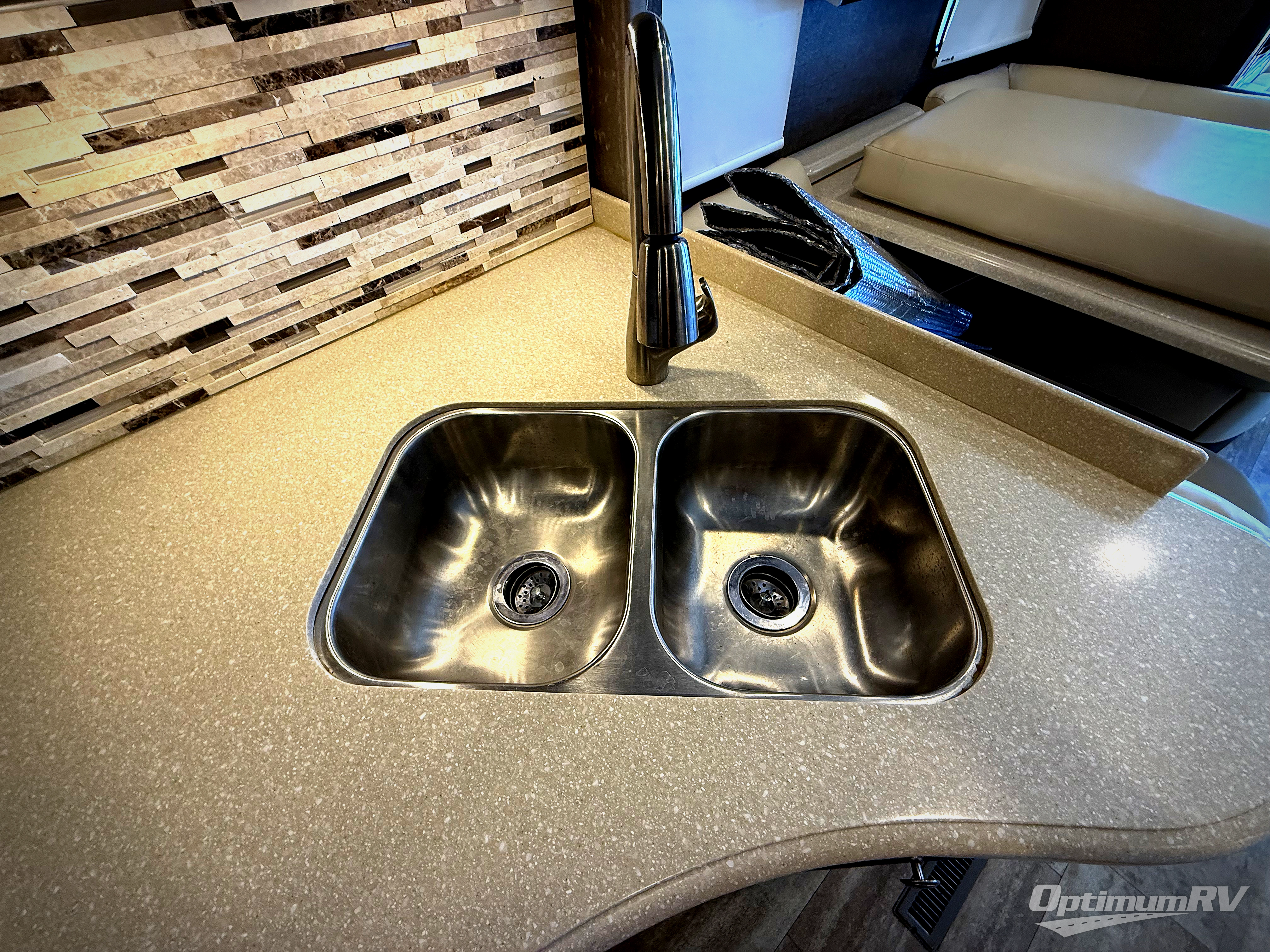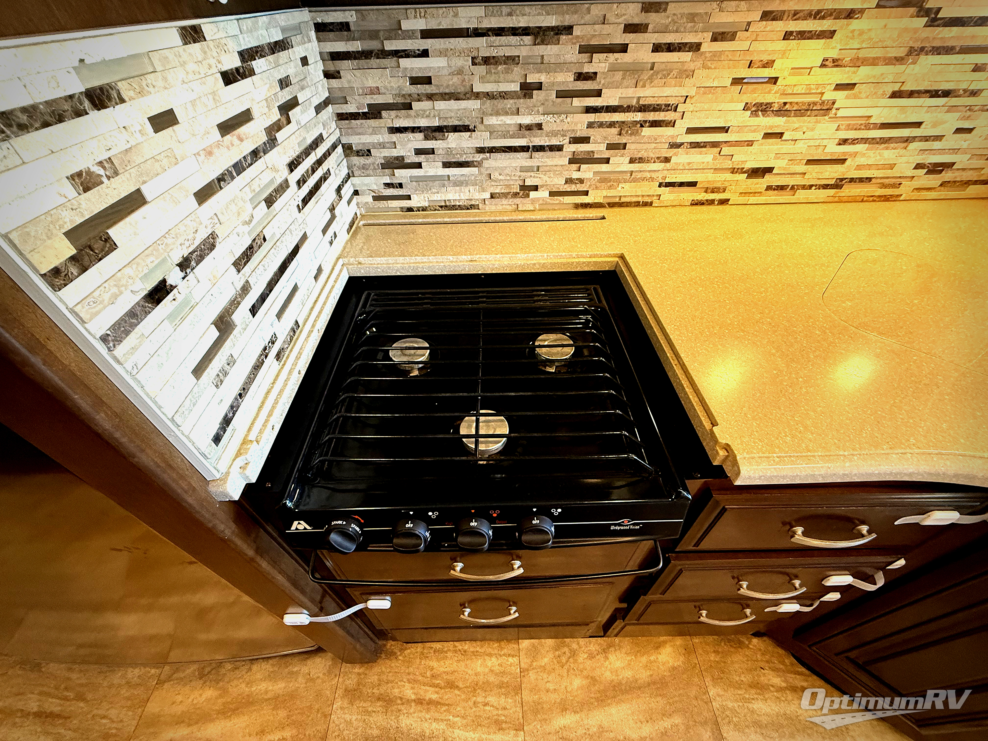 Along the road side, a generous slide out has a dream dinette booth with a 40" LED TV mounted above. There is also an angled double bowl sink, three burner range, microwave, overhead cabinets, residential refrigerator, pantry, stackable washer/dryer, and a closet. The large slide provides more walking around room inside the coach.