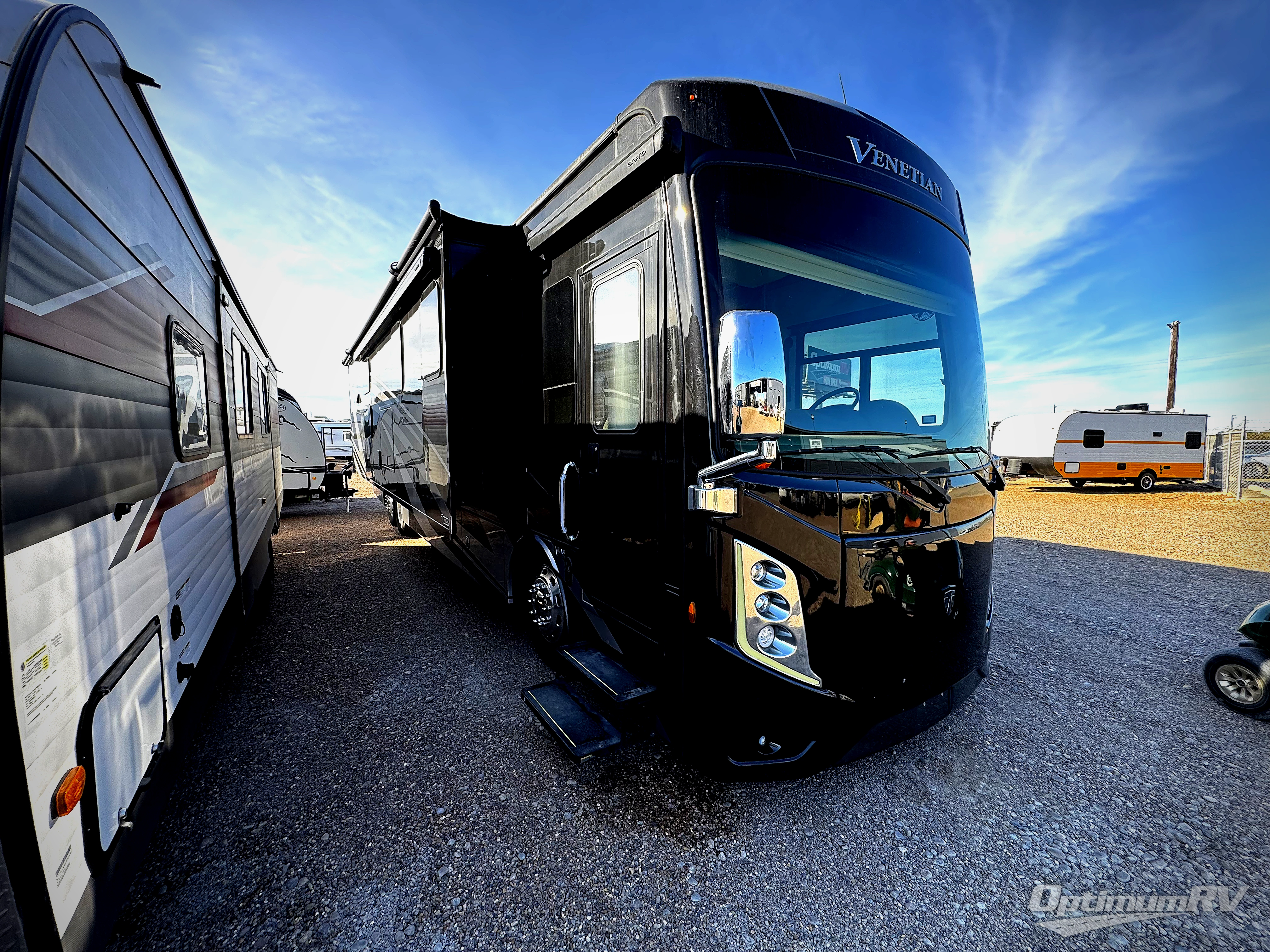Live in the lap of luxury with the Thor Motor Coach Venetian Class A diesel motorhome! Each unit has amazing electrical and plumbing features with the three low-profile ducted roof air conditioners, the Aqua-Hot® 250D3 hydronic furnace and water heating system, and the RapidCamp+™ multiplex wiring control system. There is also an Onan® RV QD 10,000 diesel generator on power slide, and a 100W solar charging system with a power controller. You will be so amazed to find a stackable washer/dryer on each model, and the central vacuum system with a toe-kick dustpan will keep the floor free of messes. The entertainment features are also on point with the LED HDTVs, the JBL® sound bar with Bluetooth® in the living area, the Winegard™ TRAV'LER HD satellite dish, and the Winegard® ConnecT 2.0 Wi-Fi/4G/TV antenna.