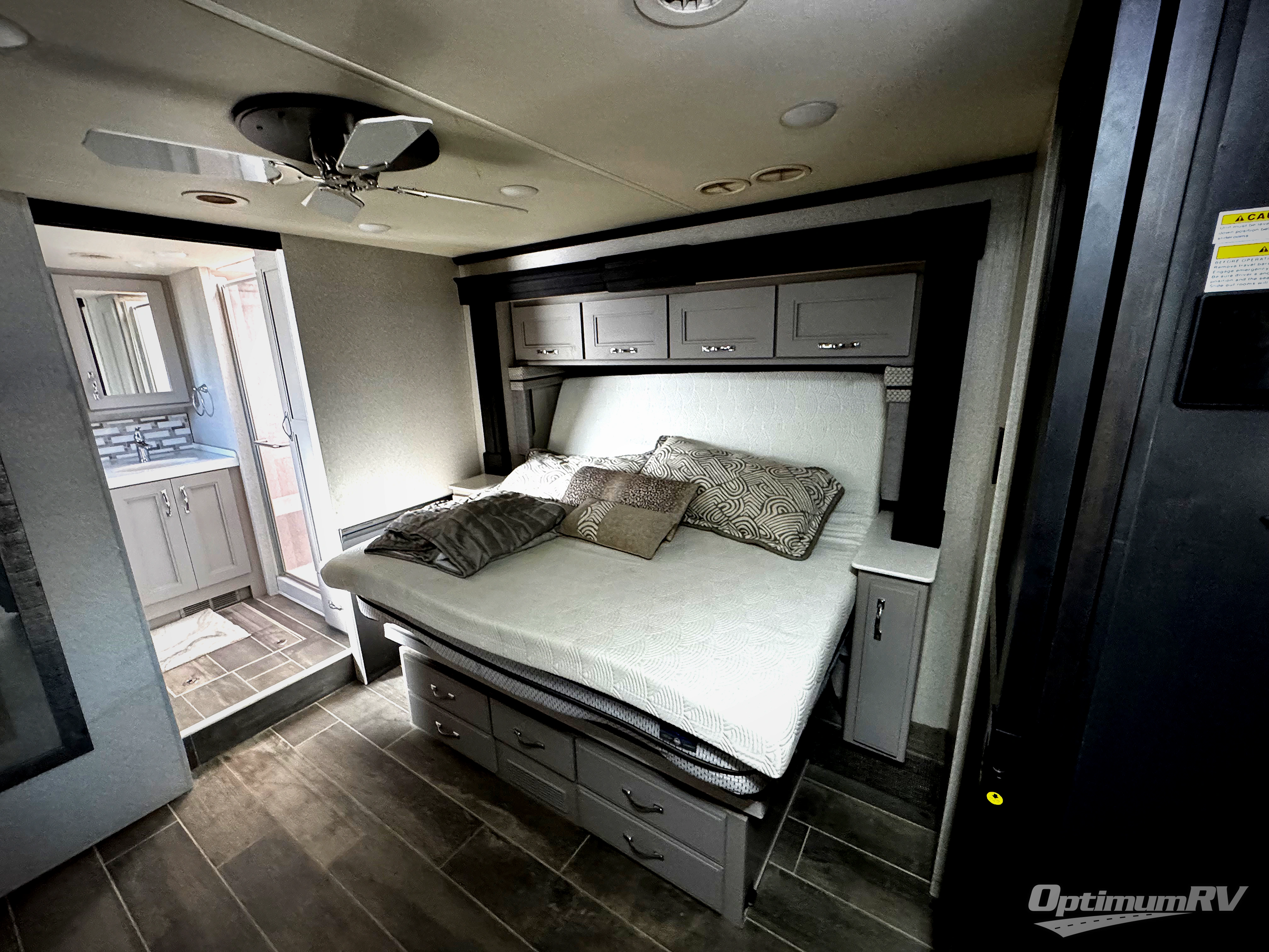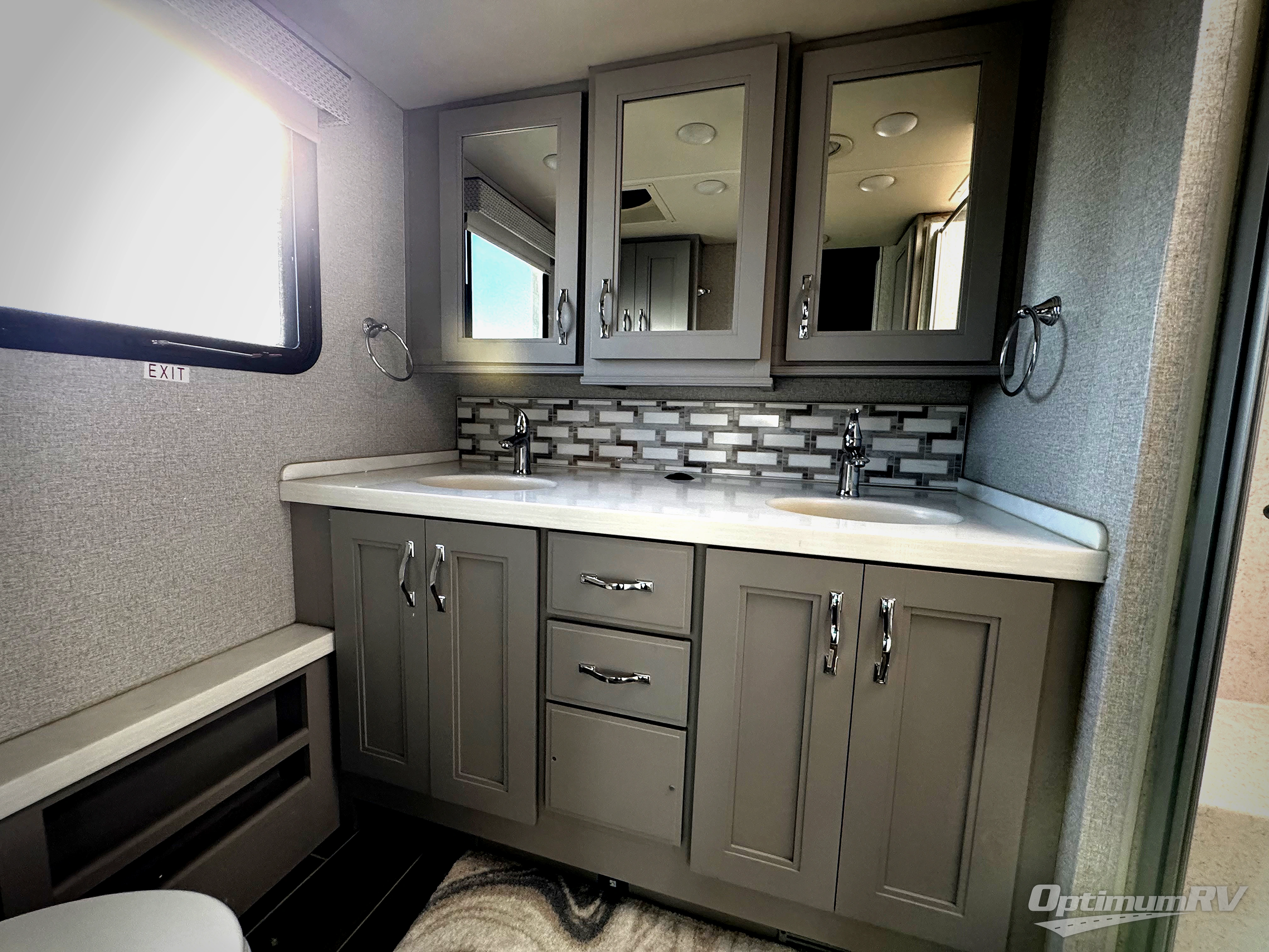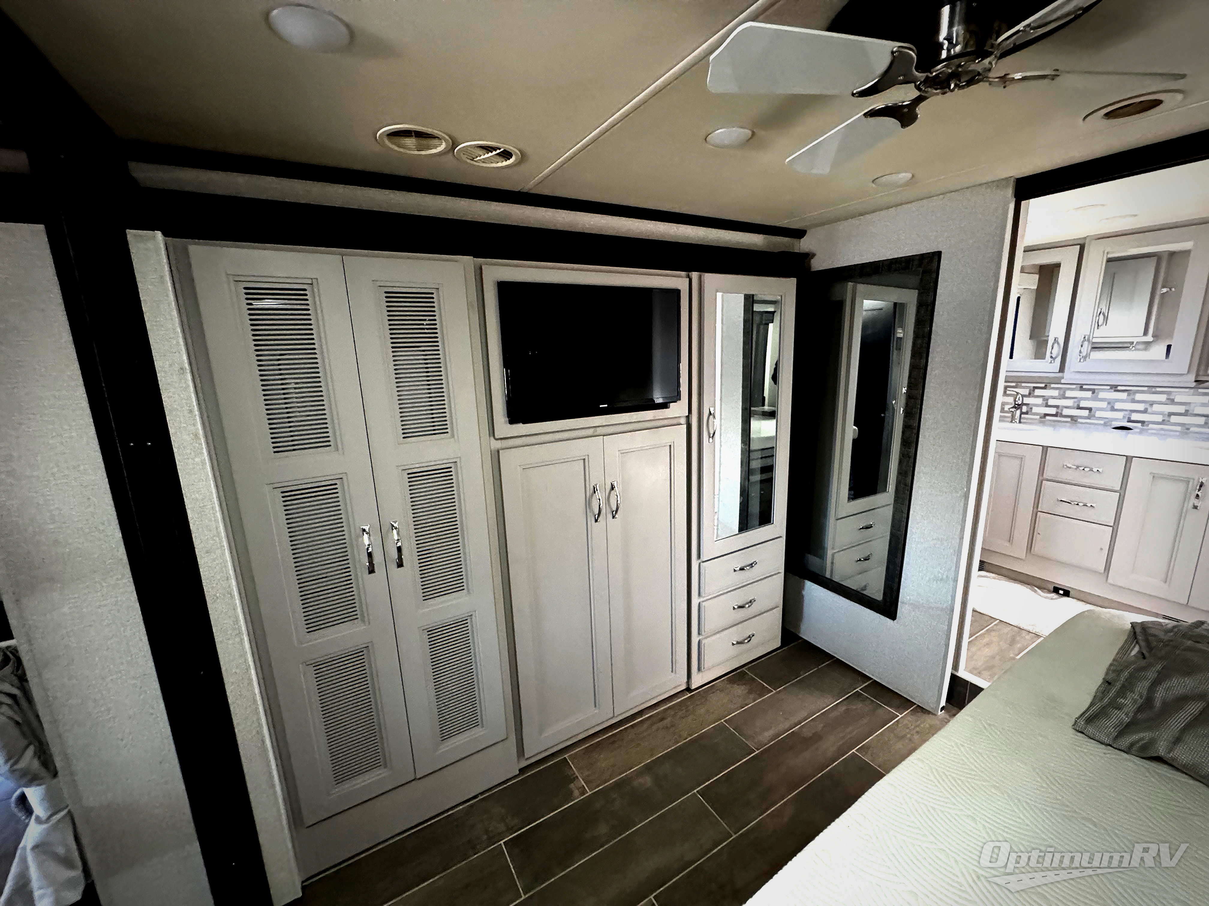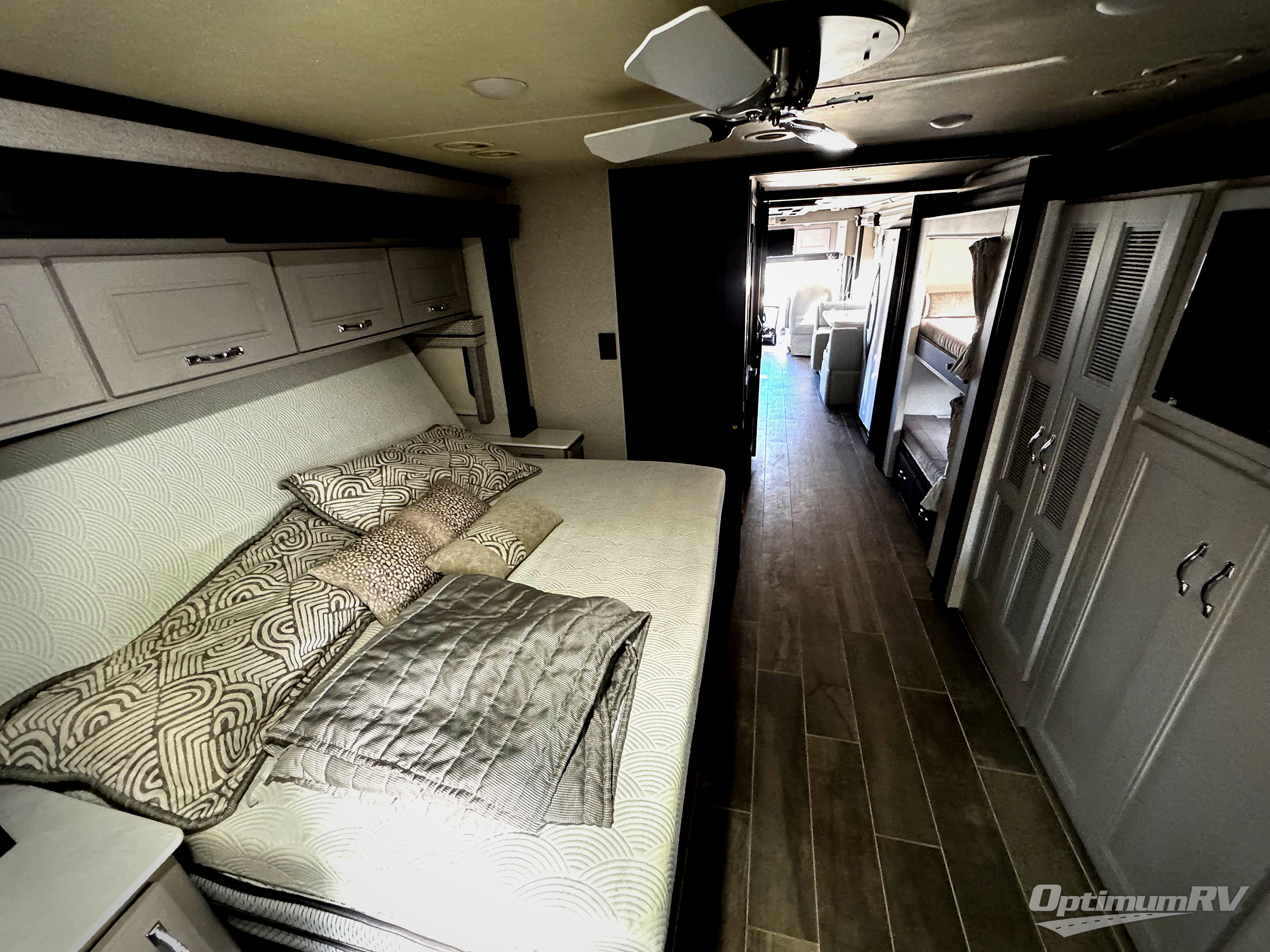 This Venetian Class A diesel motorhome has a high amount of luxury with two full bathrooms! One of those bathrooms is even included back in a master suite for you to enjoy, and this bathroom contains a dual-sink vanity to help you both get ready with ease. You'll have quite a lot of sleeping space too with the inclining king bed, 27" x 74" bunk beds, 80" sofa, 90" Dream Dinette, and 48" x 74" drop-down bunk above the cab. On top of that, you have the storage space and entertainment needed for all of those people with the two linen closets, a bedroom closet and dresser, two kitchen pantries, a residential refrigerator, and four LED HDTVs.