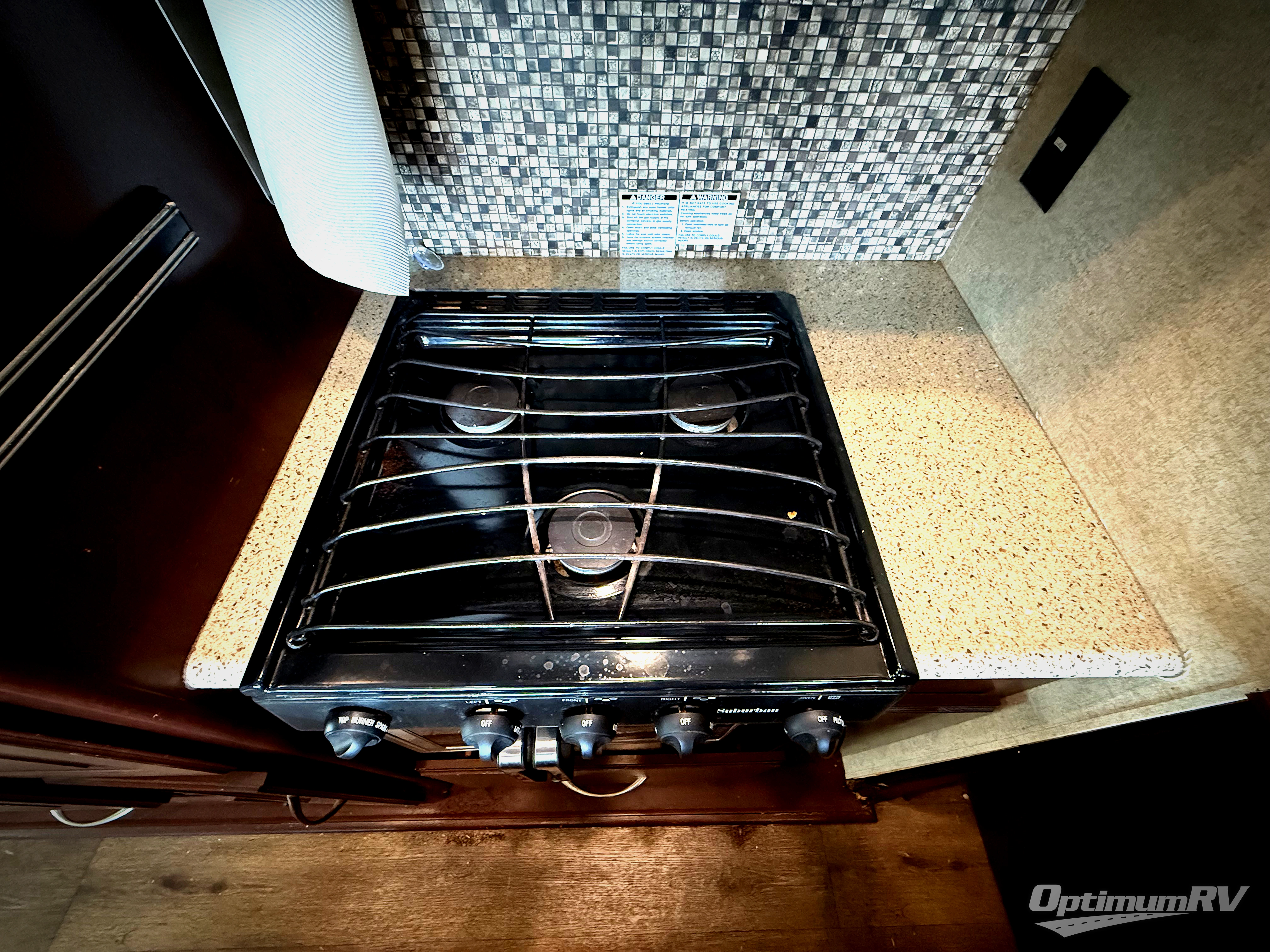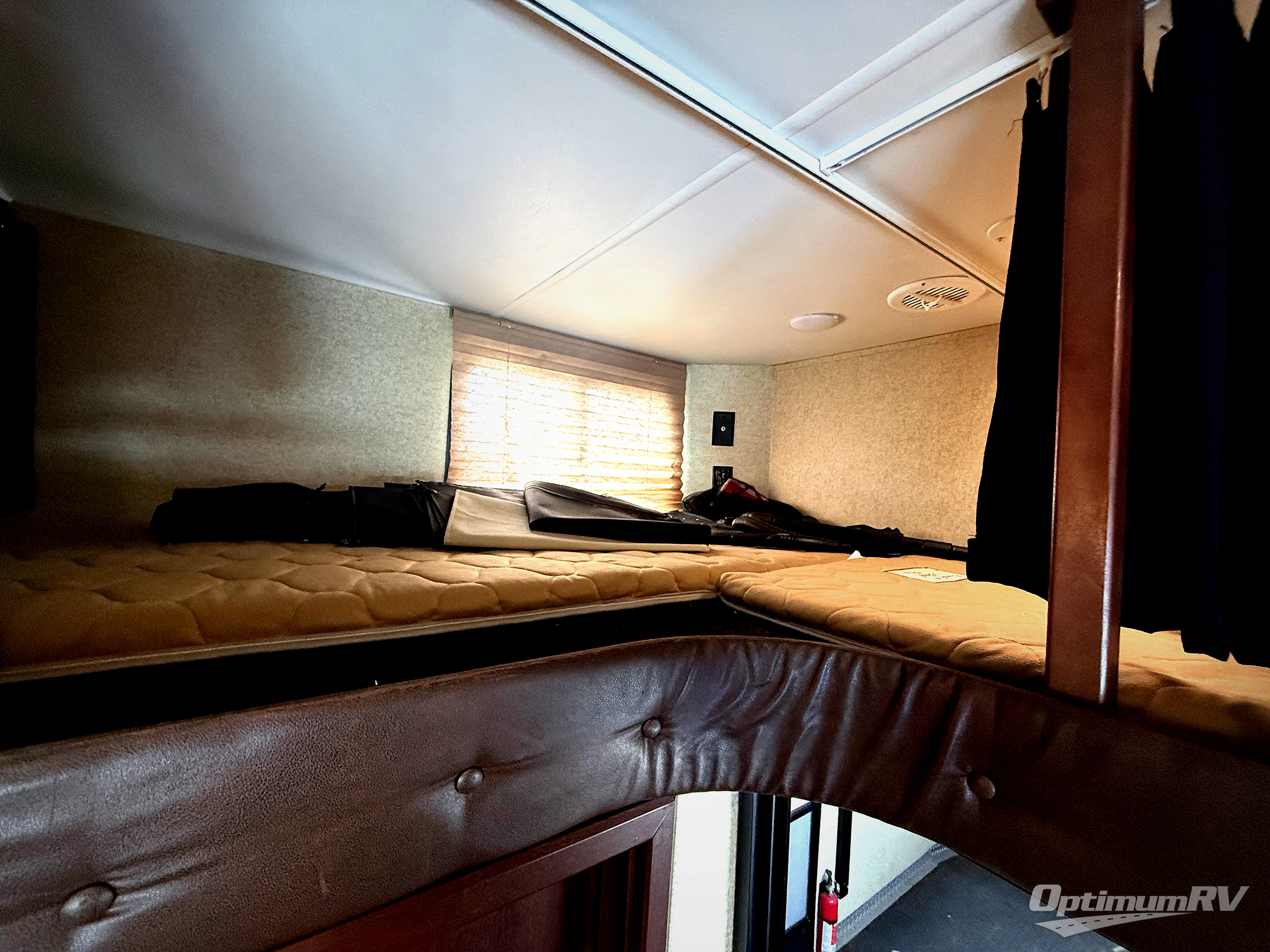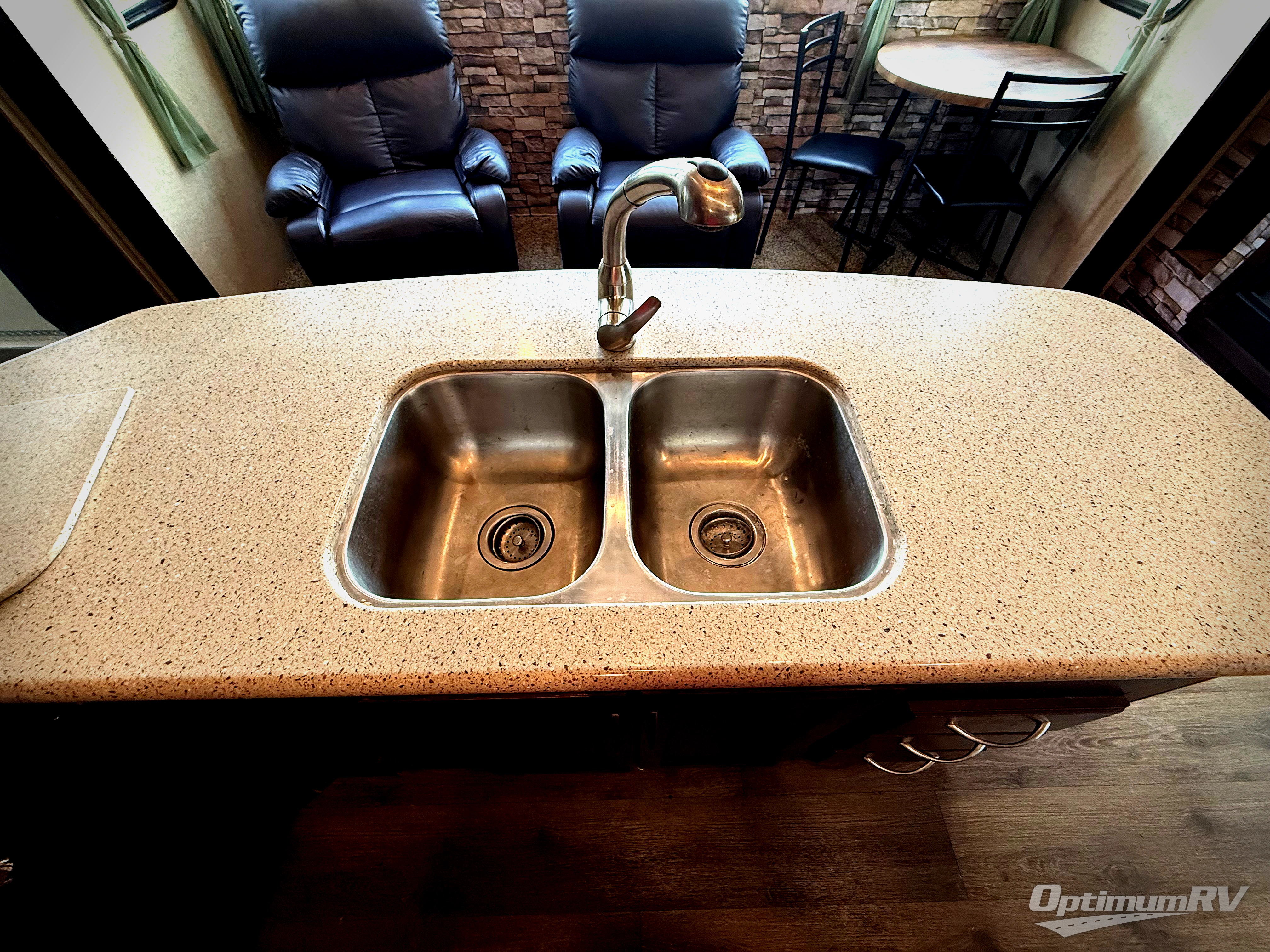 Step inside and enjoy the wide open feel with dual opposing slides in the main living area. There is a slide out to the left of the door featuring a refrigerator with storage on either side, plus a three burner range with microwave overhead. Another storage cabinet just off the slide before the counter peninsula with double kitchen sink. Above the counter at the wall find open corner shelving for display. Just around the corner there is a ladder that leads to the loft that overlooks the floor with sleeping for two.