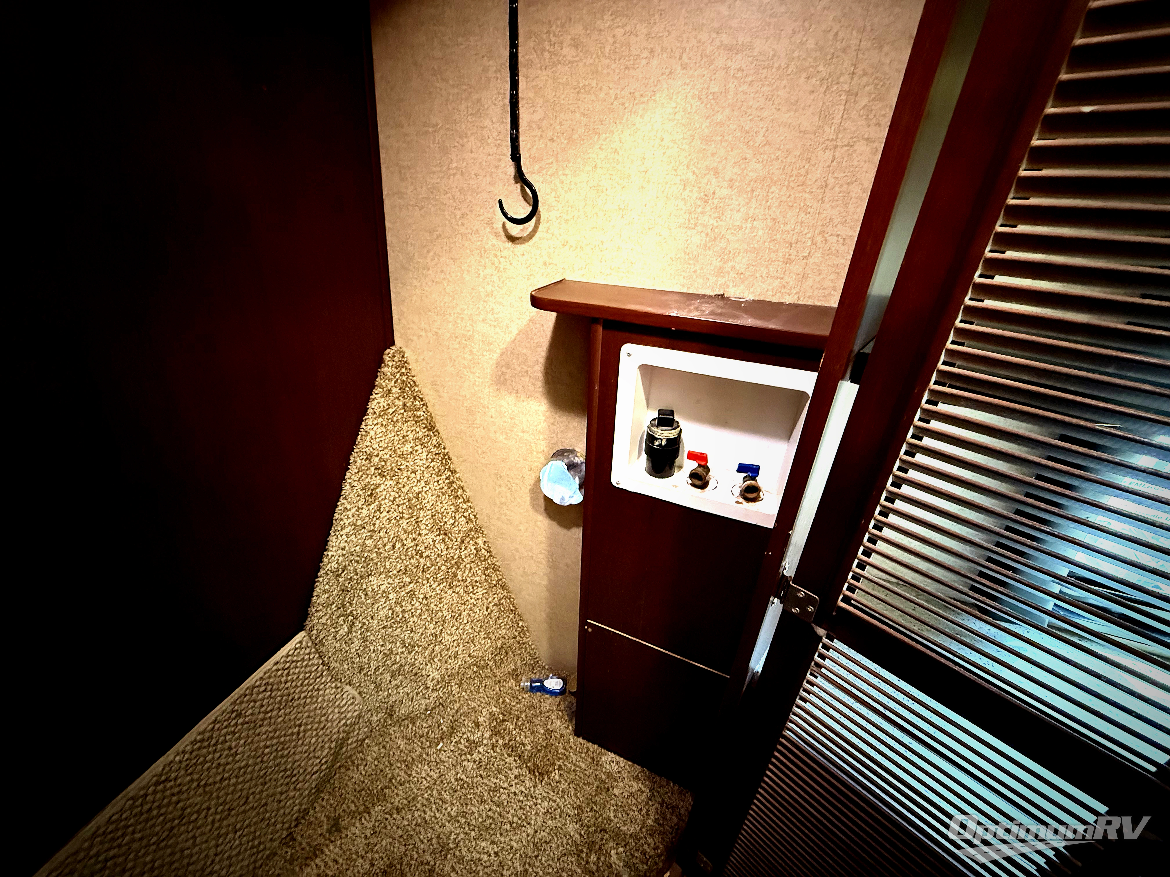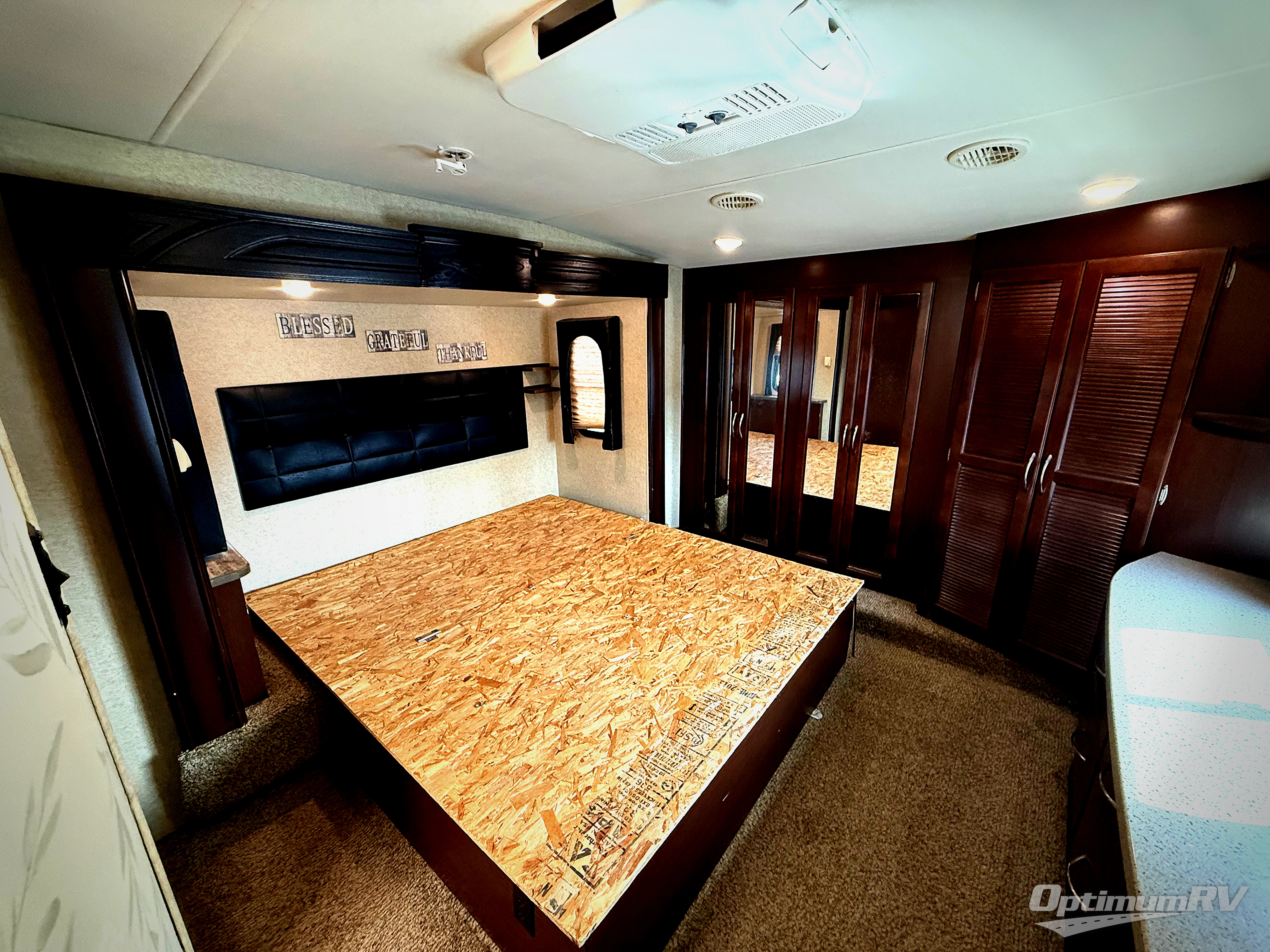 The master bedroom up front features a slide out king size bed with nightstand, a dresser along the opposite wall, and a wardrobe with sliding doors, plus a corner closet that has been prepped for a washer and dryer.