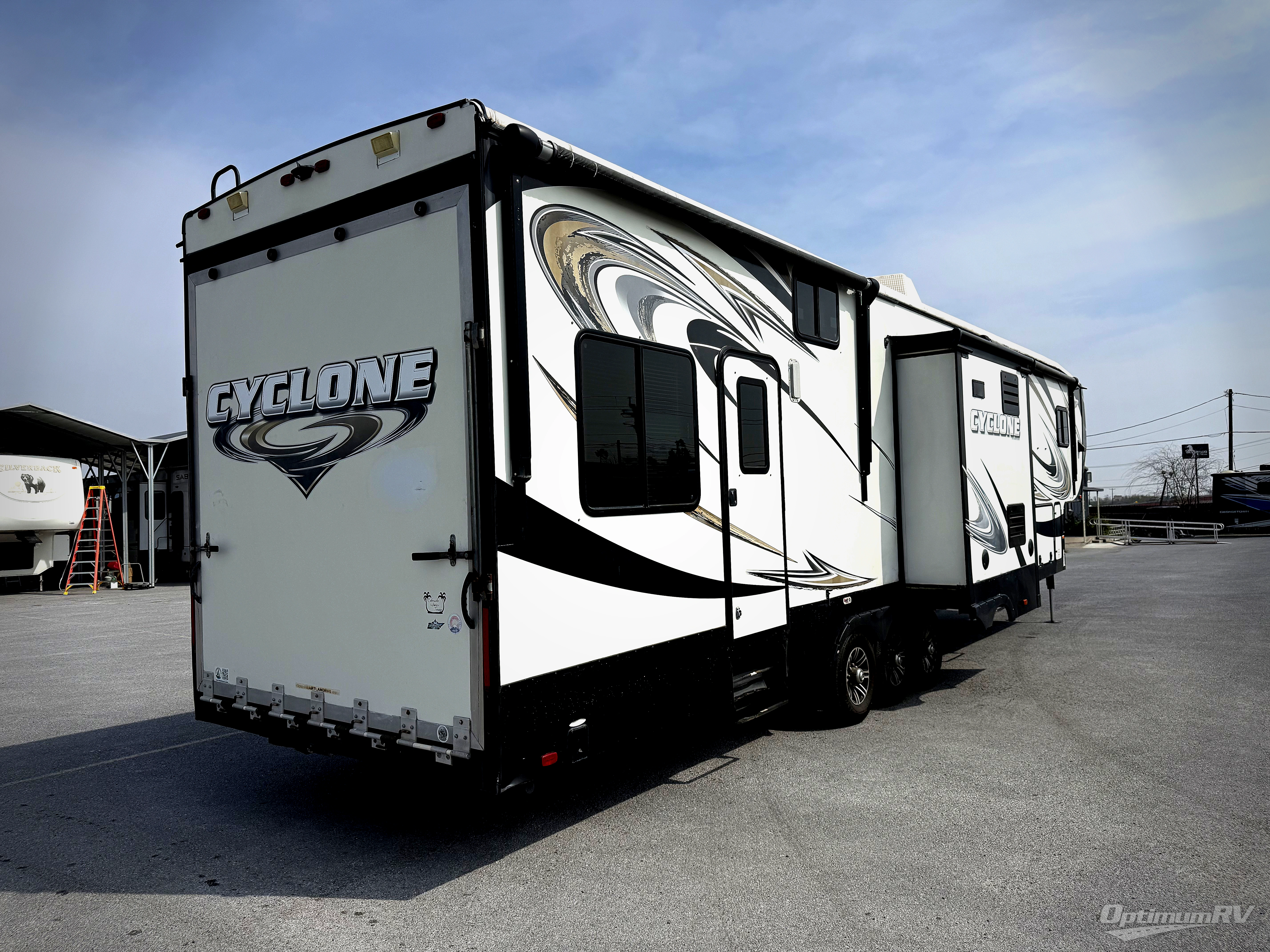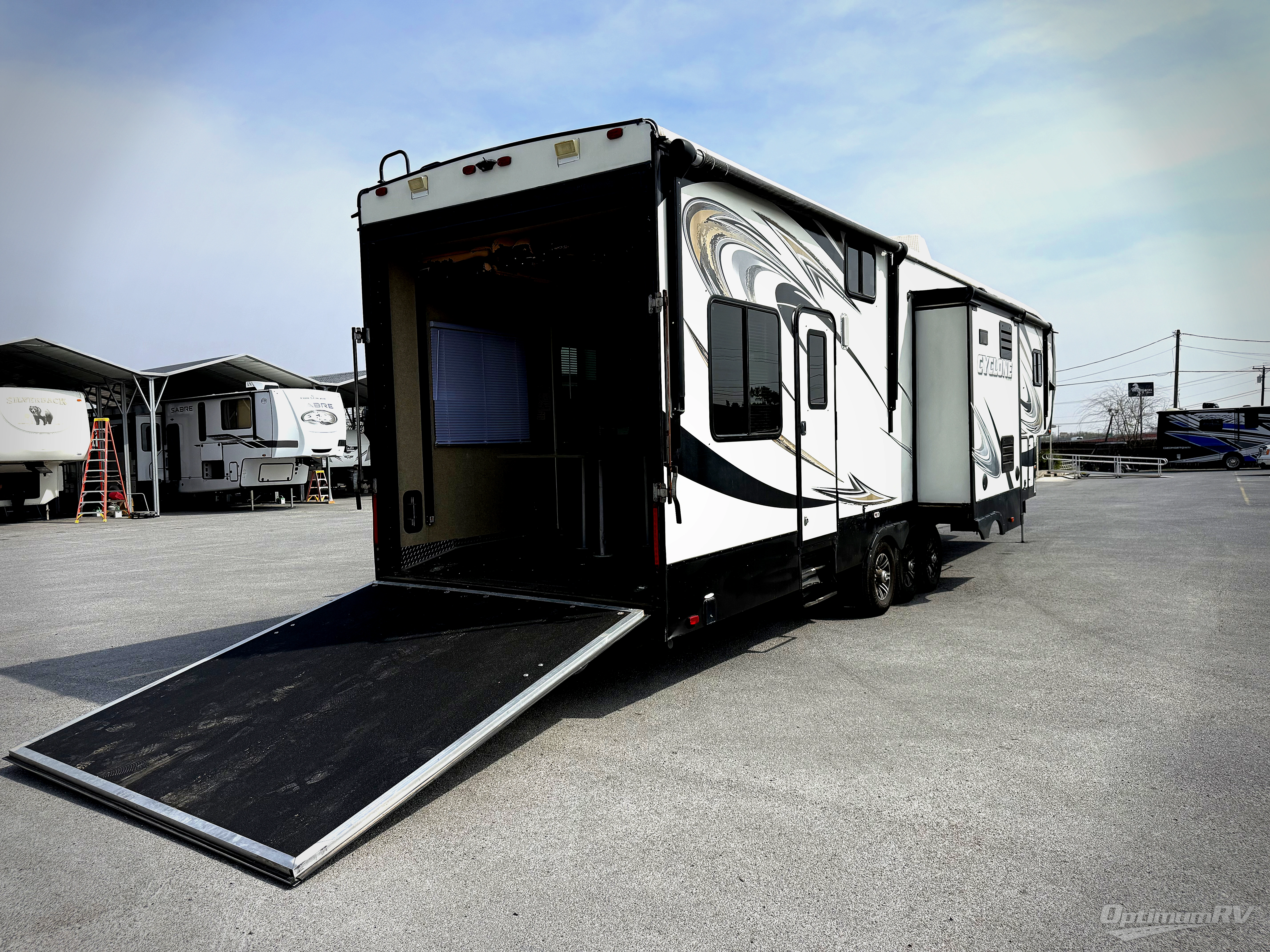 This Cyclone 4100 king fifth wheel toy hauler has 12' cargo garage for your toys, and a luxury suite for you when you are done playing and want to relax in comfort! This unit features triple slides for added space, a loft area the kids will love, one and a half baths, and a king bed in the master suite, plus more!