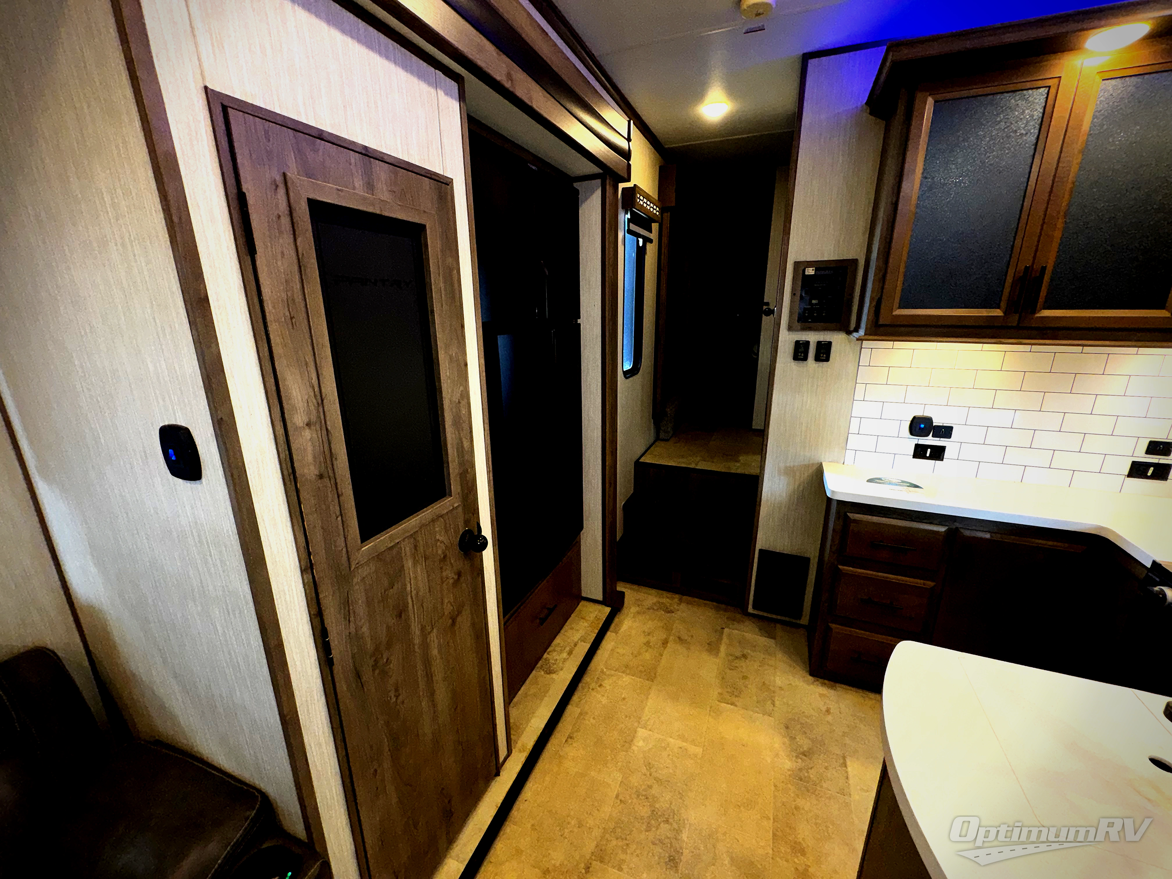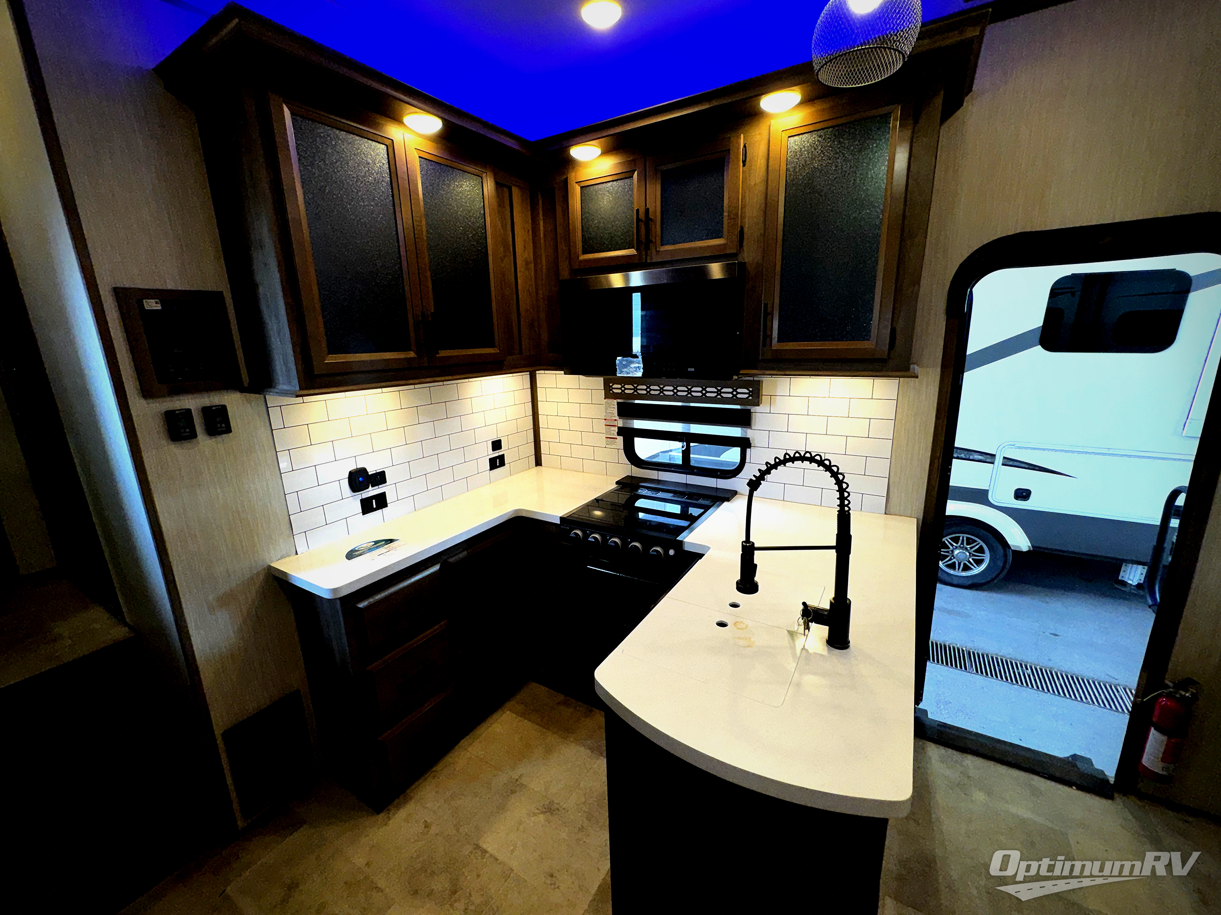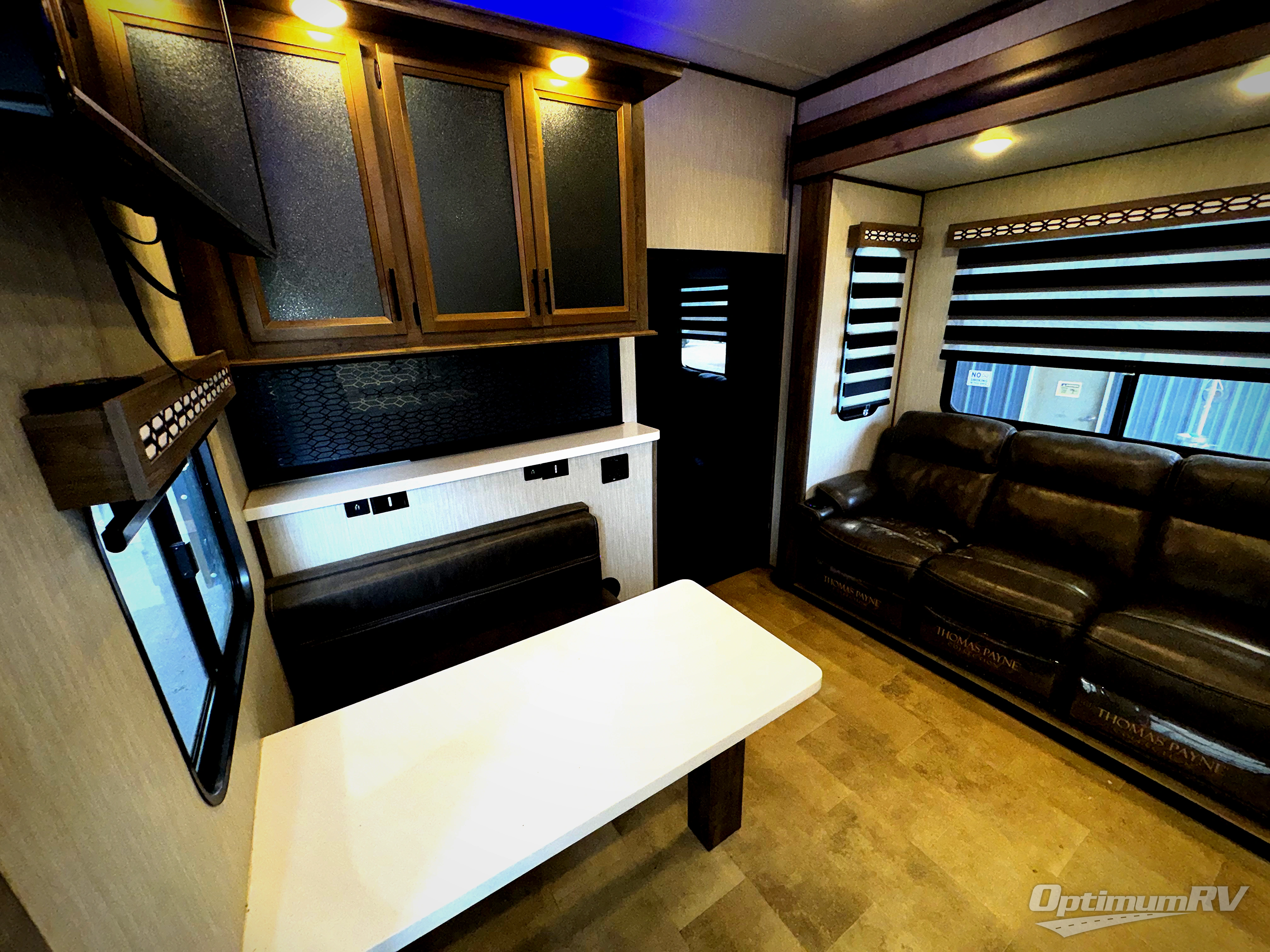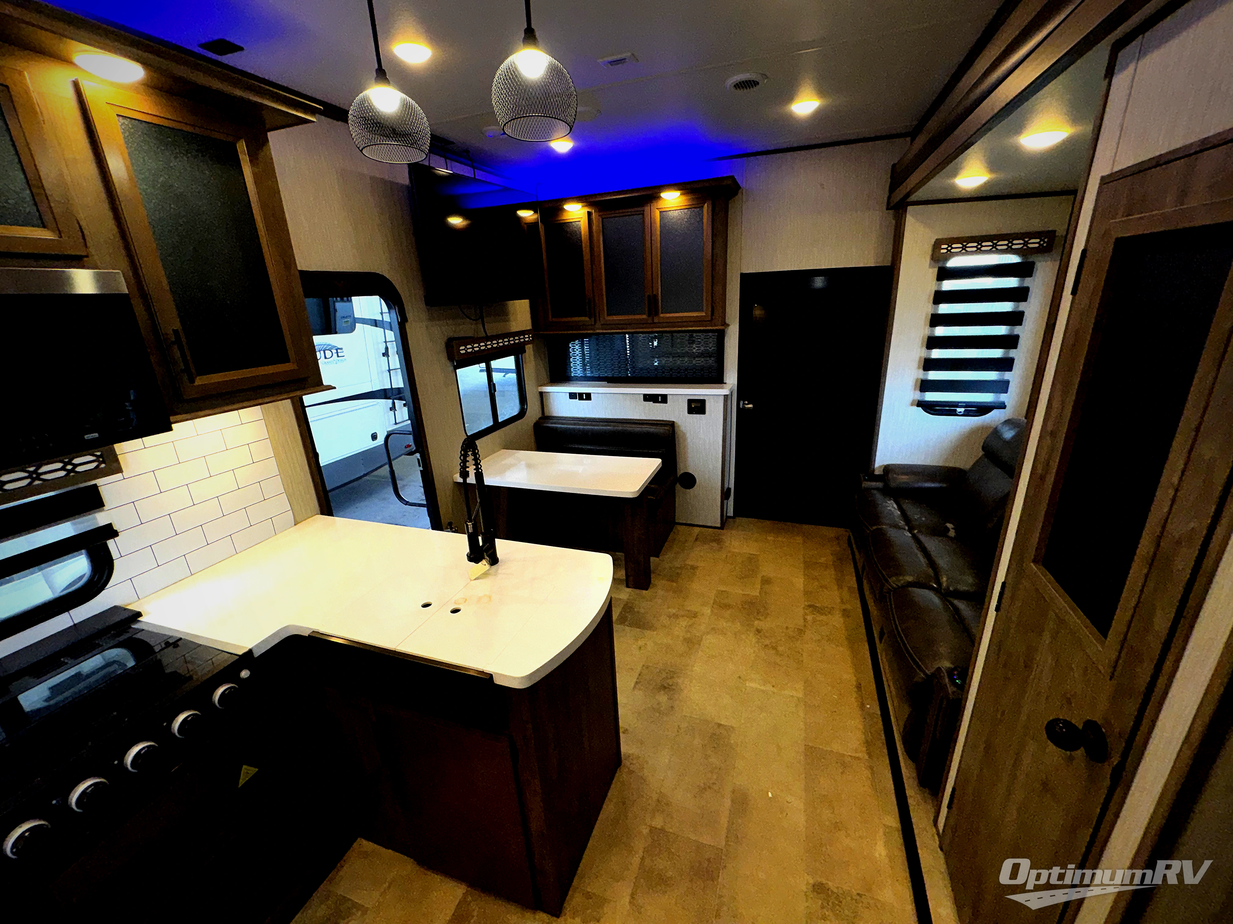 The whole gang can join in on the fun with this fifth wheel toy hauler! Everyone will have a comfortable place to sleep between the king bed in the front private bedroom, the raised queen bed above the flip-up sofas with table in between, and the loft, plus you can even use the sofa in the living area. The large kitchen pantry is big enough to hold your favorite snacks and the dinette with bench is another place to enjoy your meals comfortably. A few other conveniences you will appreciate include dual entry doors, a dual entry bathroom, two 15' power awnings, and 14' 6" of cargo space!