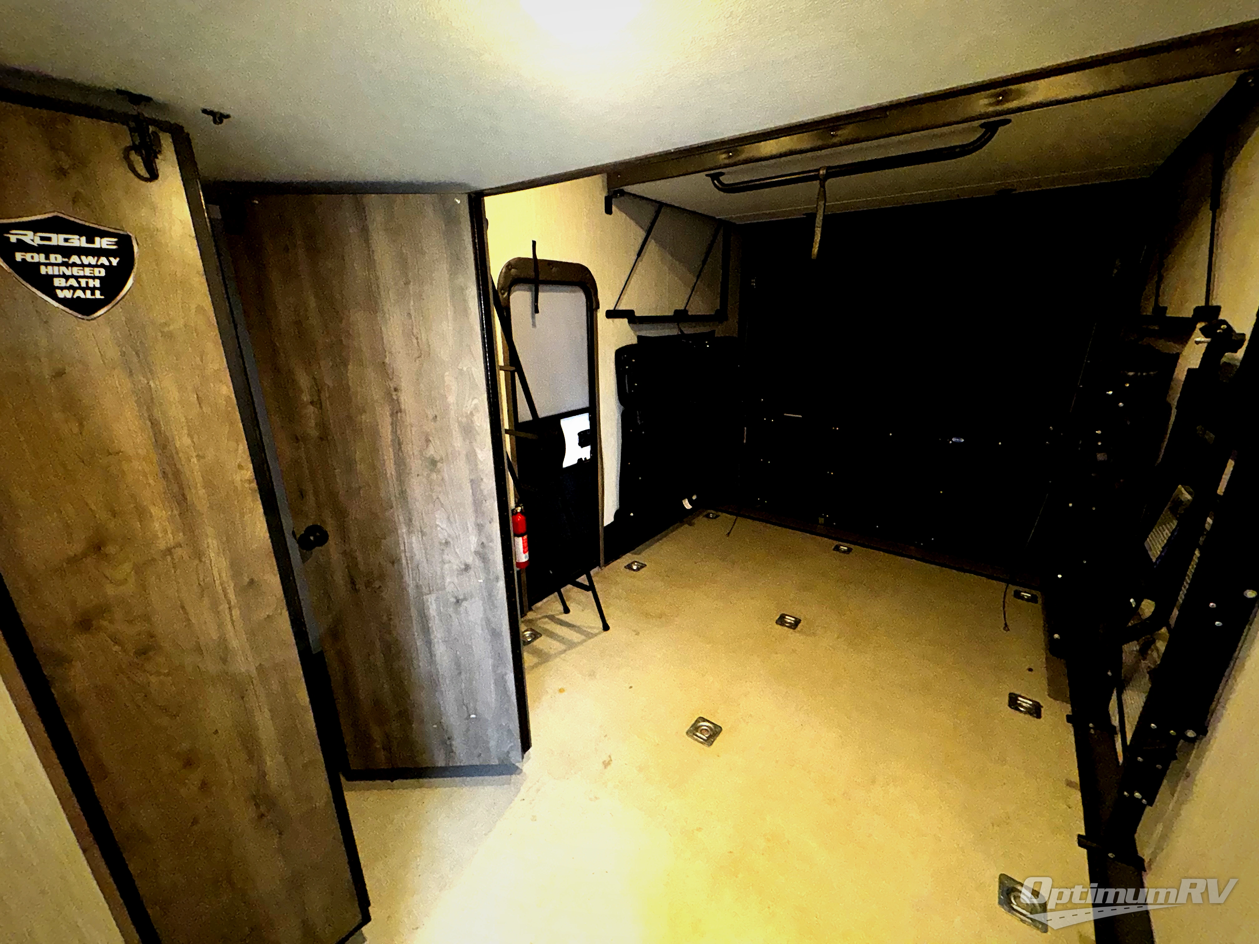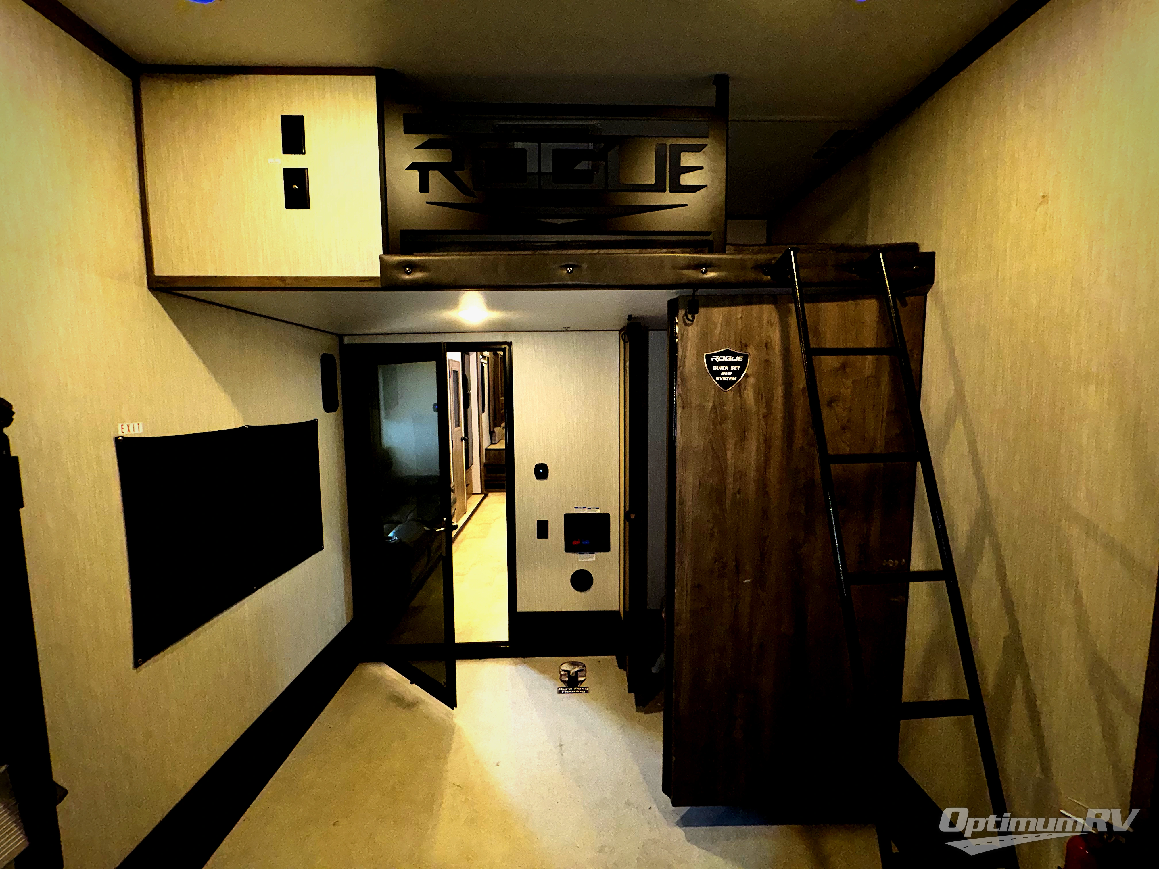 Every one of these Forest River Vengeance Rogue Armored fifth wheel toy haulers come with the features you want most at an affordable price tag! The DUR-A-POXY cargo floor has 5,000 lb. tie downs to ensure your toys will arrive safely without damaging the flooring, plus the 8' ramp door makes it easy to load them. A 15,000 BTU air conditioner will keep you cool even on the hottest summer days. An enclosed and heated underbelly keeps your unit's vitals protected and a central docking station makes life a little easier. The Rogue Armored package comes with a six point leveling system, a comfort plus adjustable powered king bed system, and a ramp door patio system. You can be sure to find one that fits your needs!