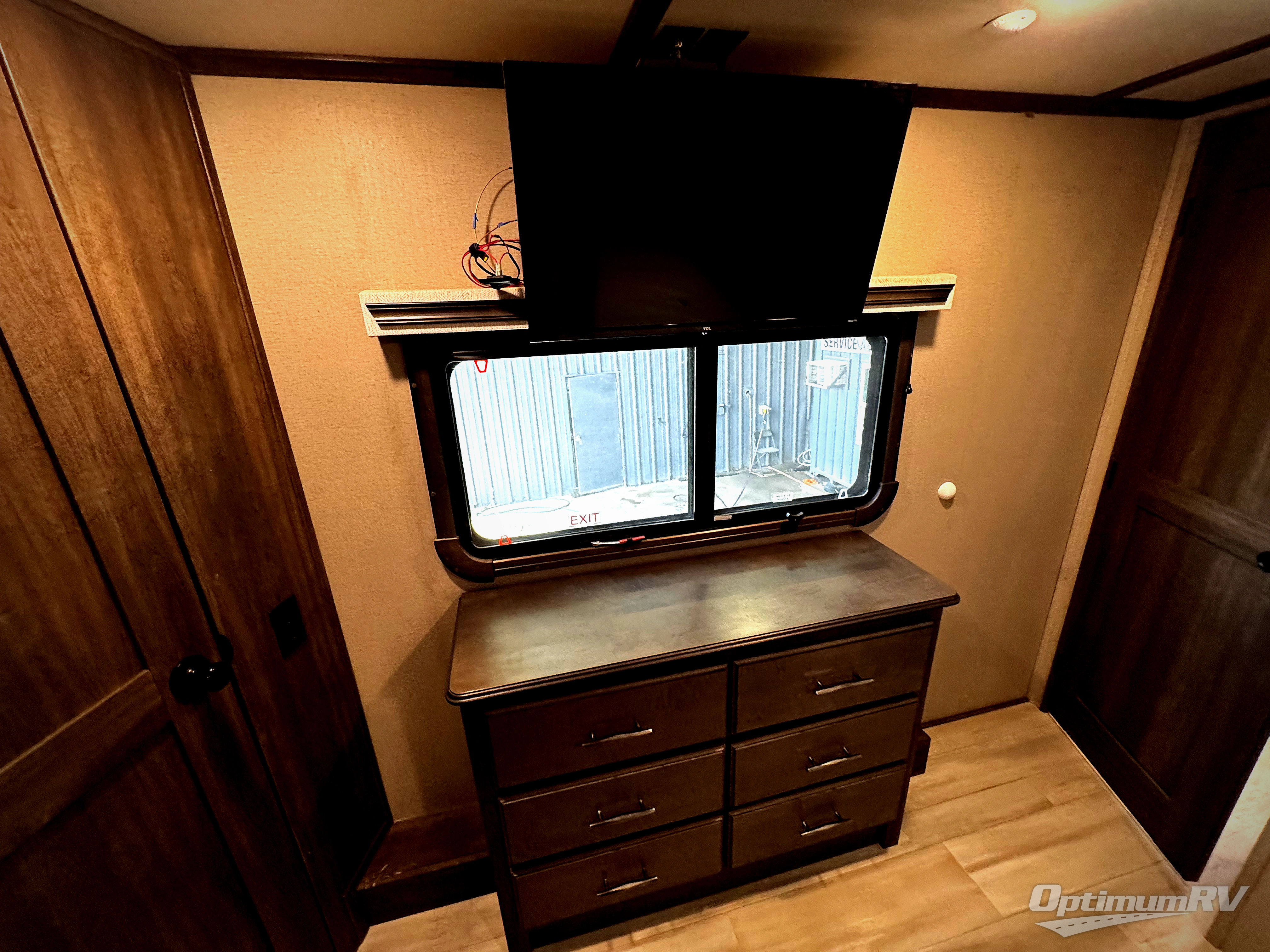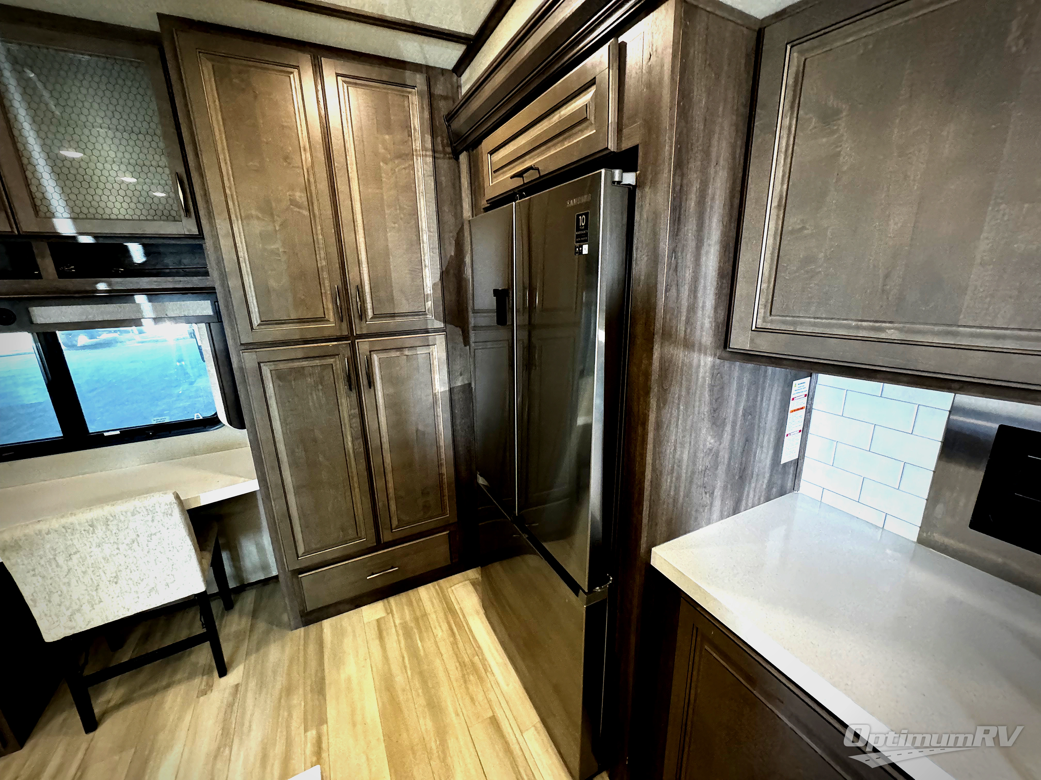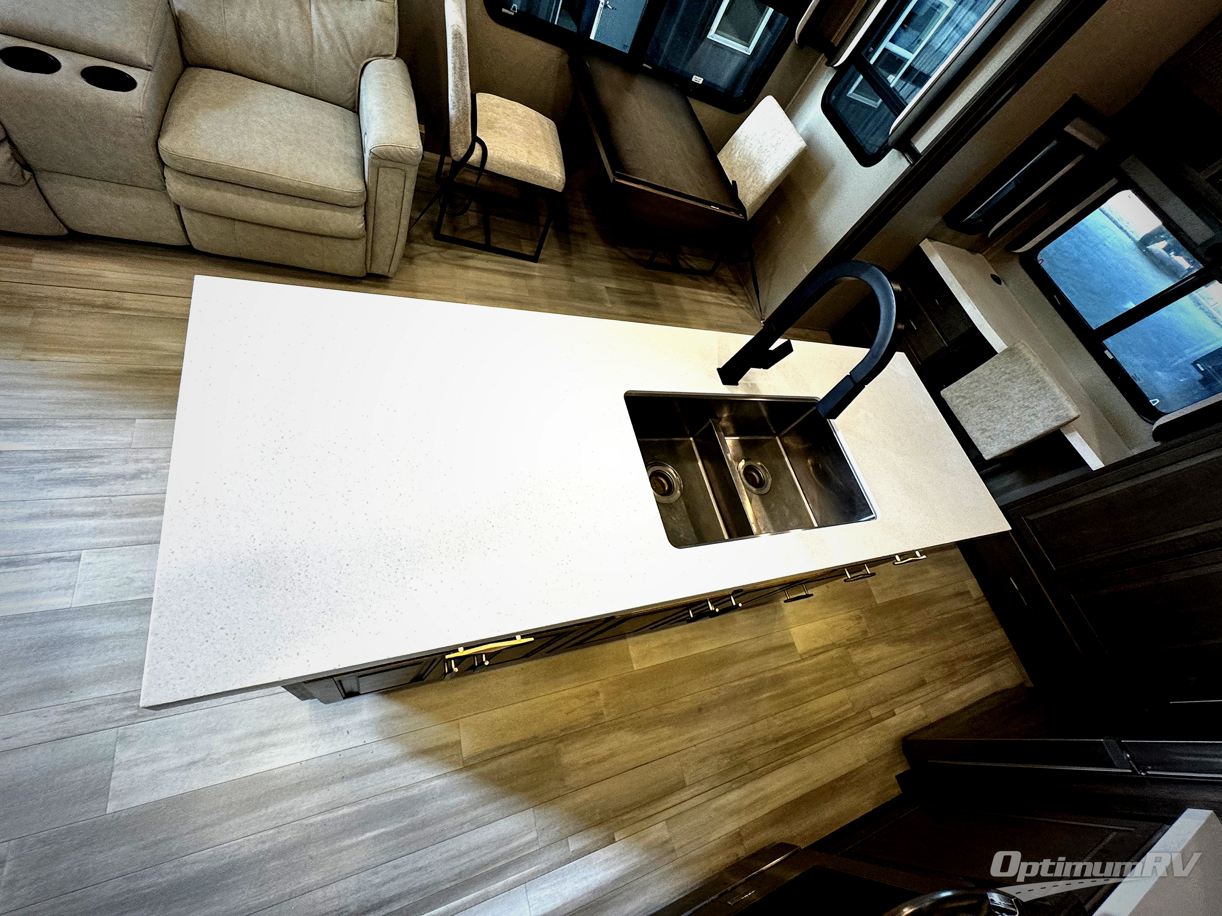 Love for traveling is just enhanced when you are towing this fifth wheel. From the smooth tow to the comfortable and functional interior, you will feel right at home. You can even work at the rear desk with USB charging outlet and overhead cabinets or at the free-standing dinette with chairs while away, and relax on the theatre seats and tri-fold sofa. The TV and fireplace add conveniences and comfort, and the kitchen is impressive with the 24" residential oven, the island with a space for a dishwasher option, and the oversized pantry. And you might like to add the exterior pull-out kitchen option for more choices when making meals. Be sure to place your shoes under the interior steps before heading to the full bathroom to get cleaned up and/or the front bedroom with a queen bed slide, more USB charging outlets for your electronics, a pull-out ottoman for convenience when getting ready, and a large wardrobe with mirrors plus a closet prepped for a washer/dryer option. You will also find a flip-top dresser with an LED TV.
