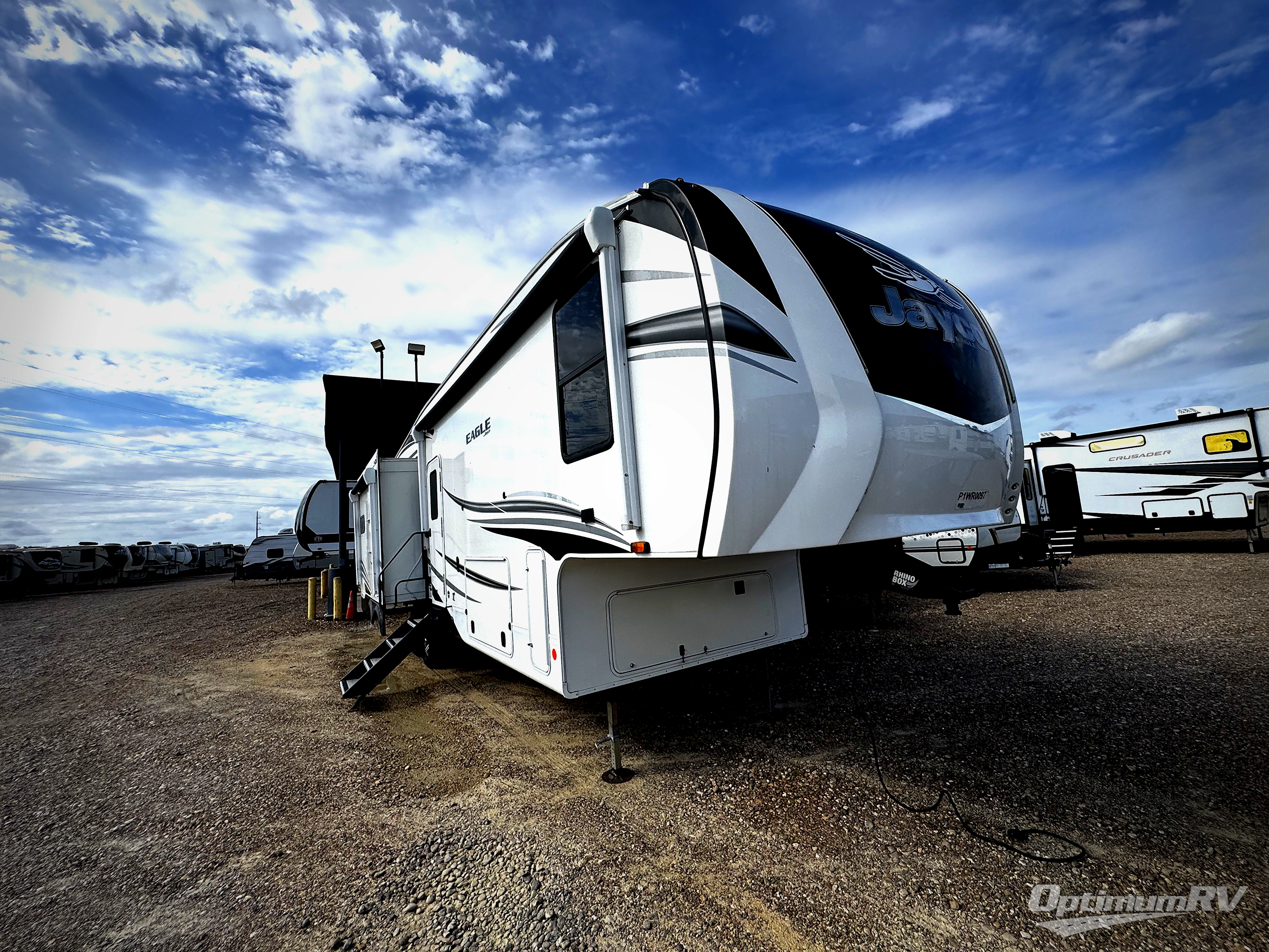 With any Eagle fifth wheel or travel trailer by Jayco you will appreciate durable construction materials, like the Magnum Truss Roof and the Stronghold VBL laminated walls. The JAYCOMMAND Smart RV system puts you in control of your RV's functions, and the 4 Star Handling Package will provide smooth towing from home to camp. Each model features Climate Shield zero-degree tested weather protection and the industry-exclusive HELIX cooling system that features two 15,000 BTU Whisper Quiet A/C's to keep you comfortable year around. Some of the exterior conveniences you are sure to love are the fully enclosed, LED-lit universal docking station, the pass-through storage with Slam-Latch baggage doors, and the painted fiberglass front cap with built-in specialty LED lighting. The Eagle fifth wheels and travel trailers are designed to make you feel at home with solid hardwood slide fascia, residential vinyl flooring, bathroom tile backsplash, and plenty of storage for all your belongings.