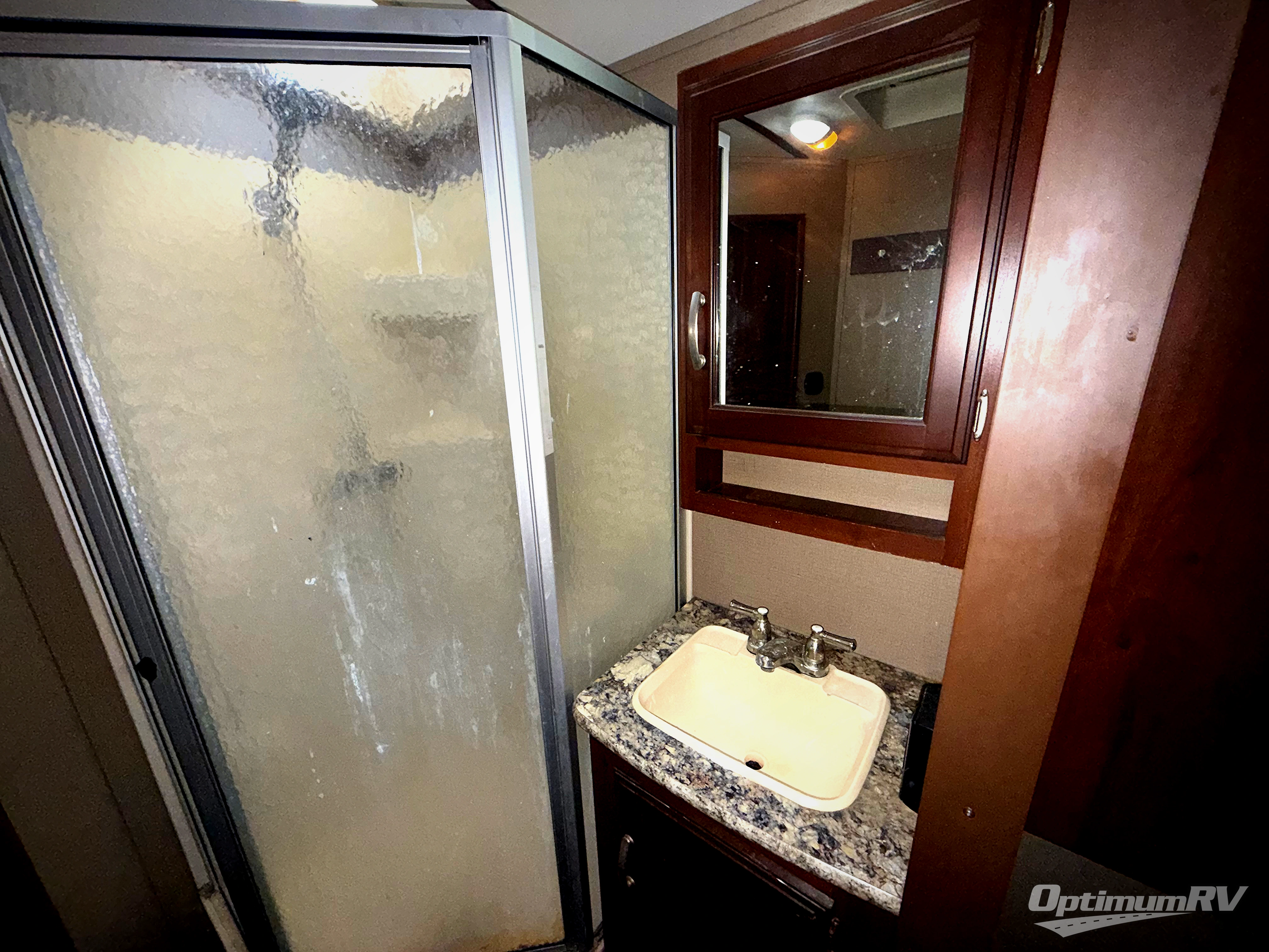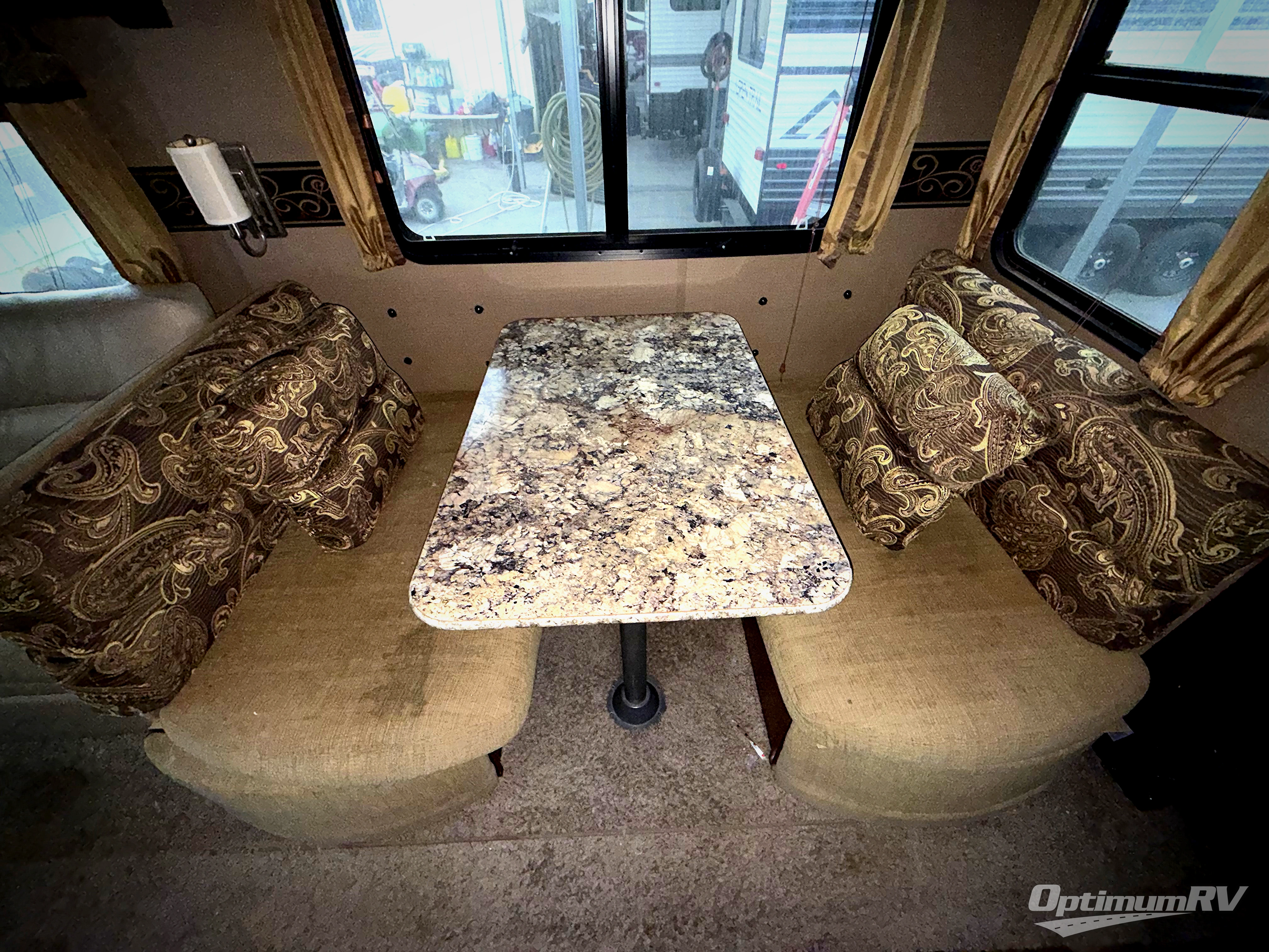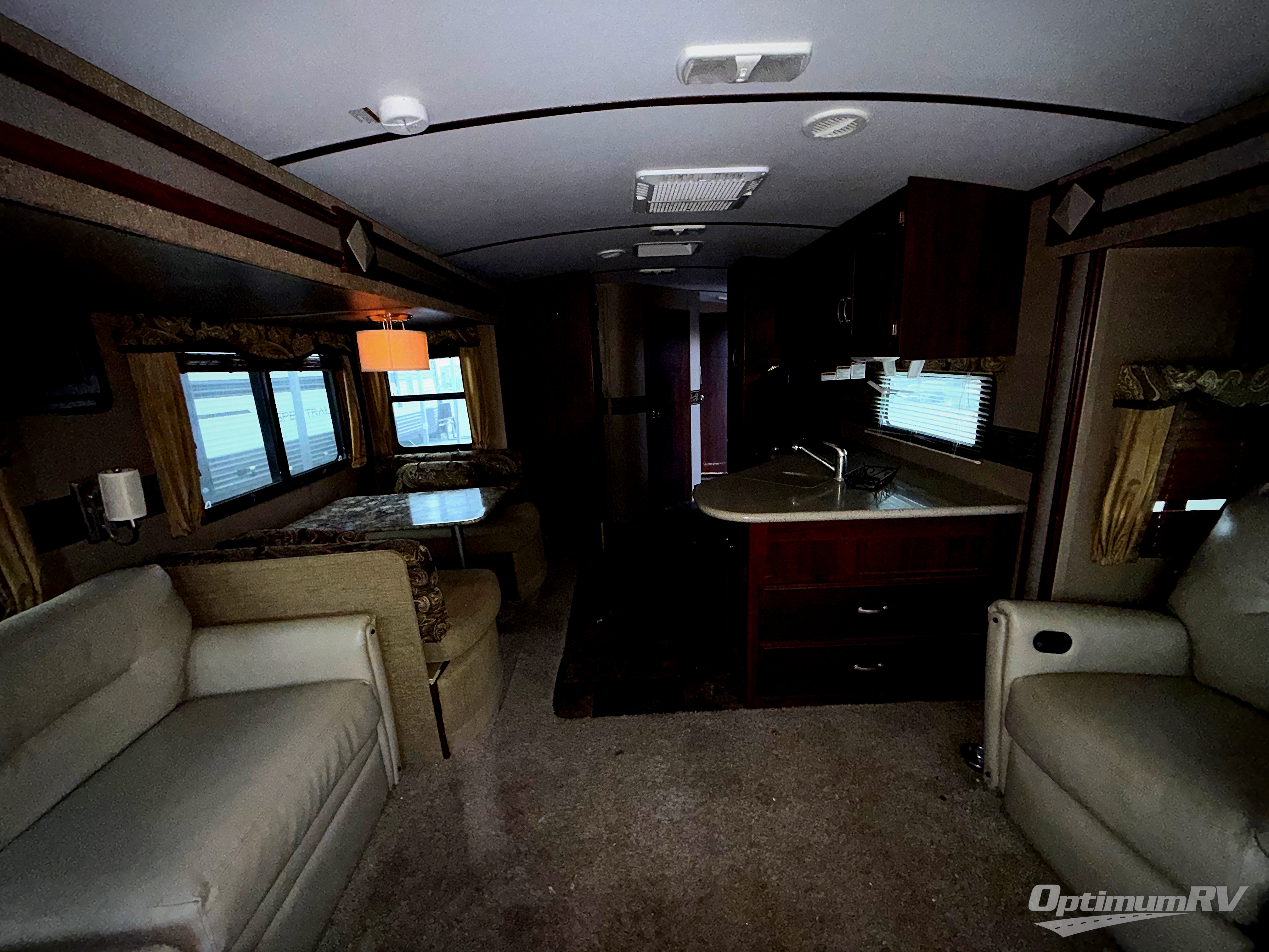 As you make your way to the open living area notice the rear wall entertainment center with overhead cabinets, and pop-up LCD TV. There are also storage cabinets below for your things. You can easily enjoy conversations or television watching from the two lounge chairs in the slide to the left looking back, or from the sofa sleeper with overhead cabinets in the slide on the right which also includes a nice booth dinette for dining.