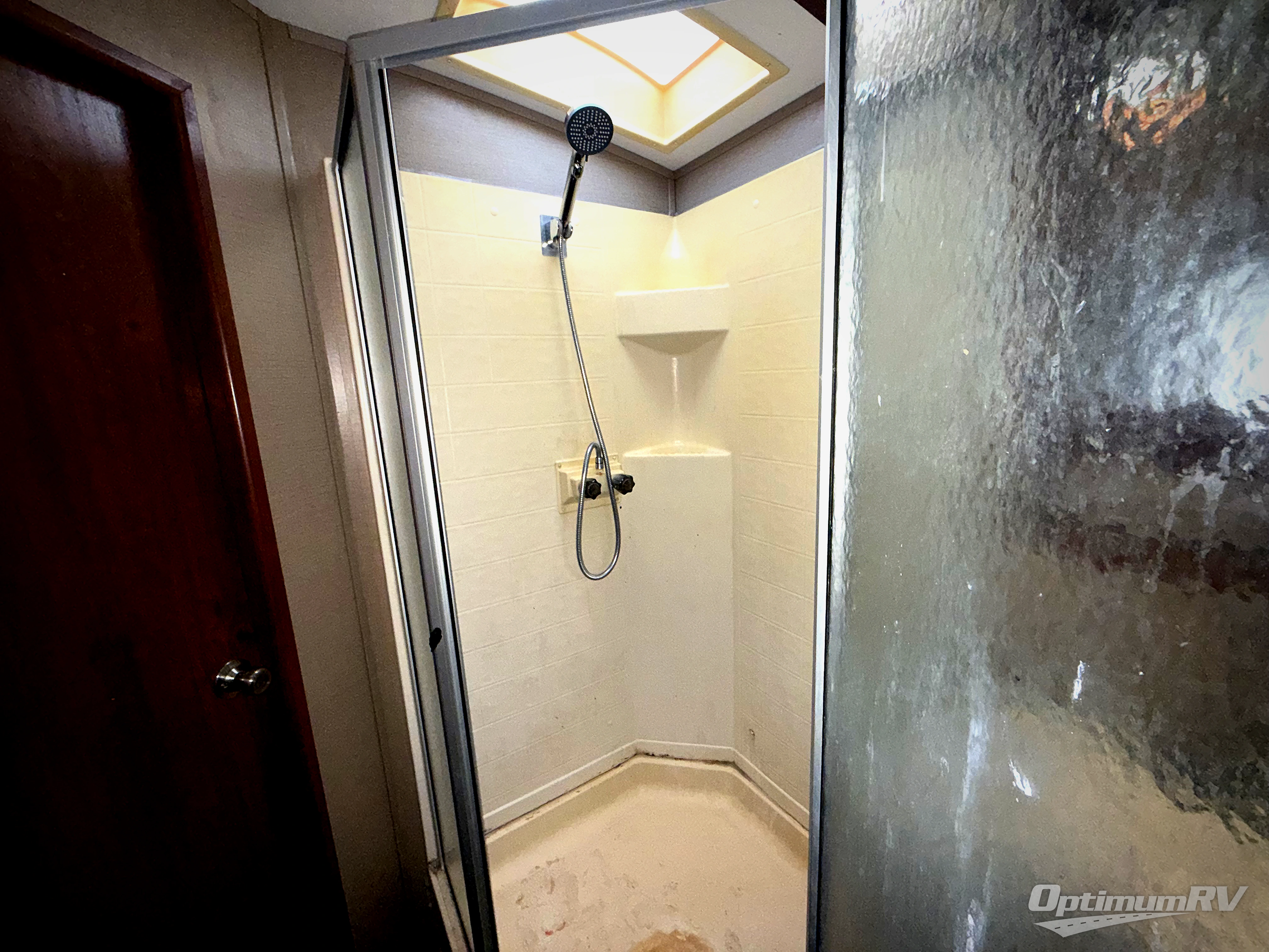 Enter the center side door with the bath conveniently located across the hall. The bath features an angled shower, toilet and sink. There is a second sliding door that takes you right into the front master bedroom which can also be accessed from the hall to the right of the main entry door.