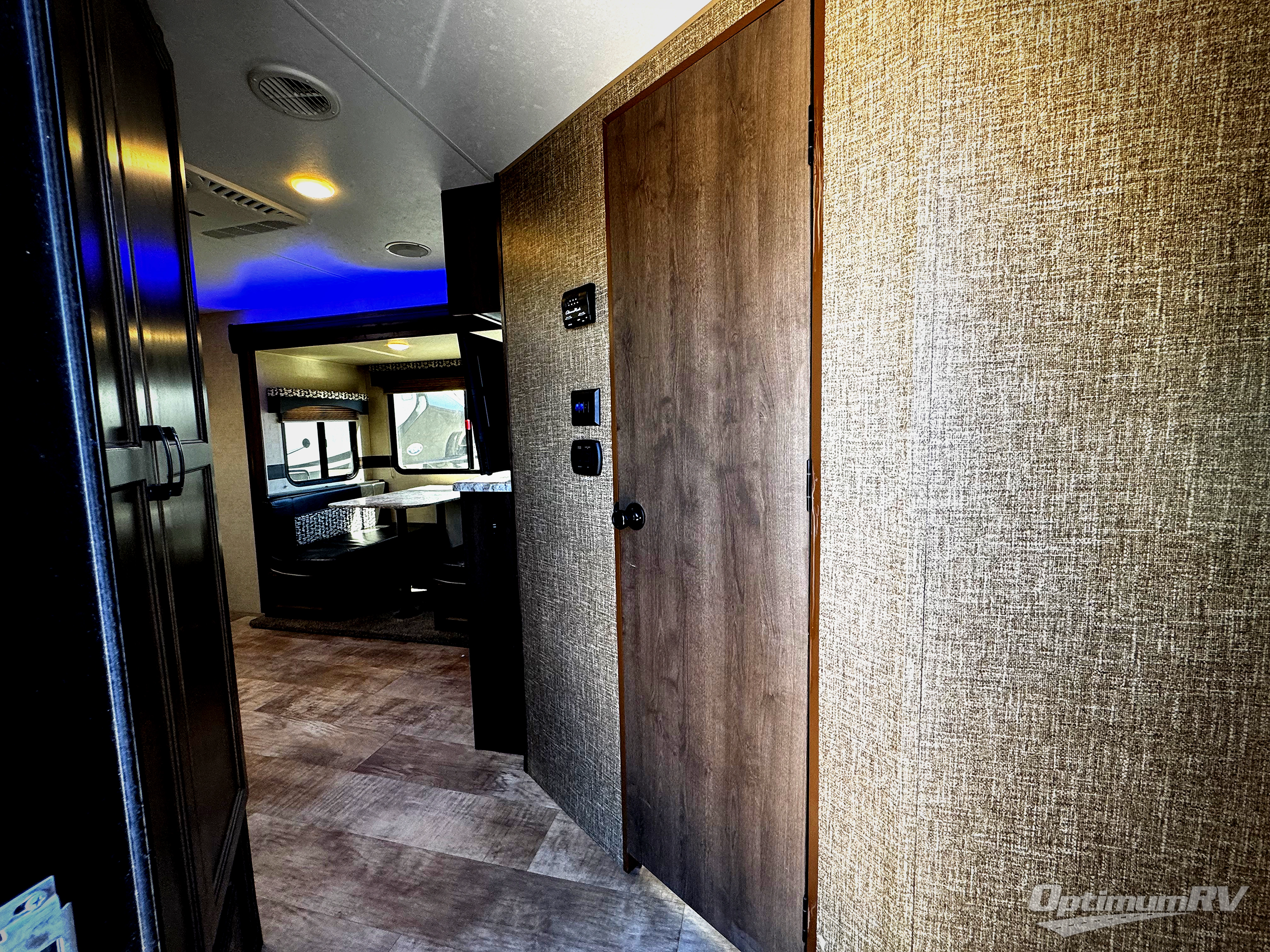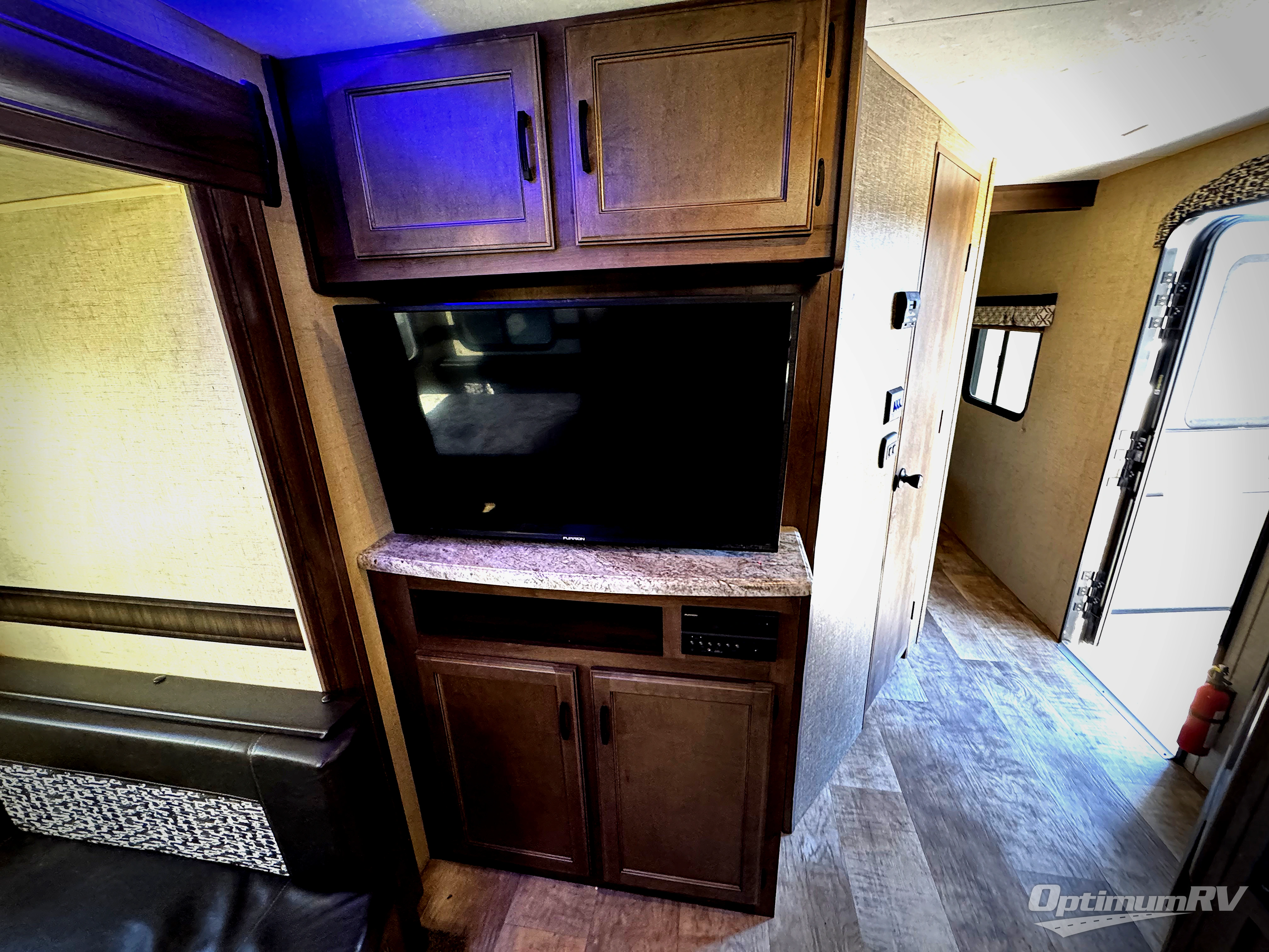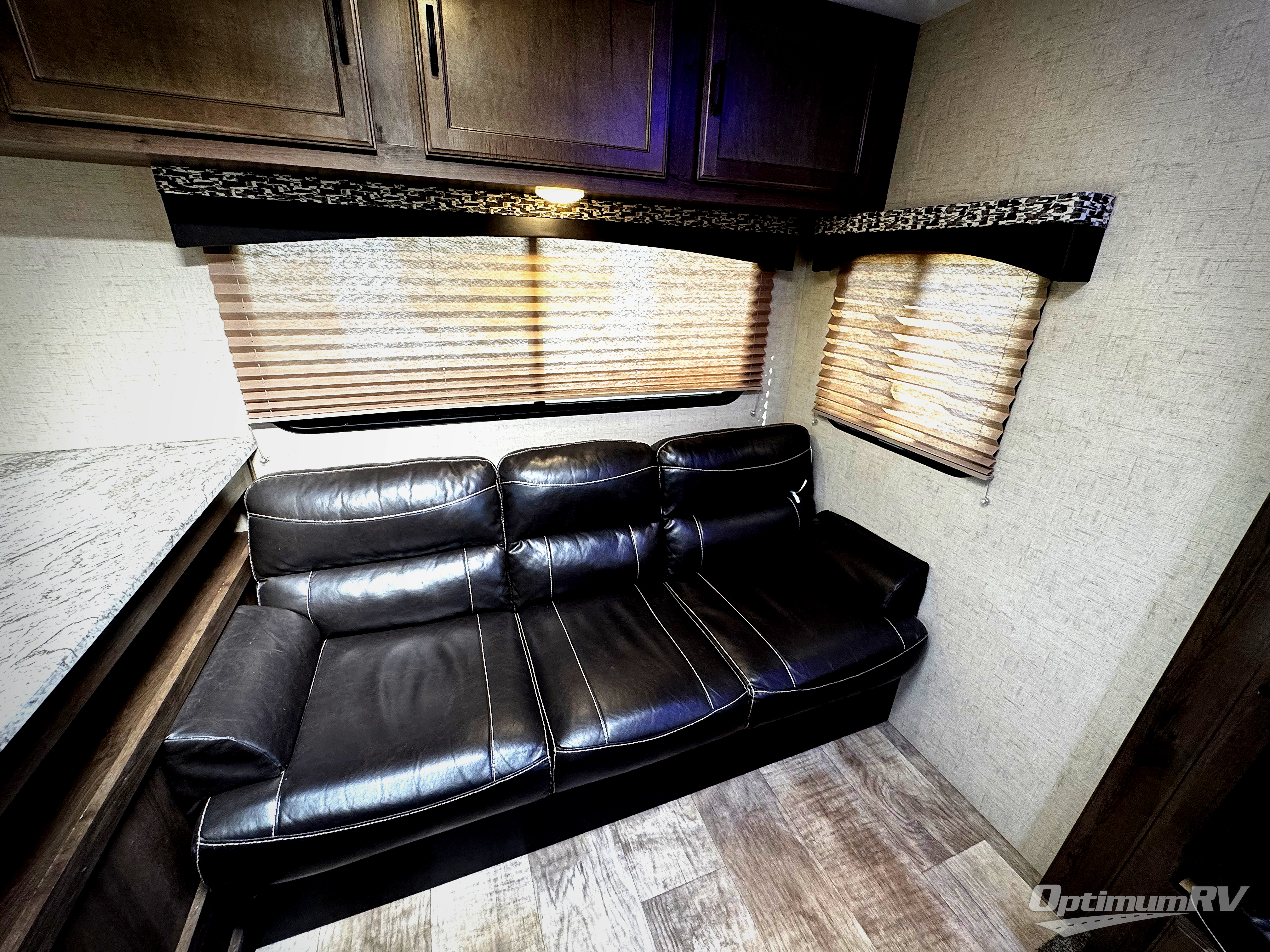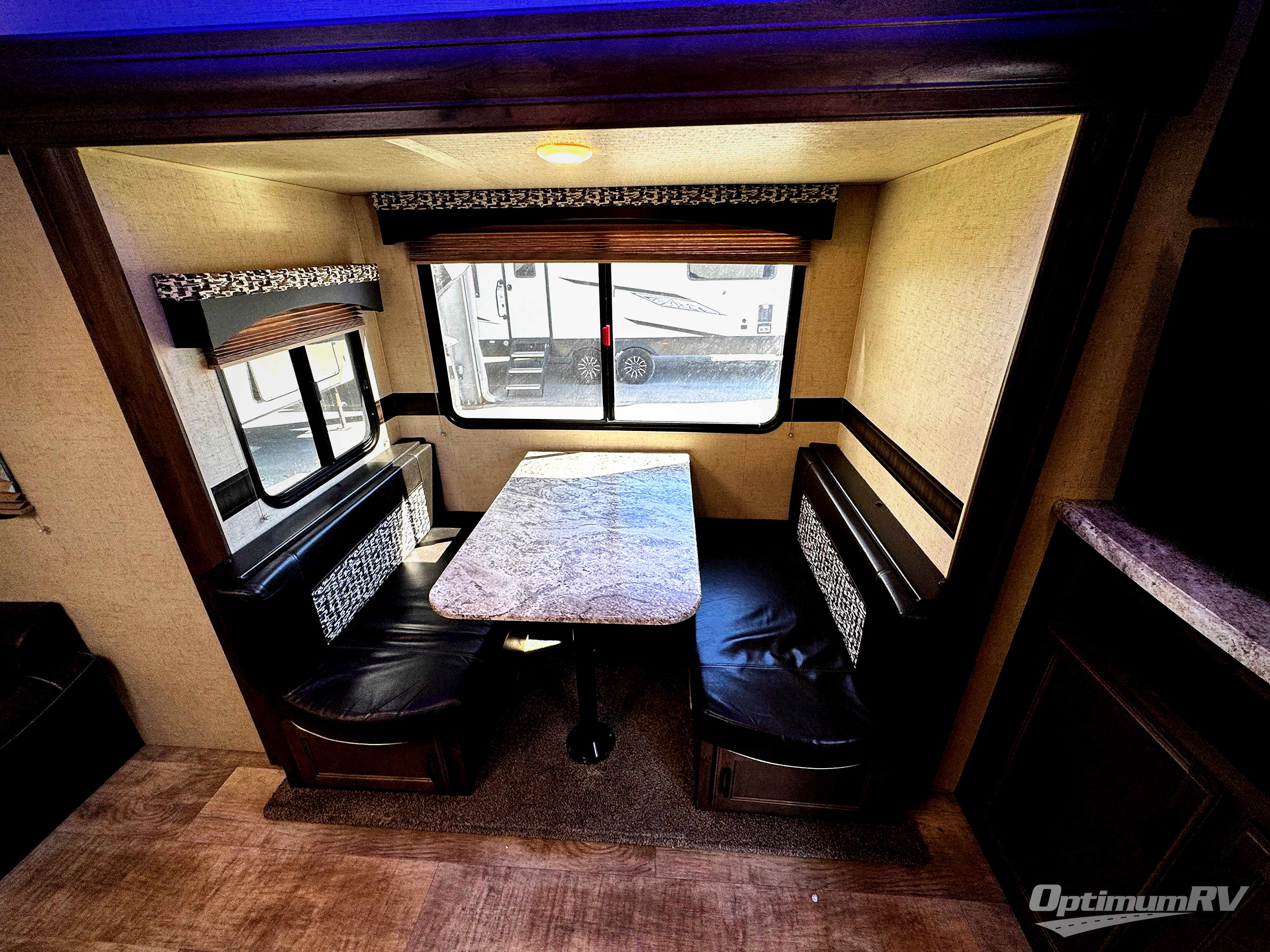 On the opposite side, a booth dinette slide out opens up the floor space for more walking around room. A sofa is along the rear wall for easy viewing of the entertainment center on the interior wall.