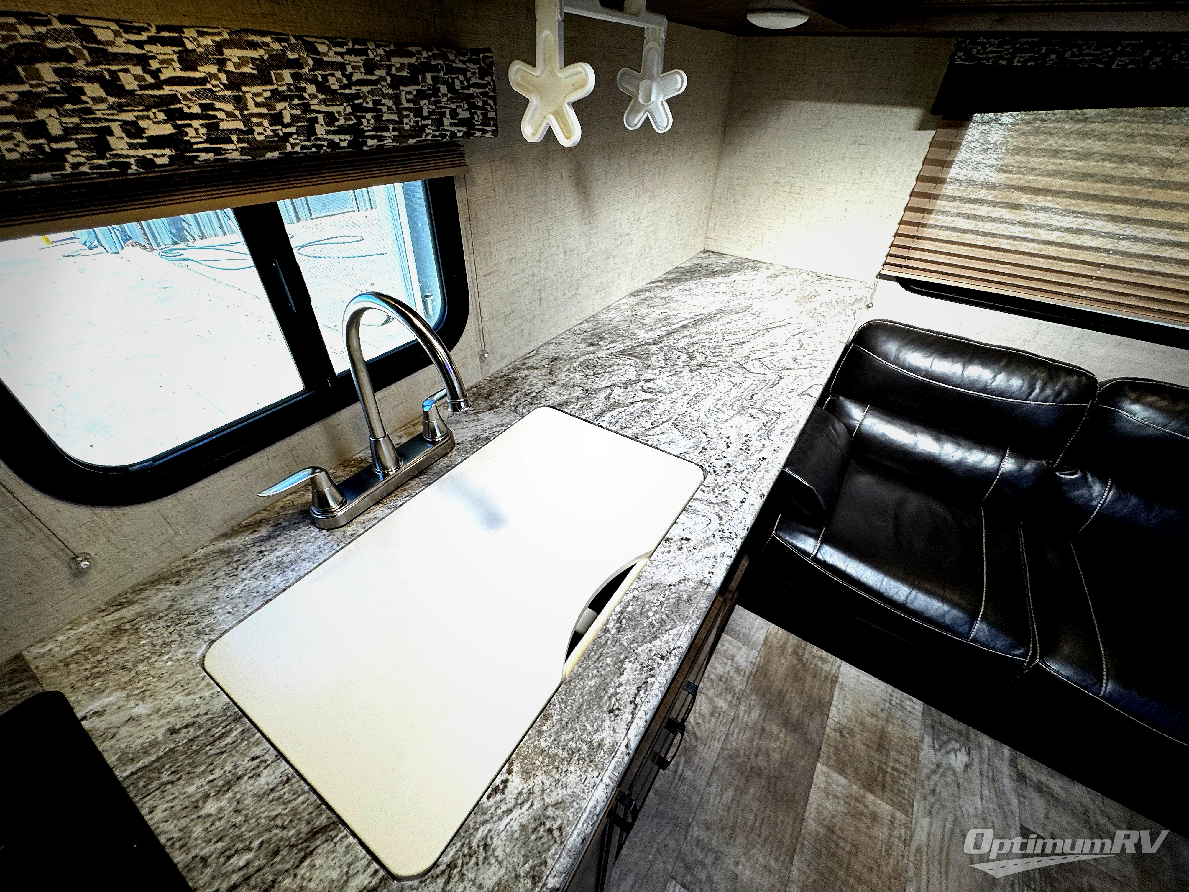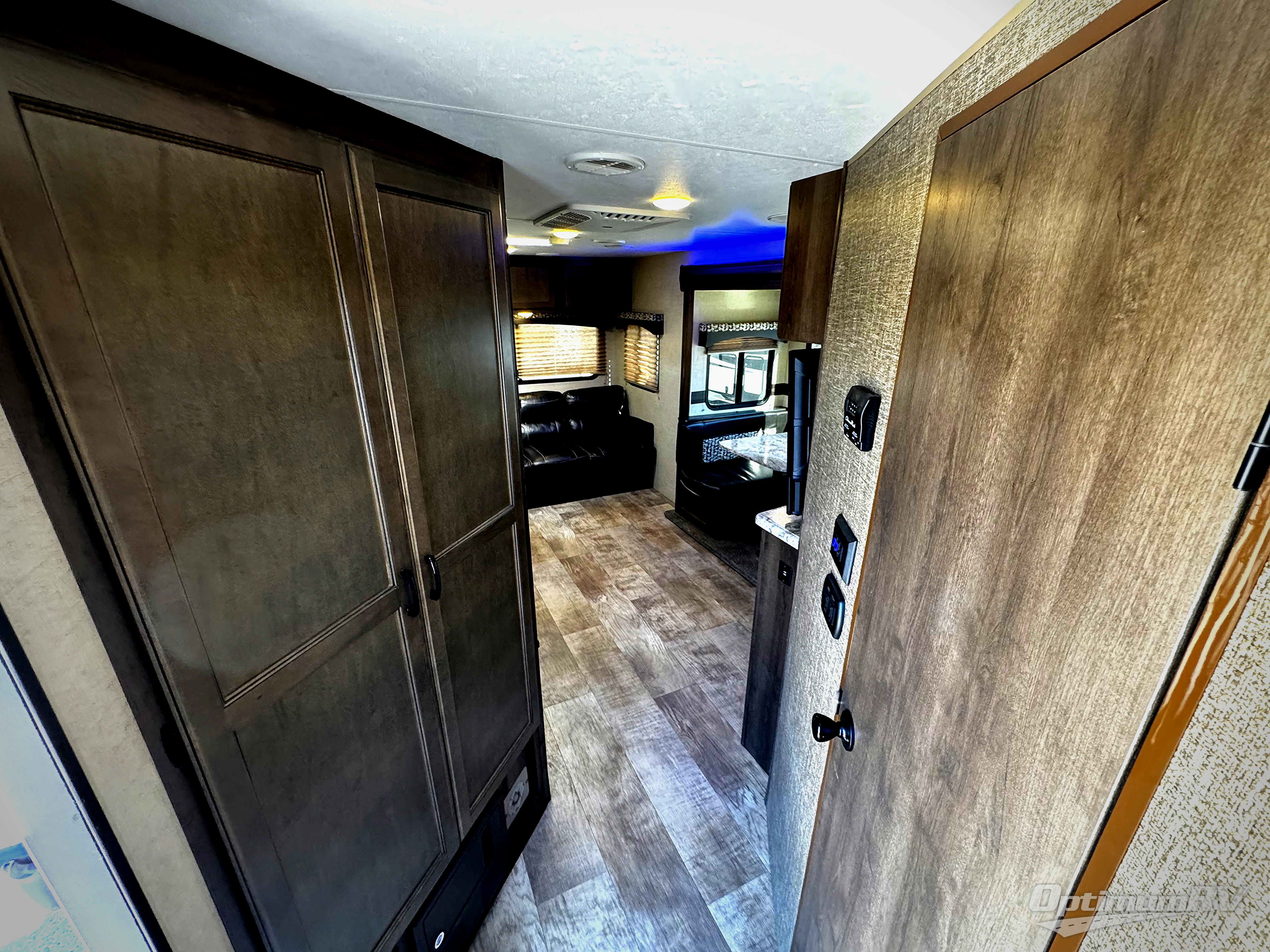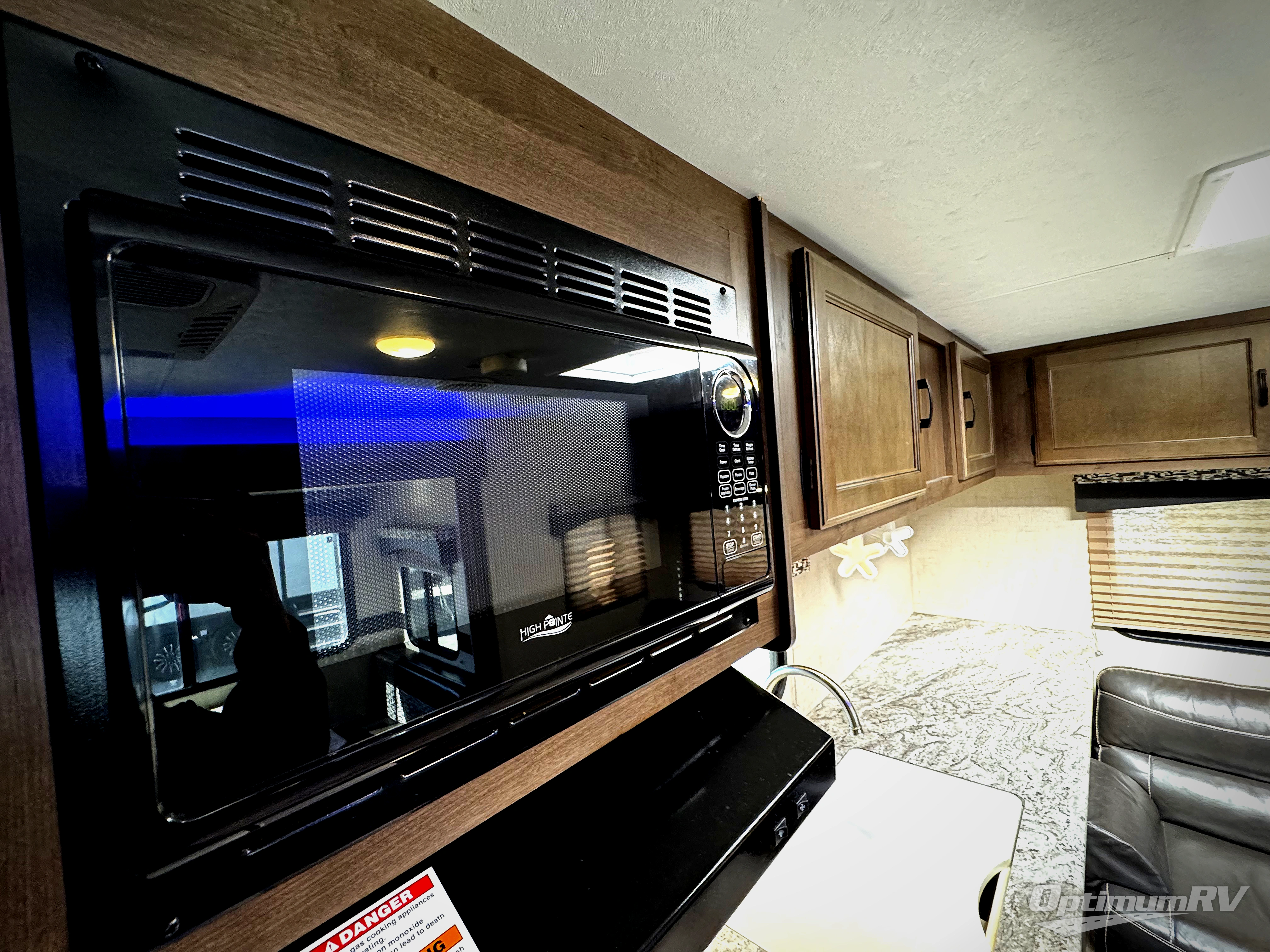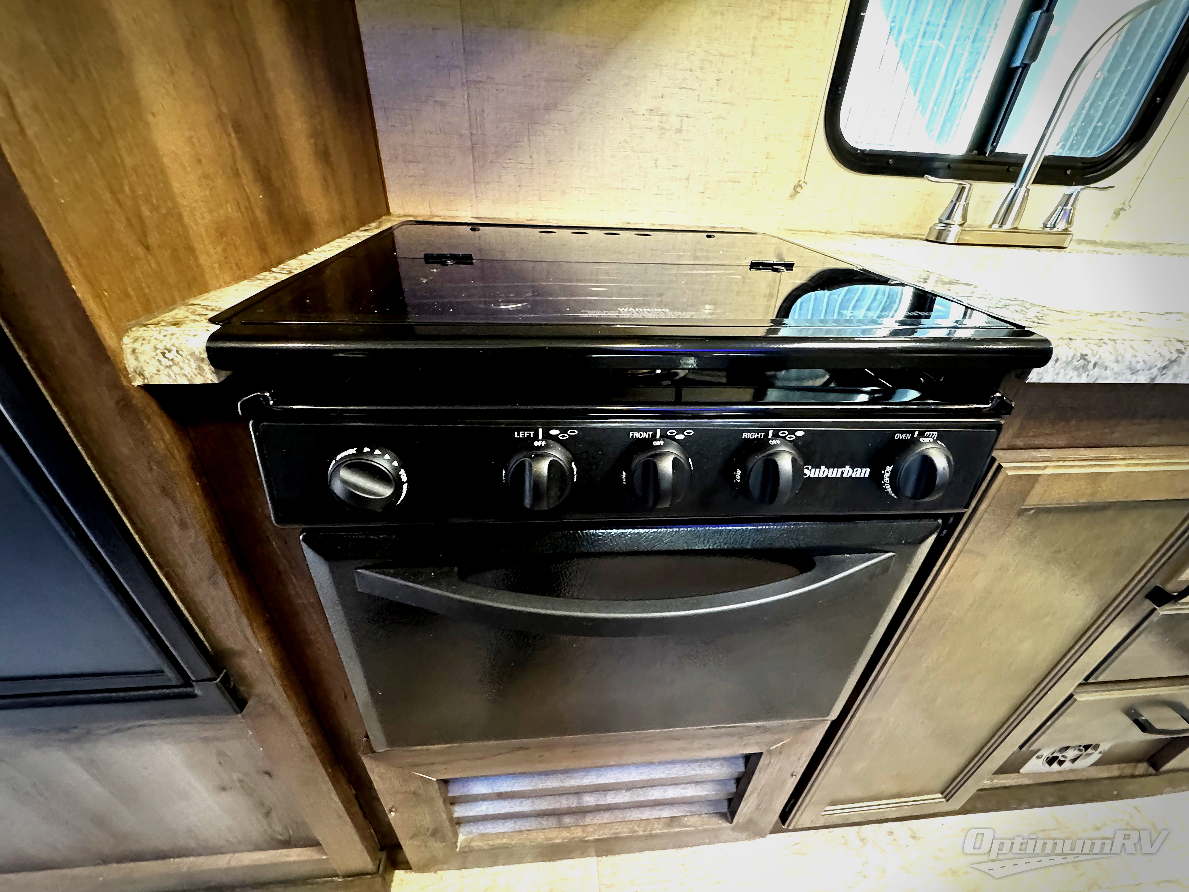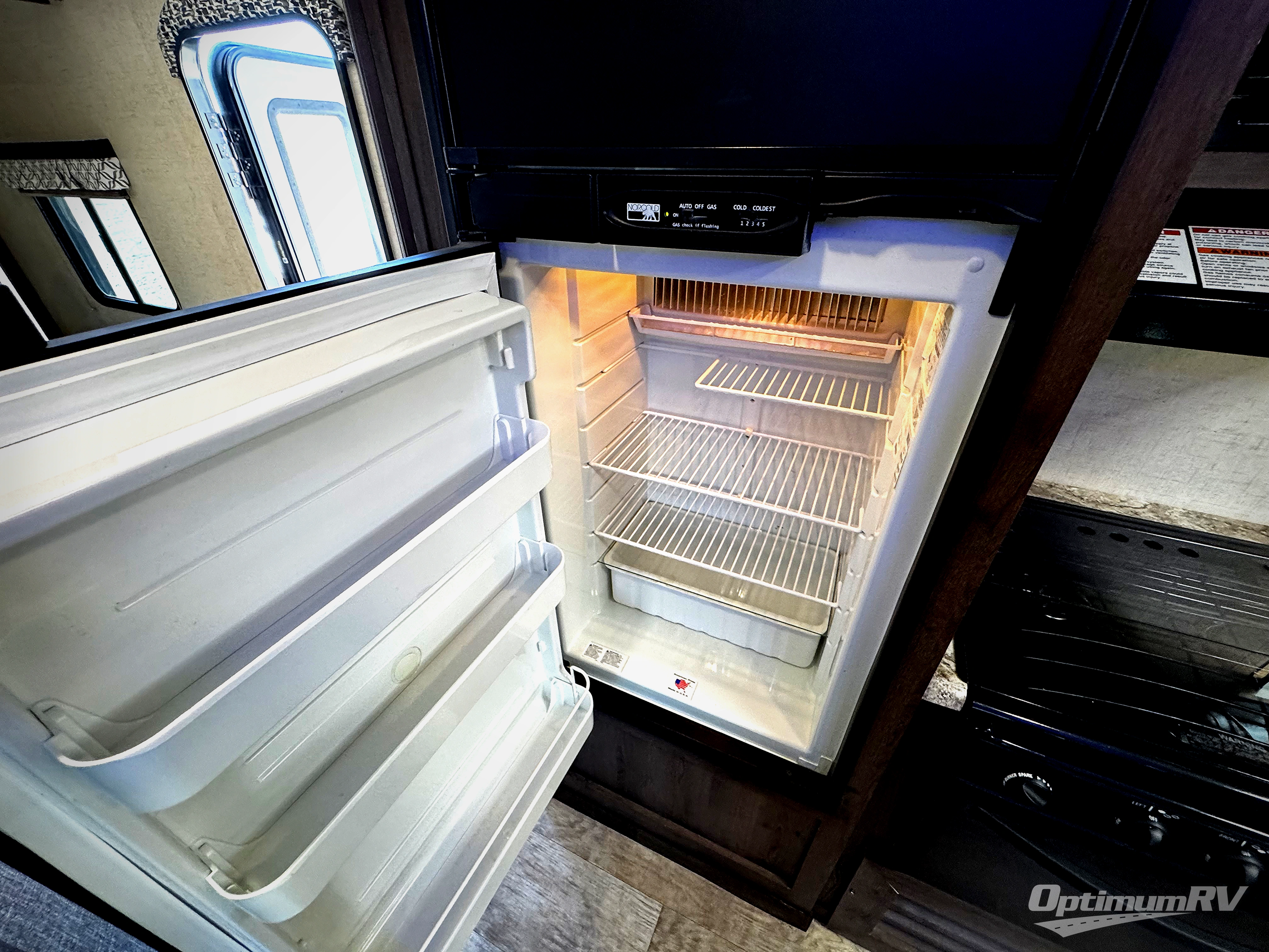 Back in the main living/kitchen space, you will find a pantry, refrigerator, three burner range, microwave, double kitchen sink, and plenty of counter space for cooking inside along the curb side wall.