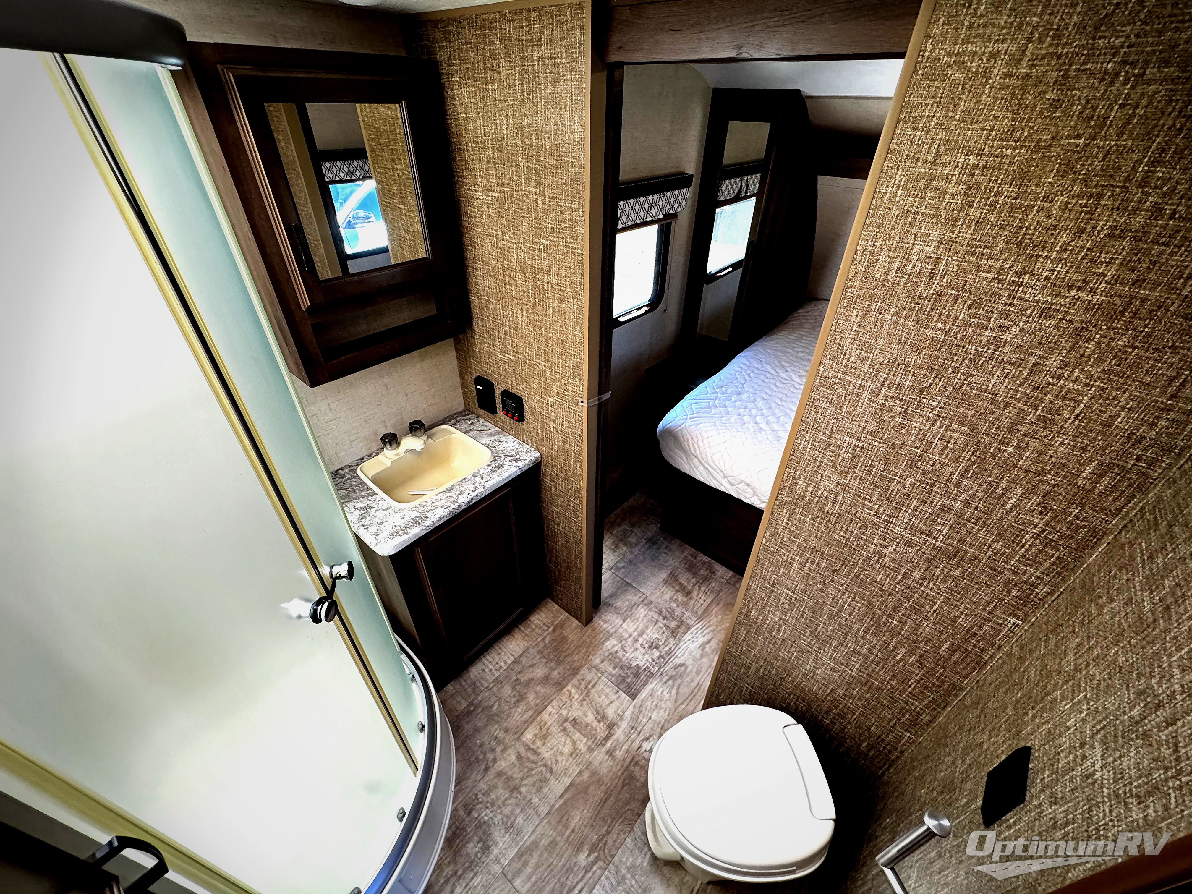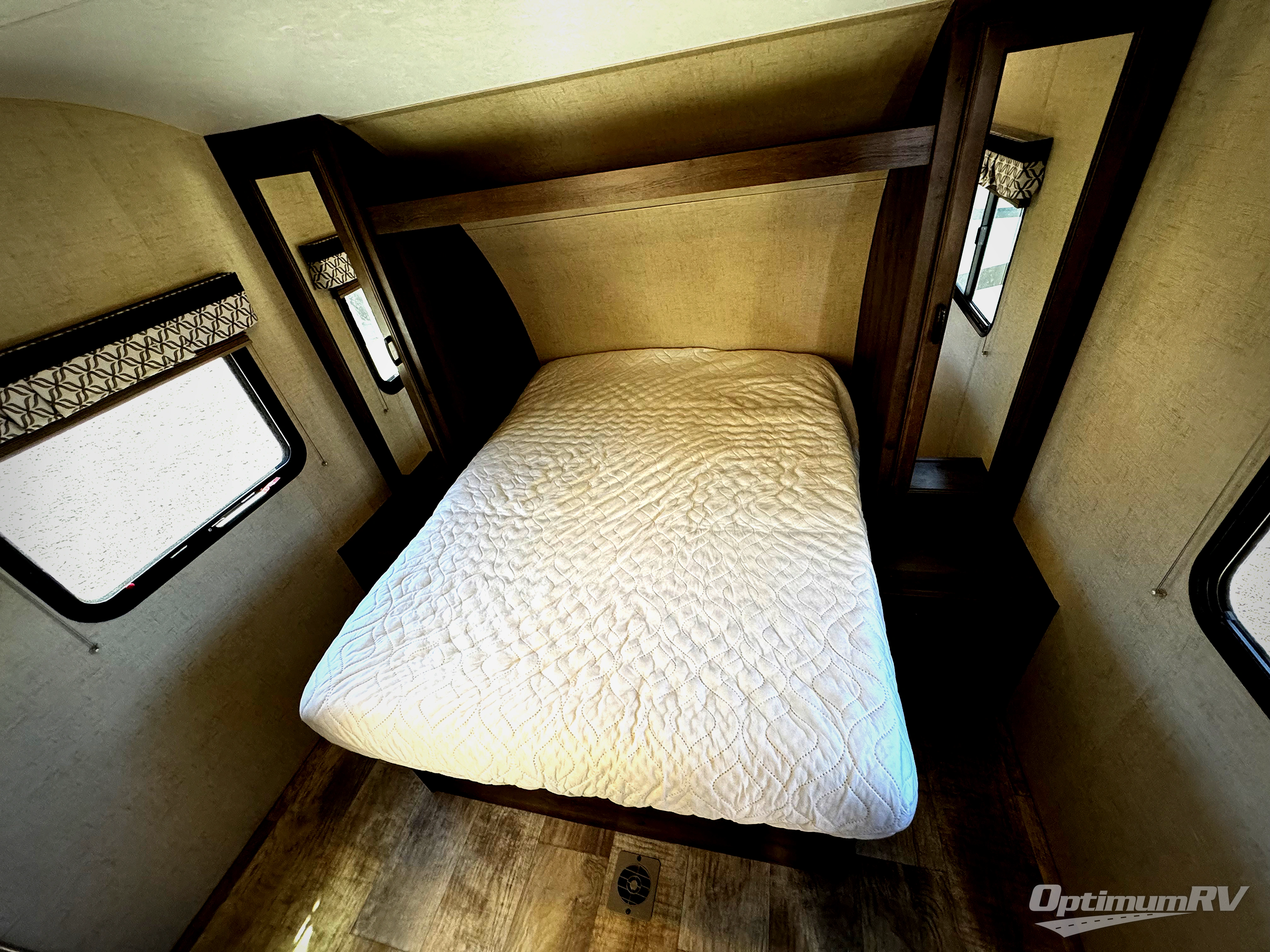 The front bedroom includes a queen bed, dual wardrobes with nightstands, and a TV mount.